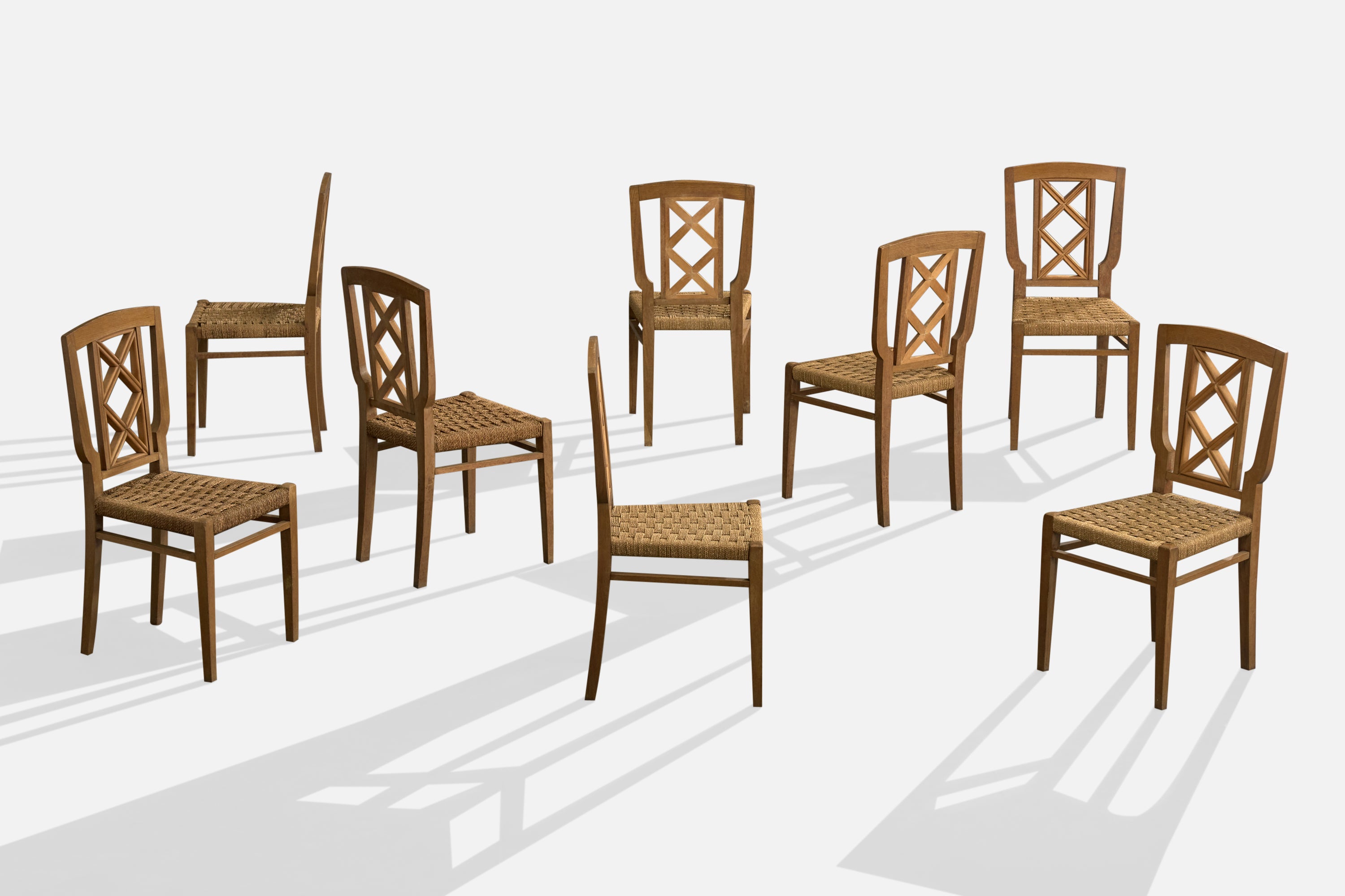 A set of 8 wood and rush dining room chairs designed and produced in Italy, c. 1940s.