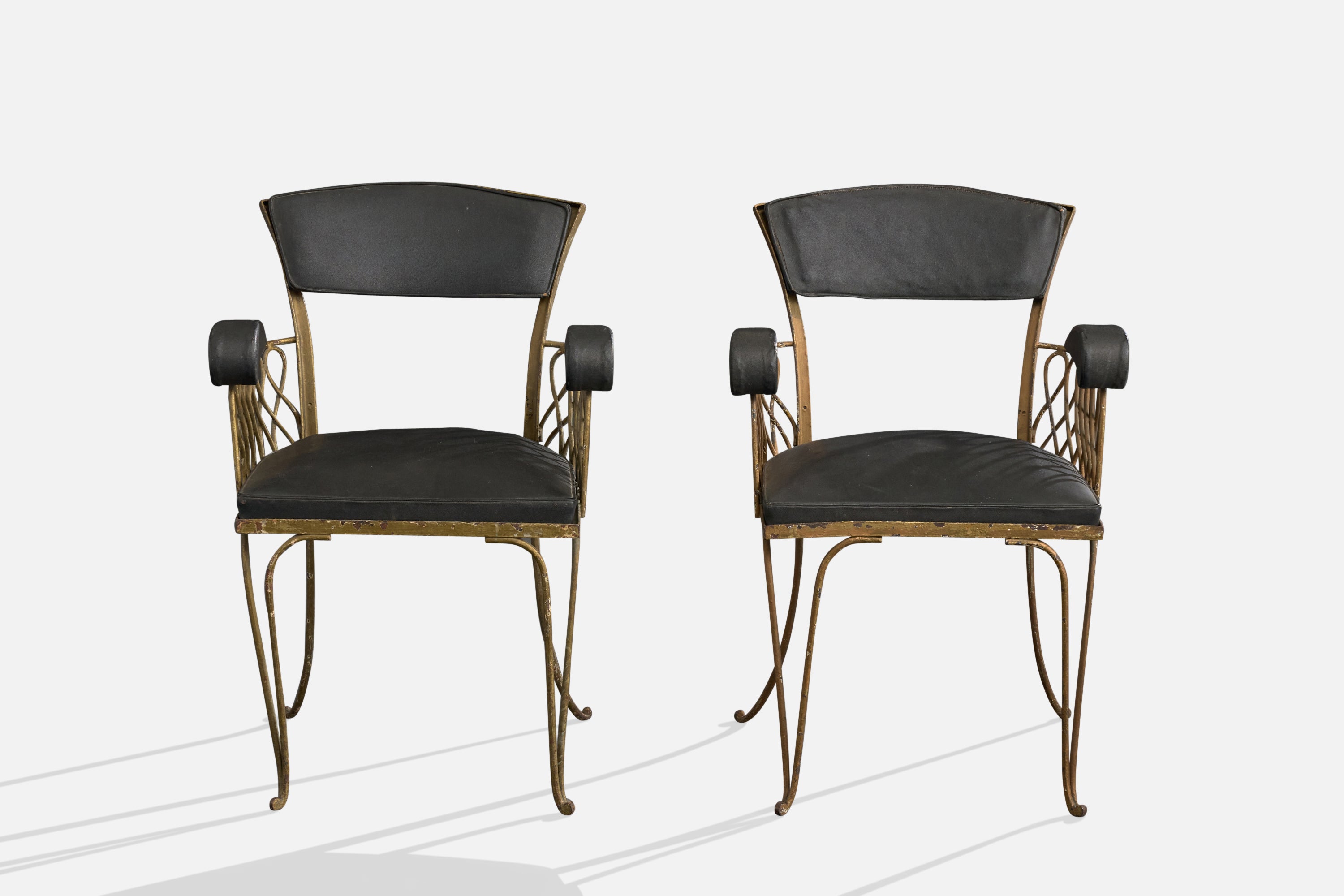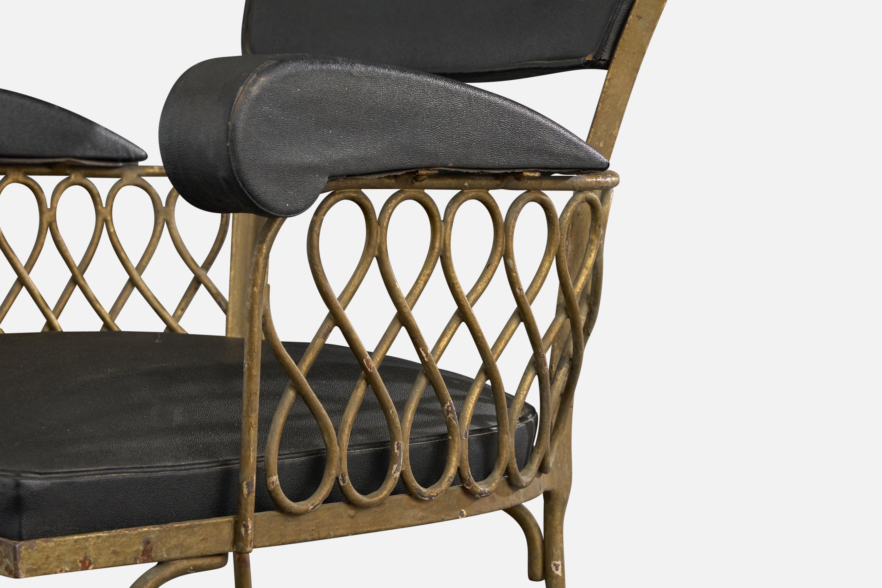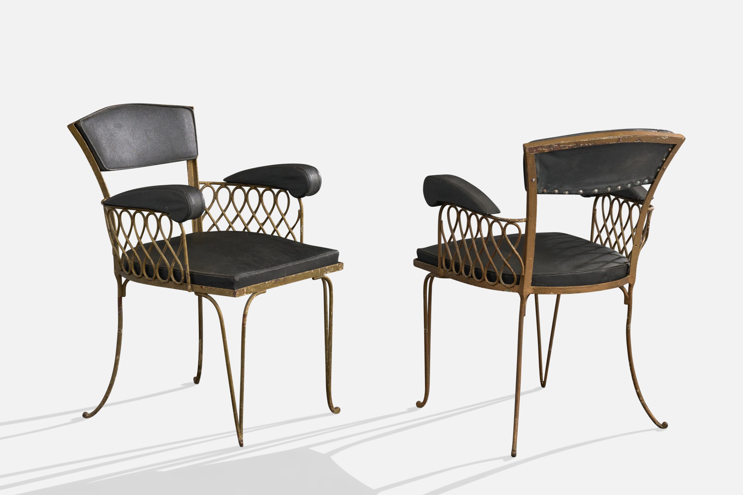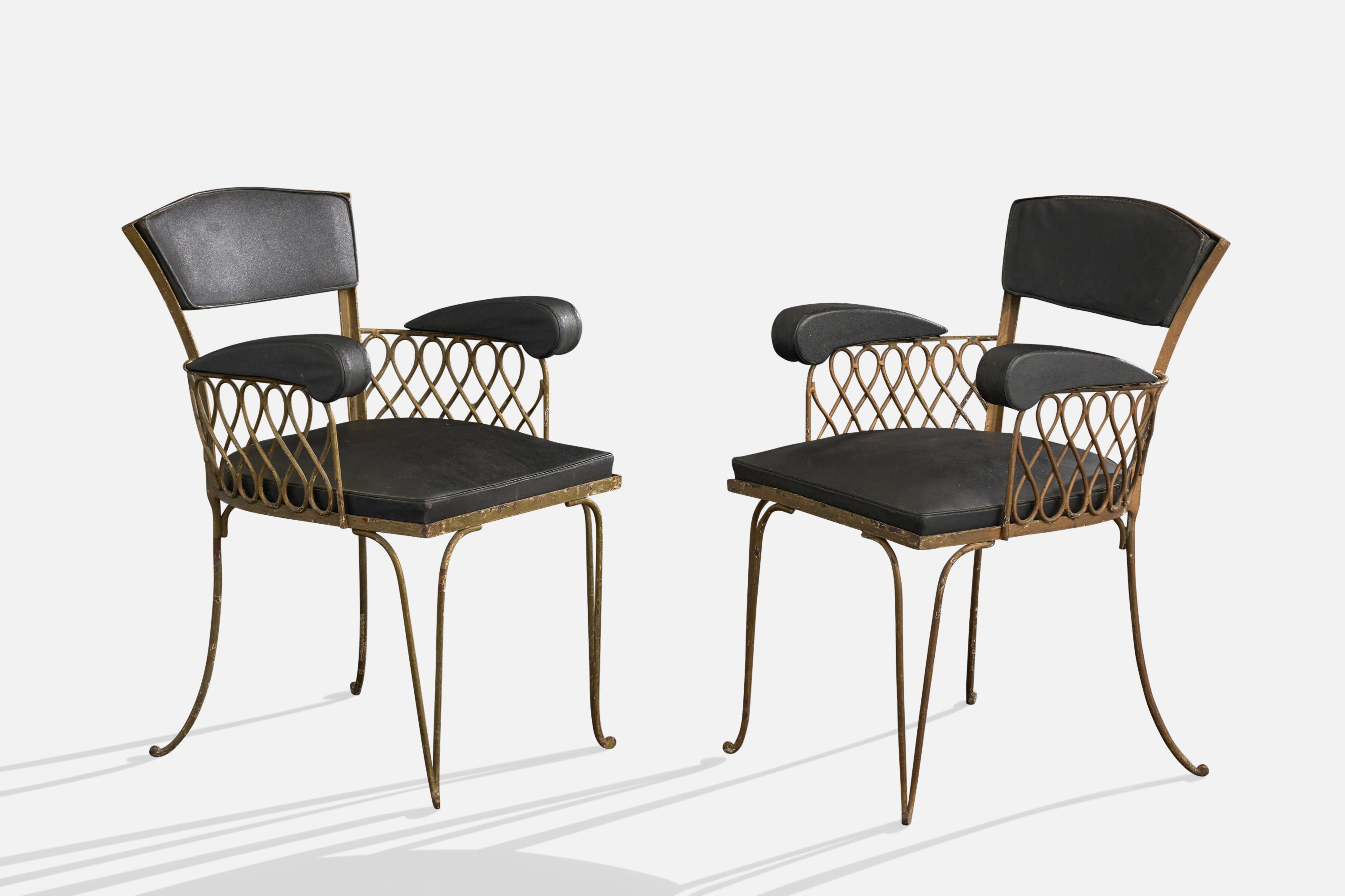 A pair of gold-painted metal and black vinyl armchairs designed and produced in France, c. 1950s.