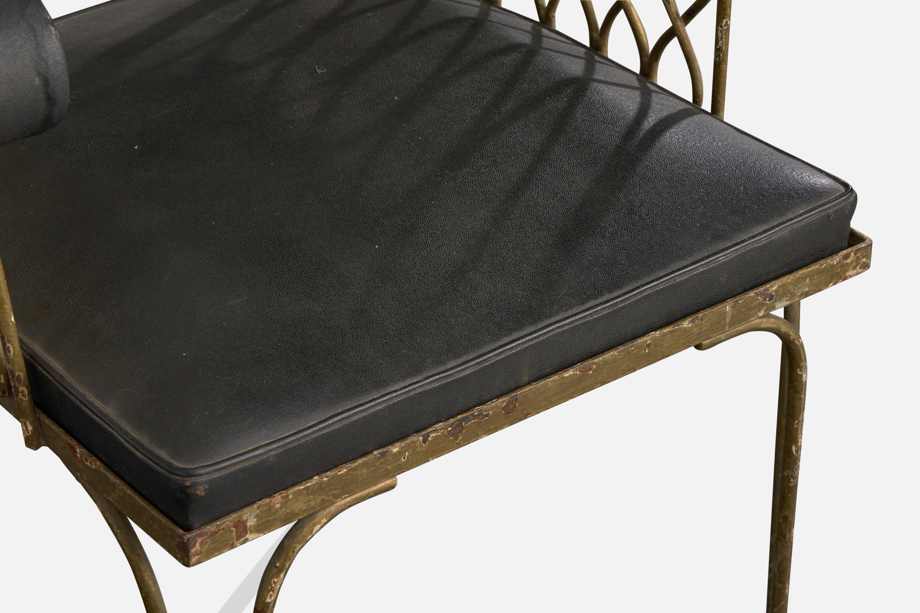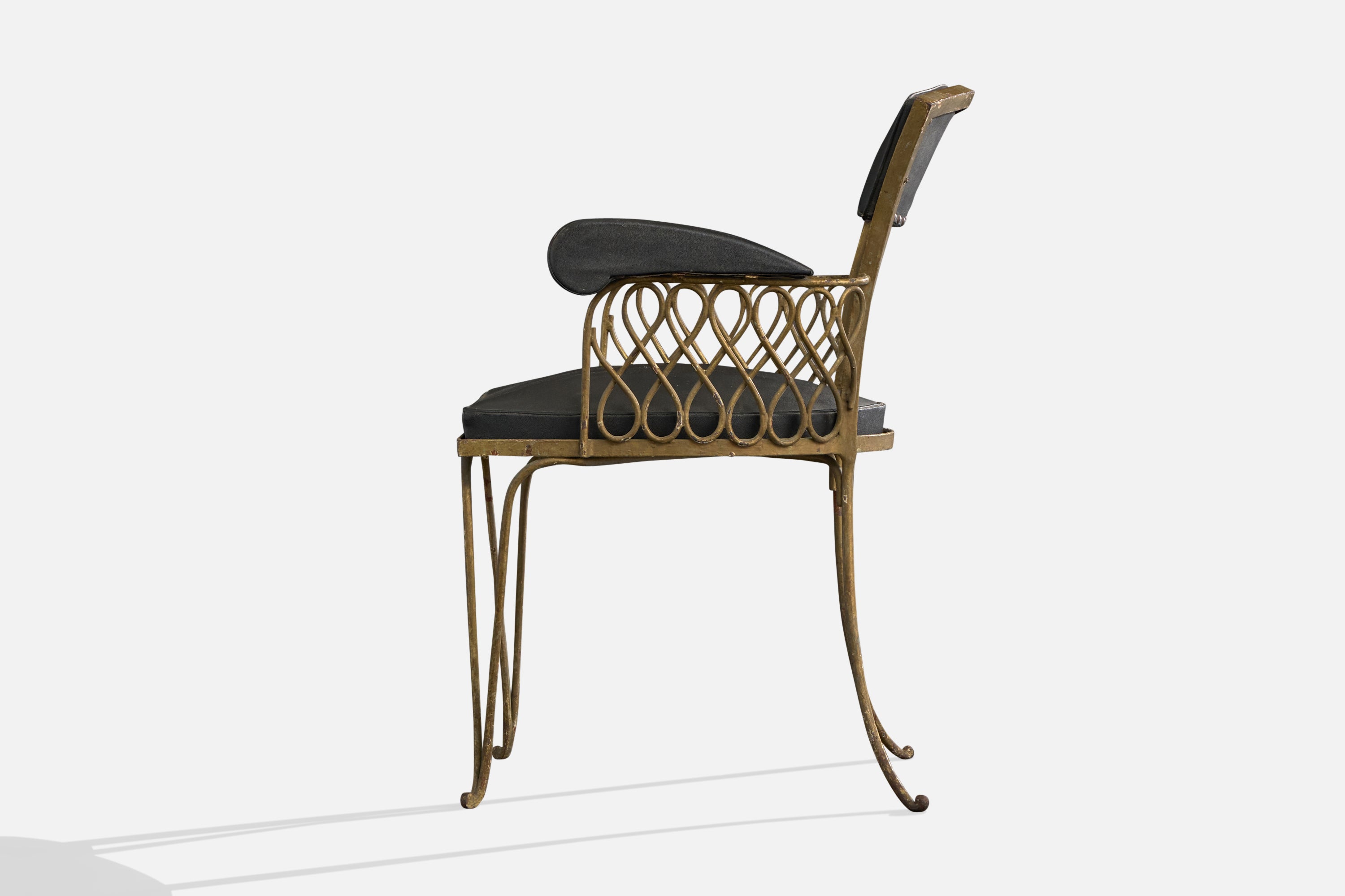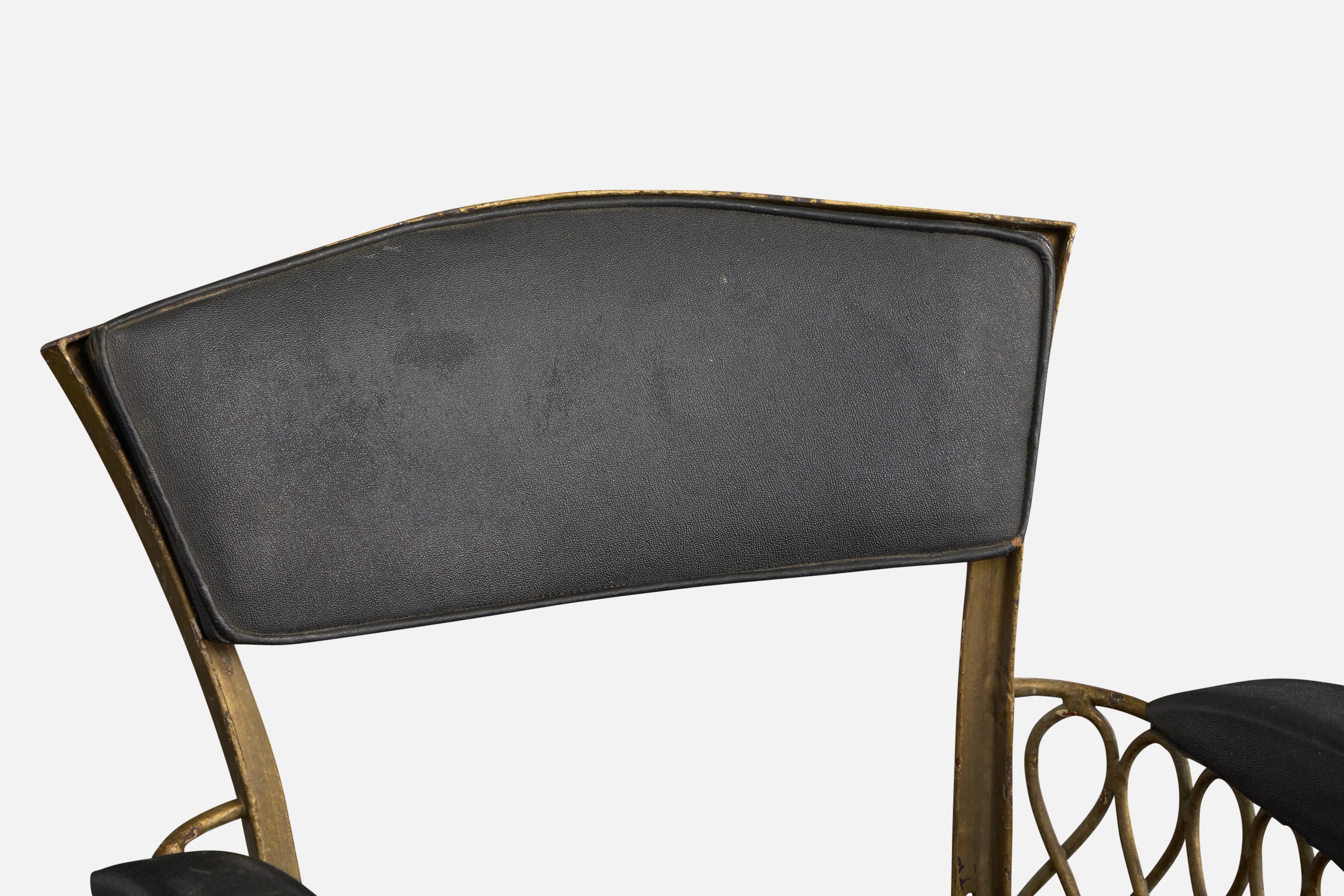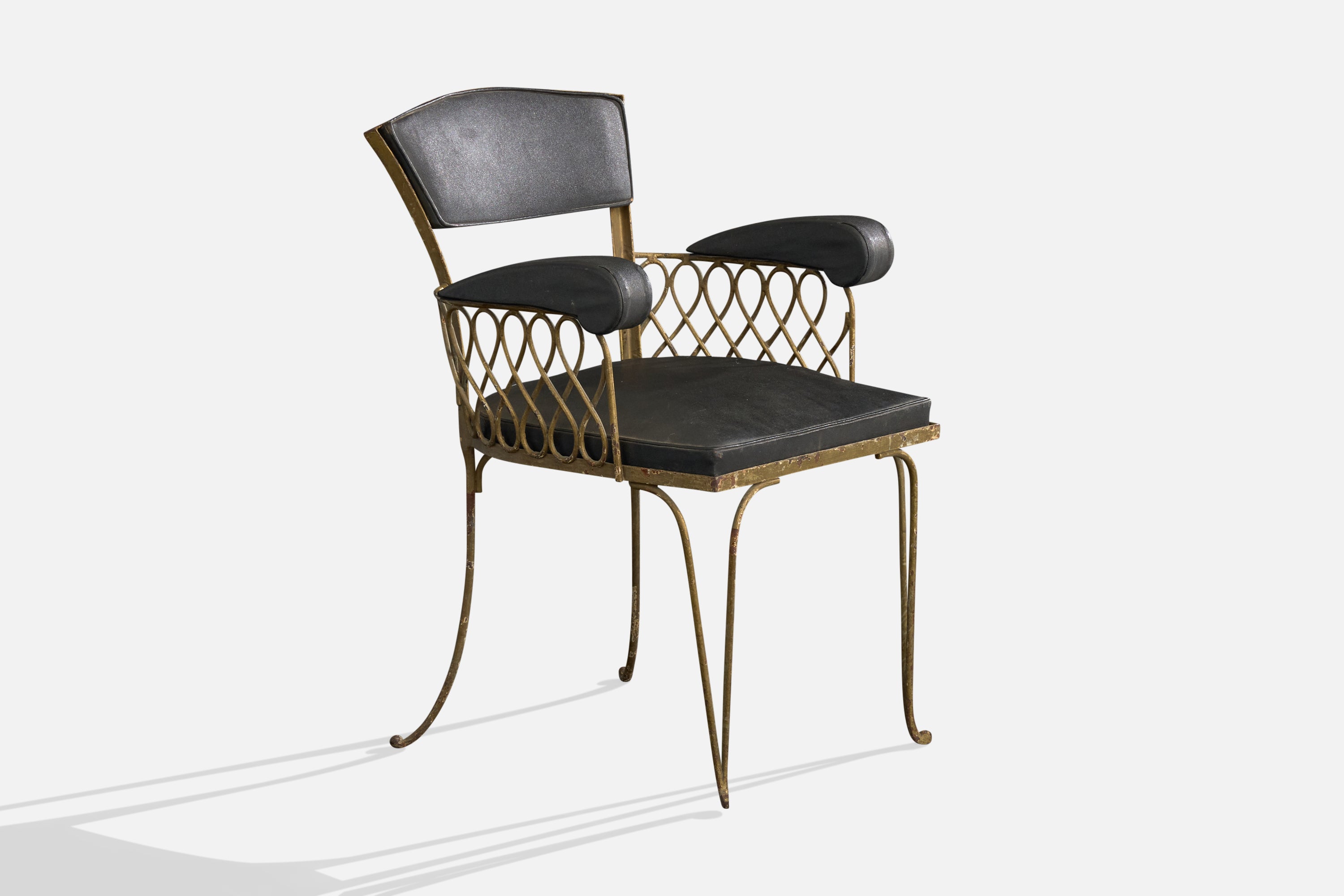 A pair of gold-painted metal and black vinyl armchairs designed and produced in France, c. 1950s.