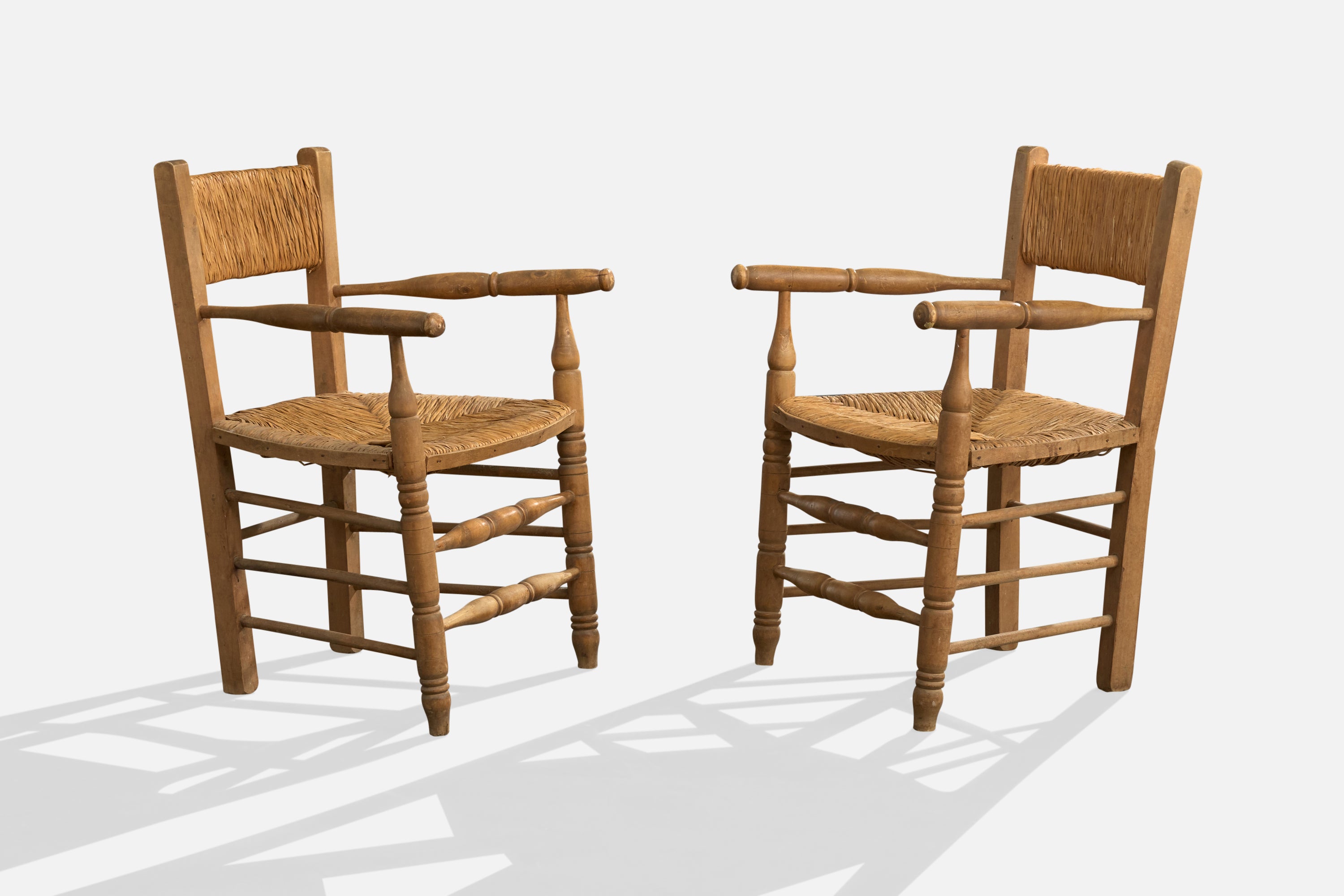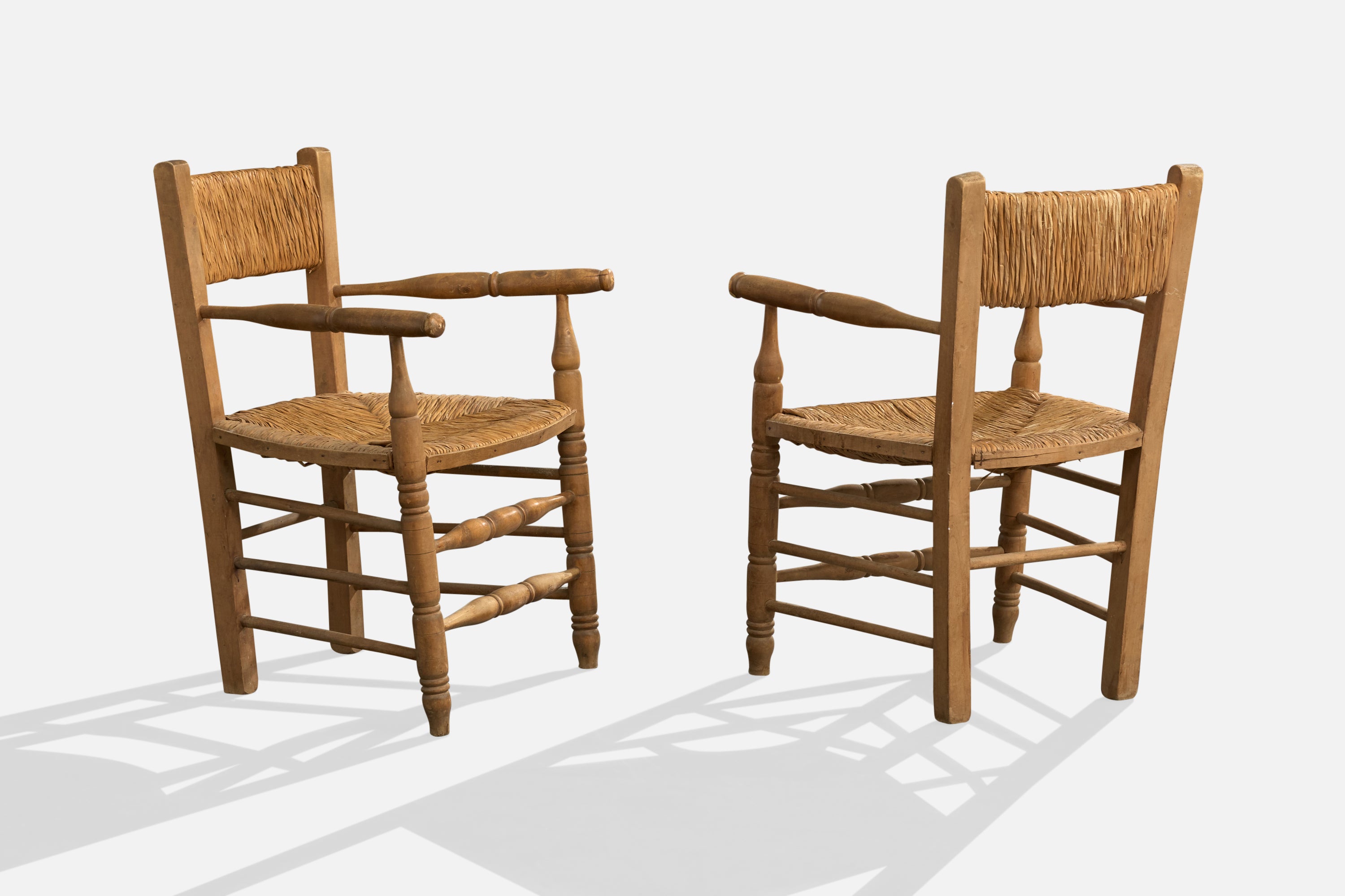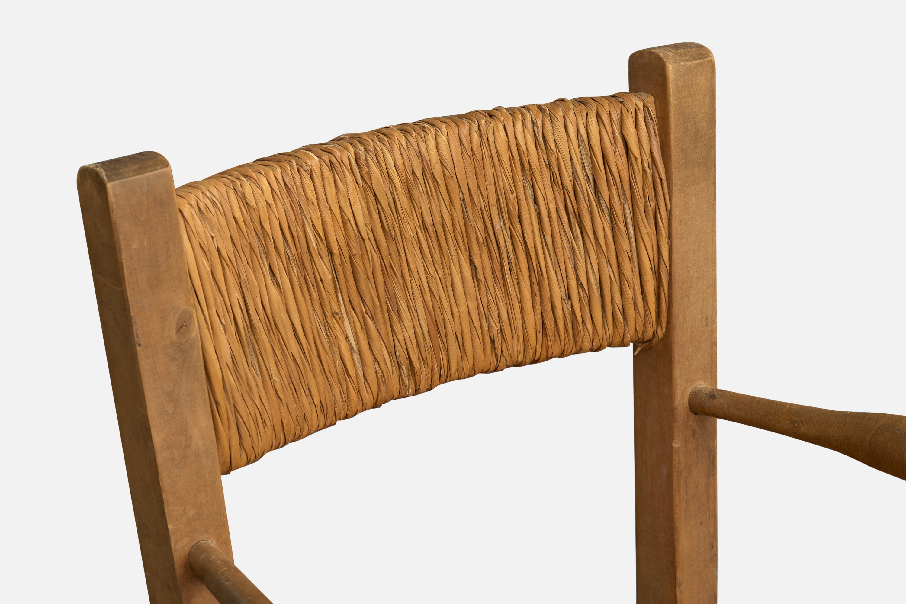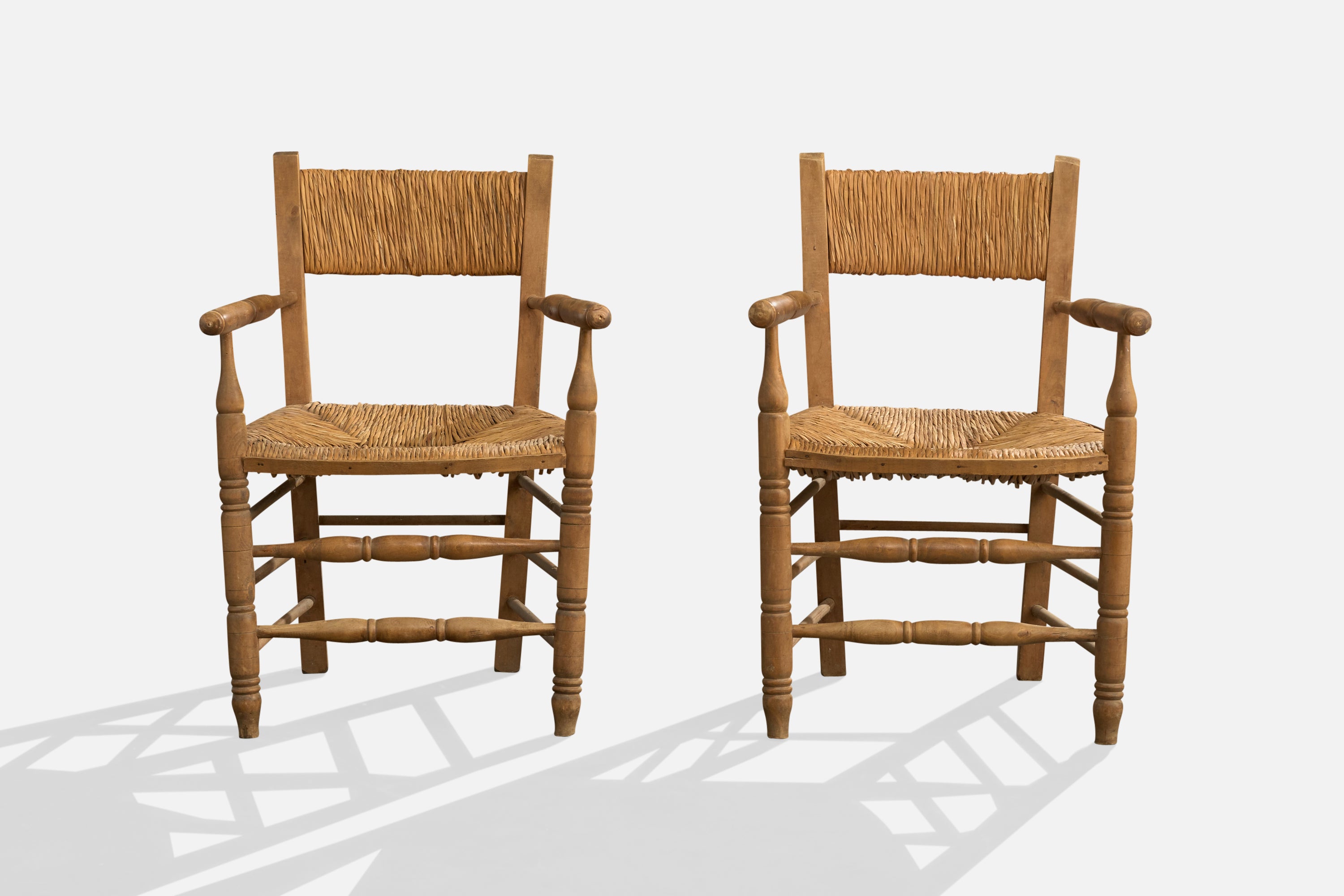 A pair of wood and papercord armchairs designed and produced in Argentina, c. 1950s.
