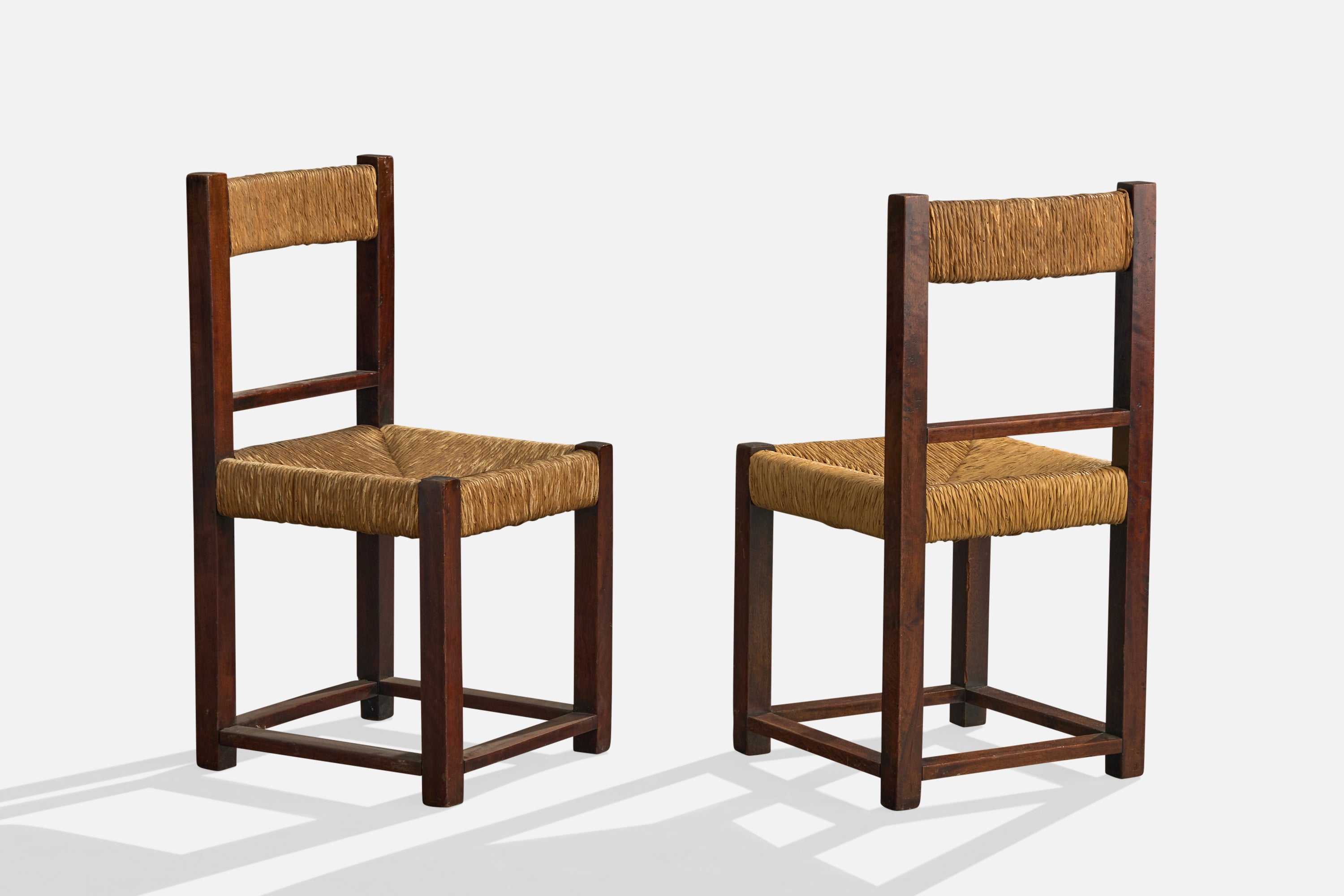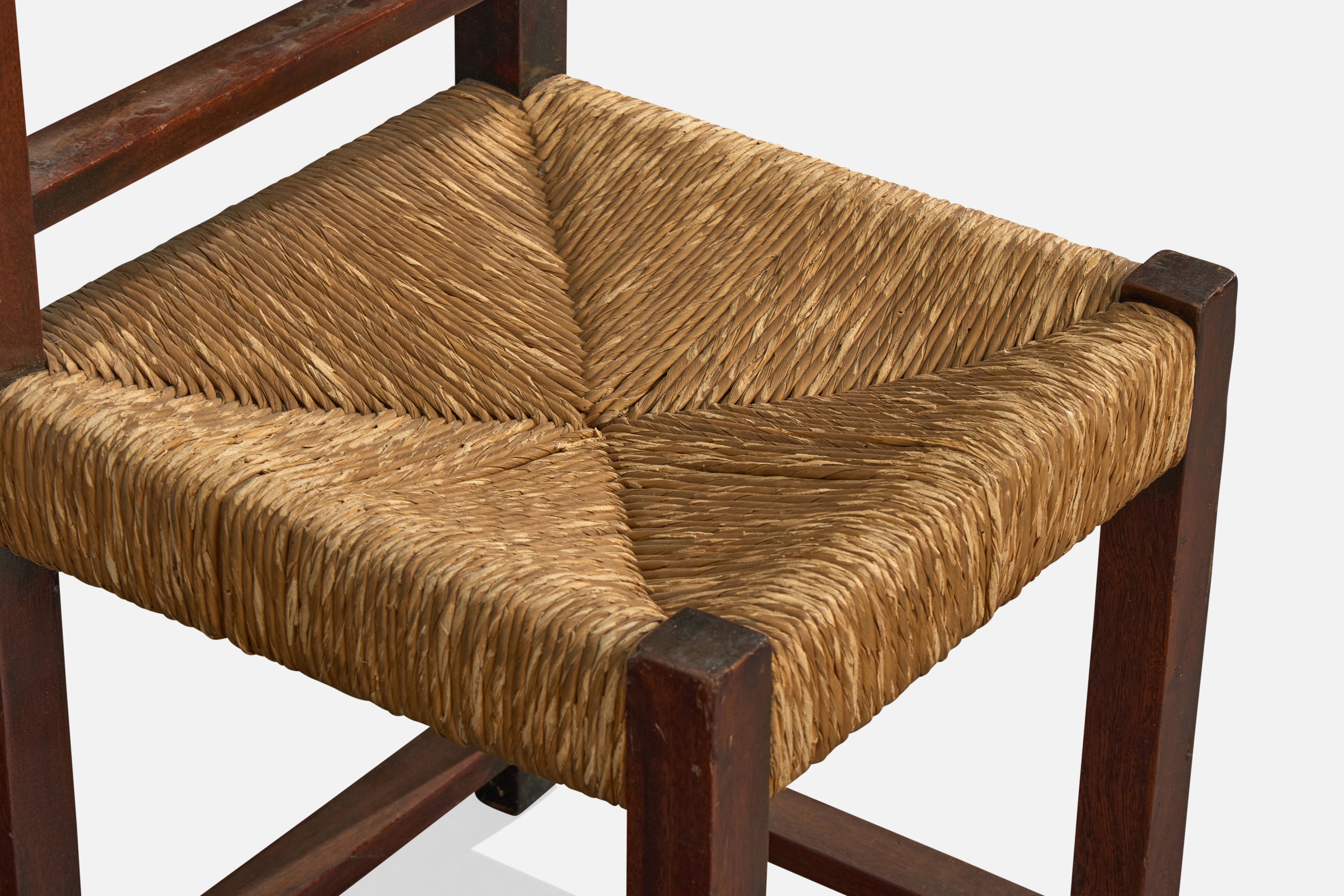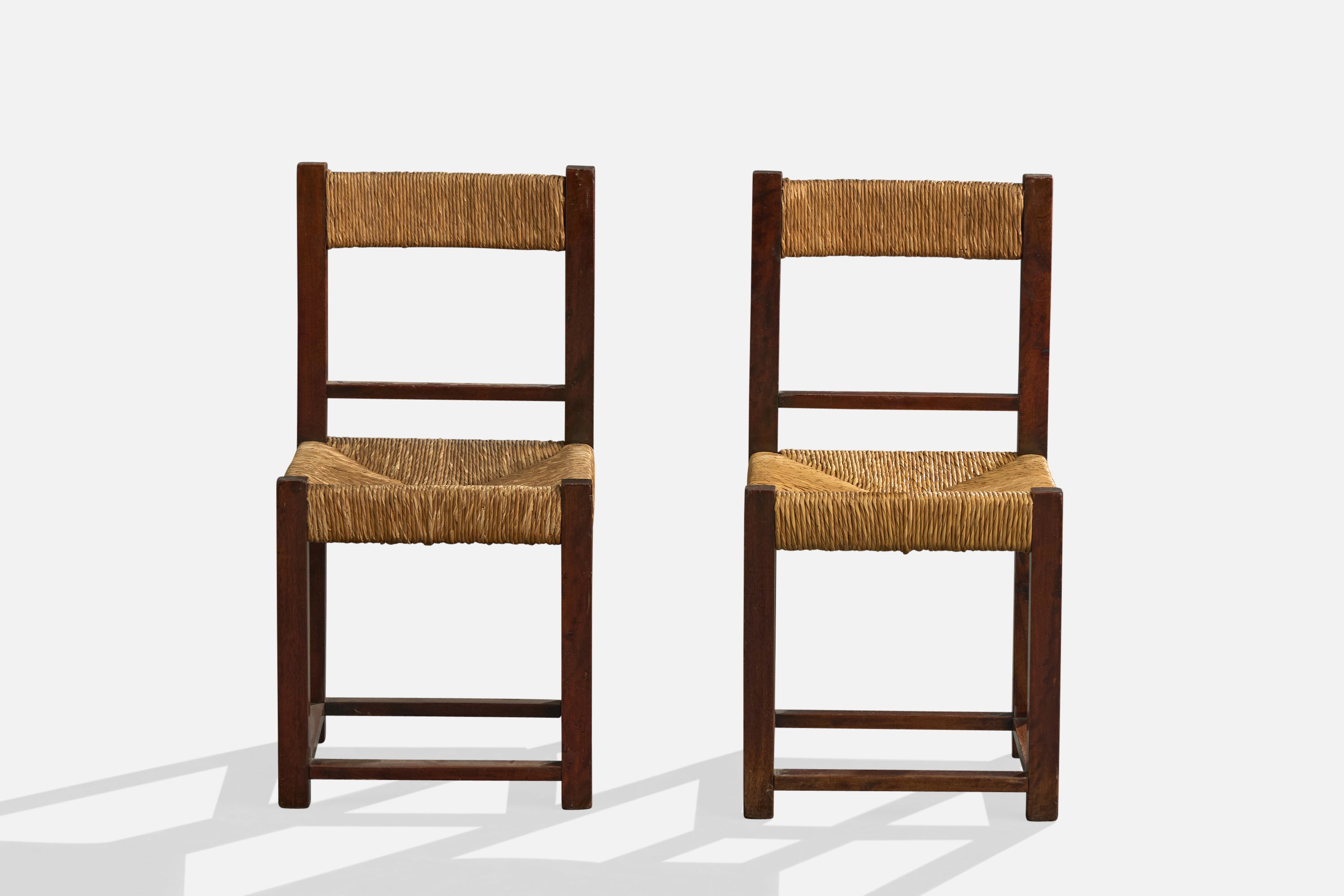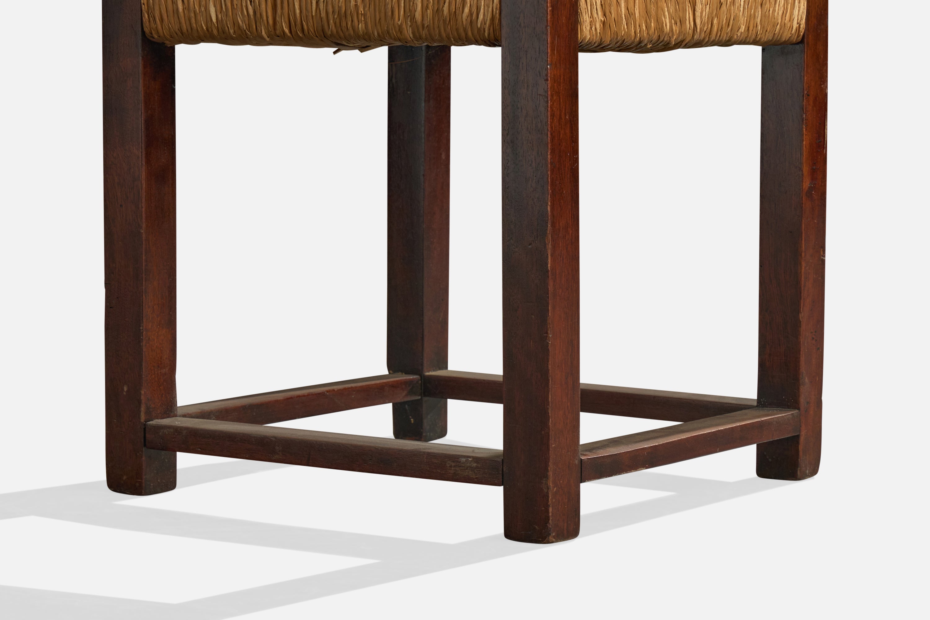 A set of four dark-stained wood and rush dining room chairs designed and produced in Argentina, c. 1950s.