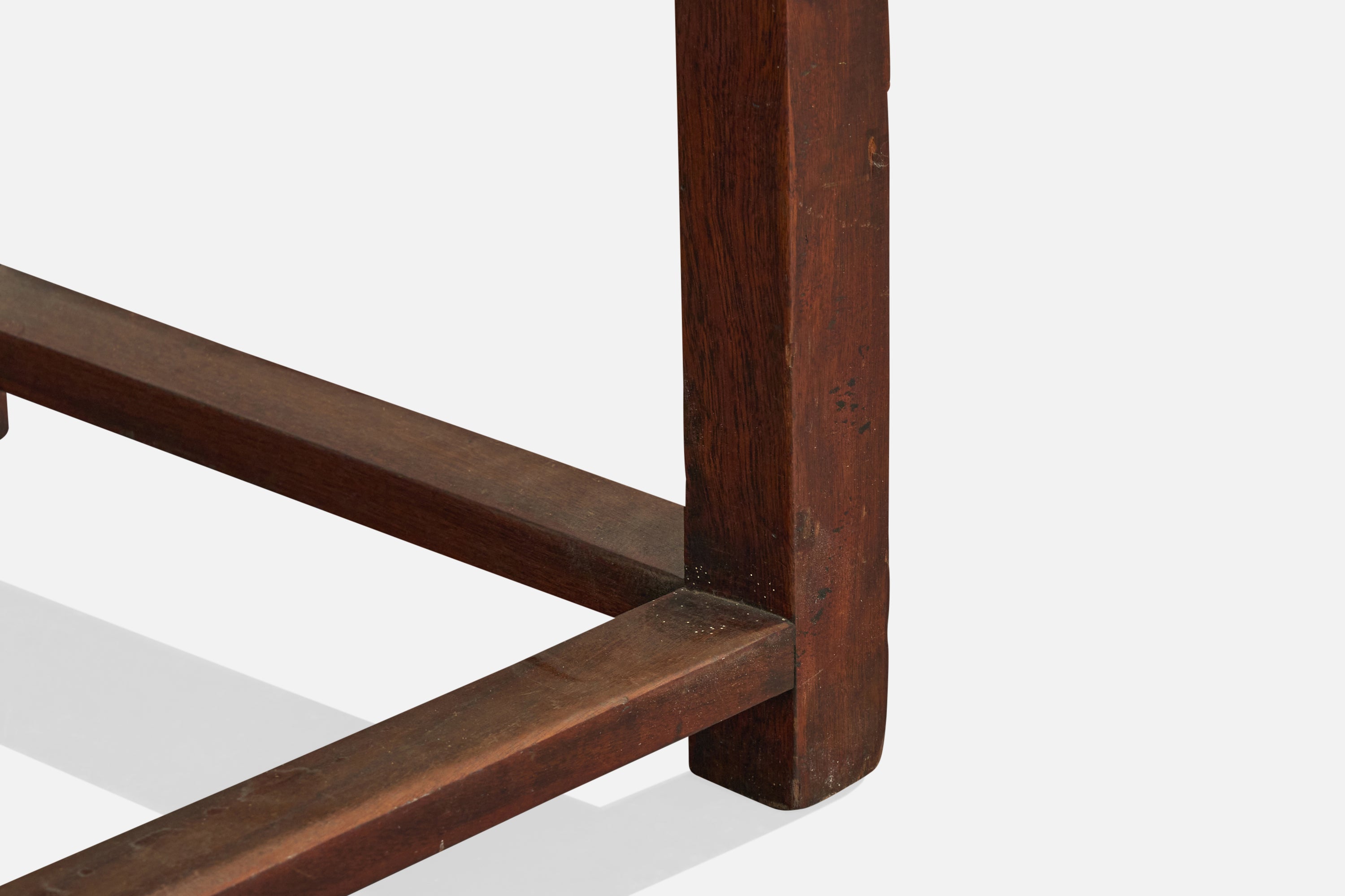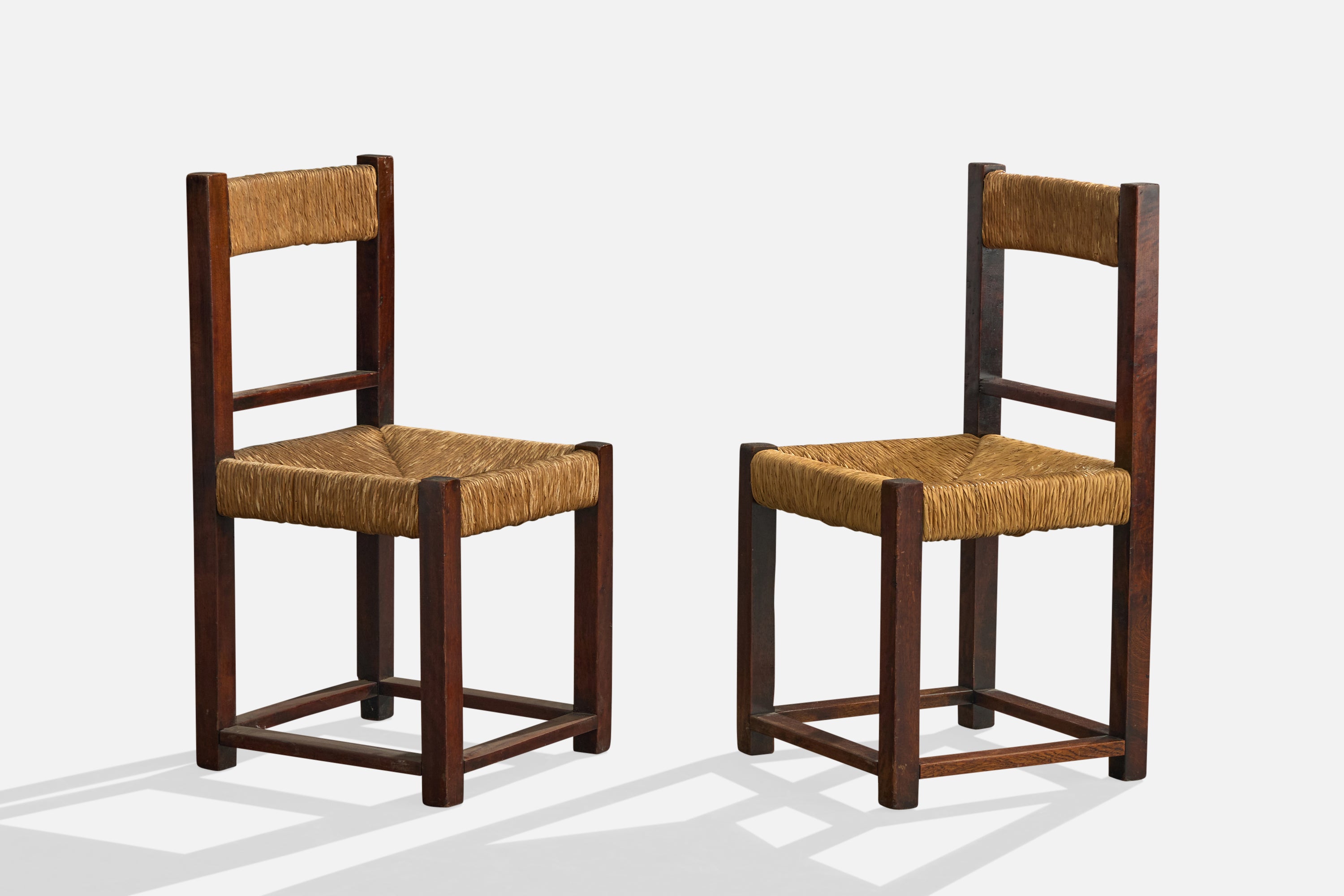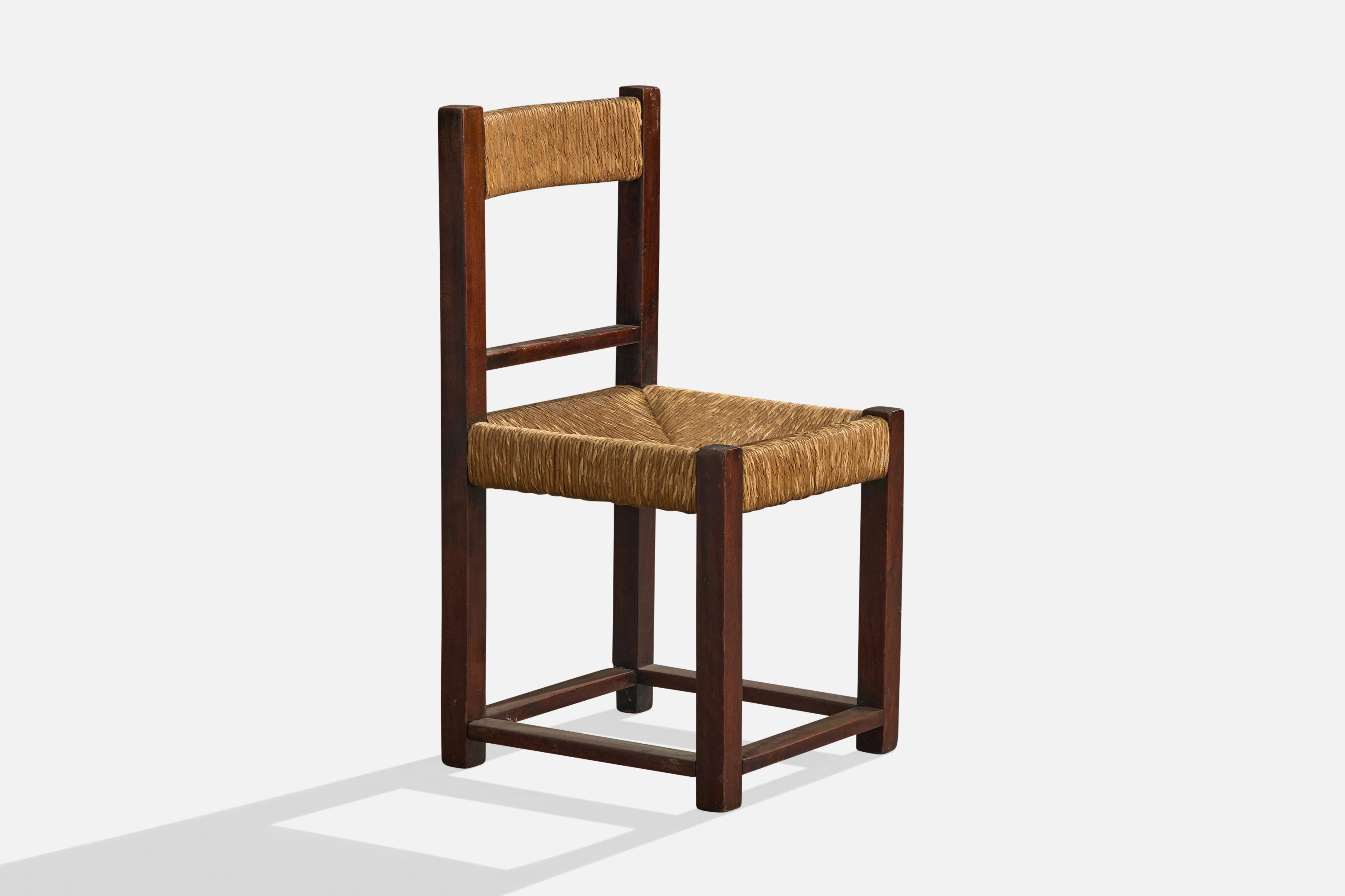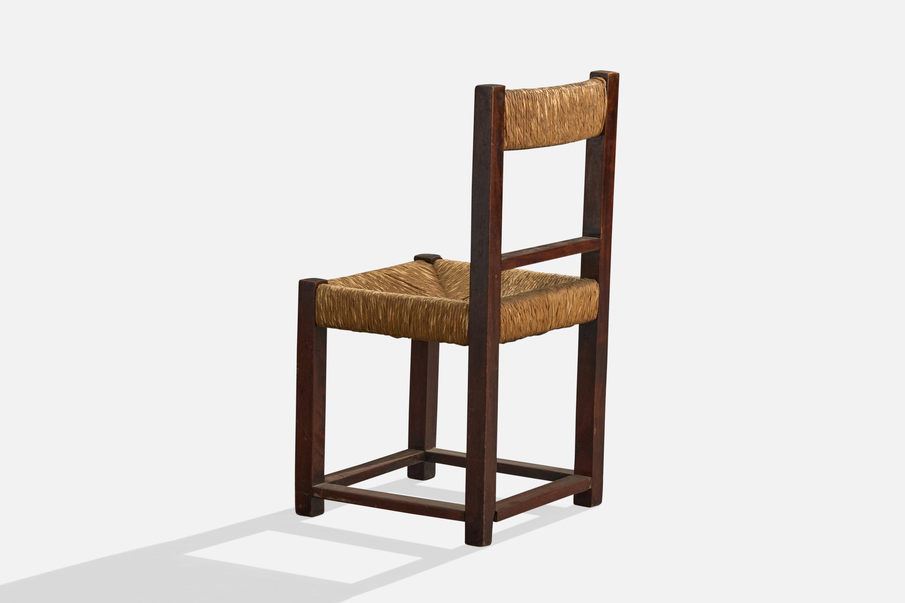 A set of four dark-stained wood and rush dining room chairs designed and produced in Argentina, c. 1950s.