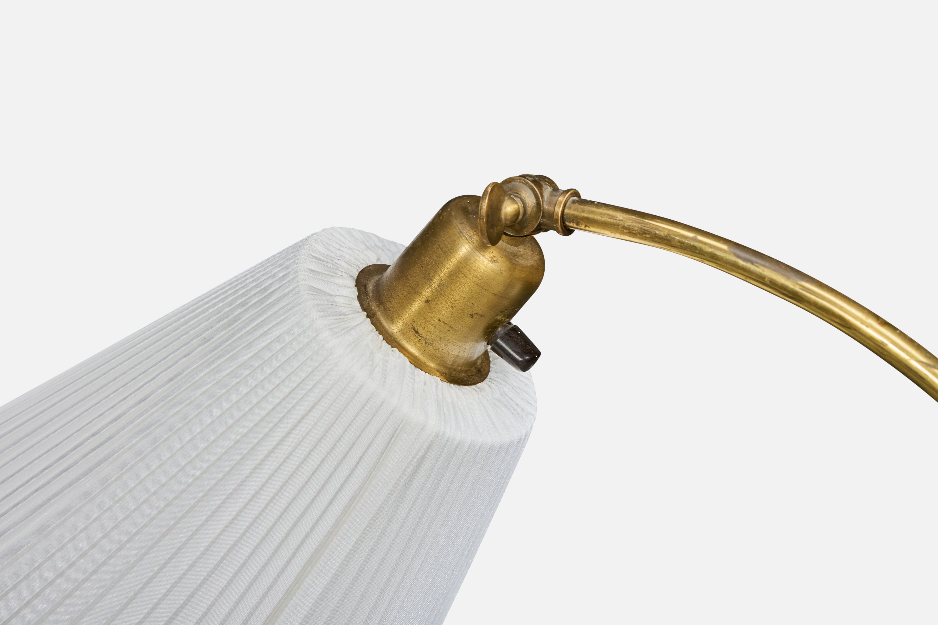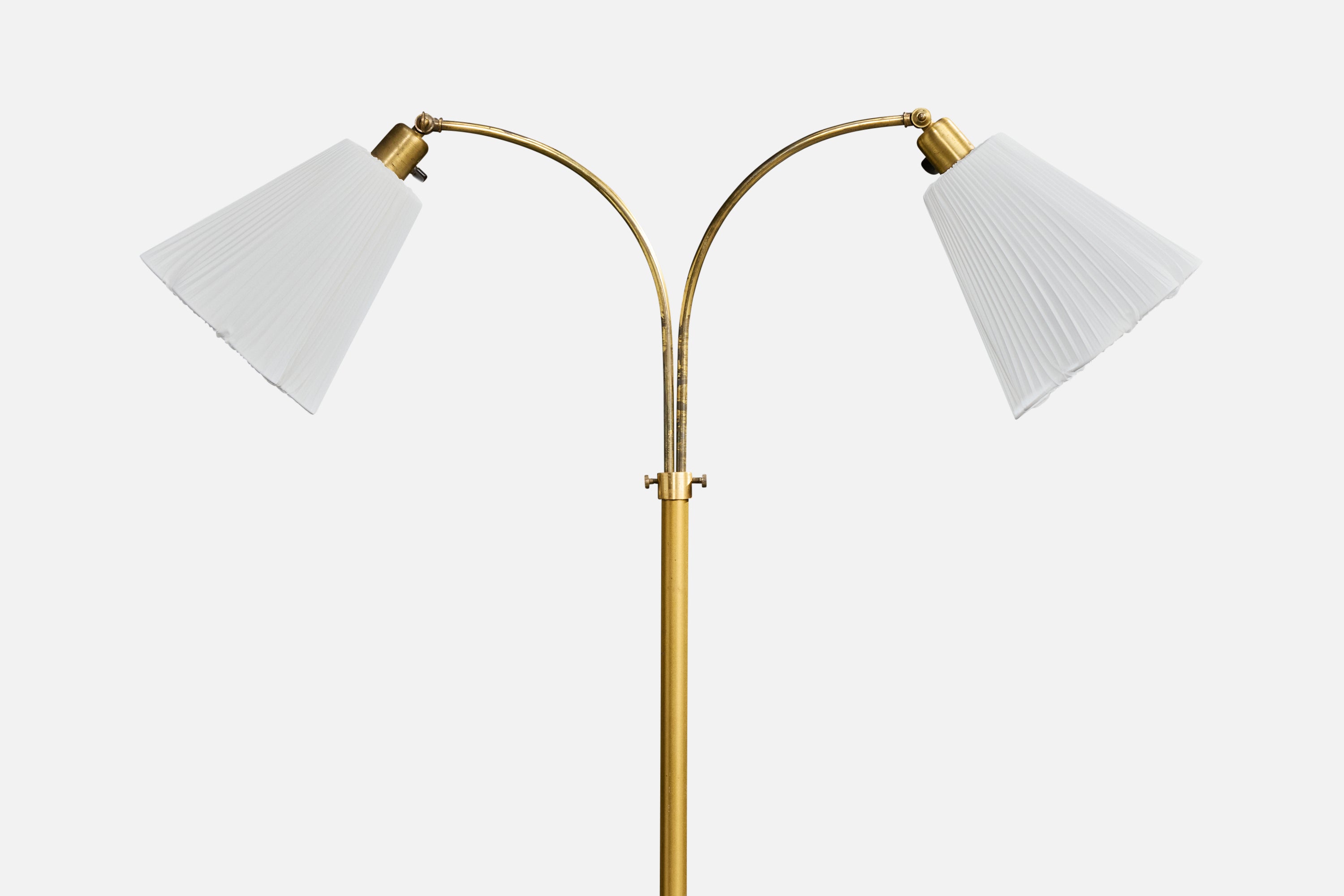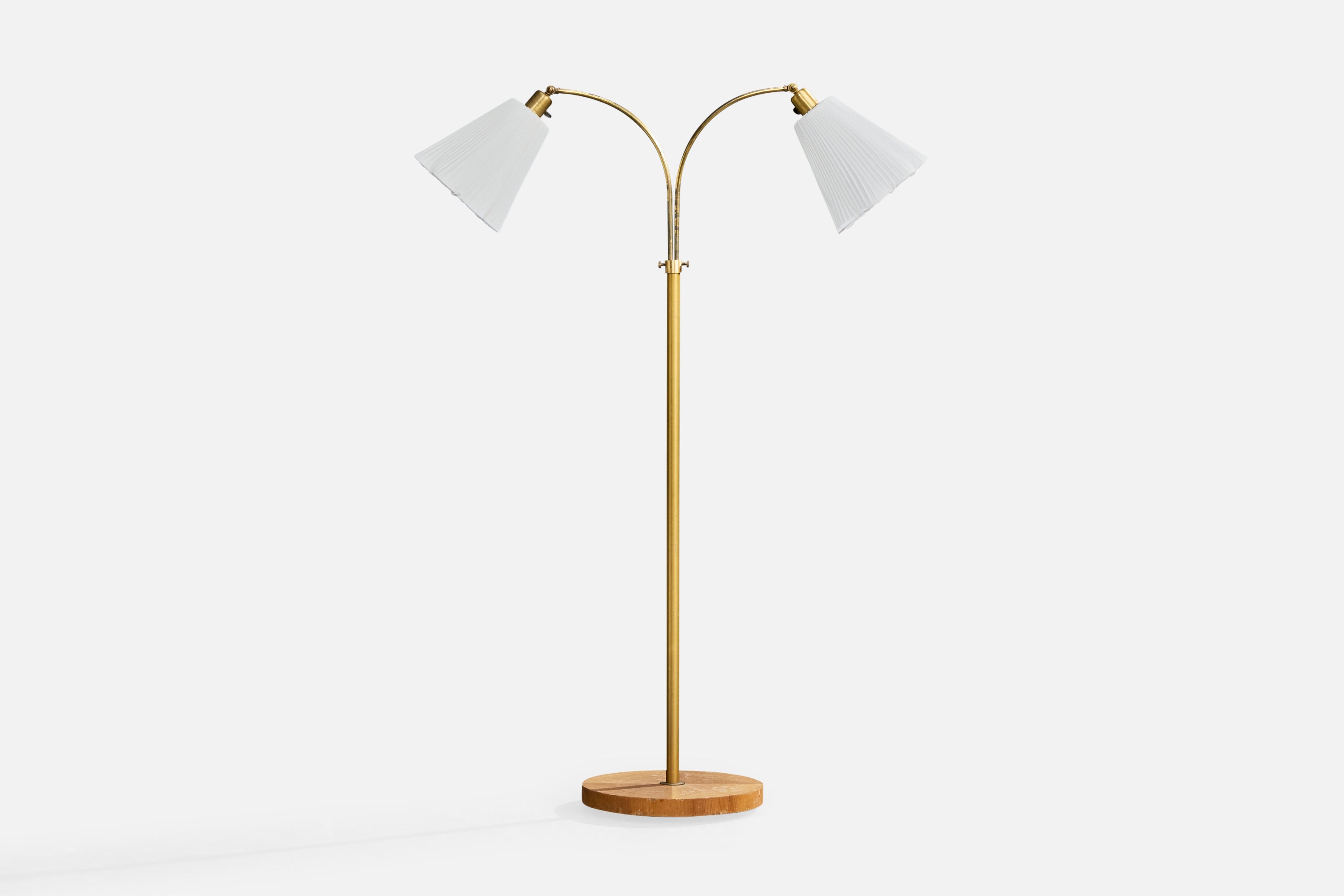 An adjustable brass, elm and white fabric floor lamp designed and produced in Sweden, c. 1940s.