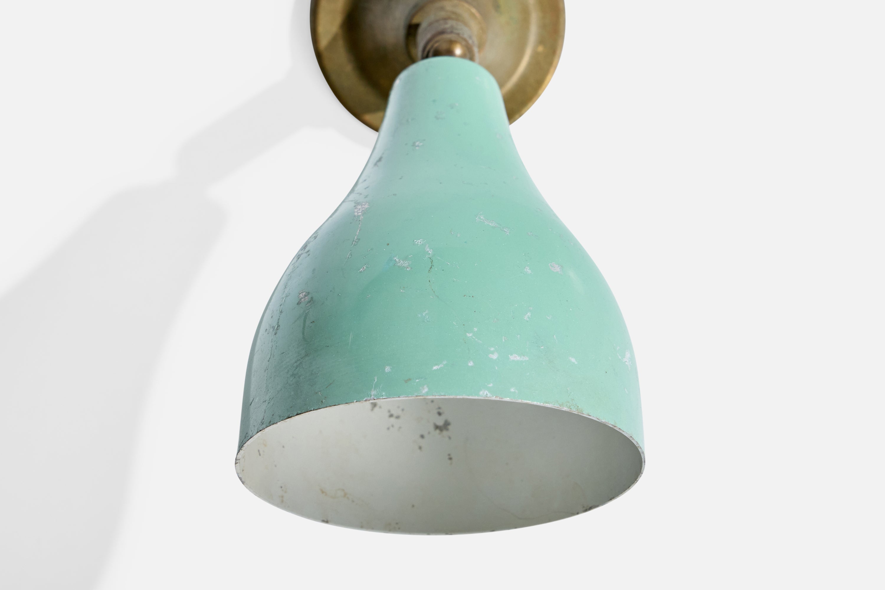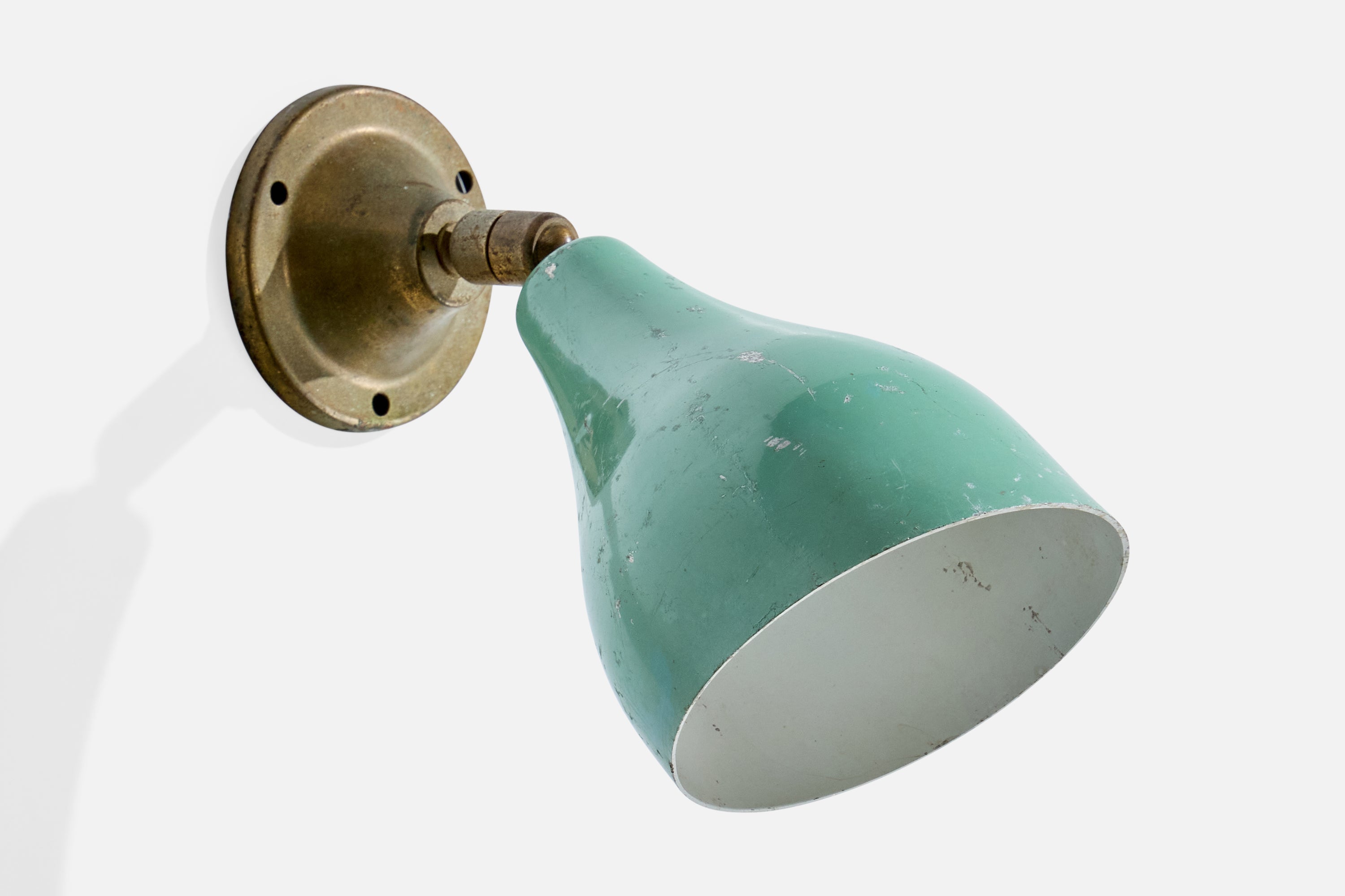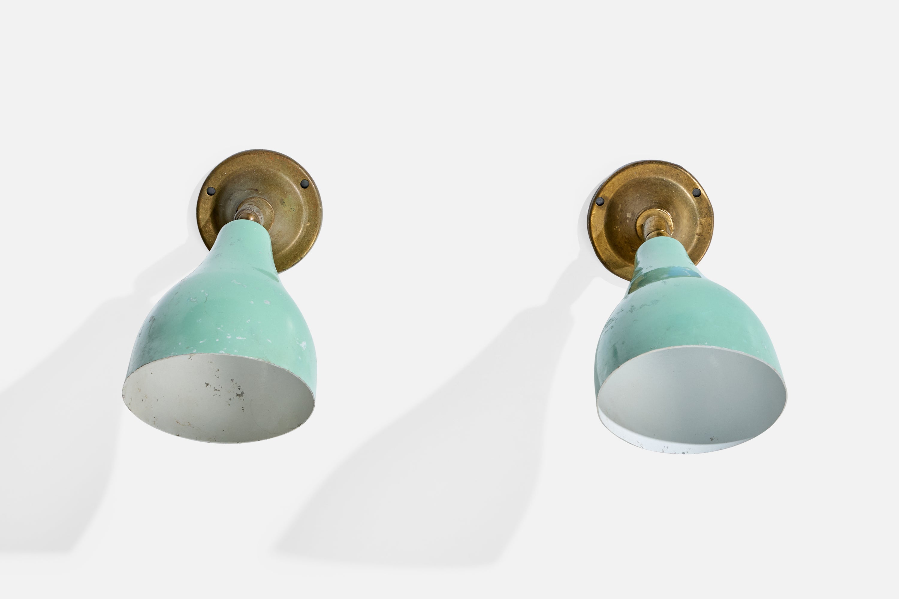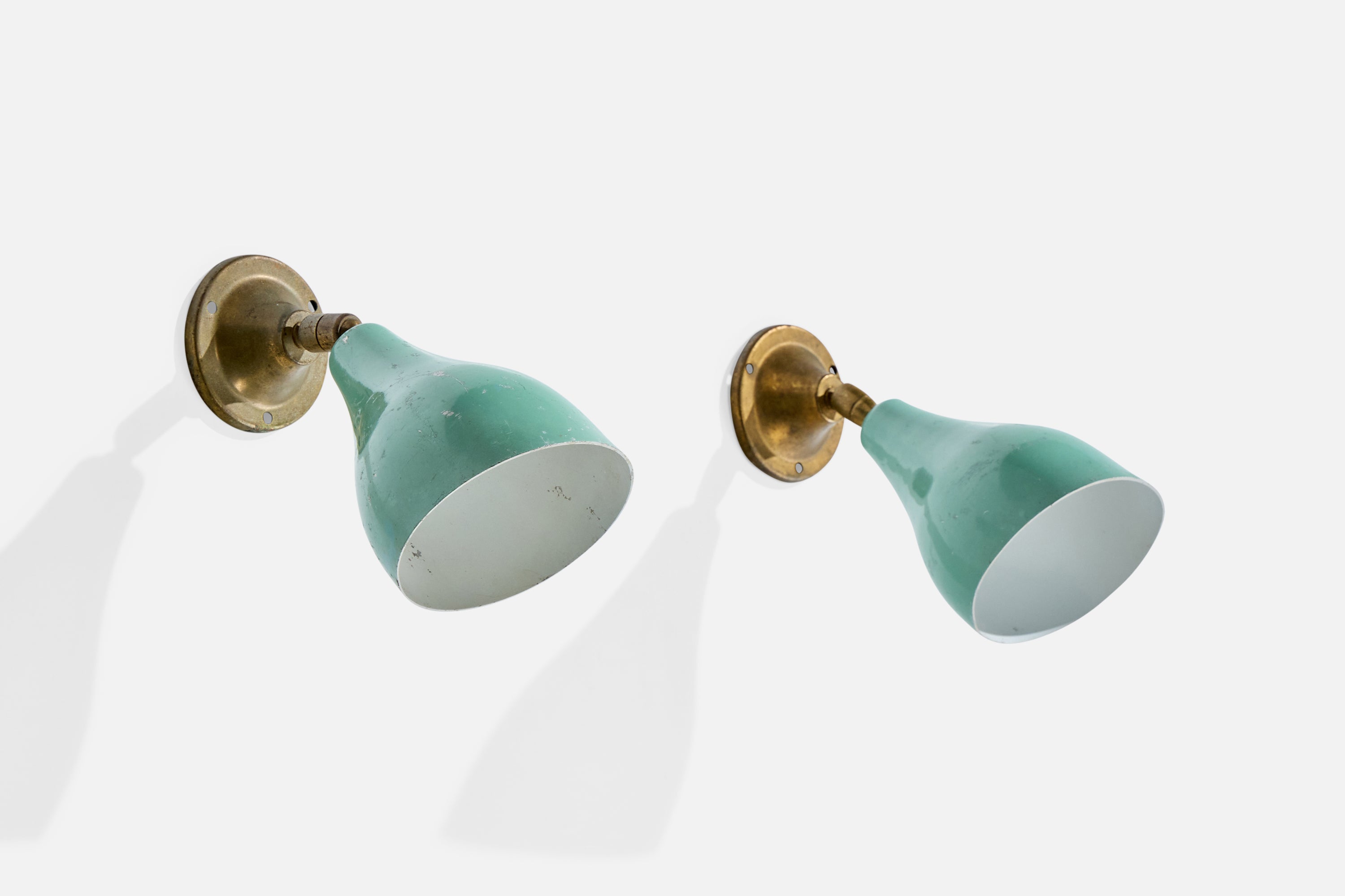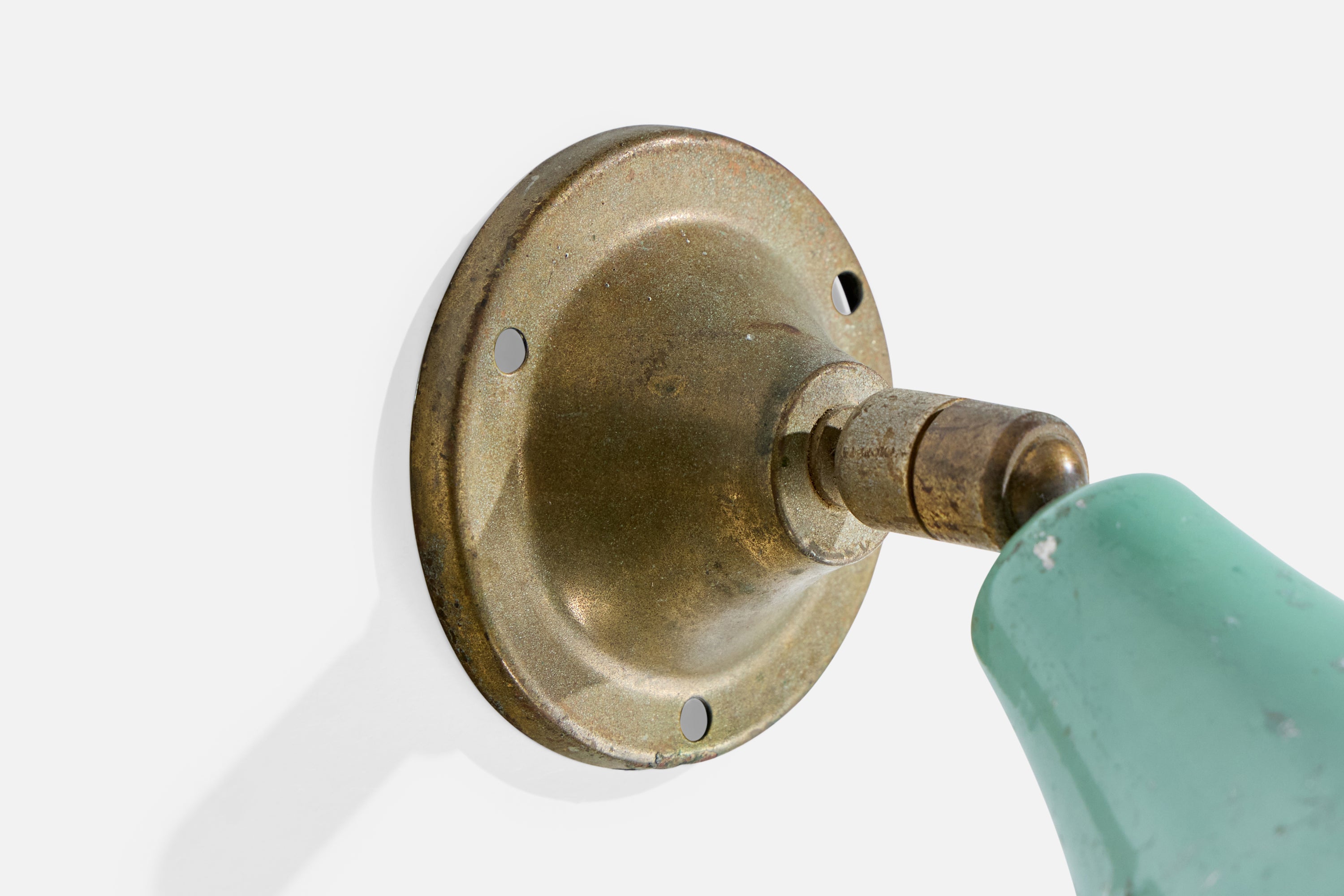 A pair of adjustable brass and green wall lights designed and produced in Italy, c. 1950s.