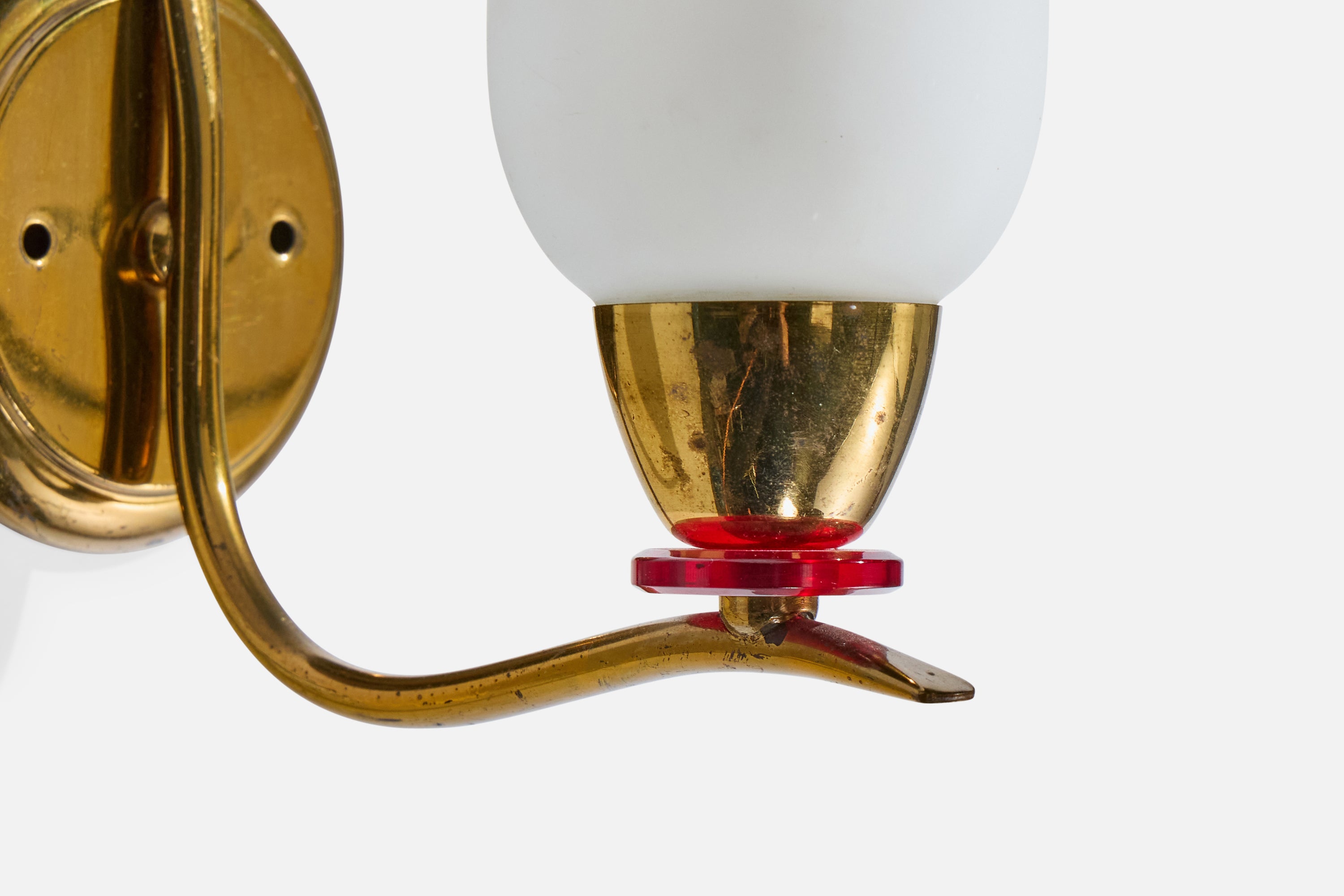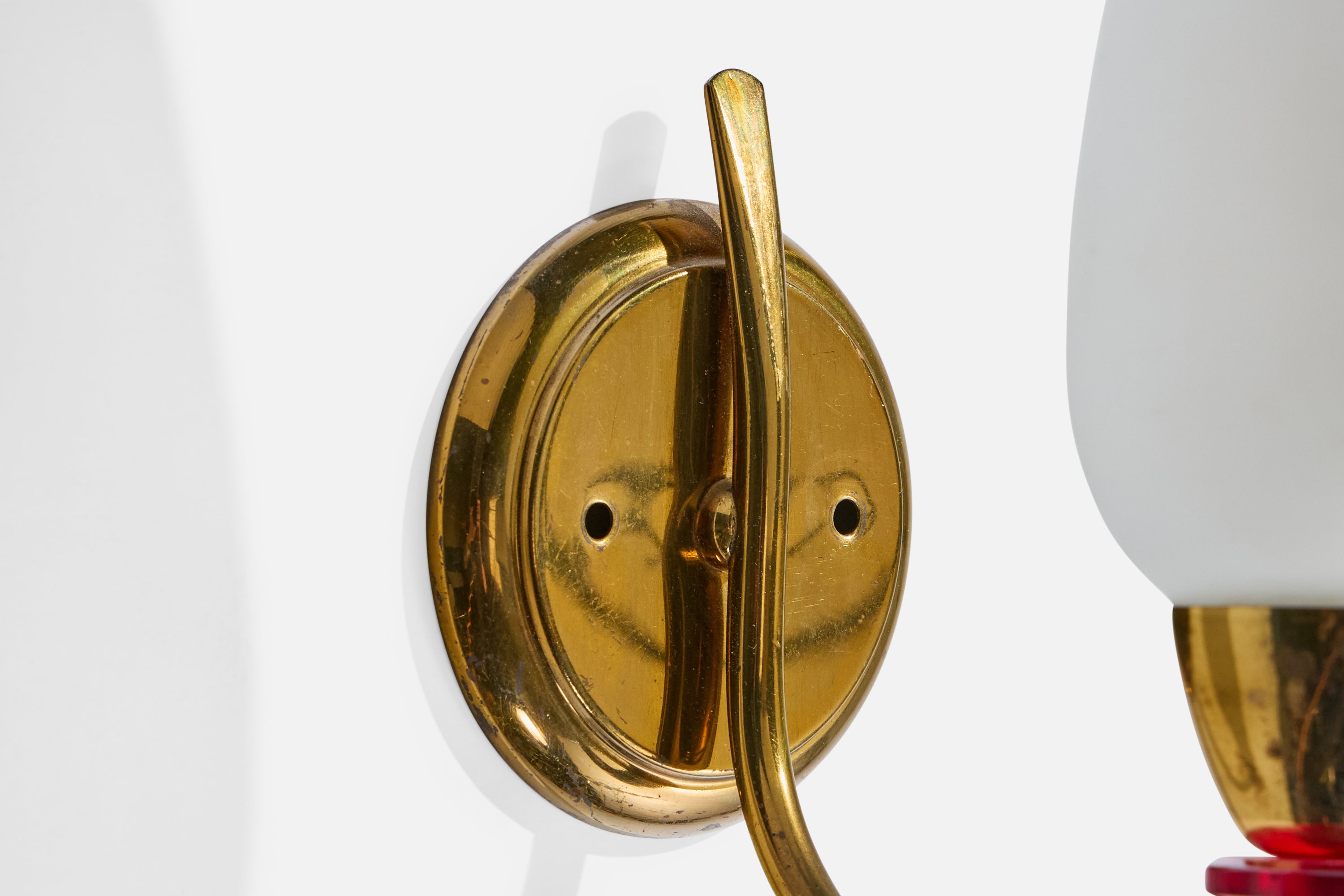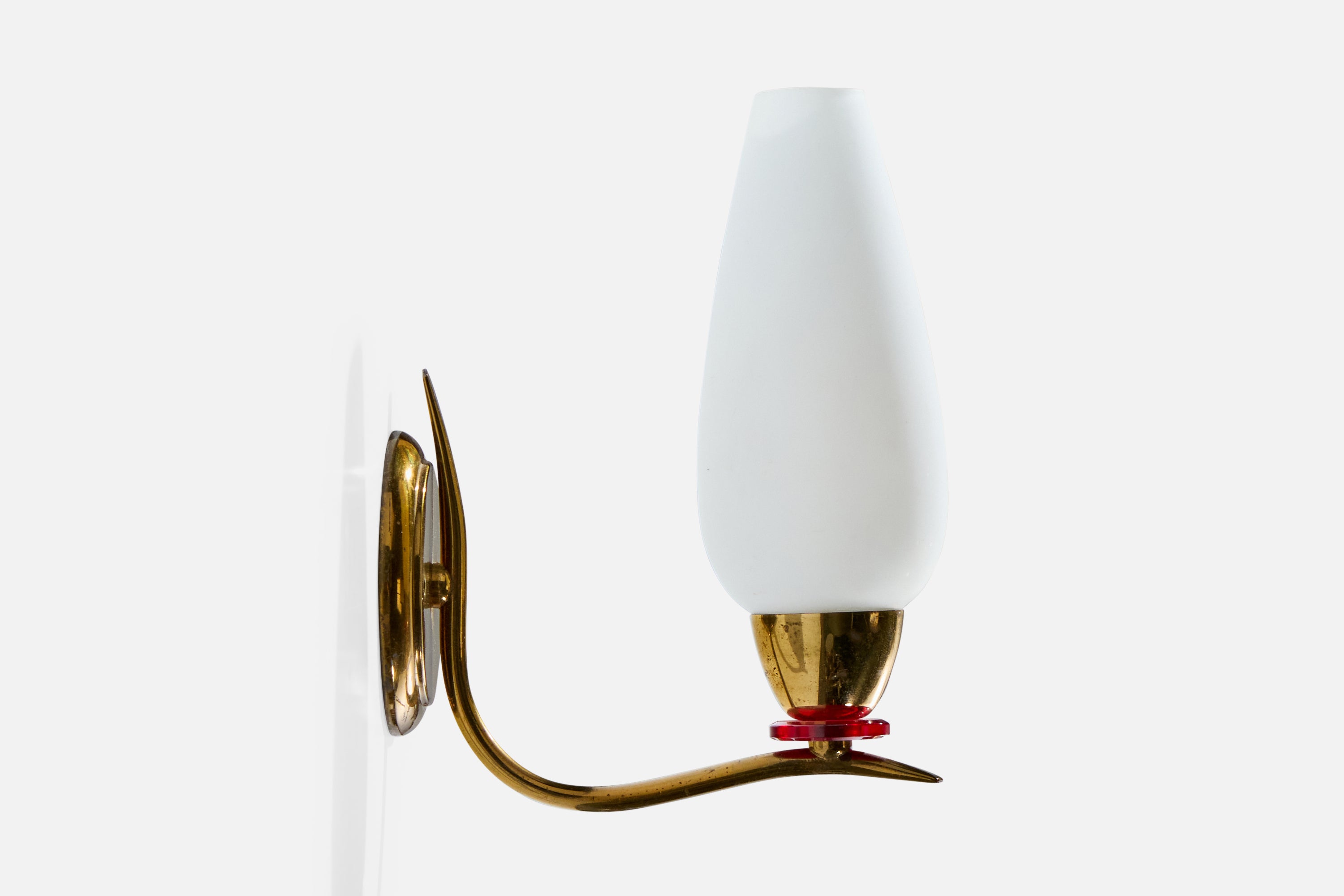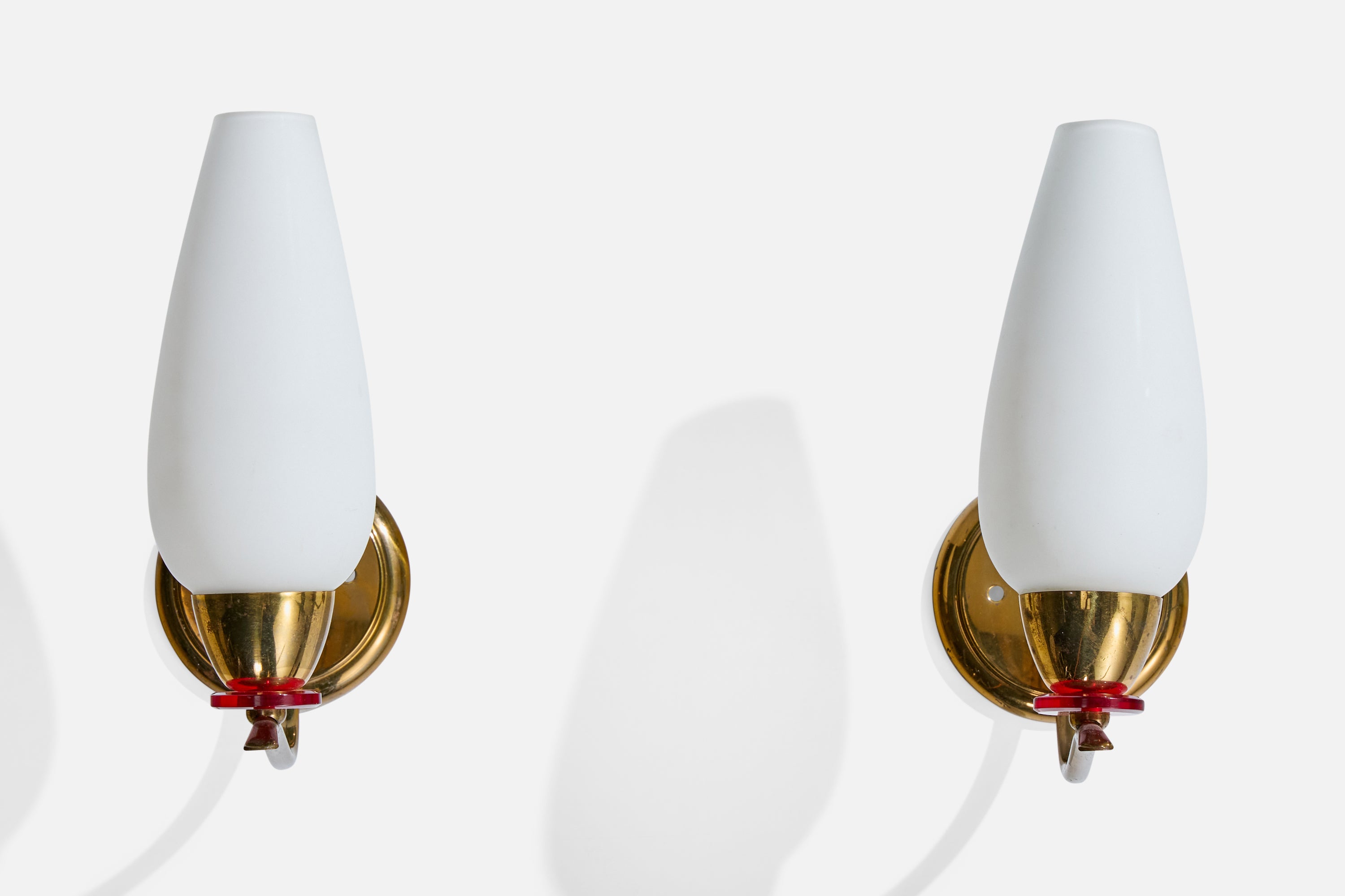 A pair of brass, red-colored and white opaline glass wall lights likely designed and produced in France, c. 1950s.