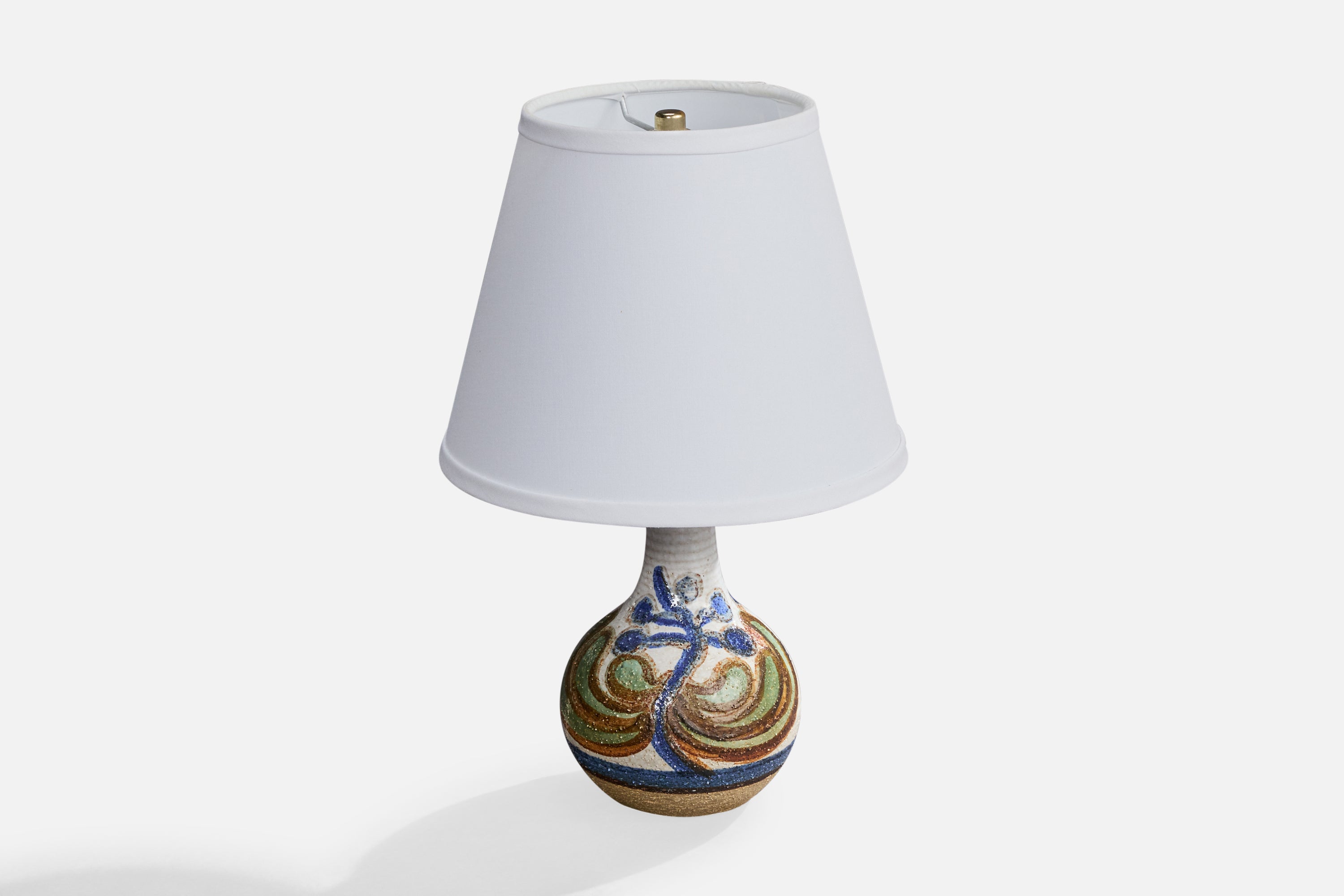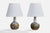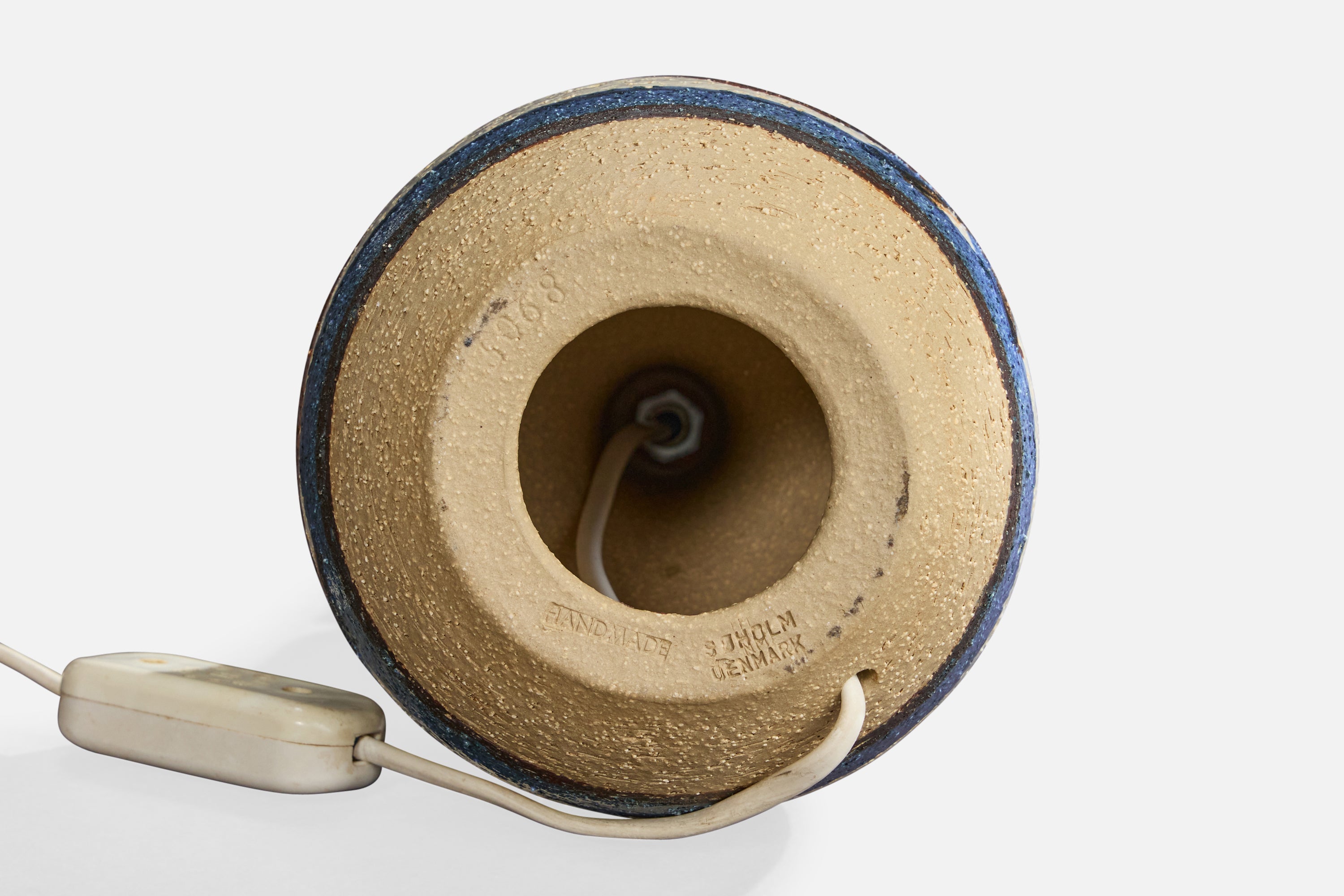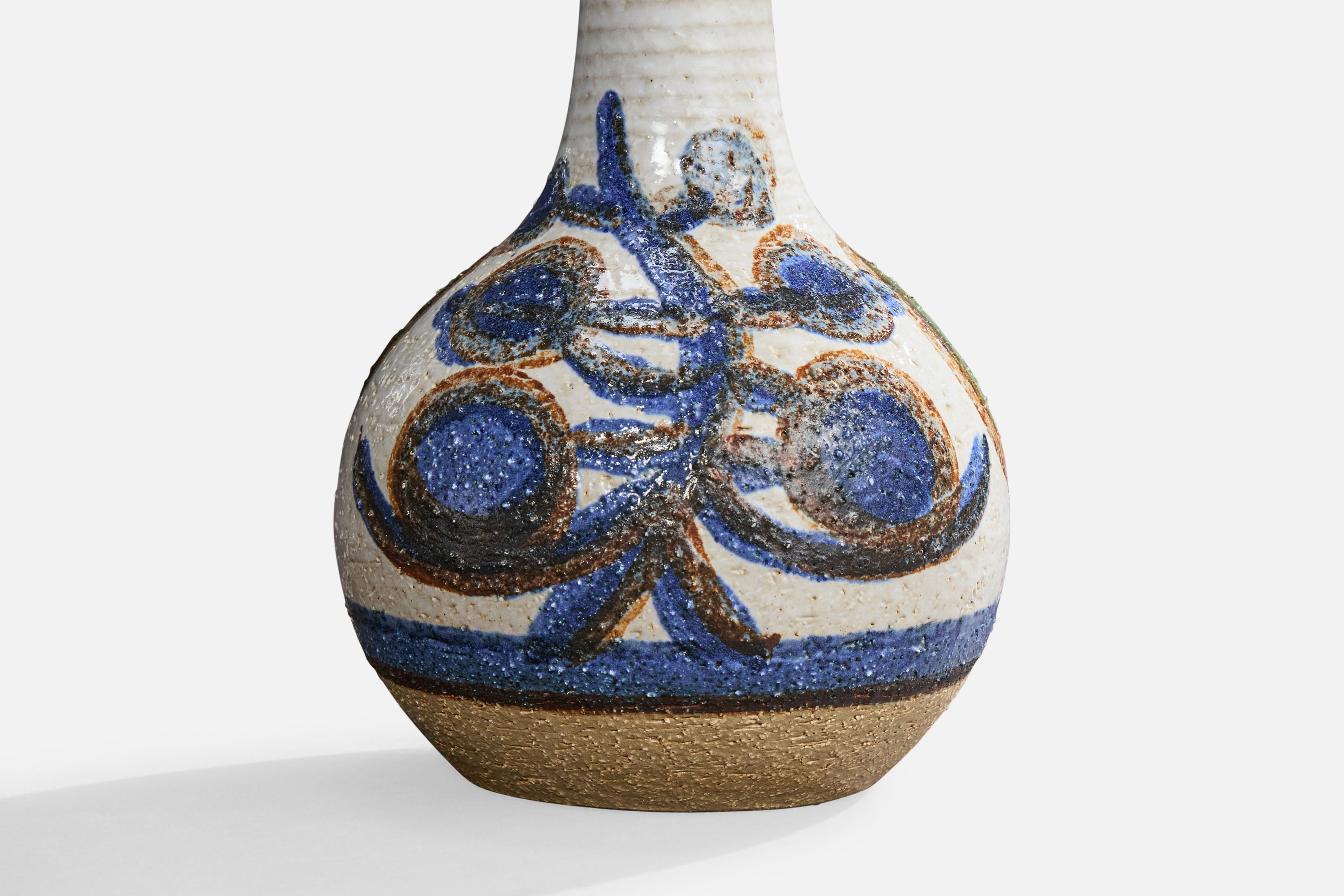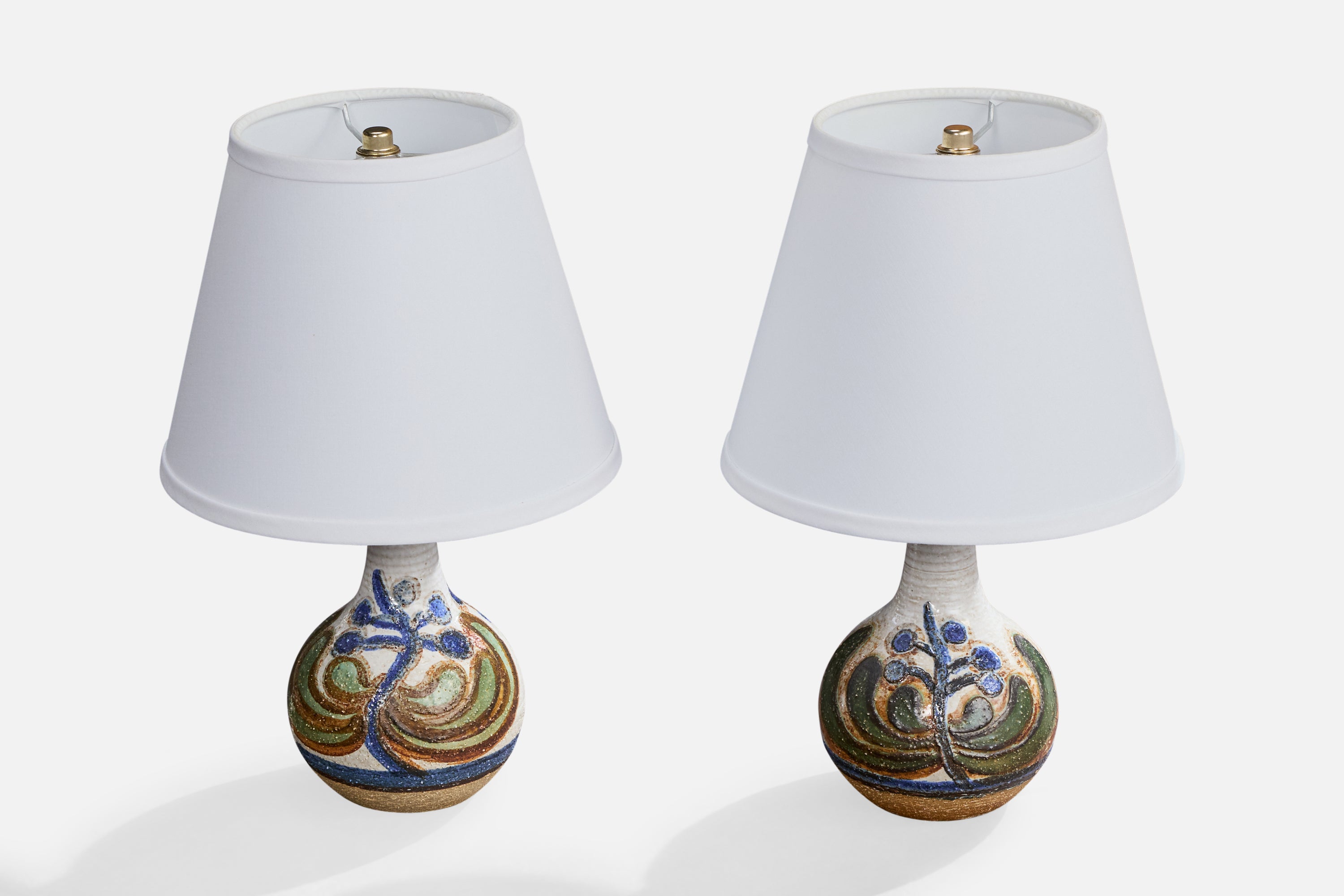 A pair of hand-painted blue, green and brown stoneware table lamps designed by Noomi Backhausen and produced by Søholm, Bornholm, Denmark, c. 1960s.