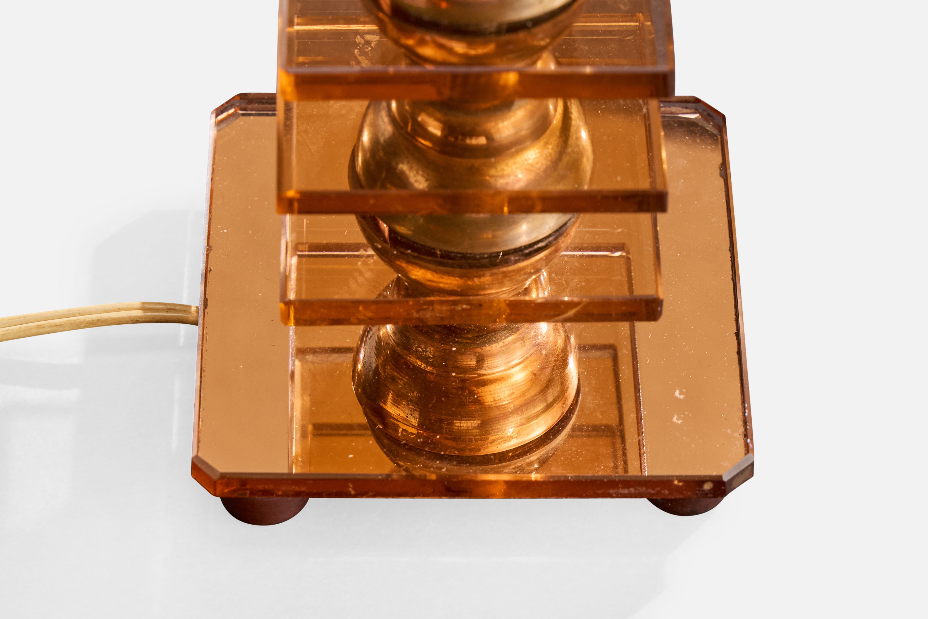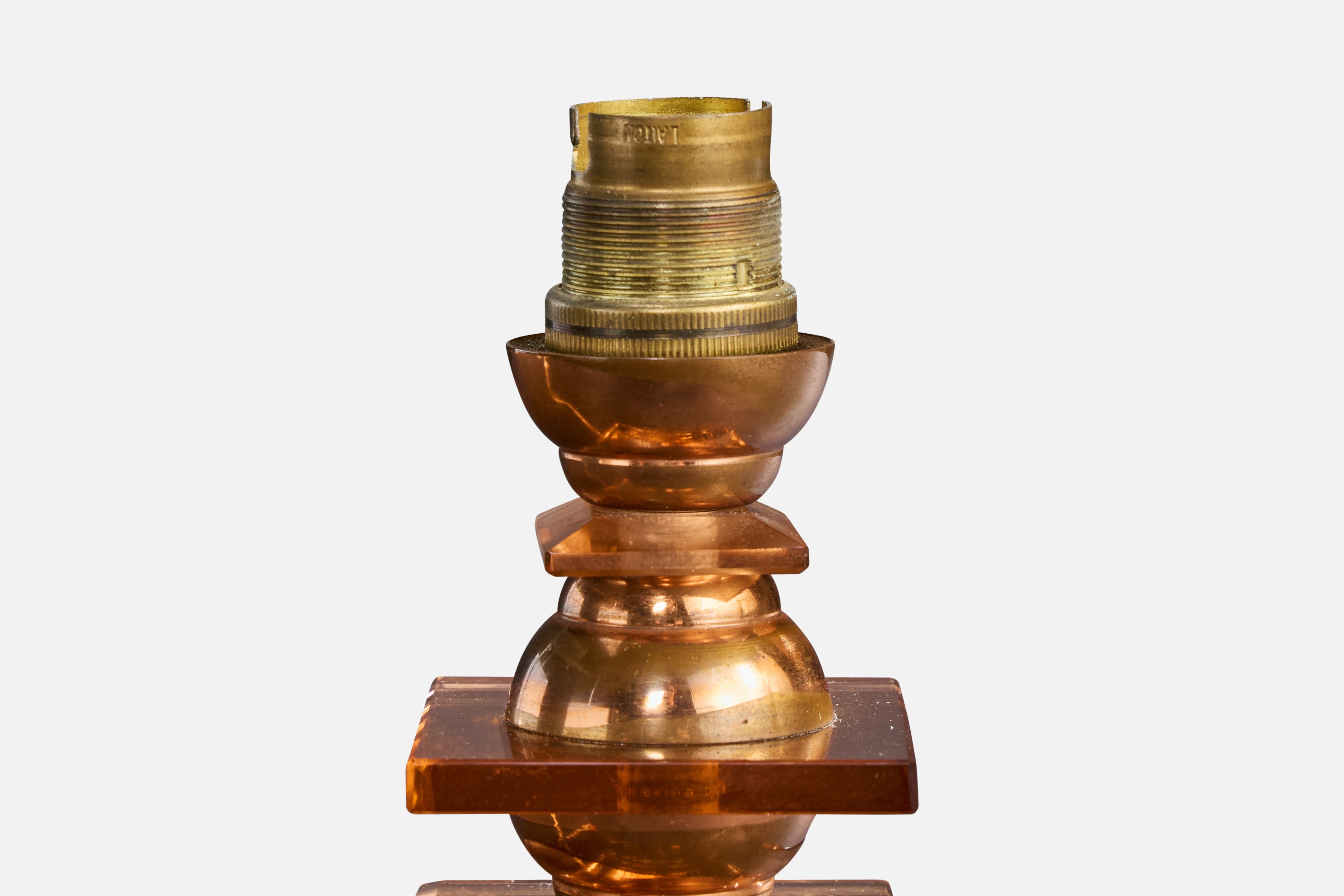 An orange glass, copper and beige parchment paper table lamp designed and produced in France, c. 1950s.