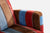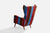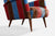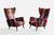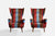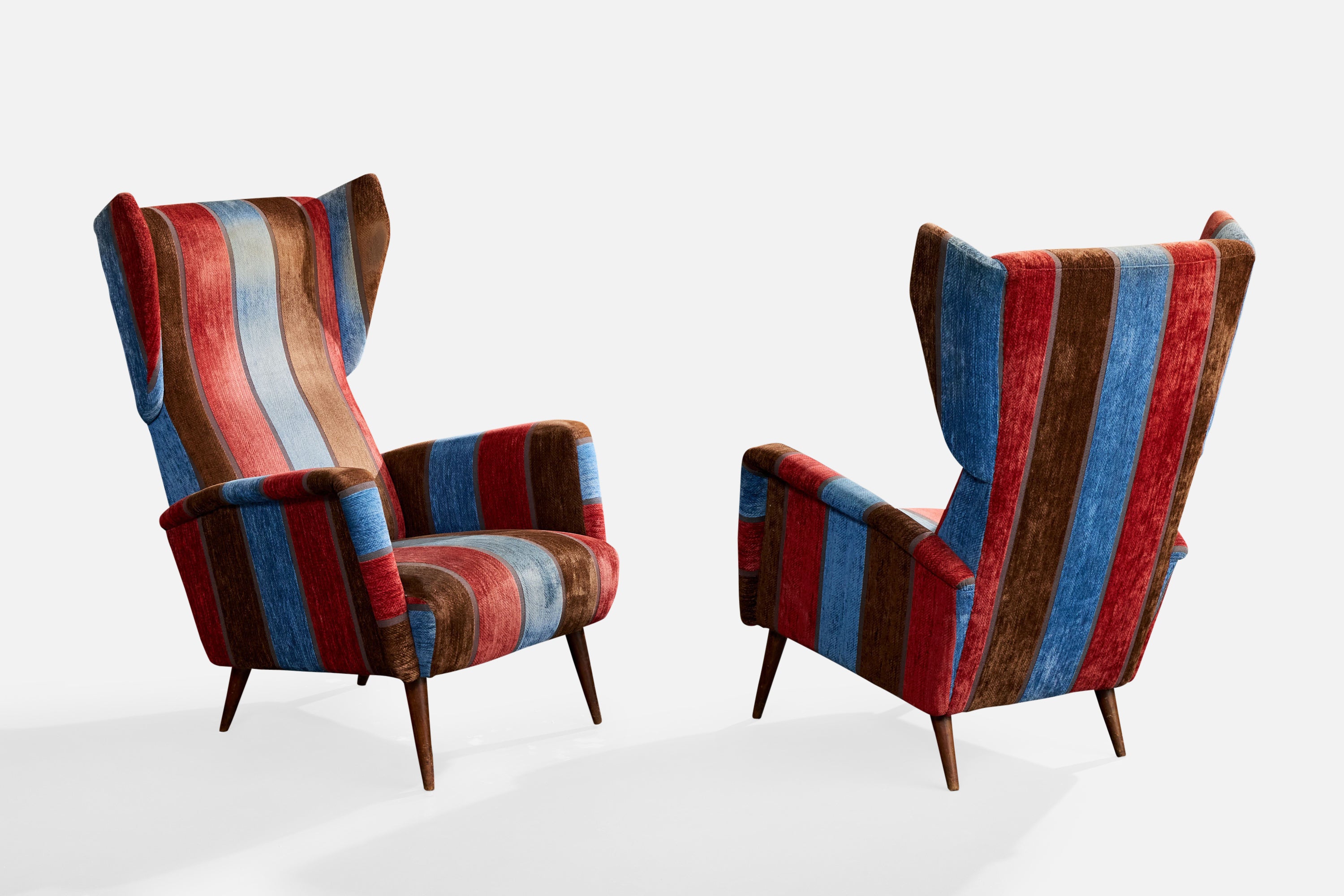 A pair of red, brown, blue velvet and wood lounge chairs designed by Gio Ponti and produced by Dassi, Italy, 1950s.