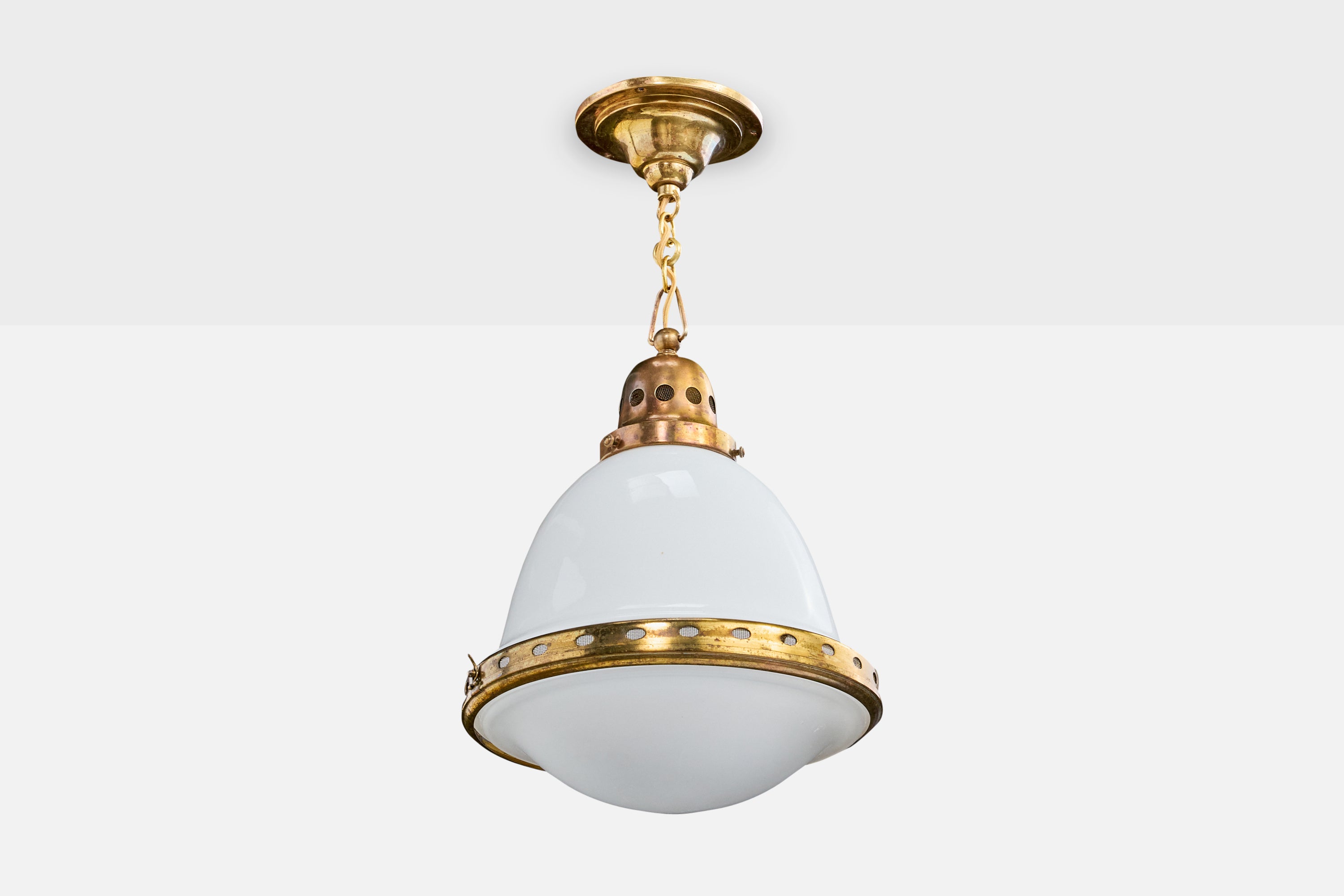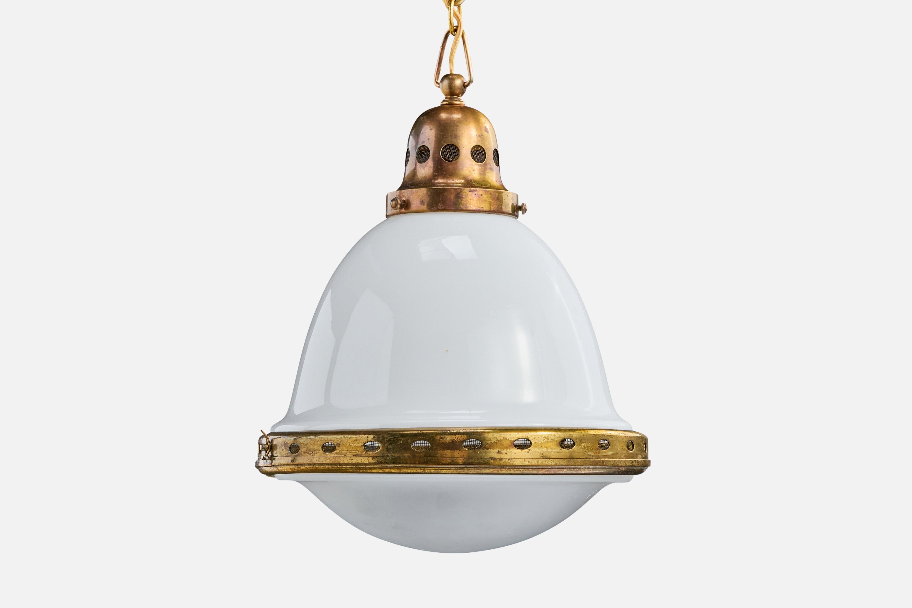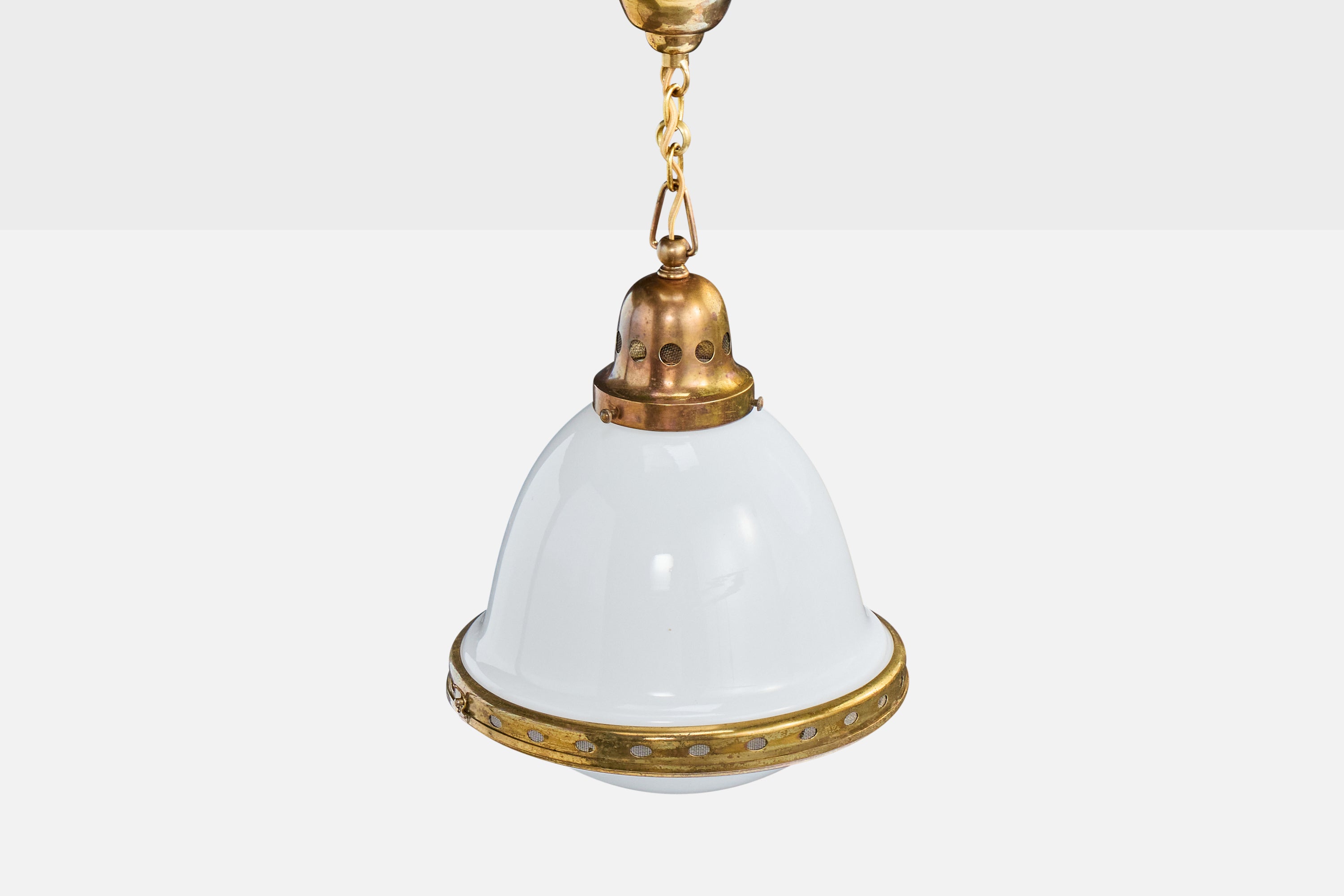 A brass and white opaline glass pendant light produced by Bag Turgi, Switzerland, c. 1920s.