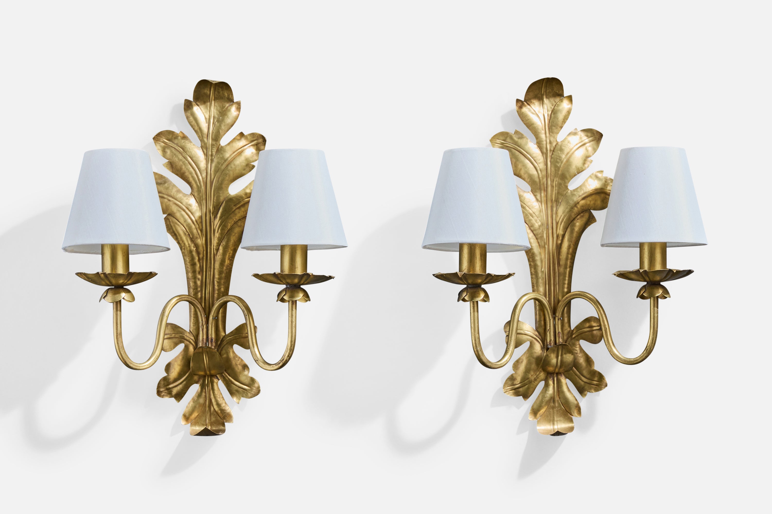A pair of brass and white fabric wall lights designed and produced in France, c. 1960s.