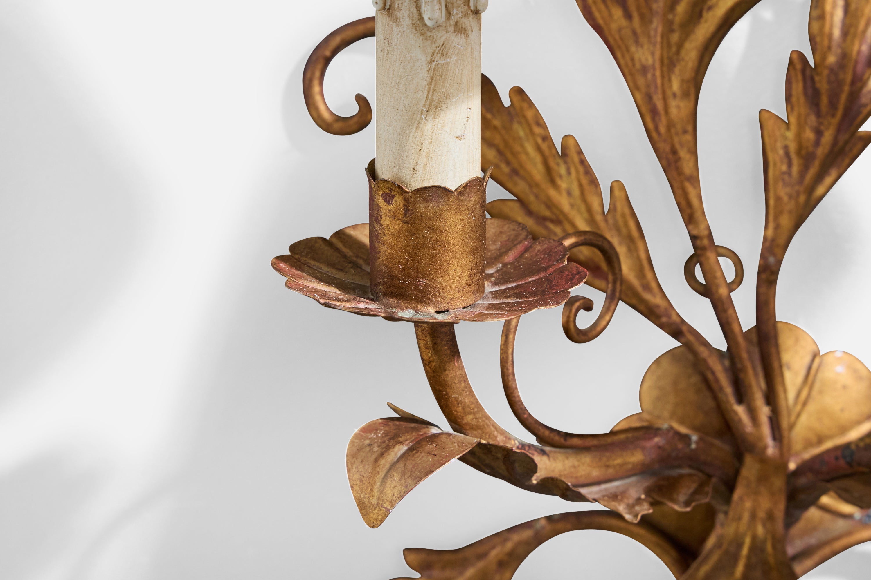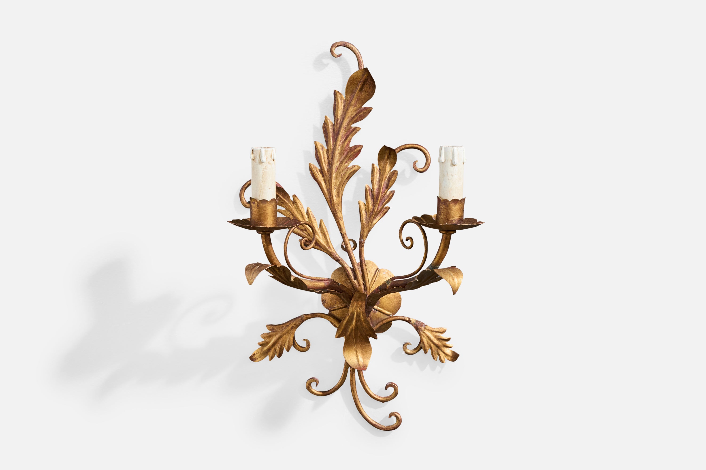 A pair of bronze-painted metal, plastic and off-white fabric wall lights designed and produced in Italy, c. 1940s.