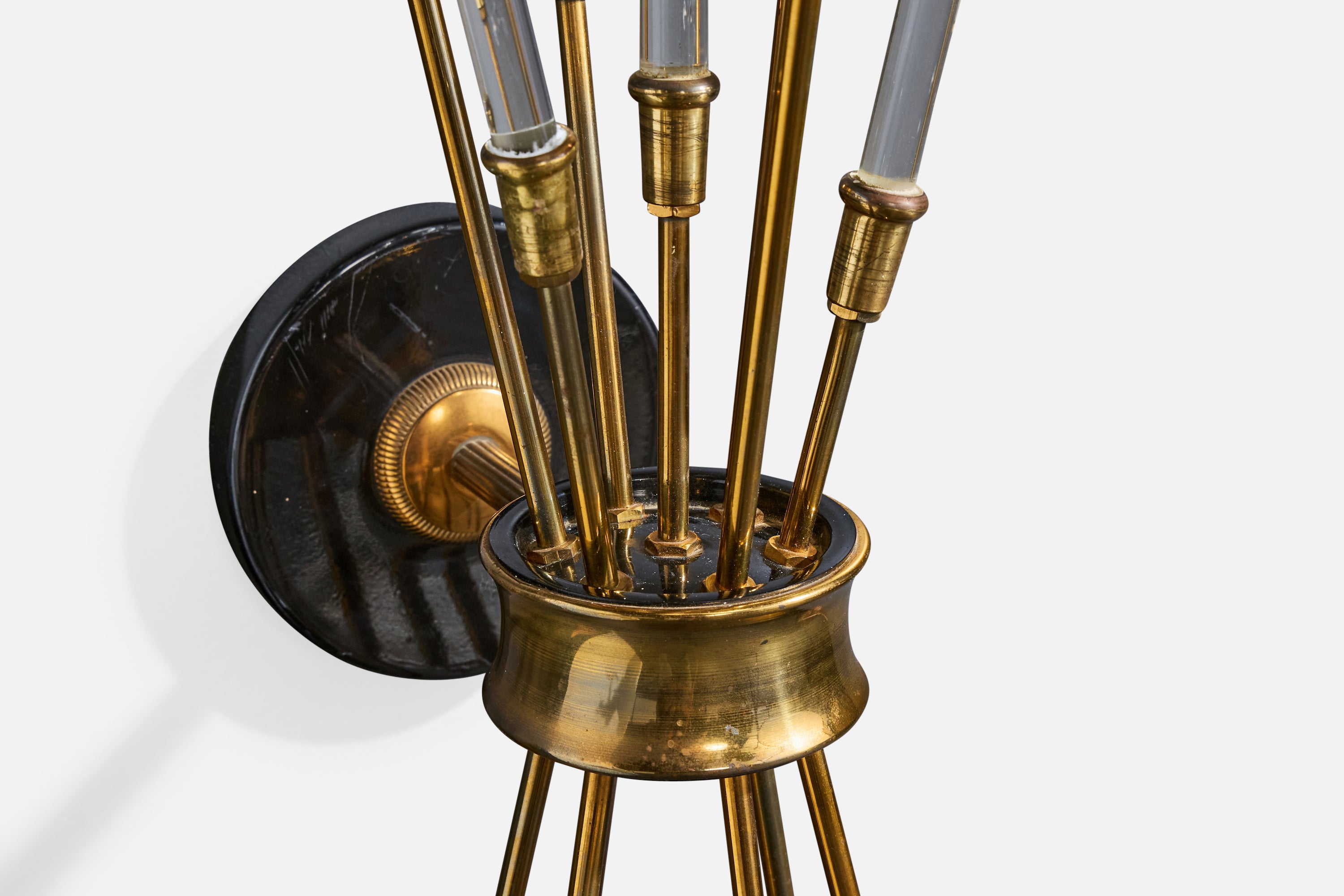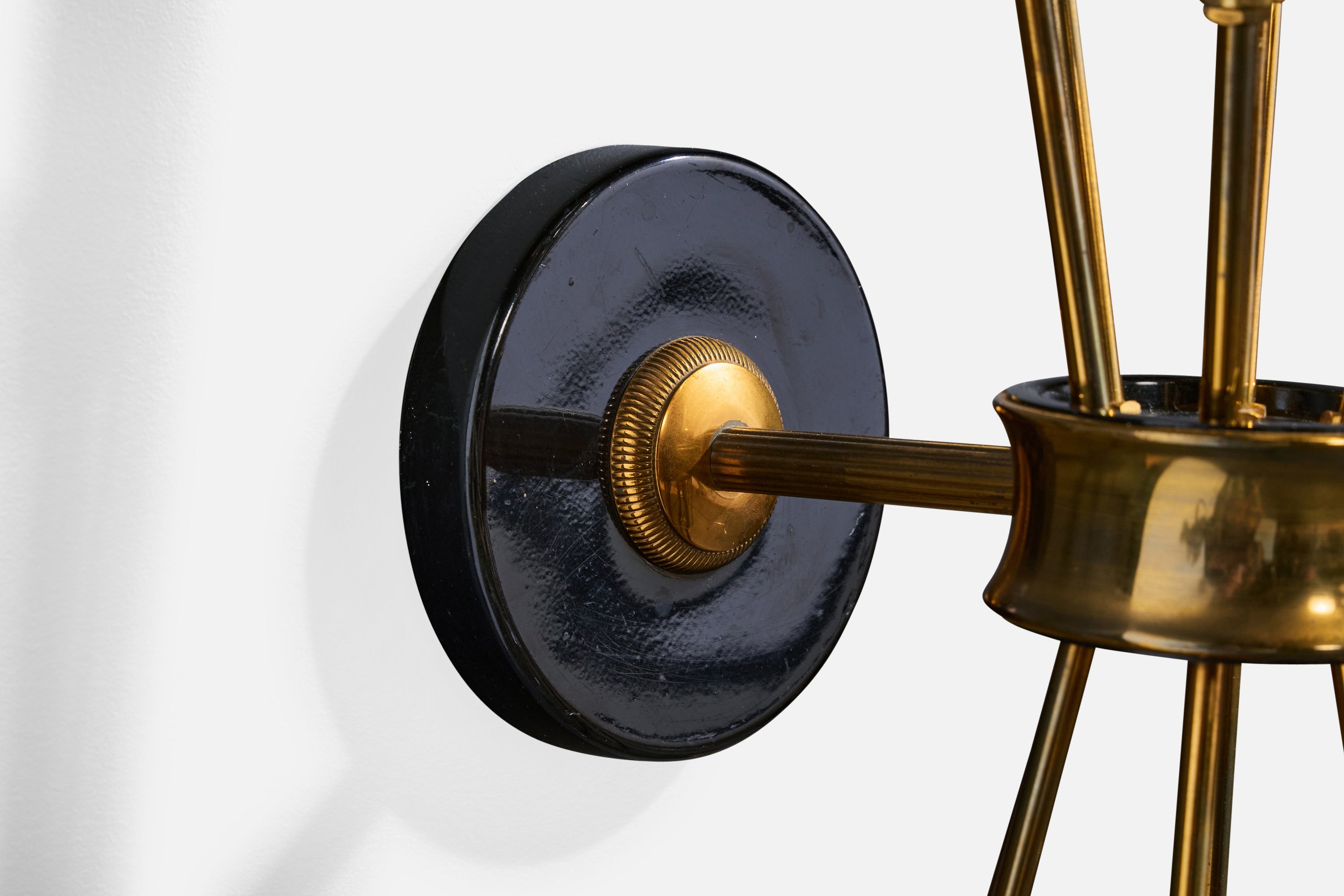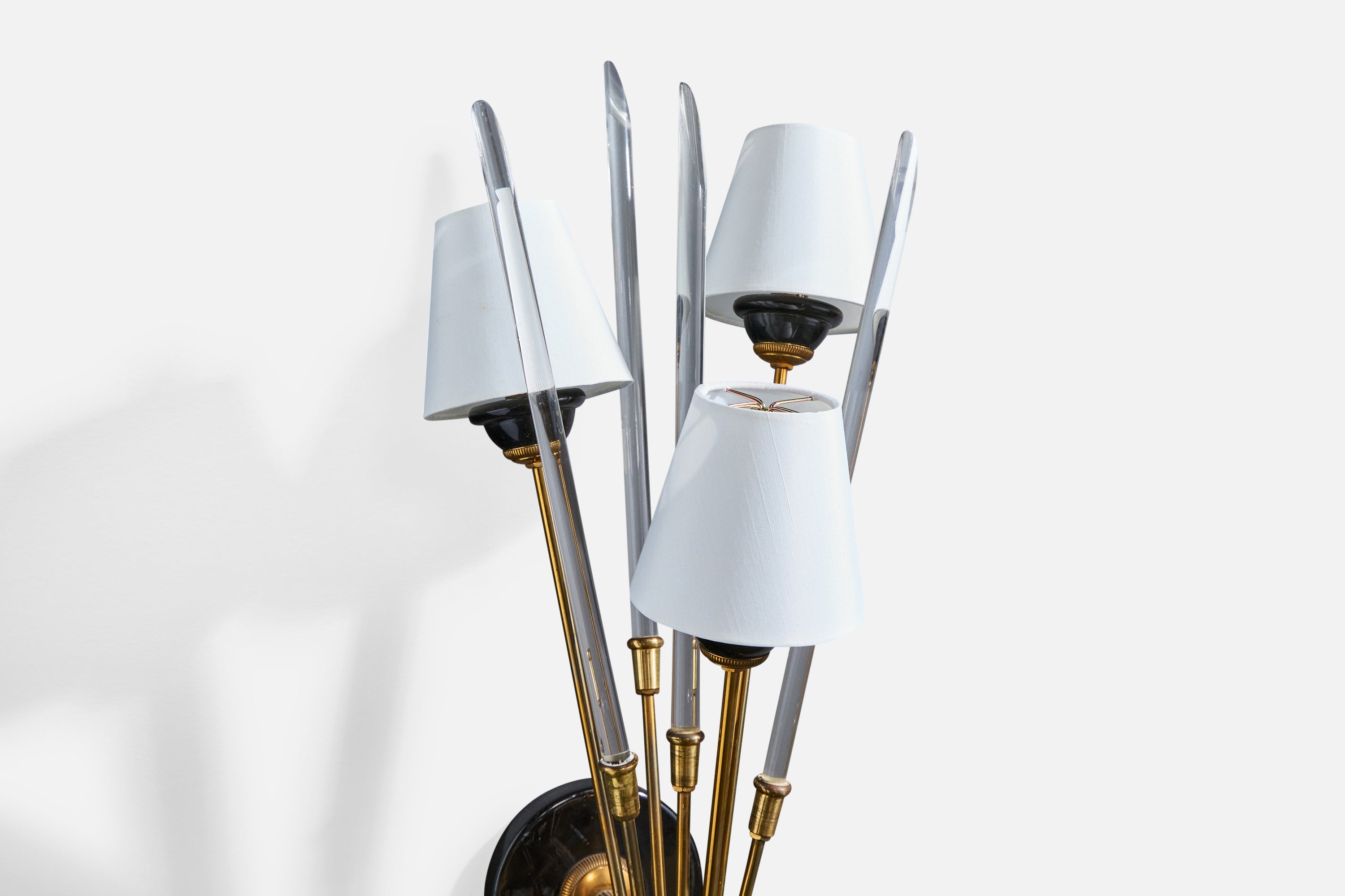 A sizable brass, black-lacquered metal, plexiglass and white fabric wall light designed and produced in France, c. 1950s.