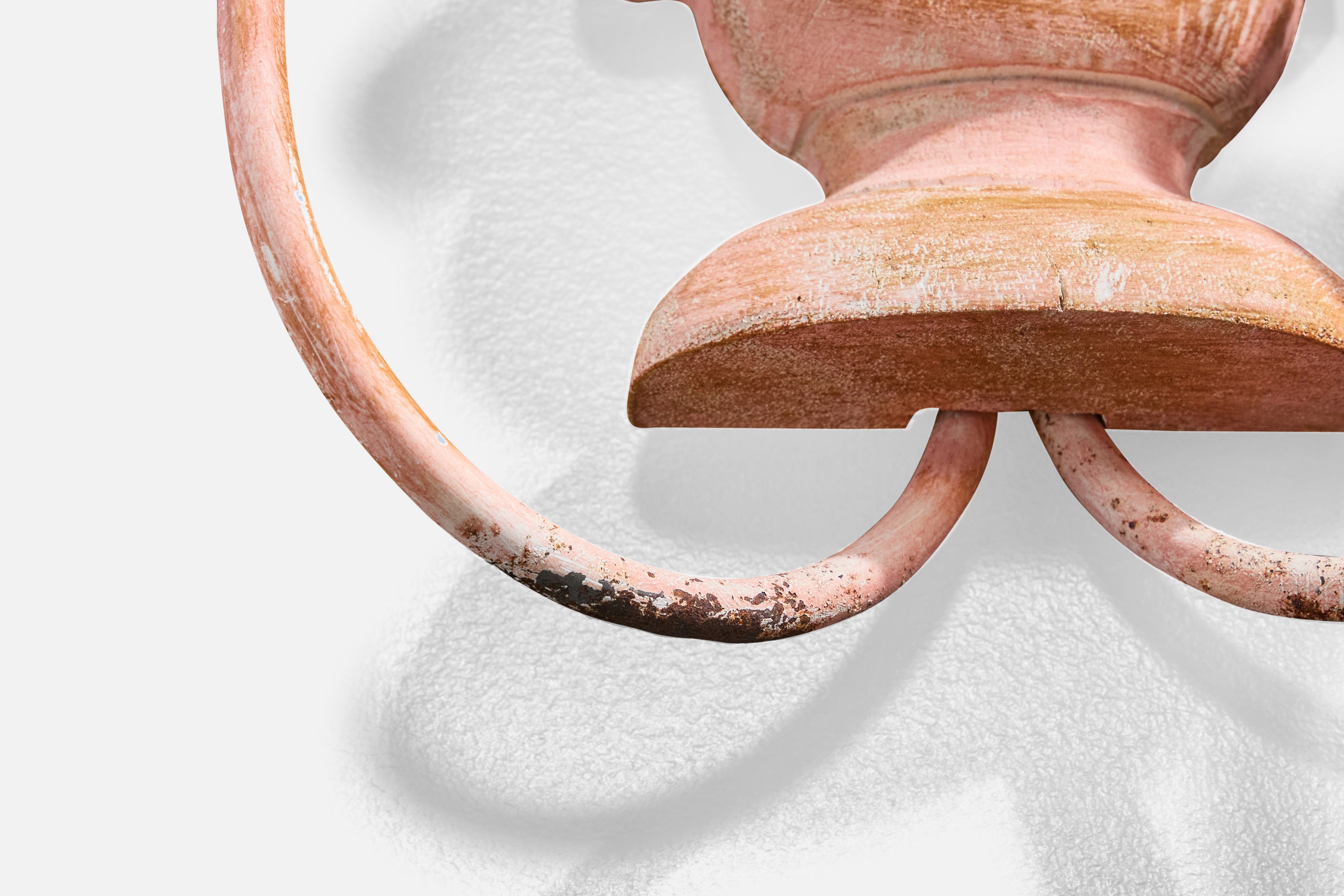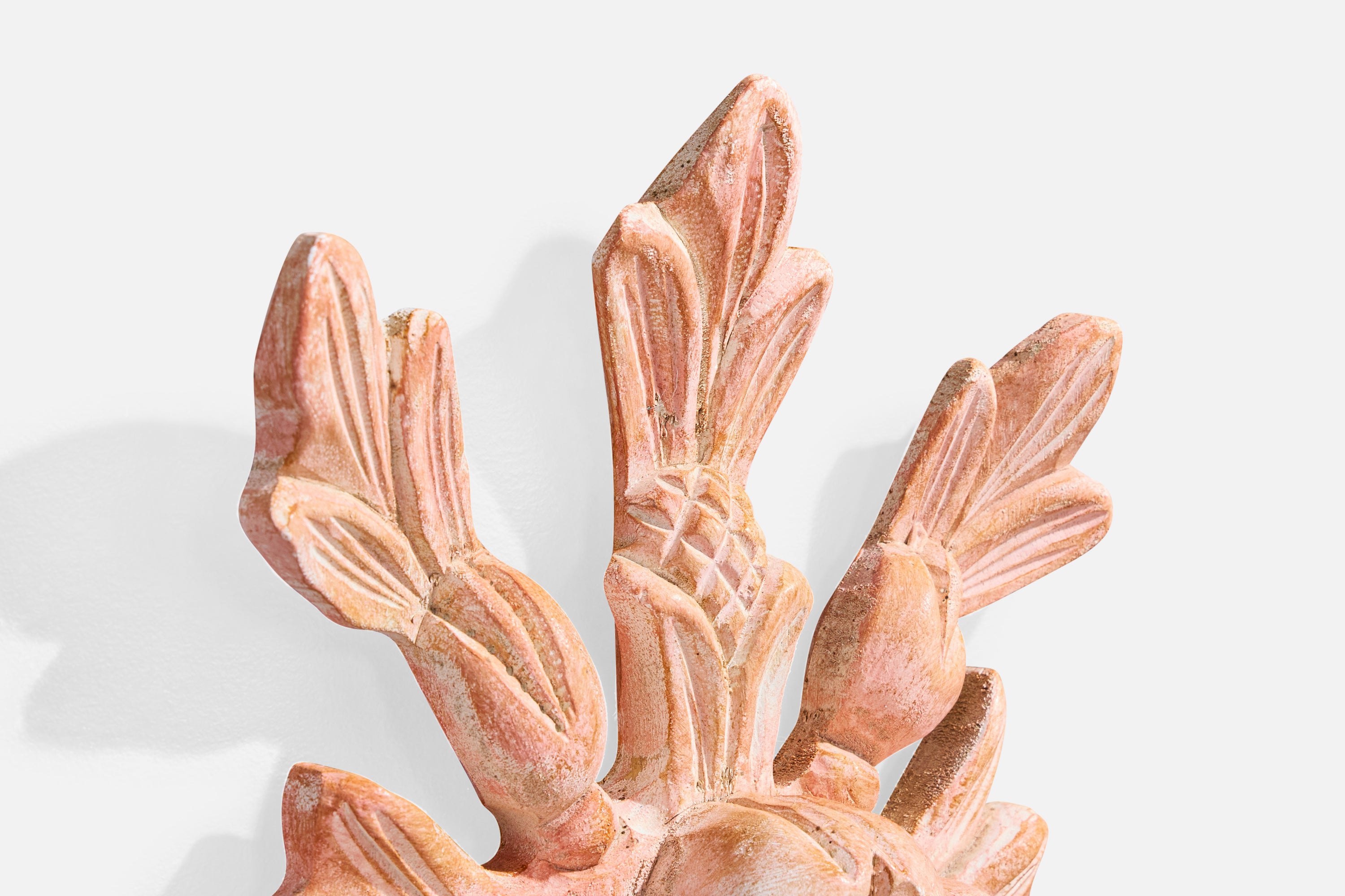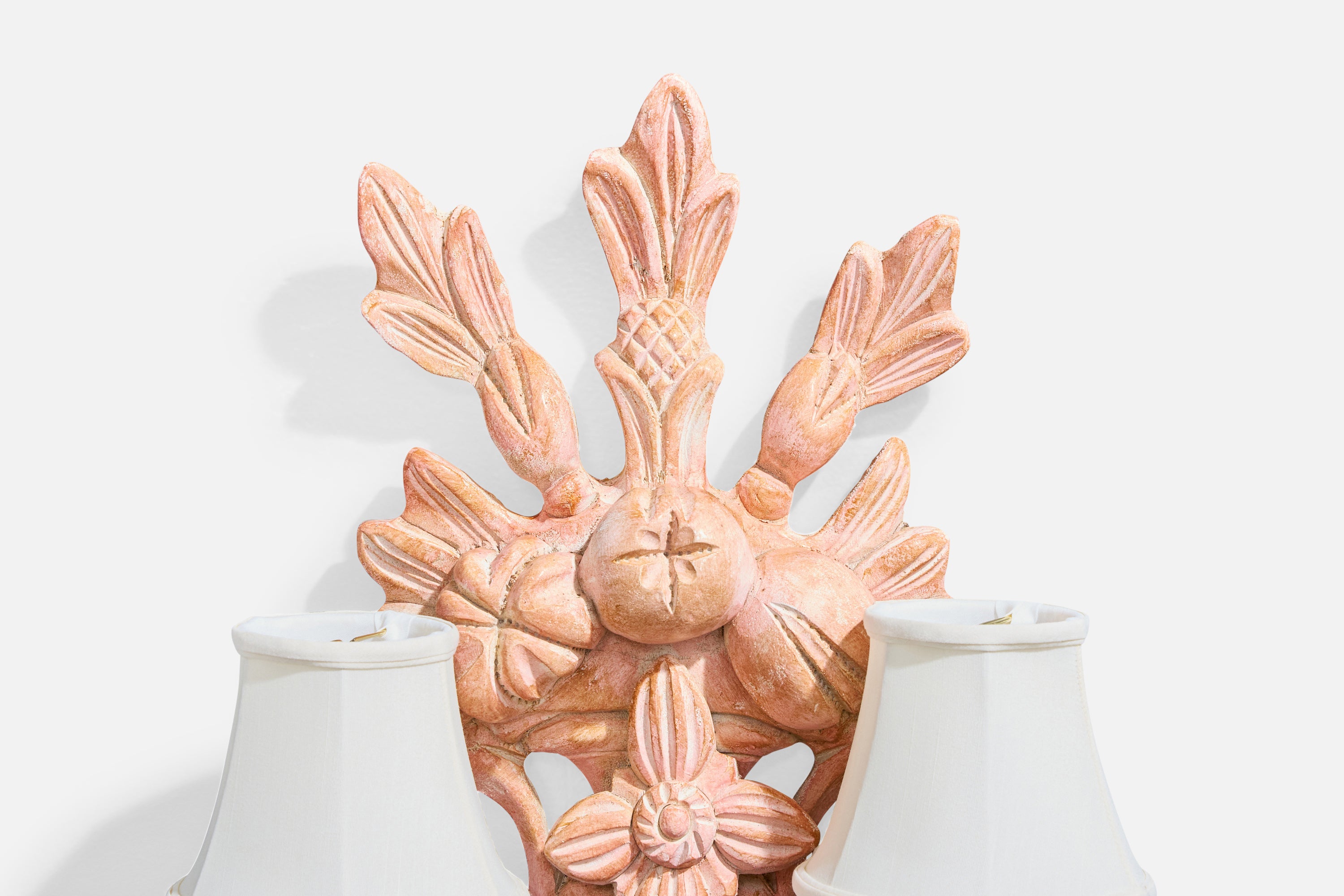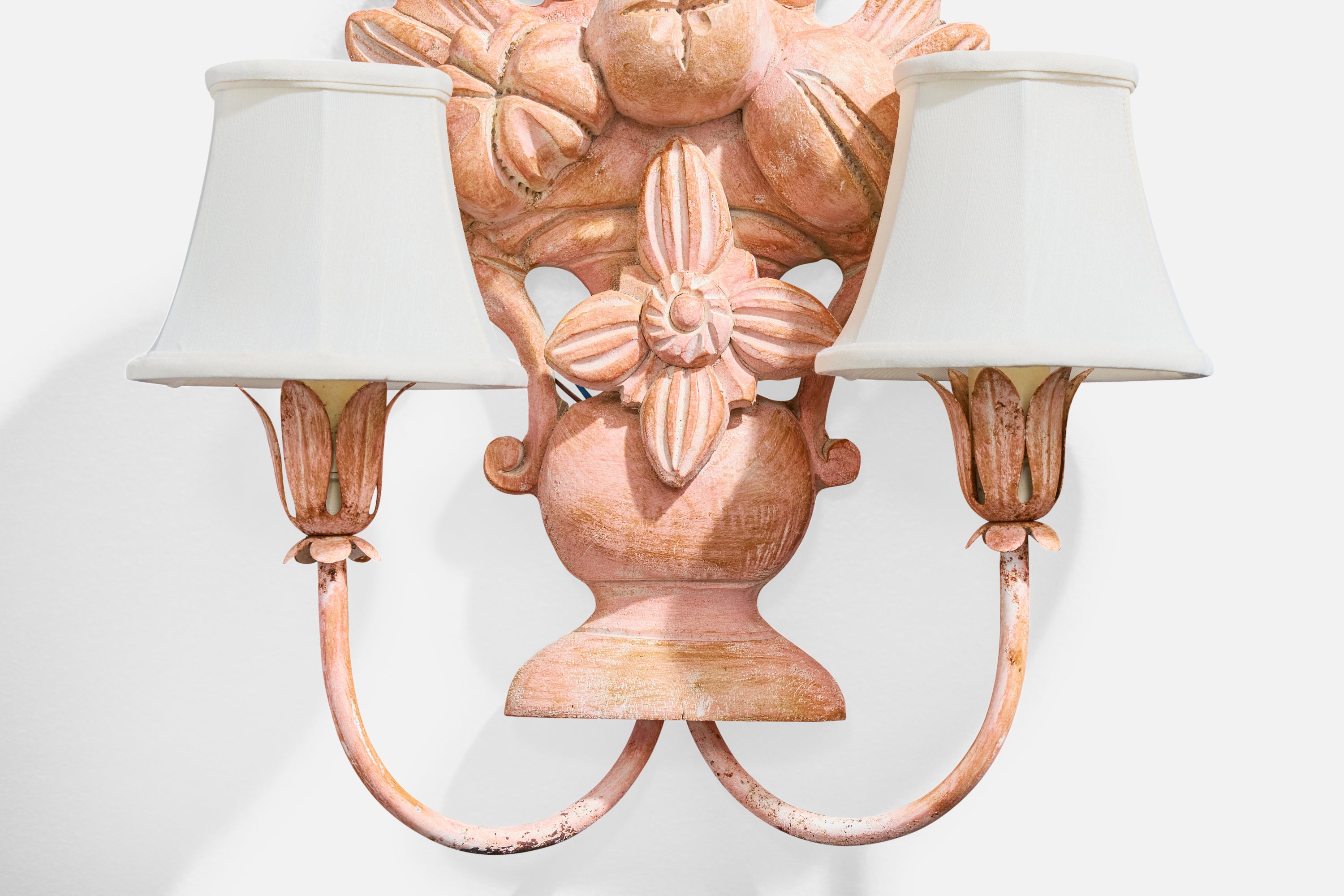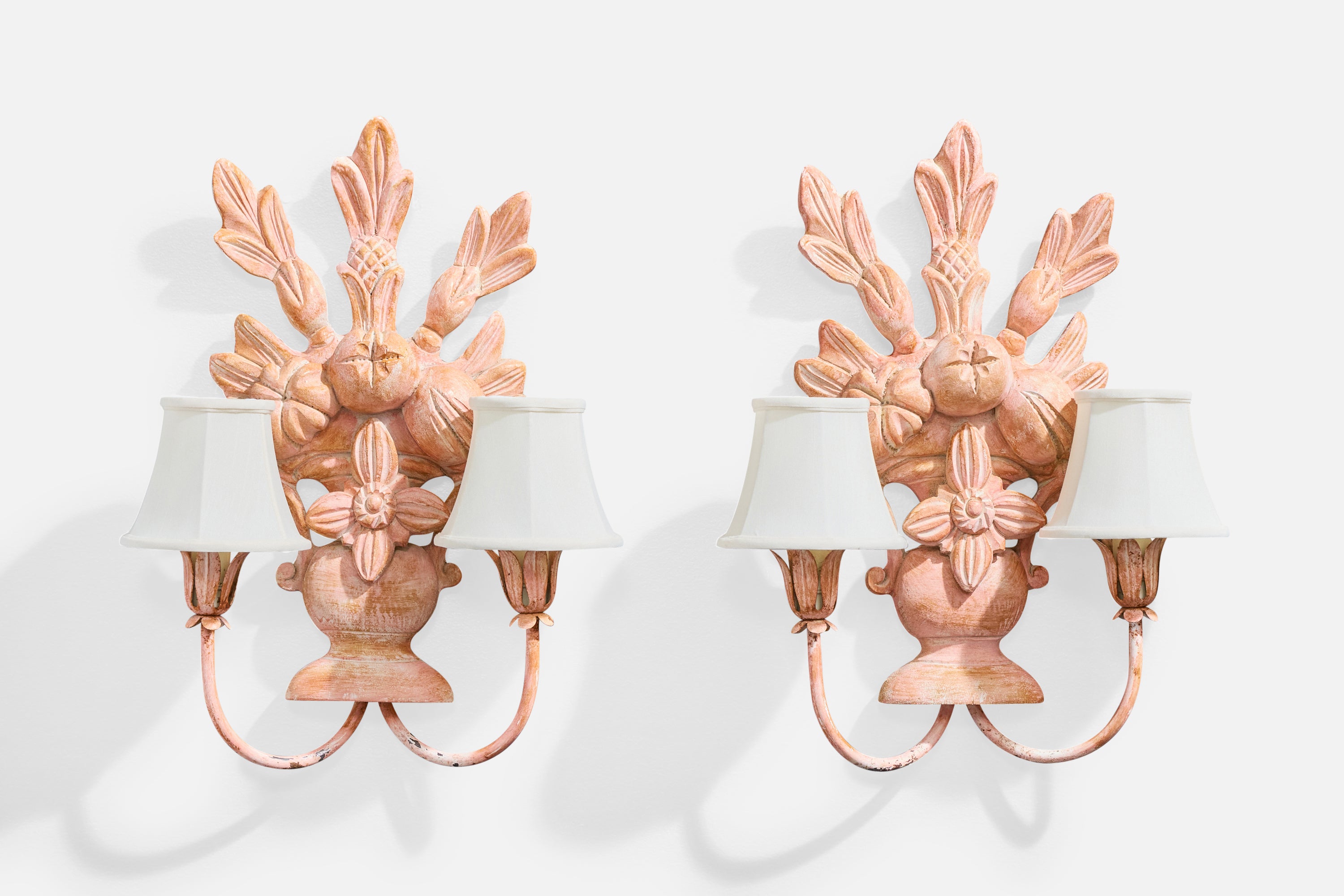 A pair of pink-painted wood, metal and white fabric wall lights likely designed and produced in France, c. 1950s.