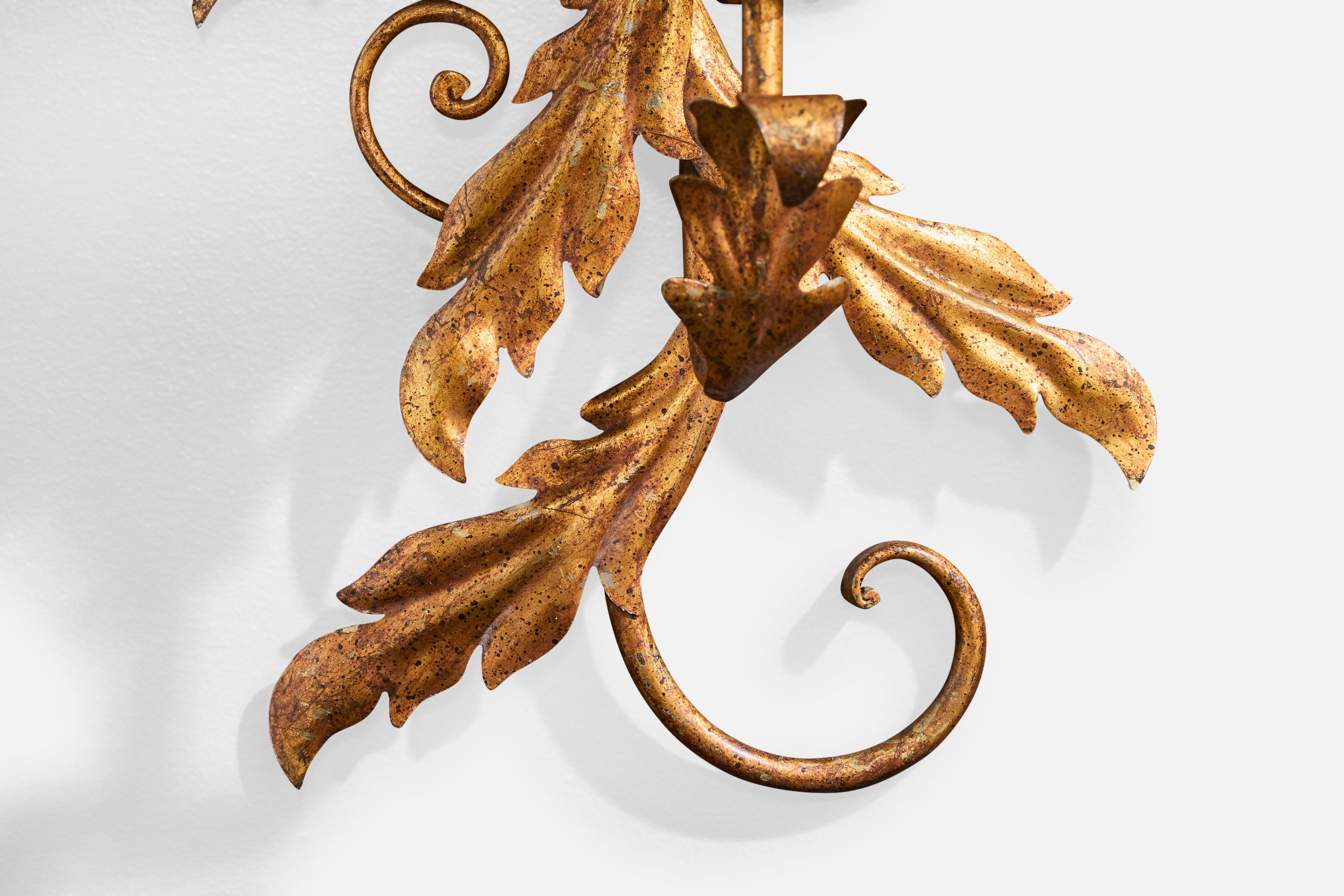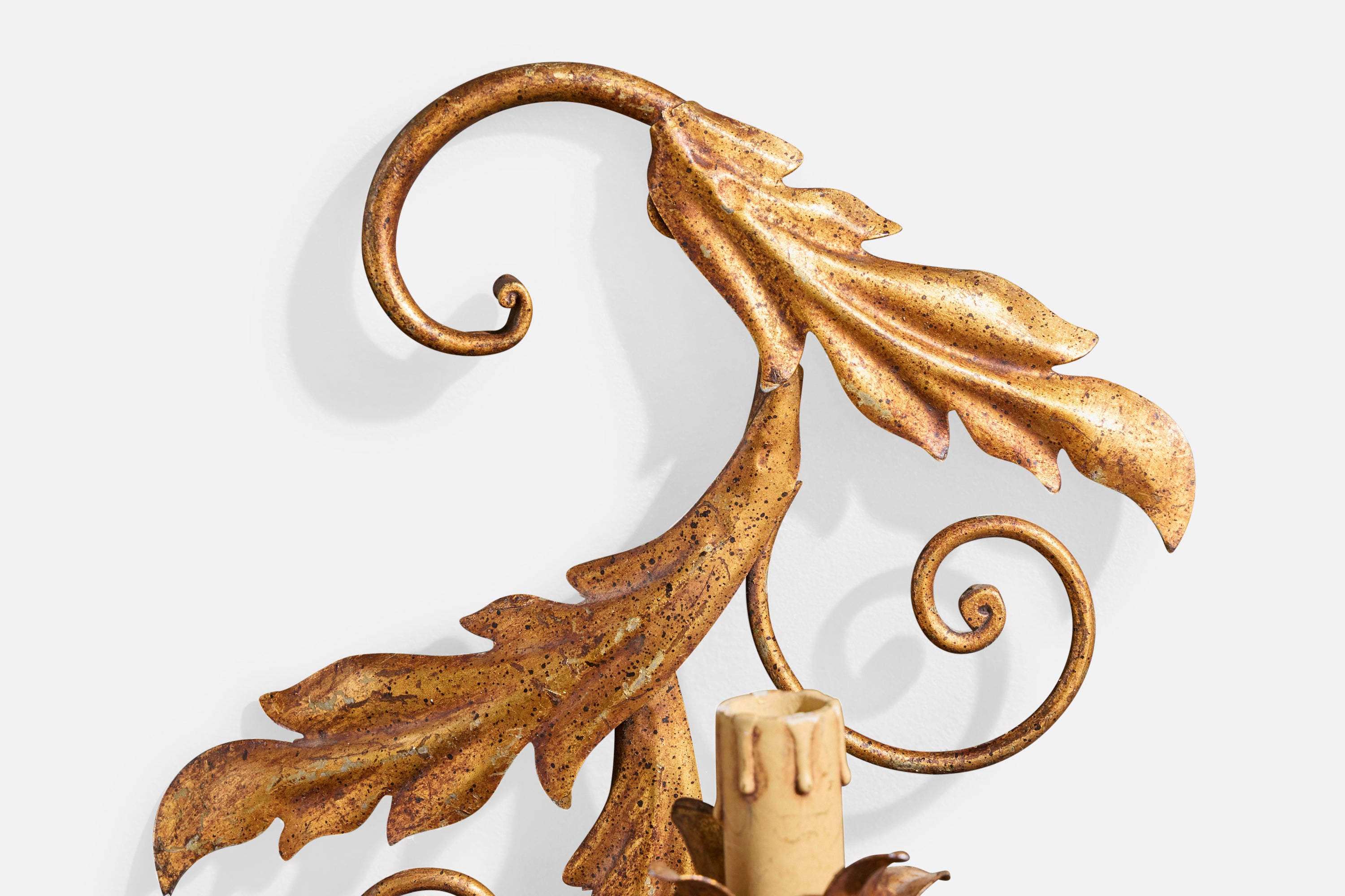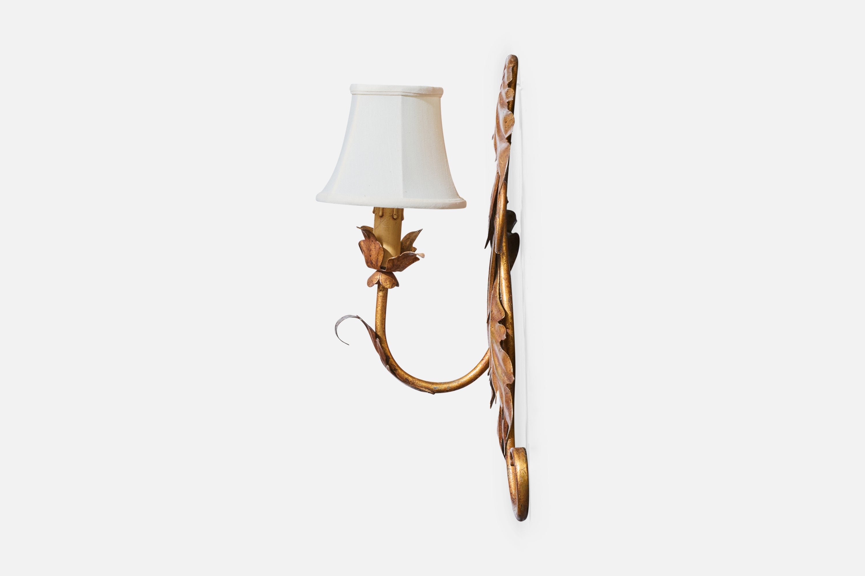 A pair of bronze-painted metal and white fabric wall lights designed and produced in France, c. 1950s.