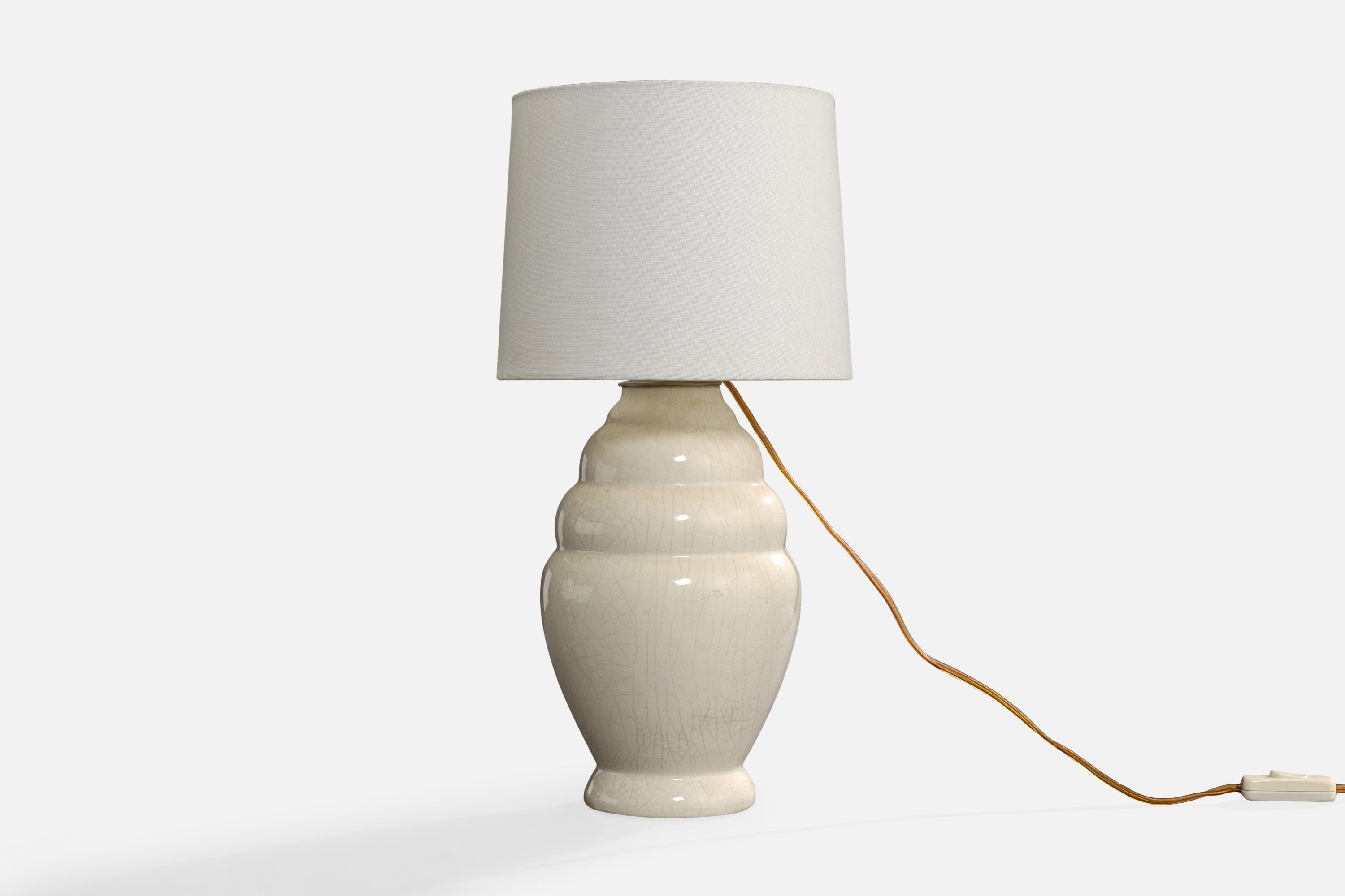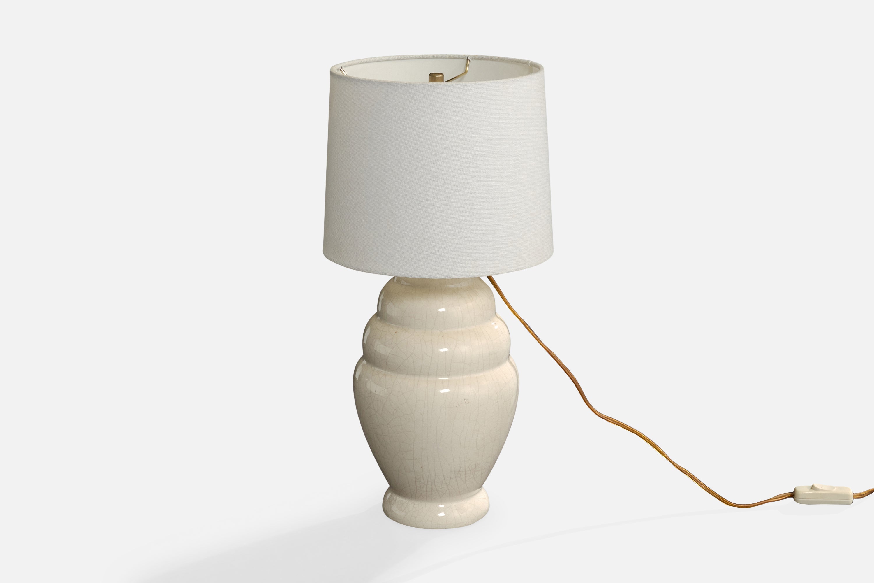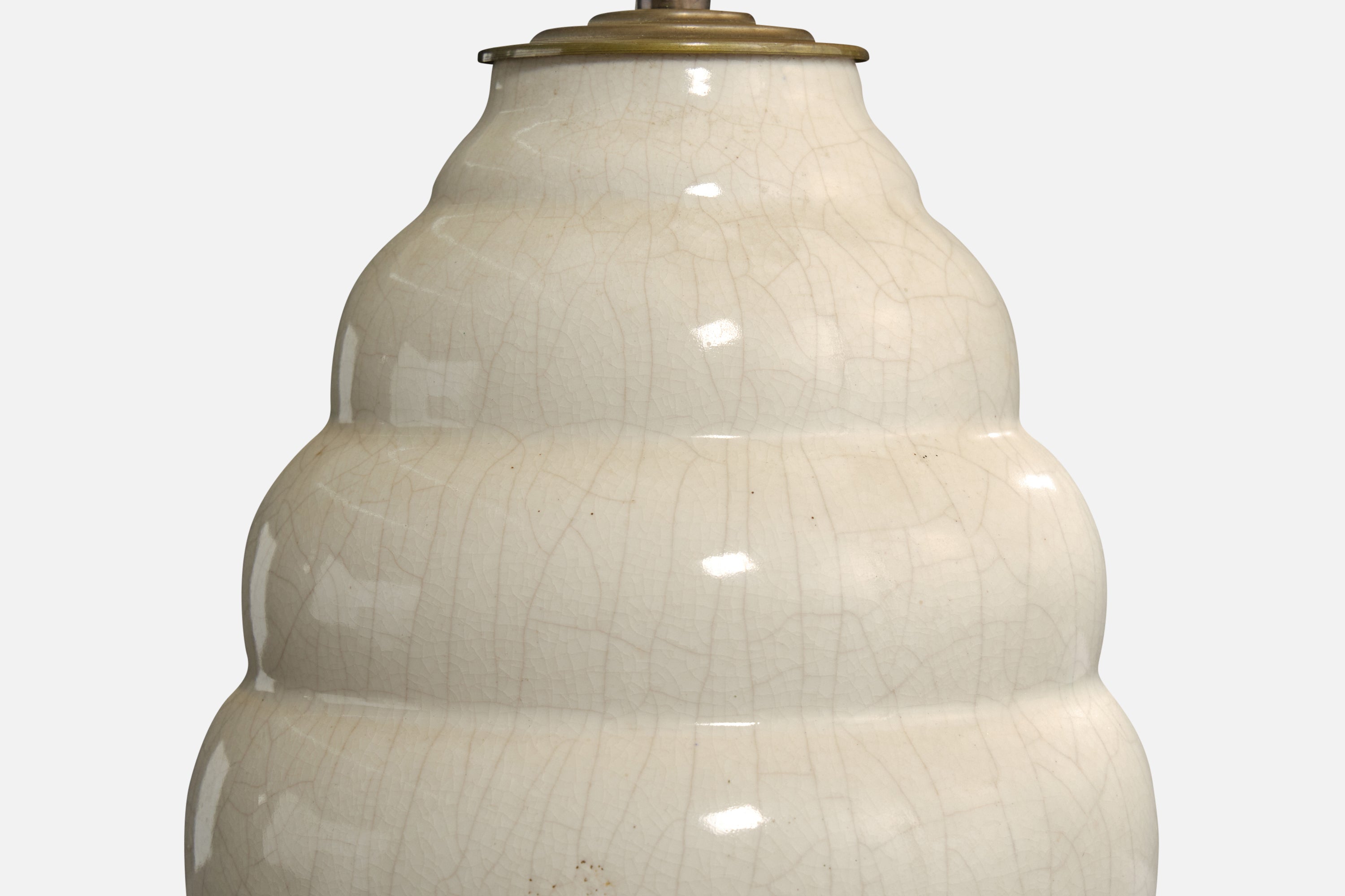 A white craquelure glazed ceramic and brass table lamp designed and produced in France, c. 1940s.