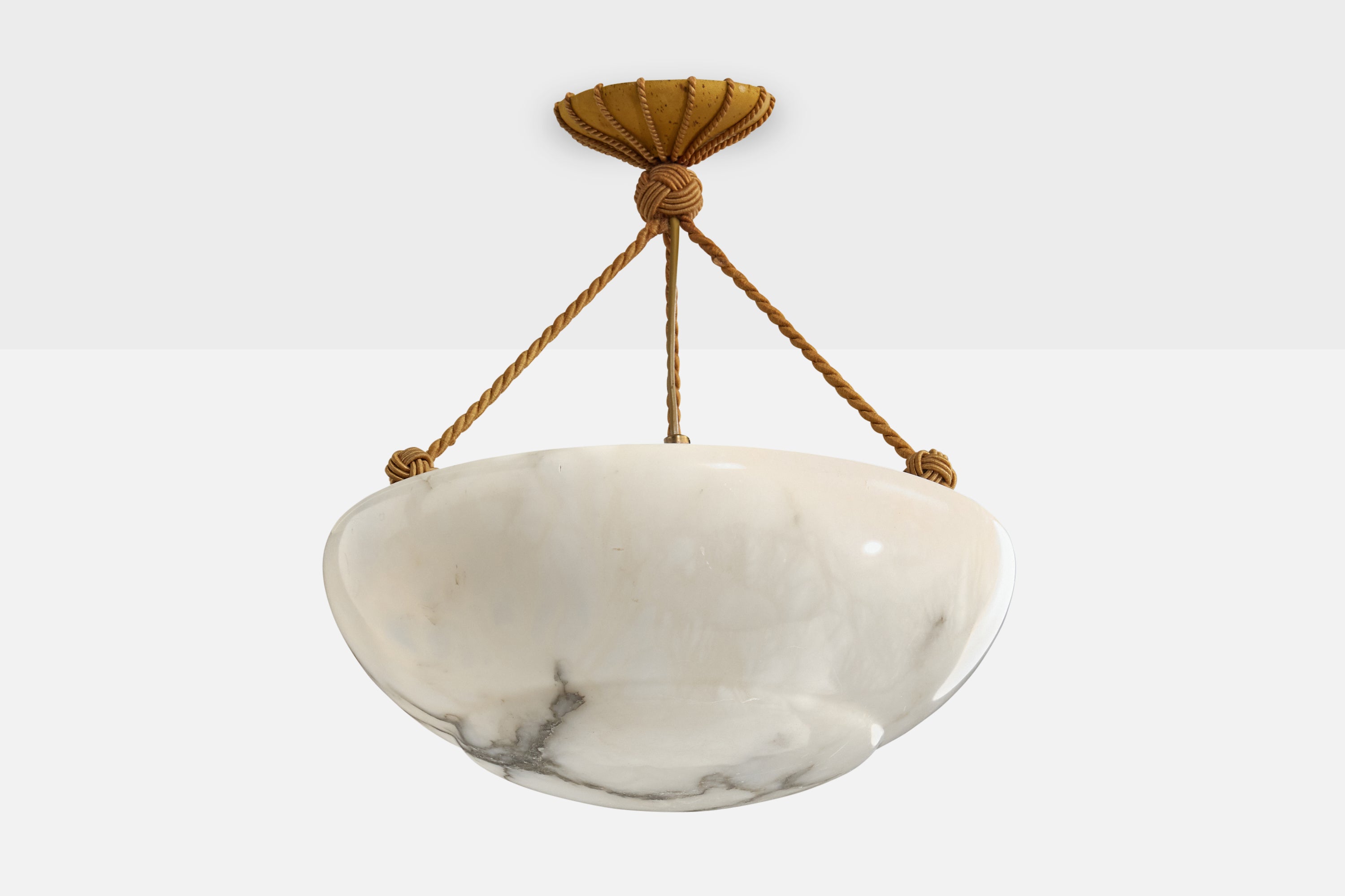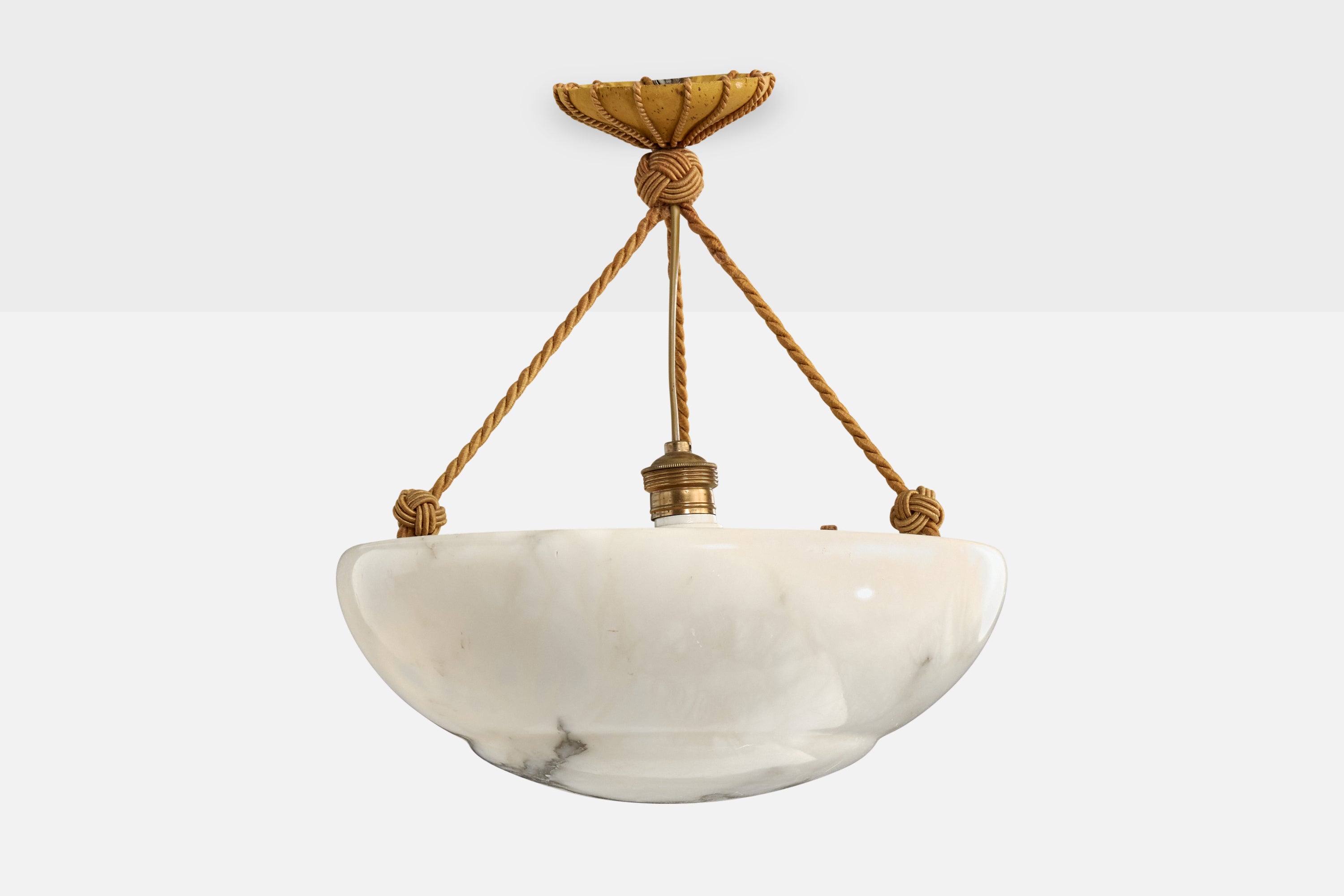 An alabaster and brown rope pendant light designed and produced in France, c. 1930s.