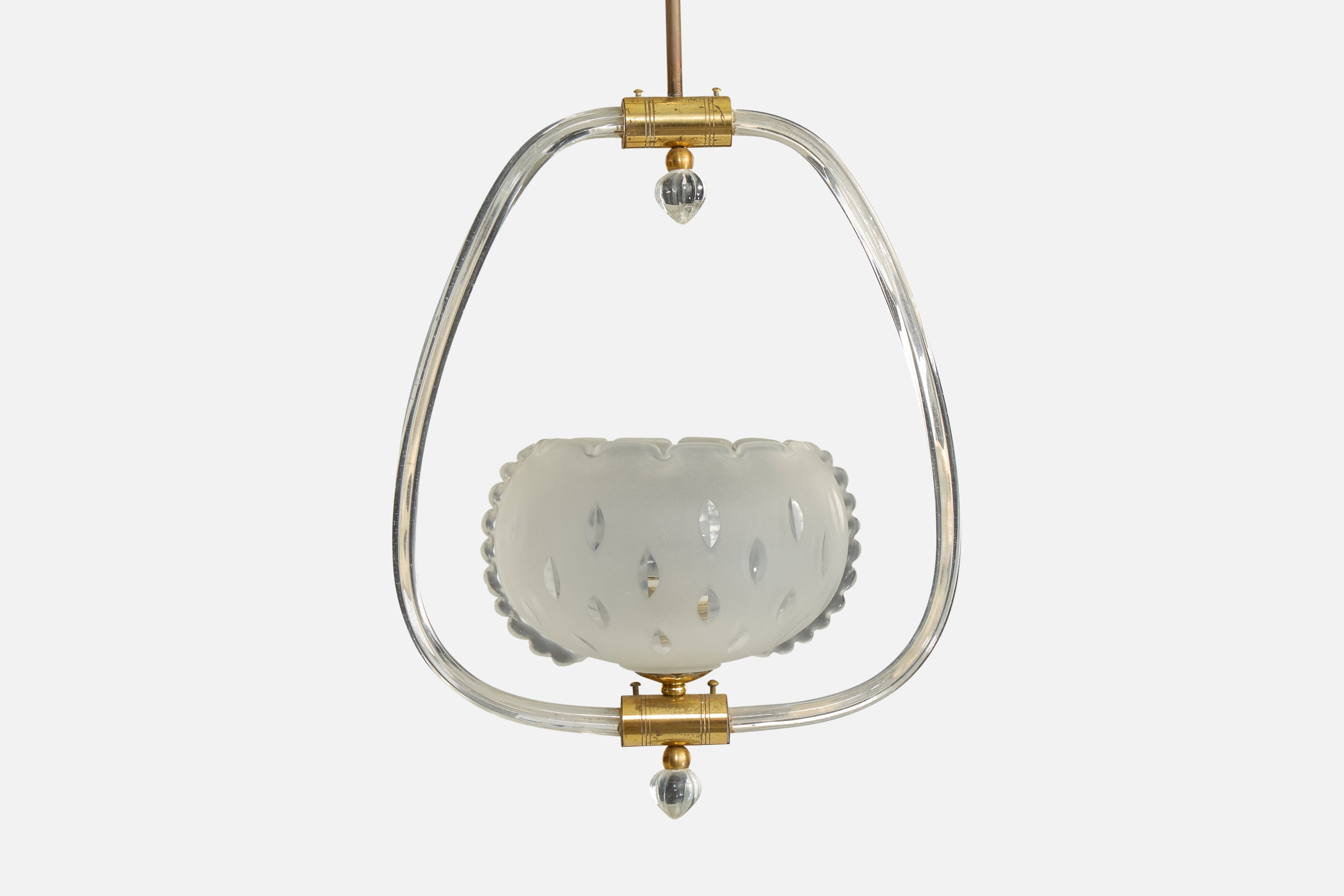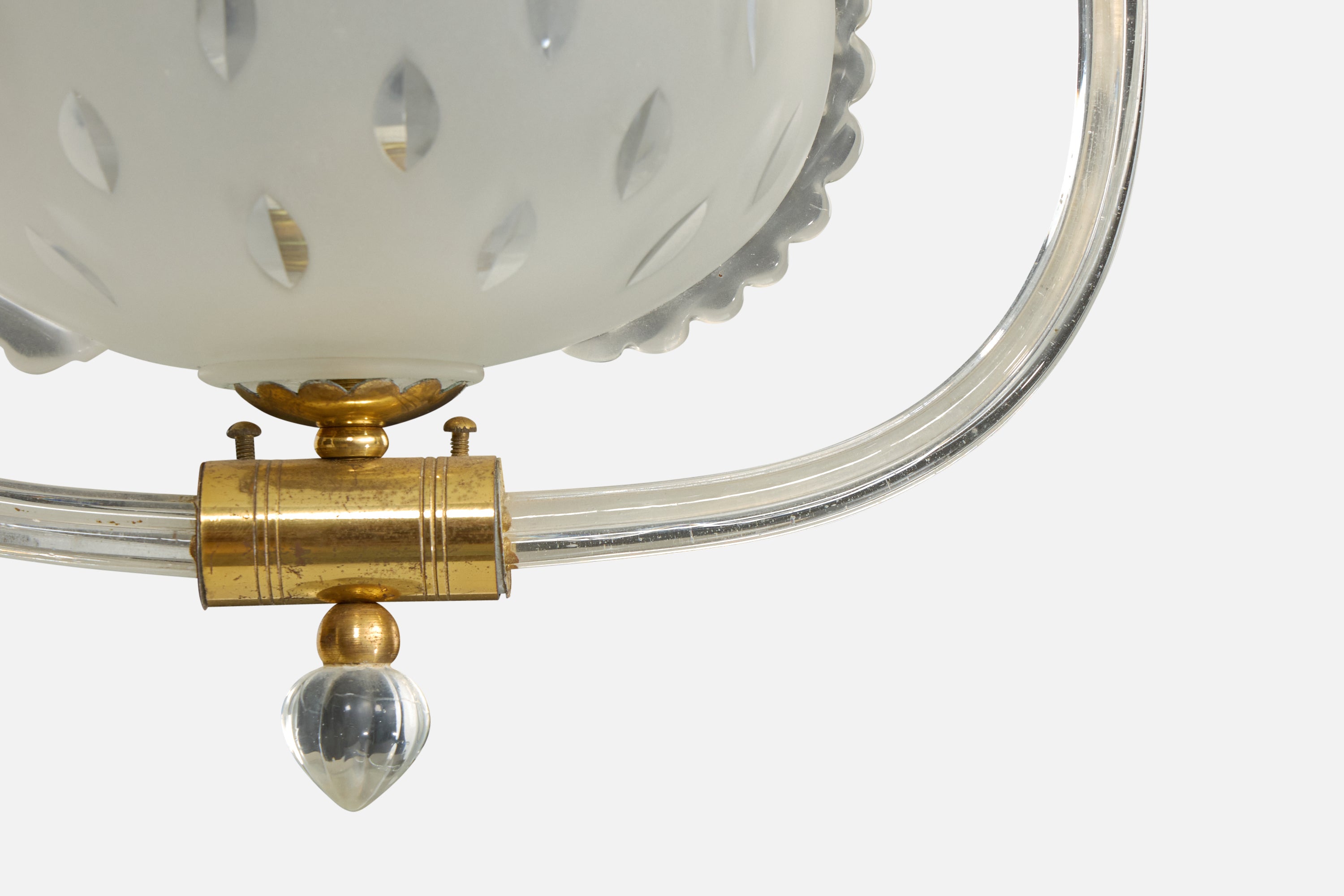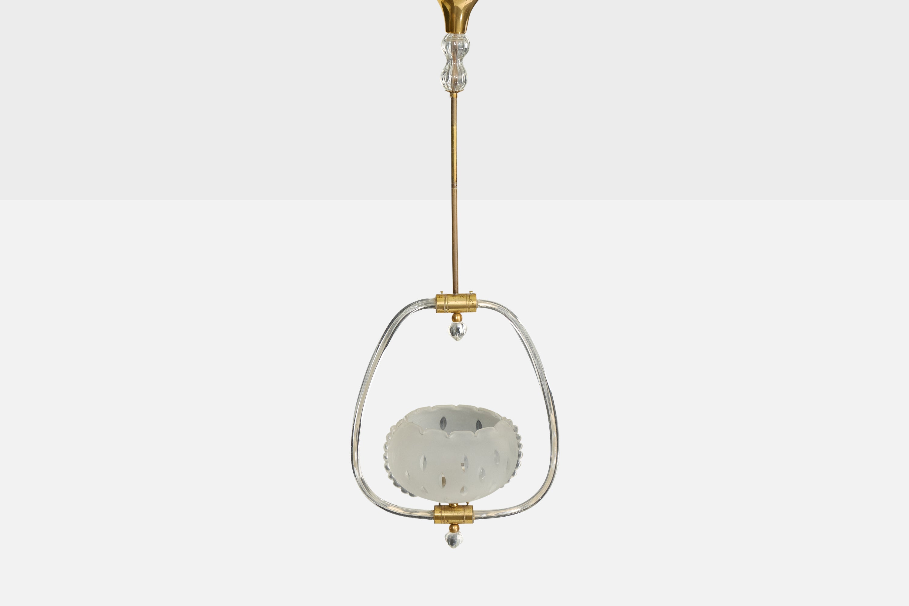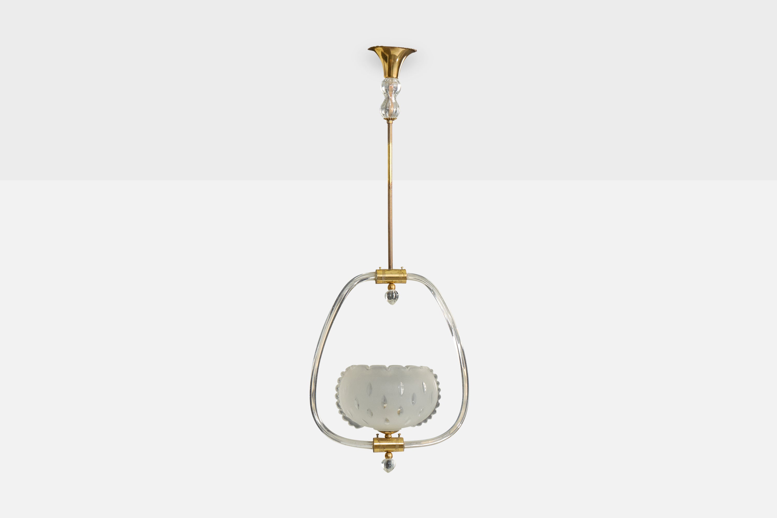 French Designer, Pendant Light, Glass, Brass, France, 1950s