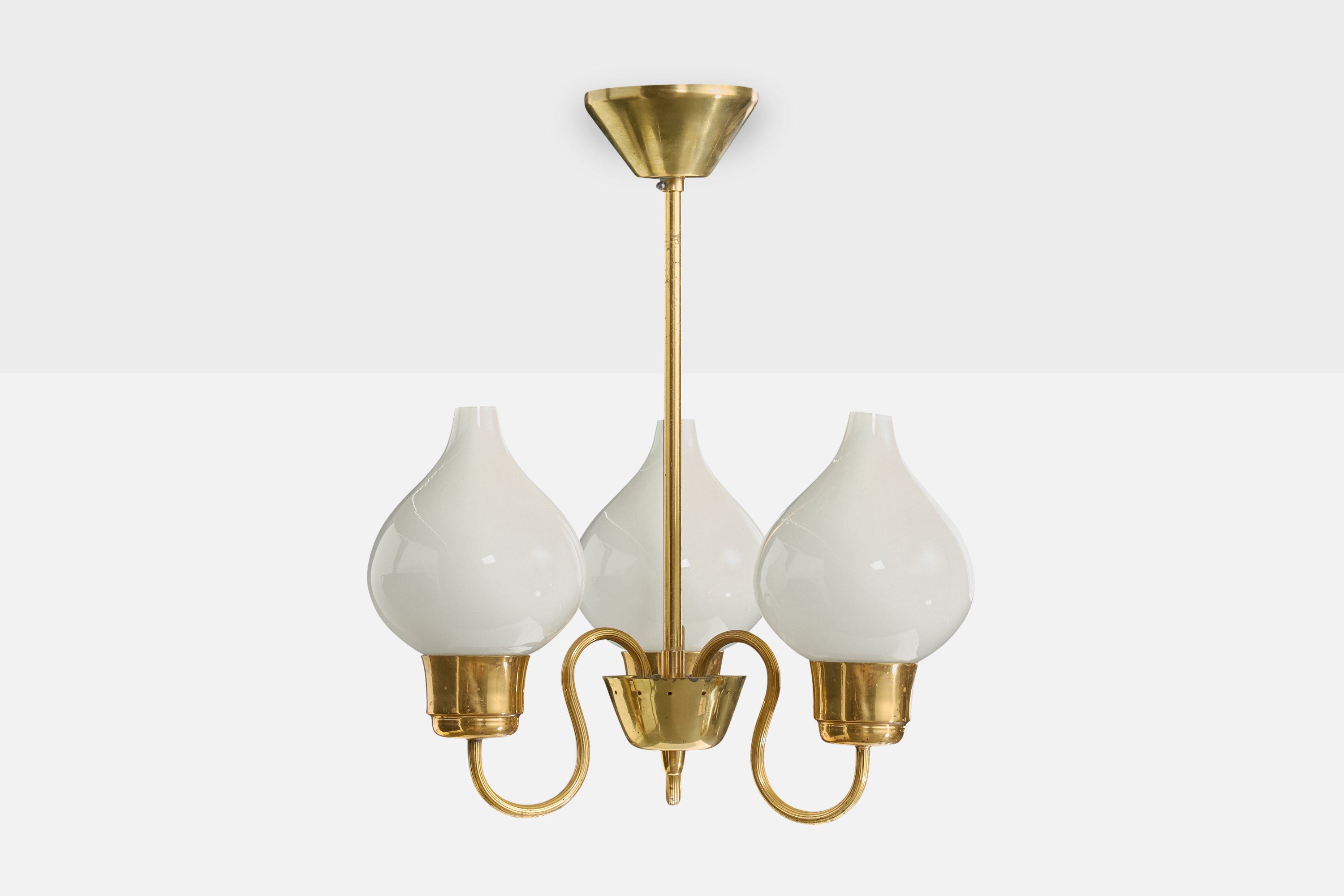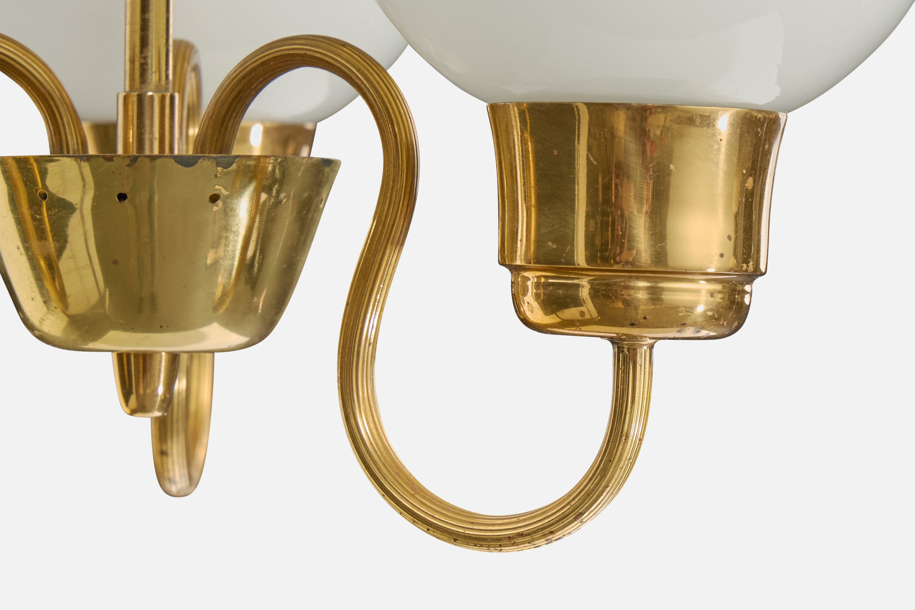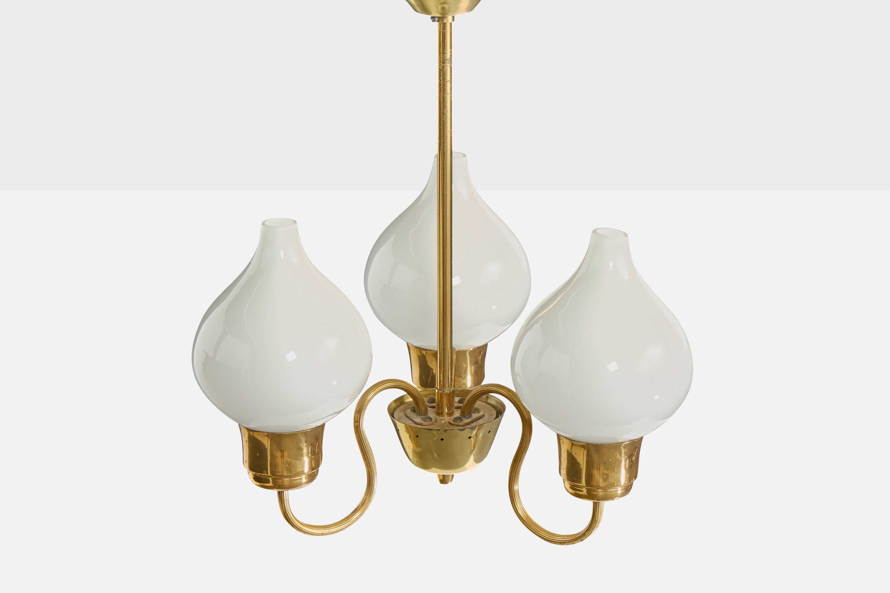 A brass and white-opaline glass chandelier designed and produced in Sweden, c. 1950s.
