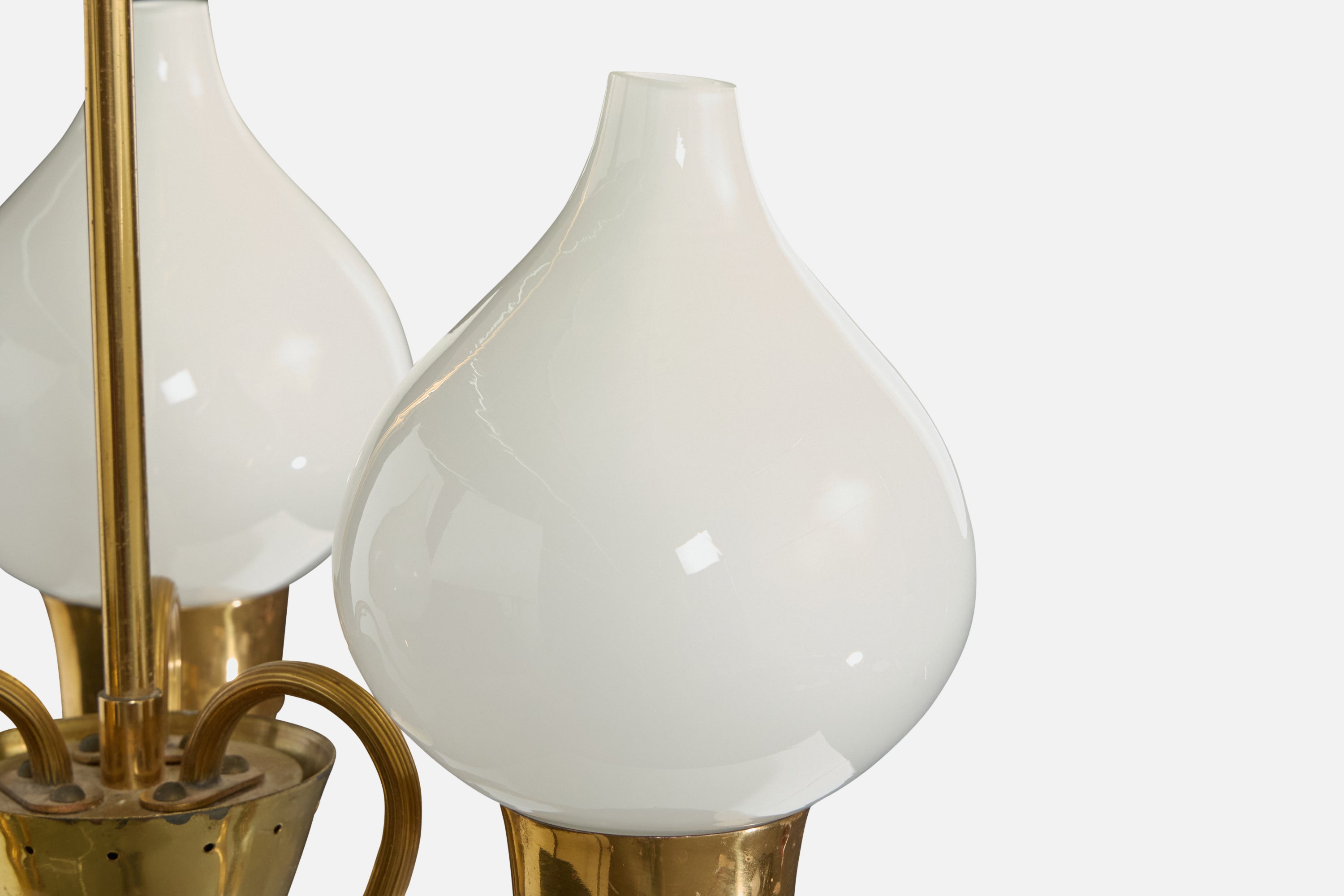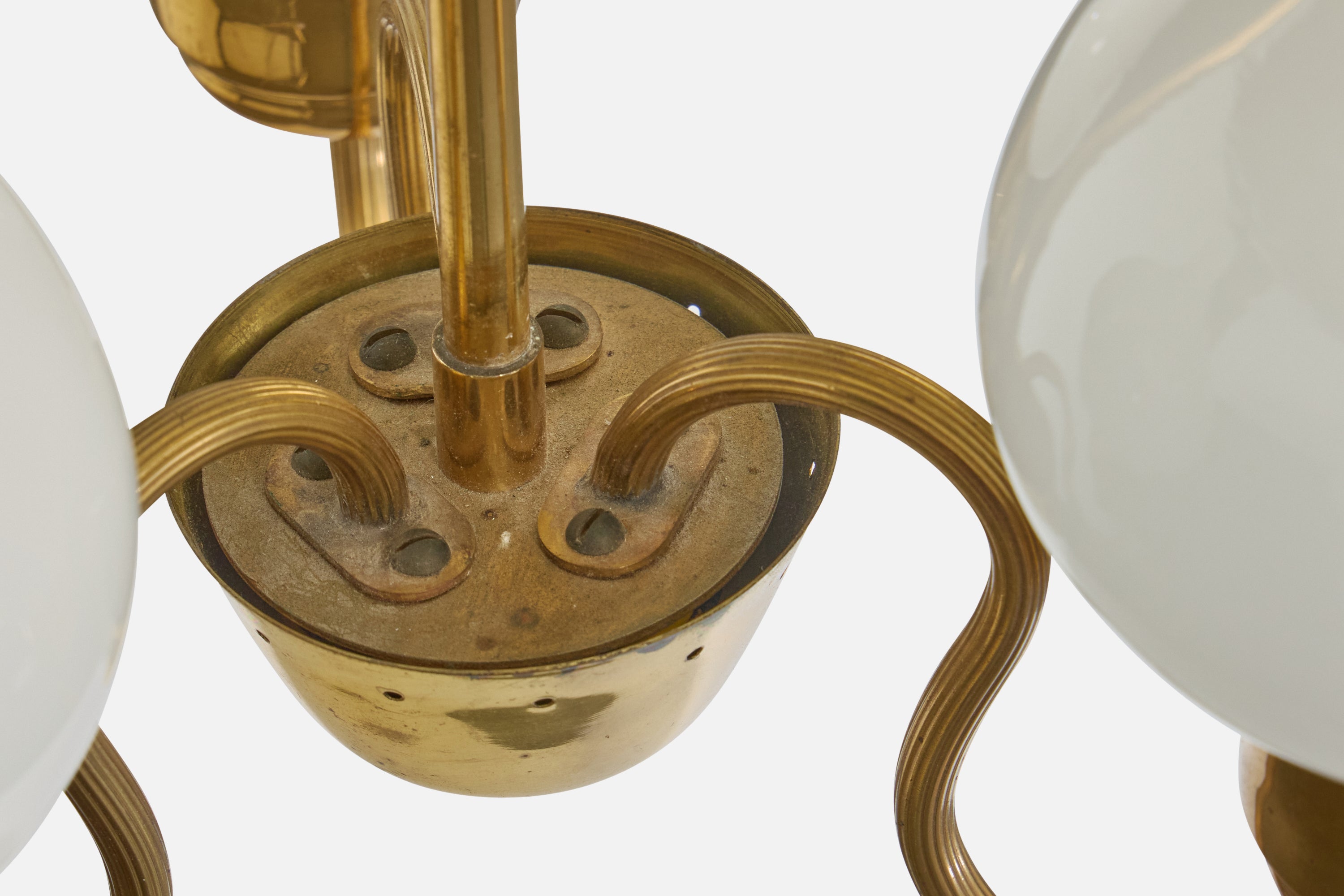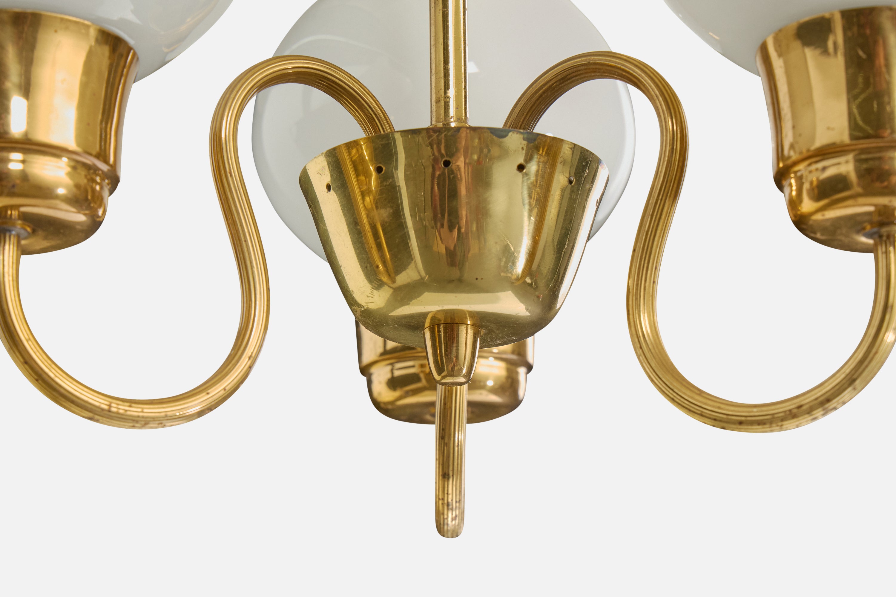 A brass and white-opaline glass chandelier designed and produced in Sweden, c. 1950s.
