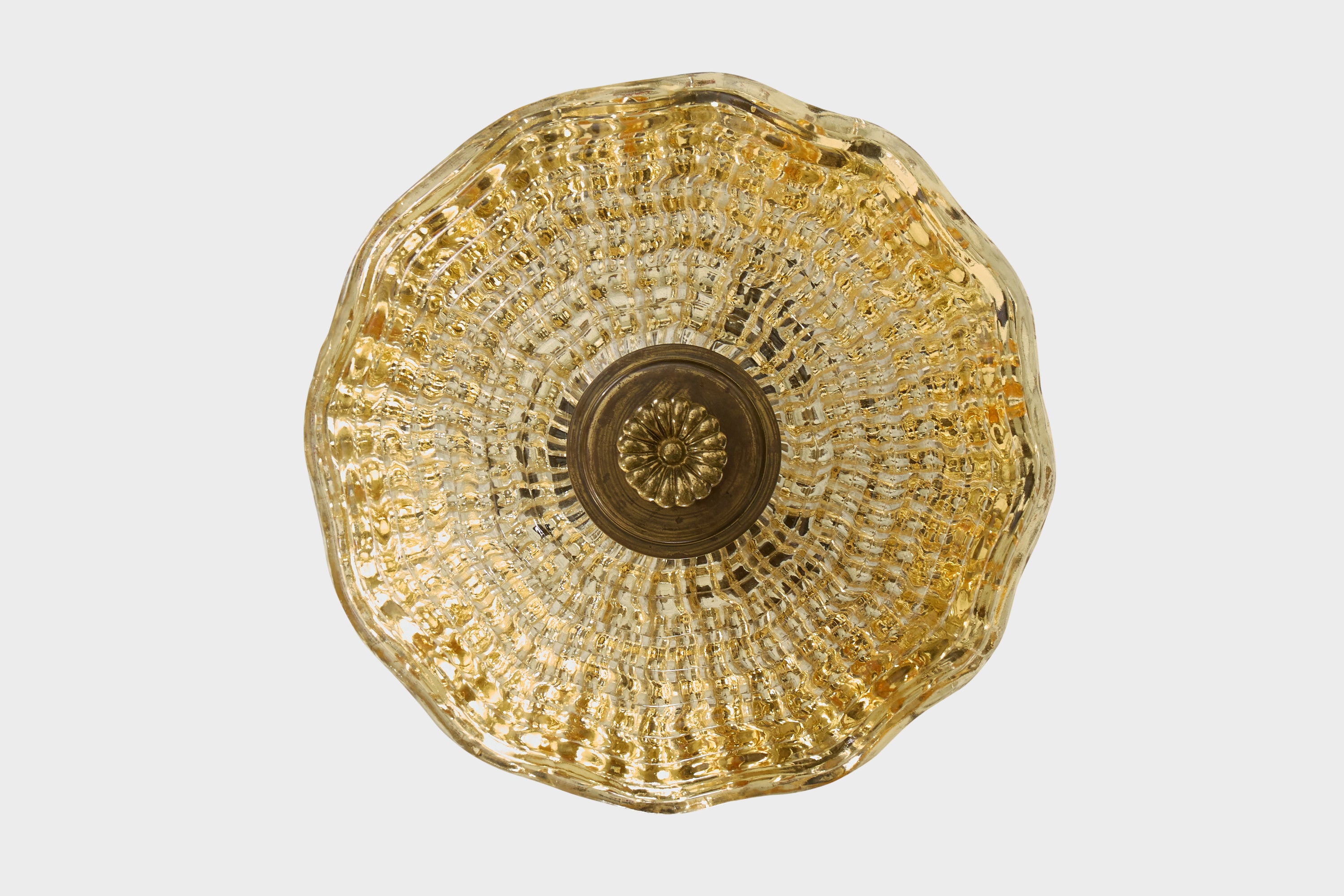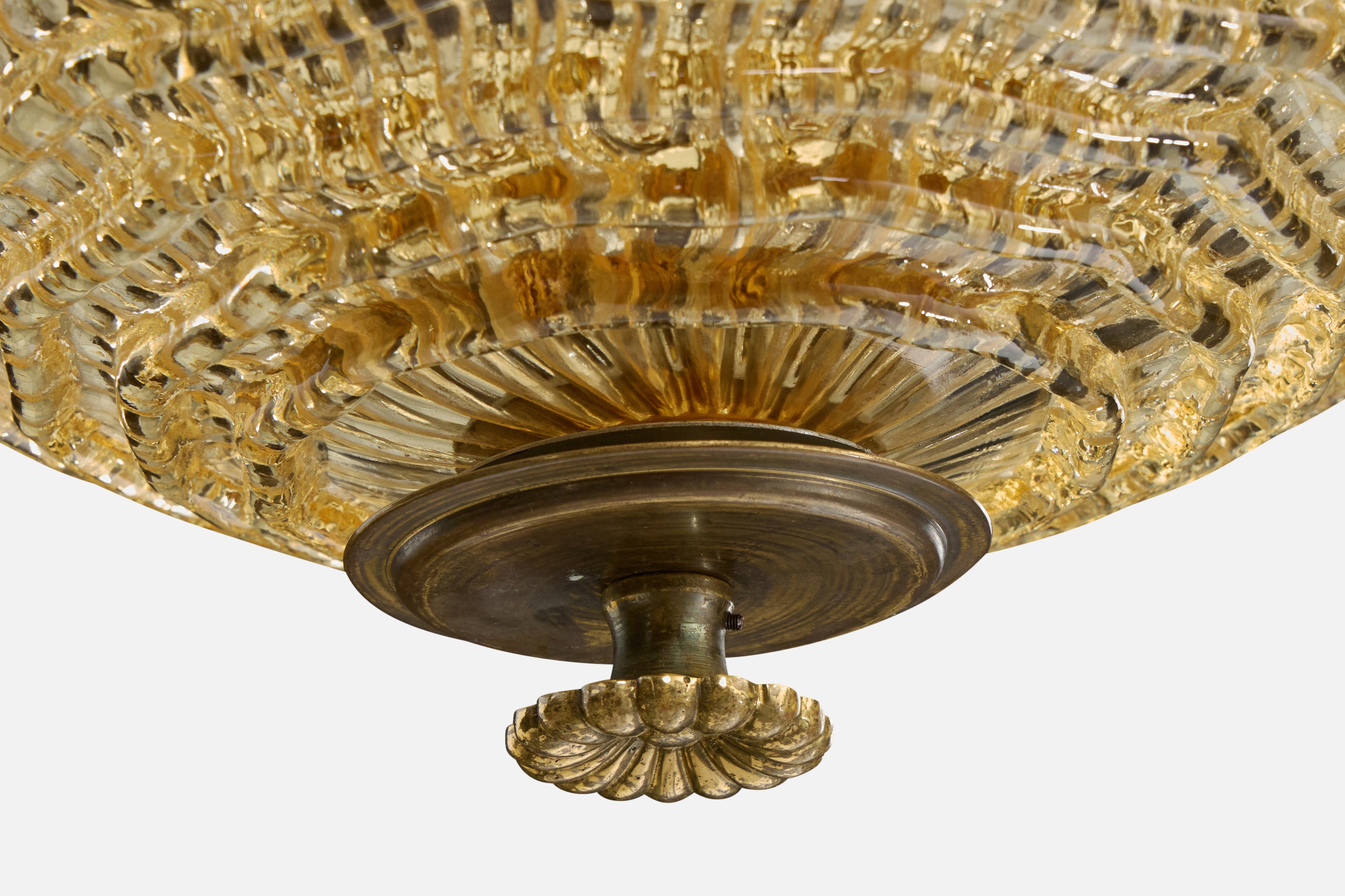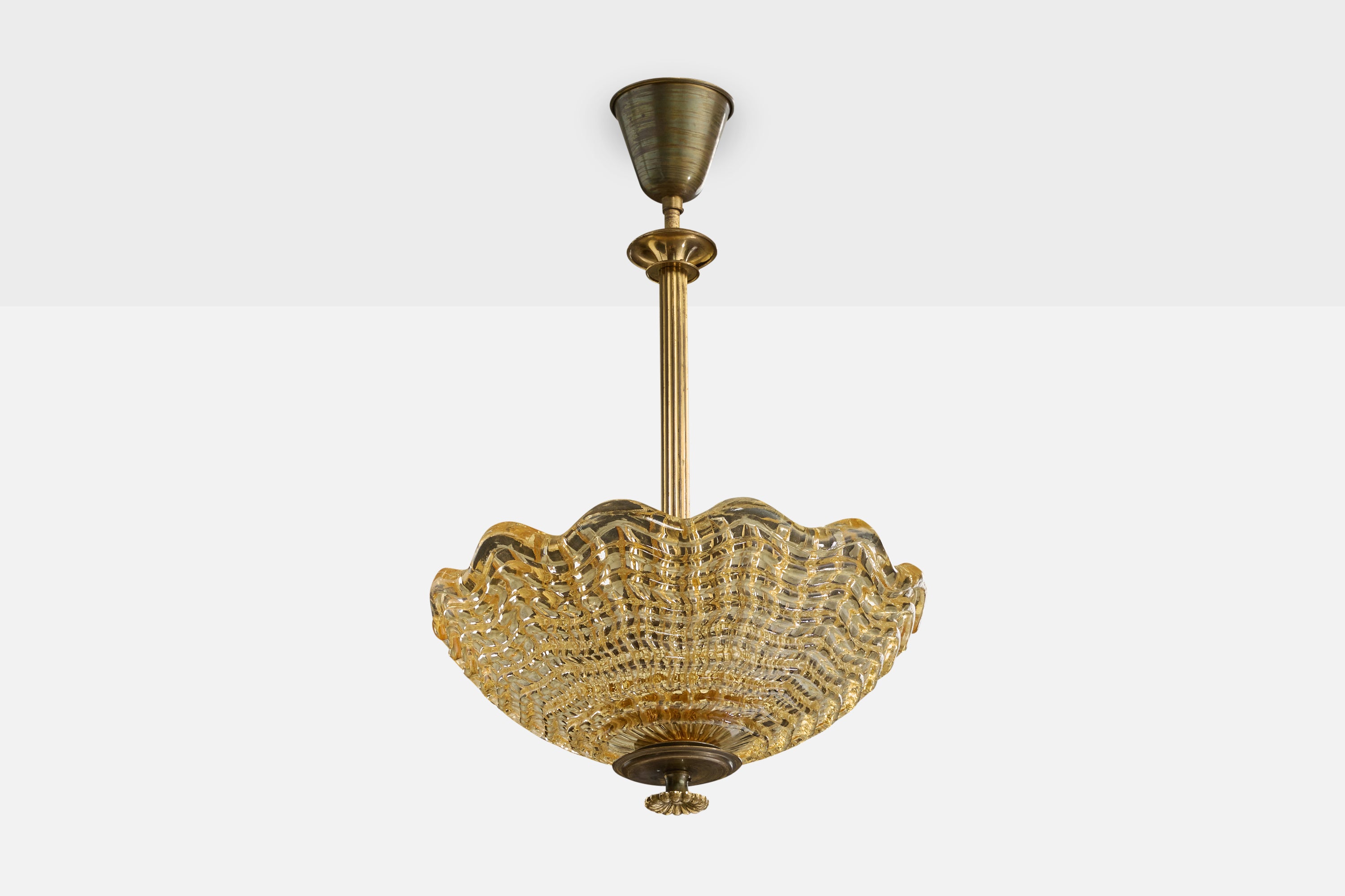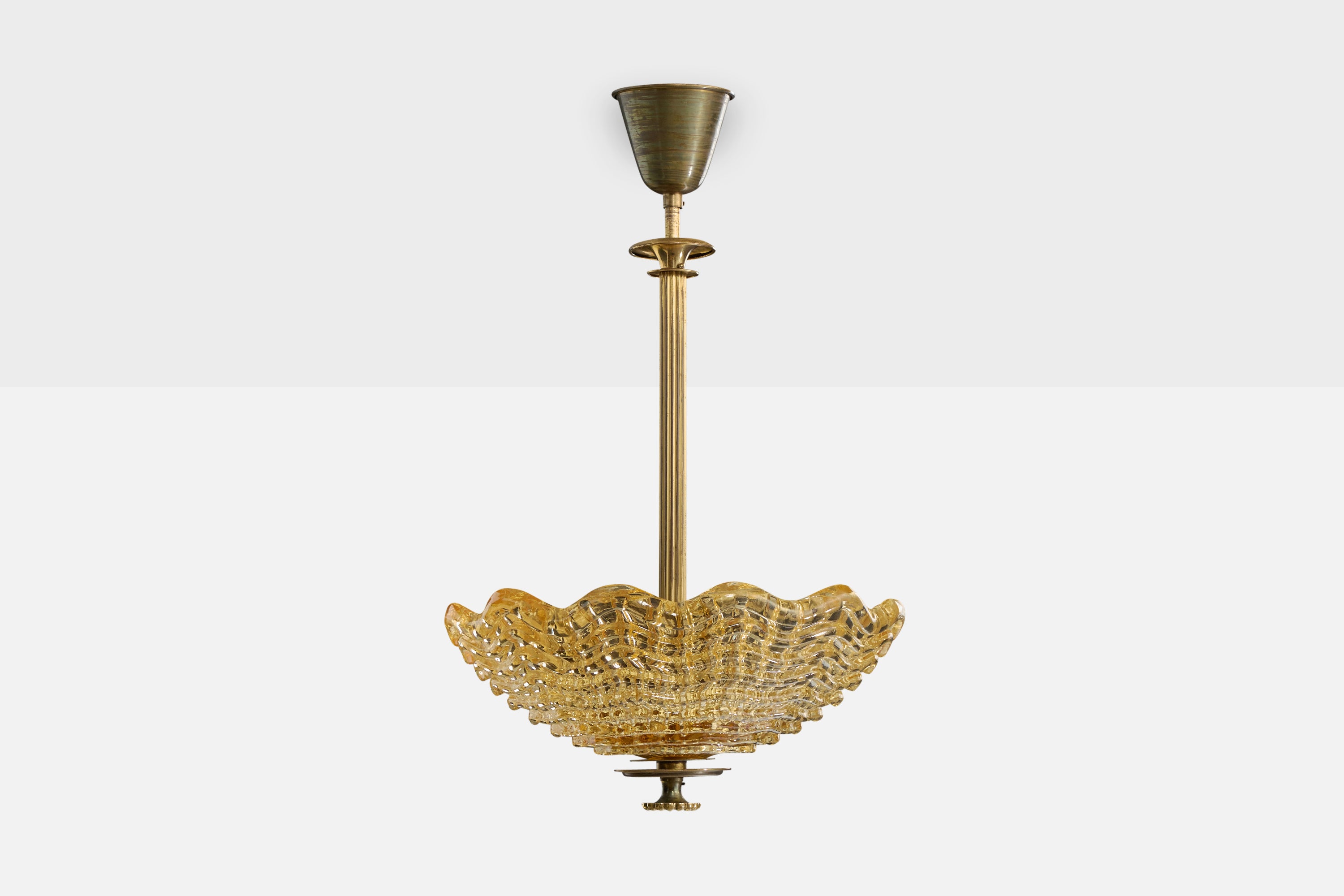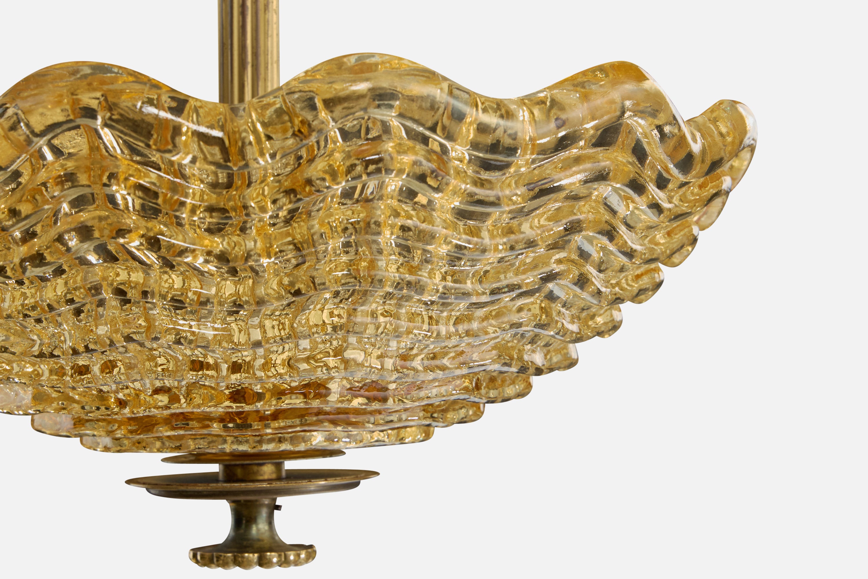 A brass and glass pendant light designed by Carl Fagerlund and produced by Orrefors, Sweden, c. 1950s.