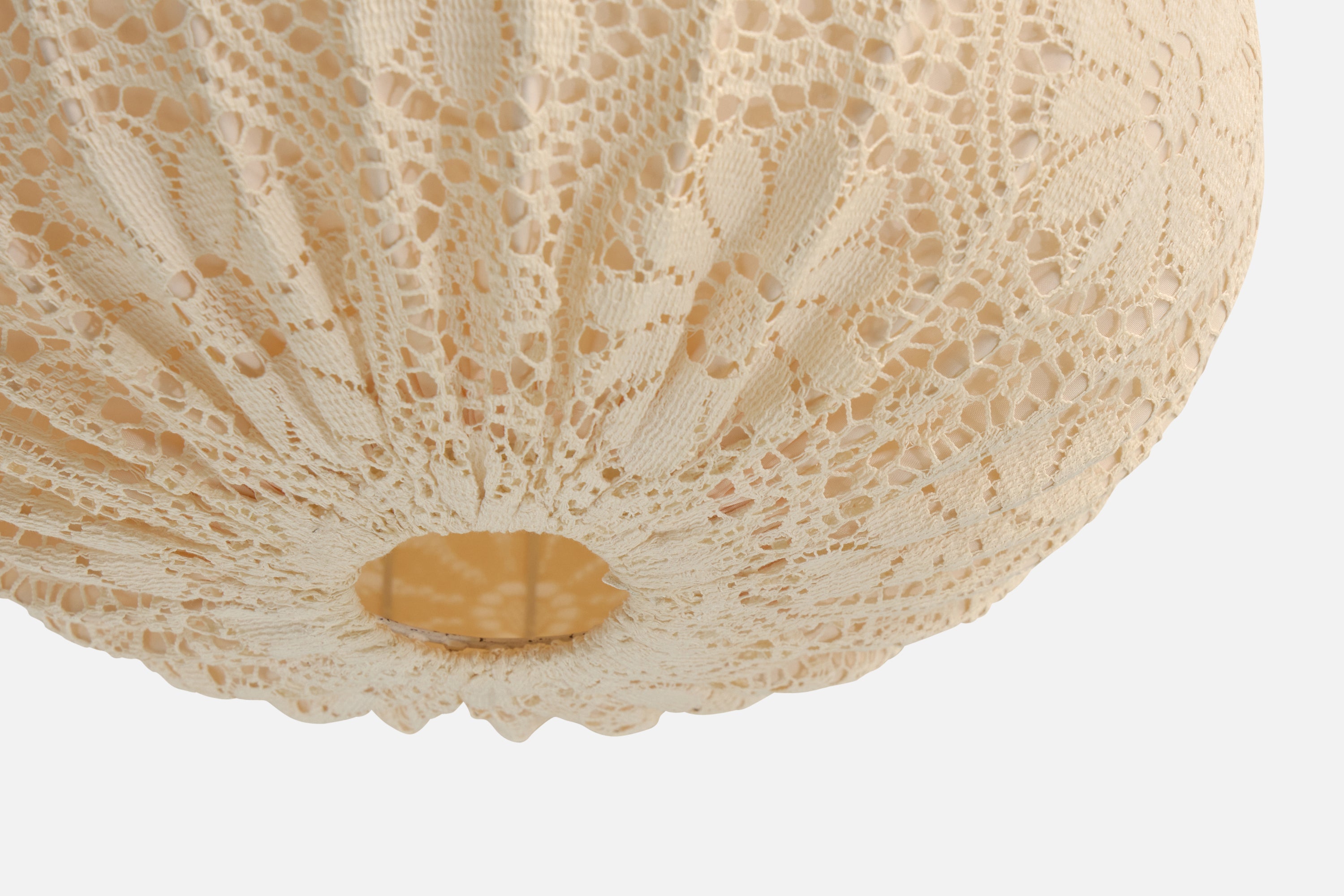 A floral-embroidered fabric and teak pendant light designed and produced in Sweden, c. 1950s.