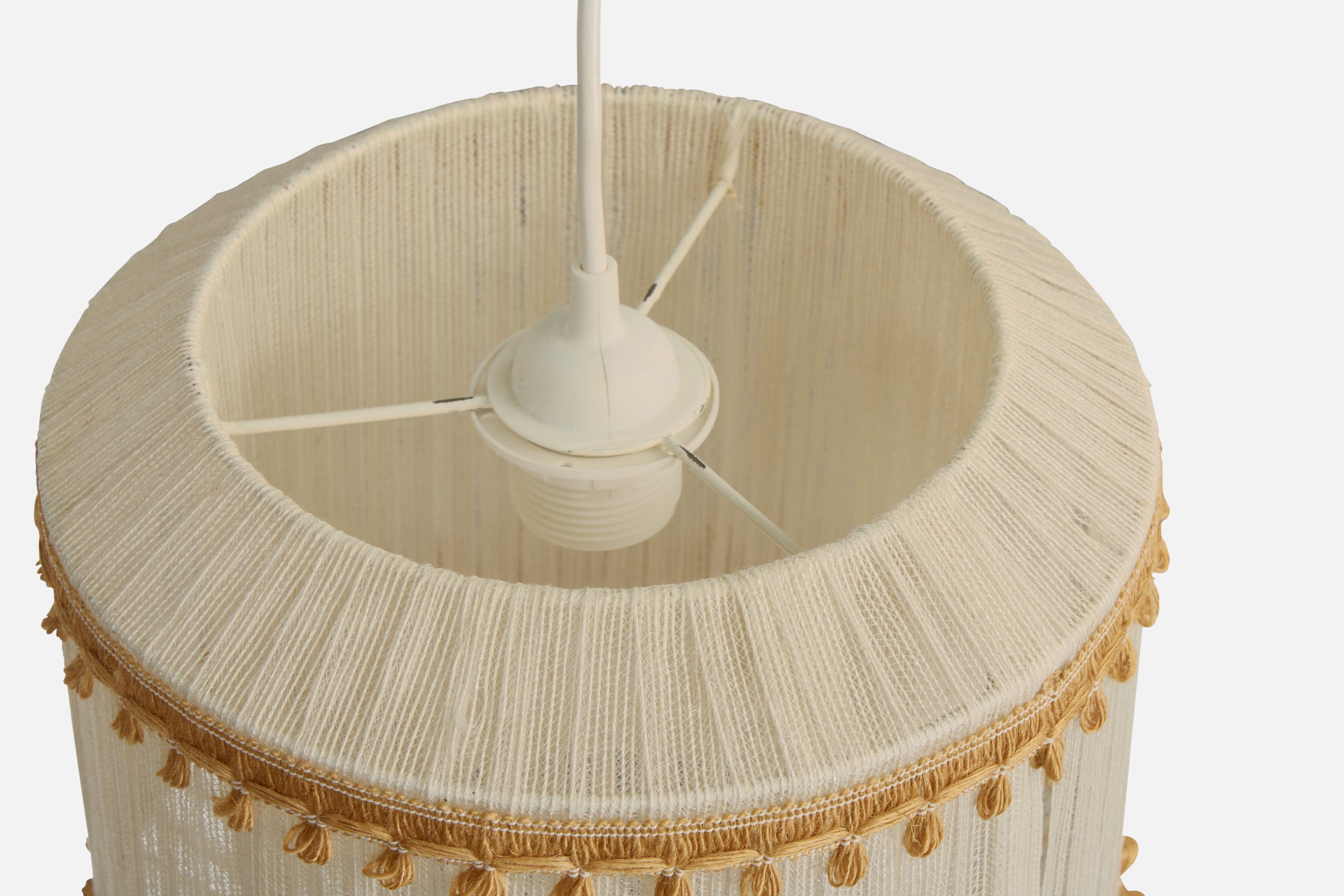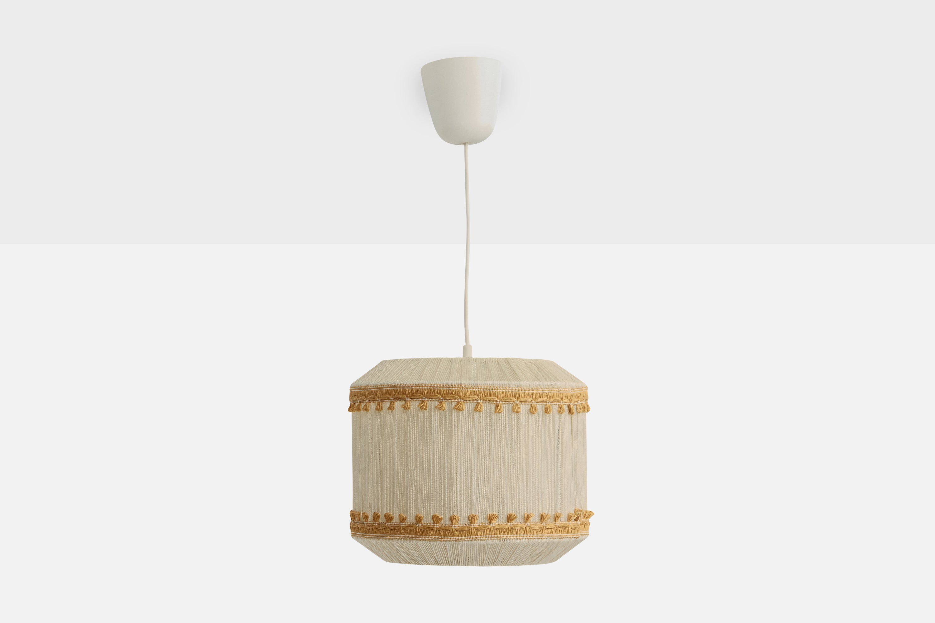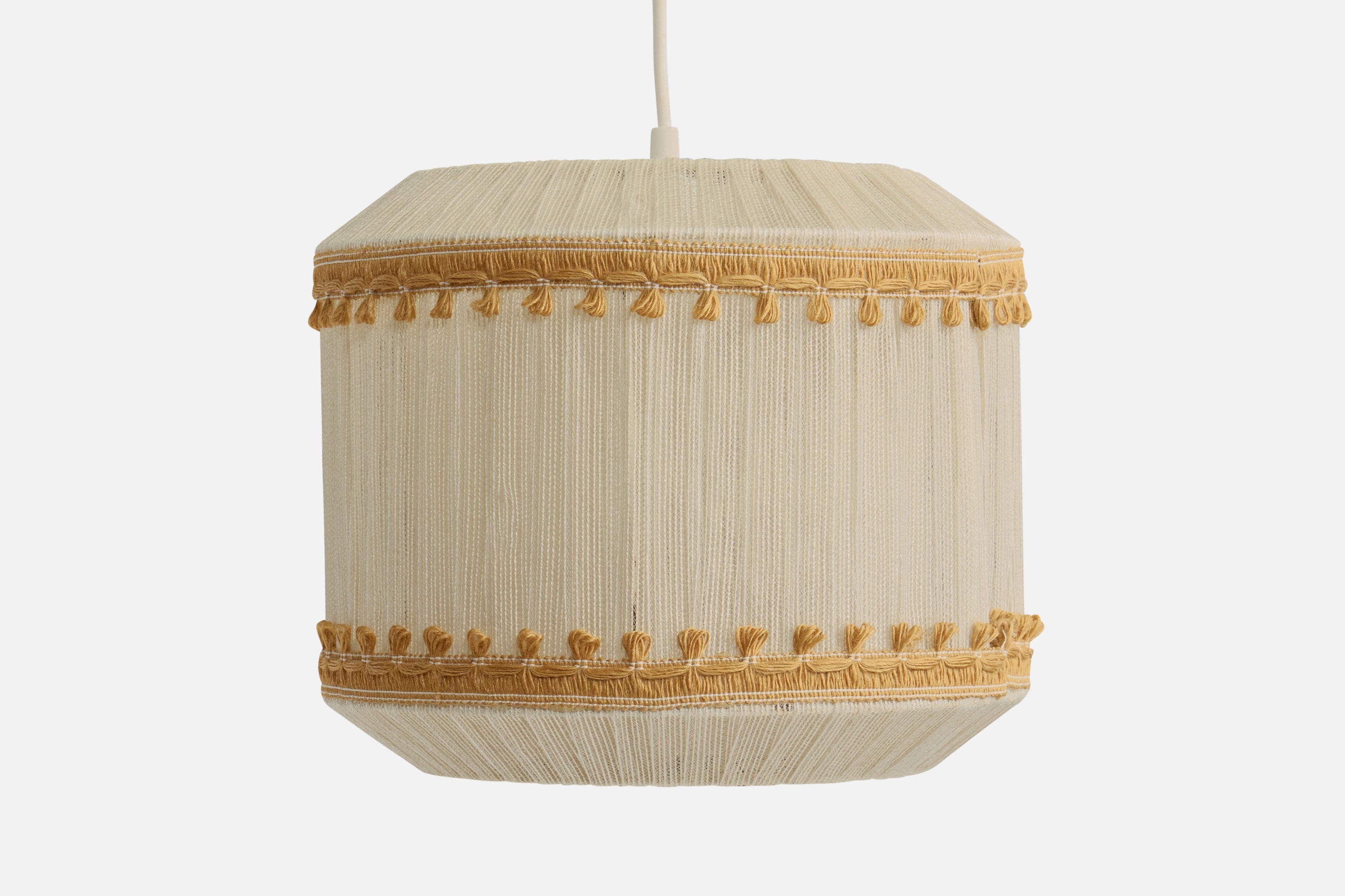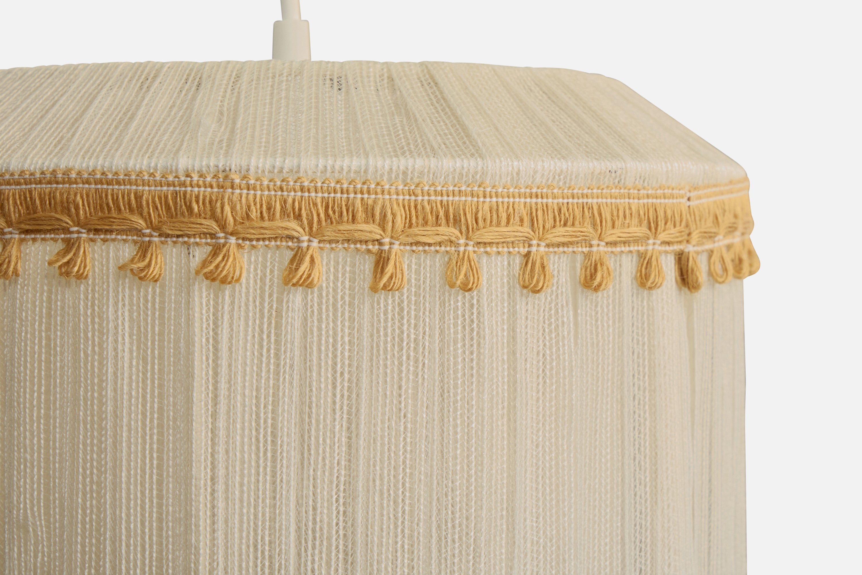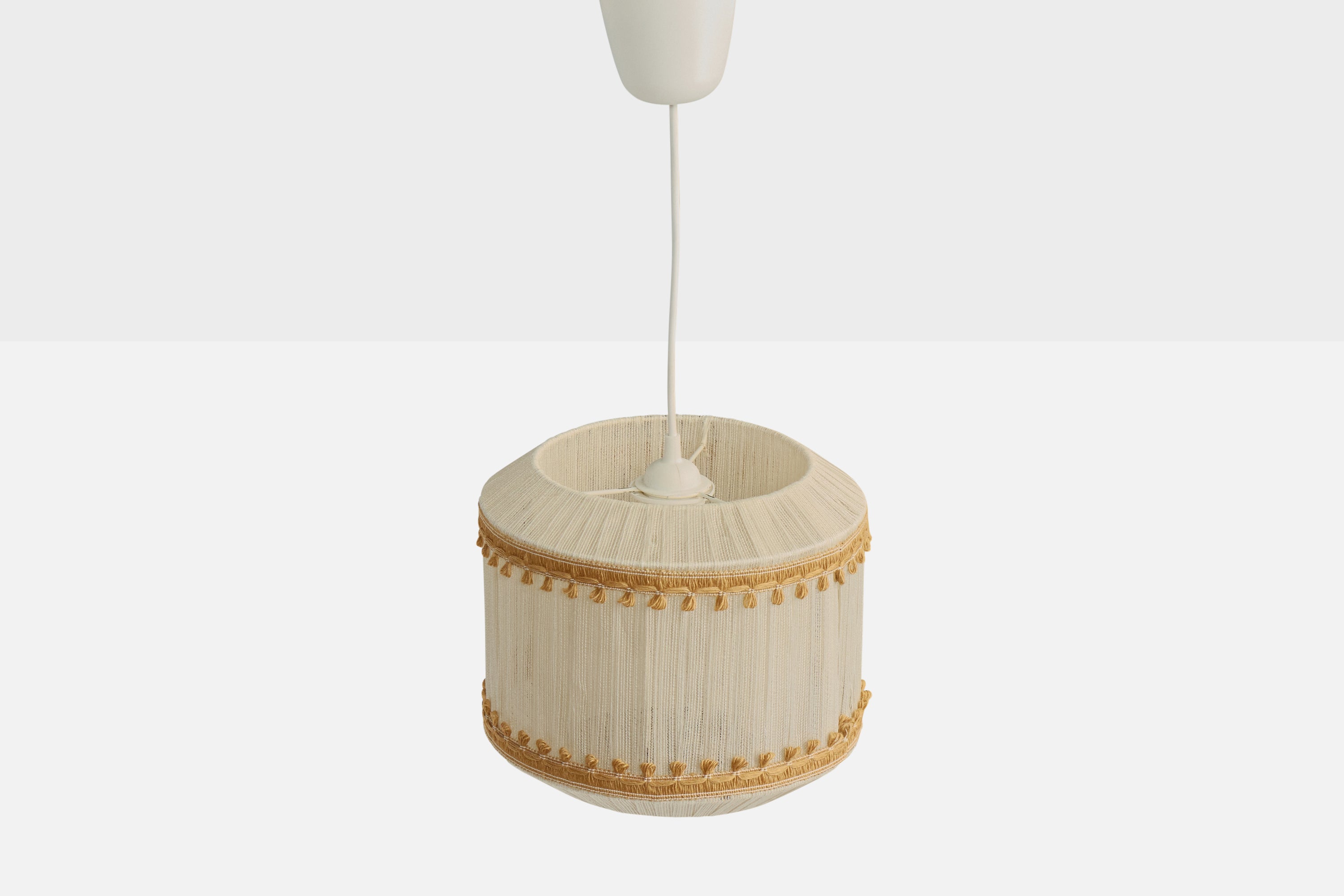 A beige and cream-white fabric string pendant light designed and produced in Sweden, c. 1970s.