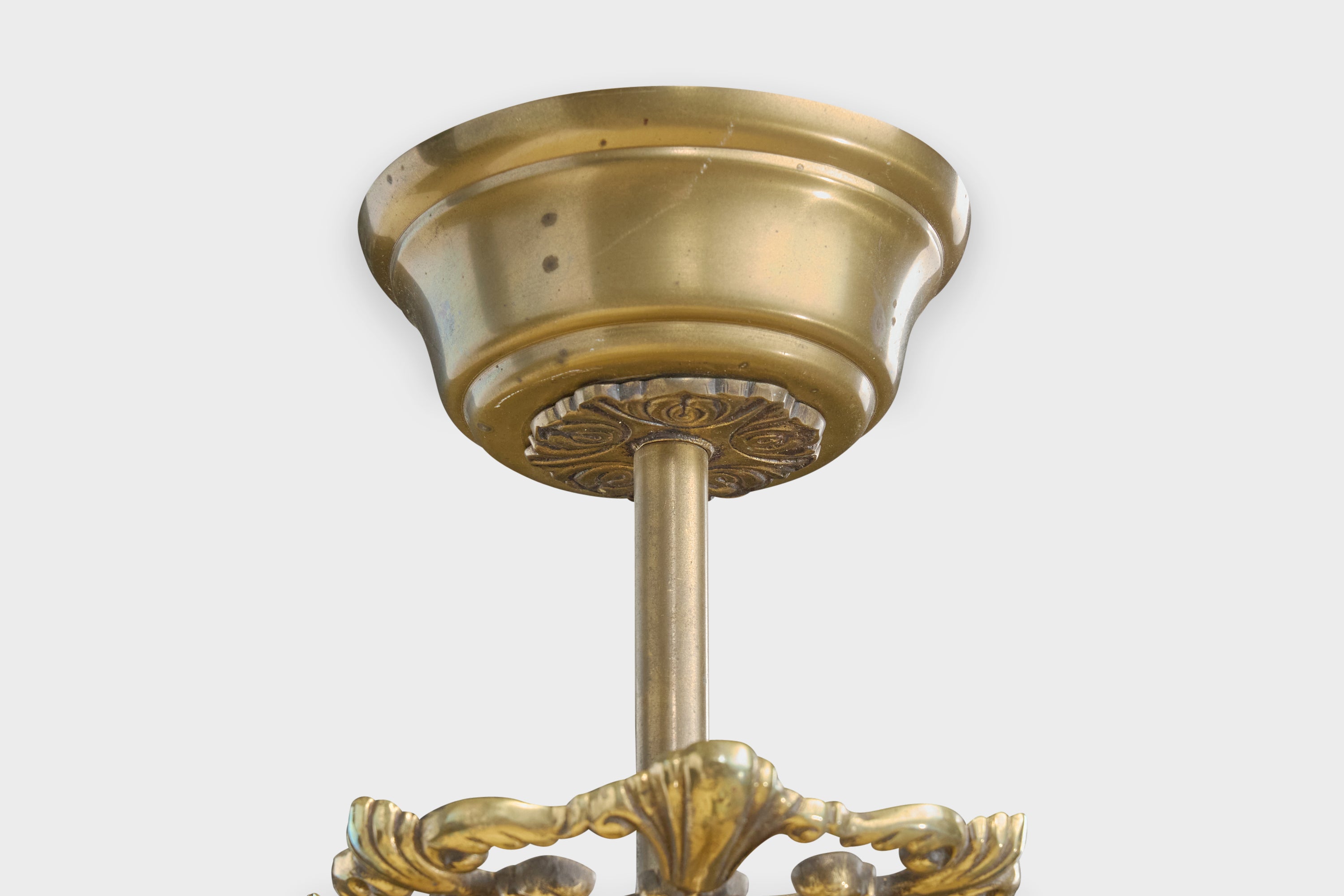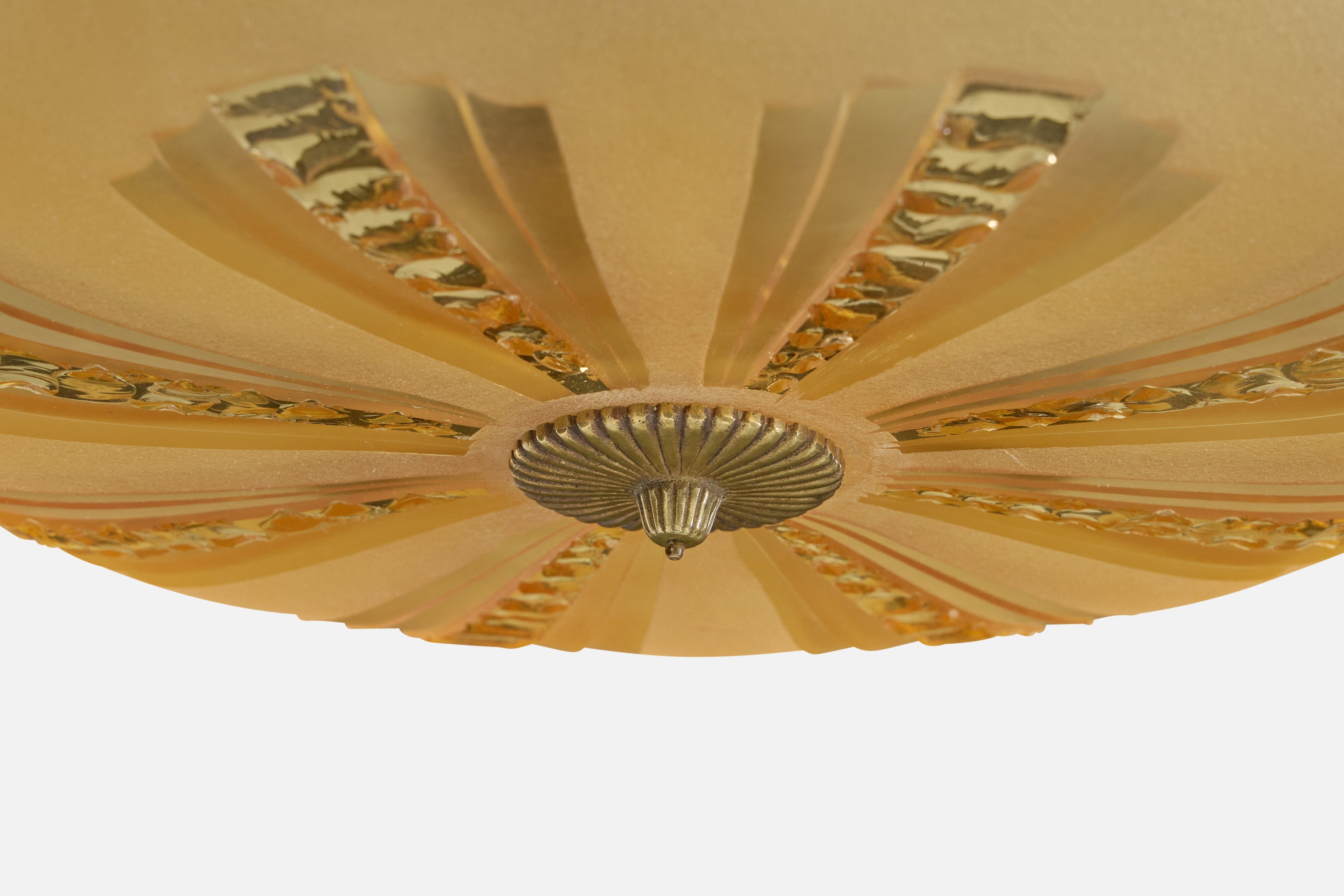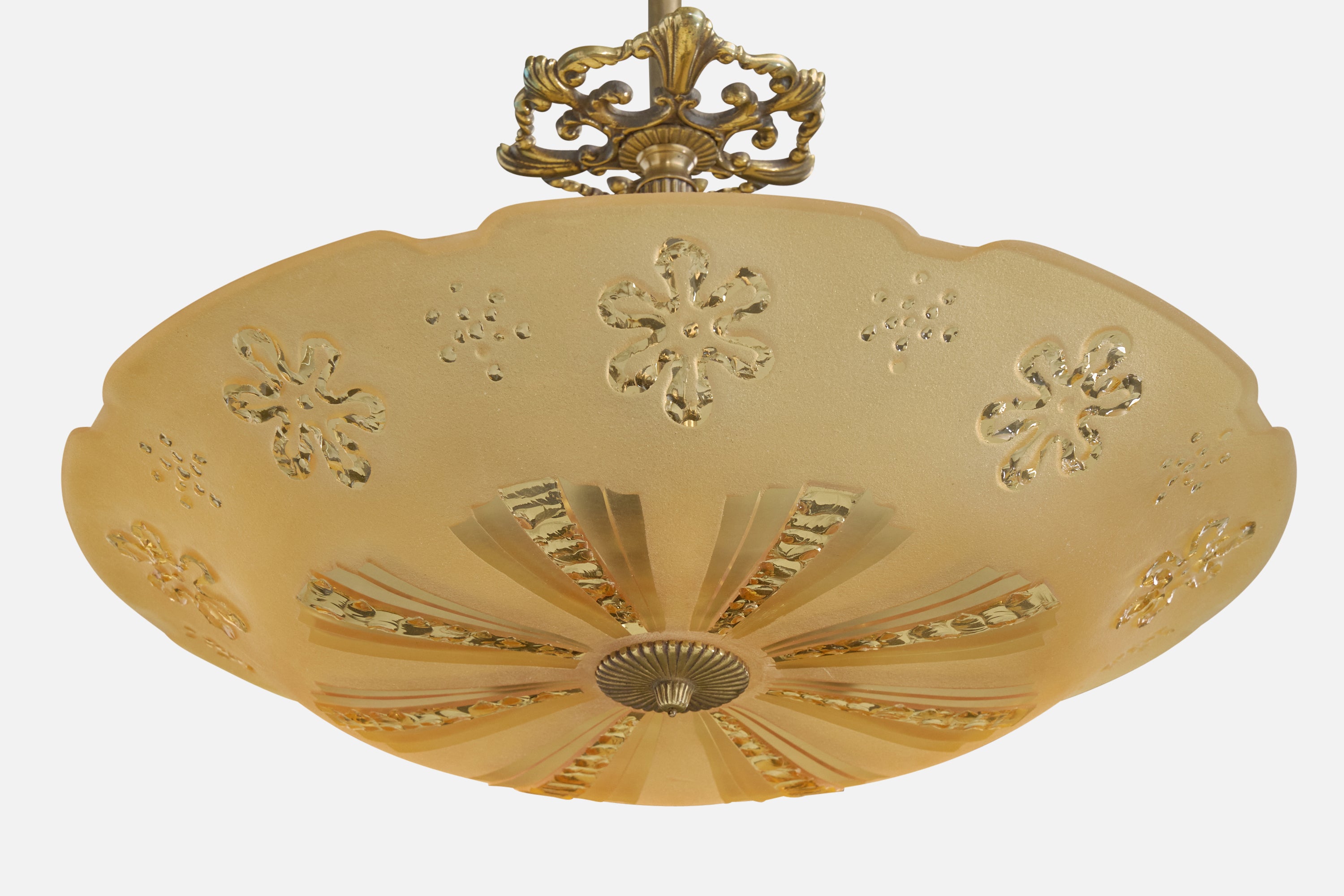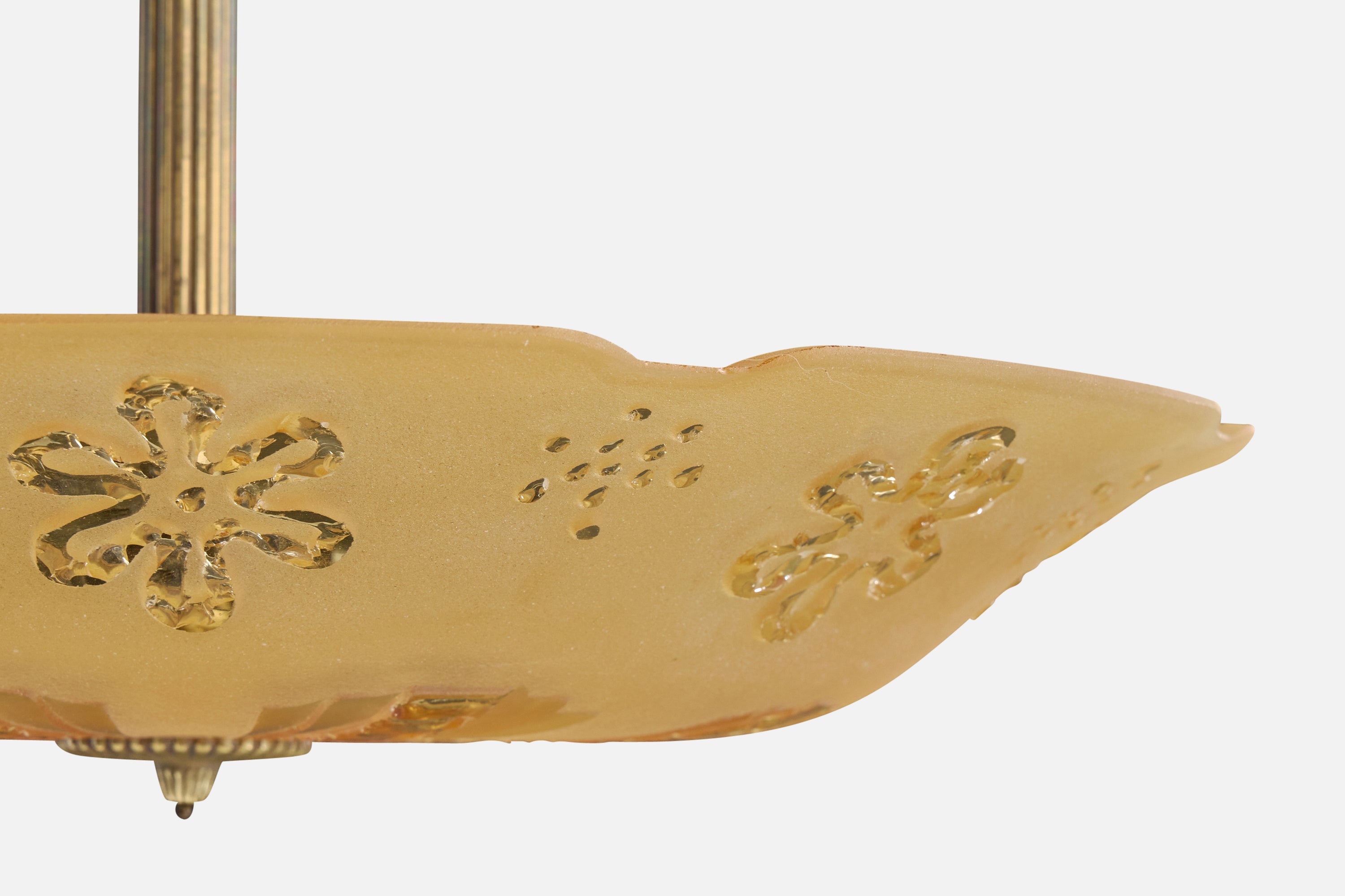 A brass and etched yellow glass pendant light designed and produced in Sweden, c. 1940s.