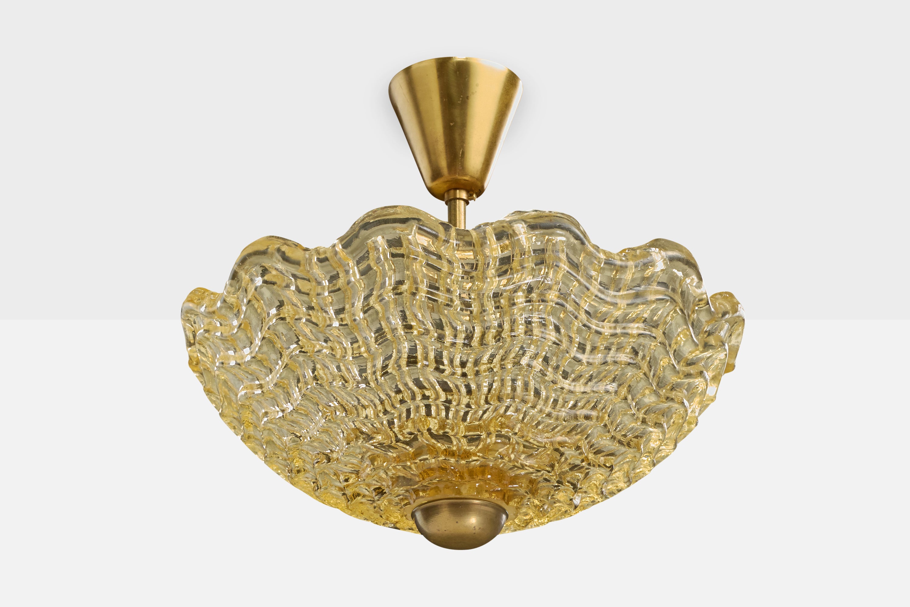 A brass and glass pendant light designed by Carl Fagerlund and produced by Orrefors, Sweden, c. 1950s.