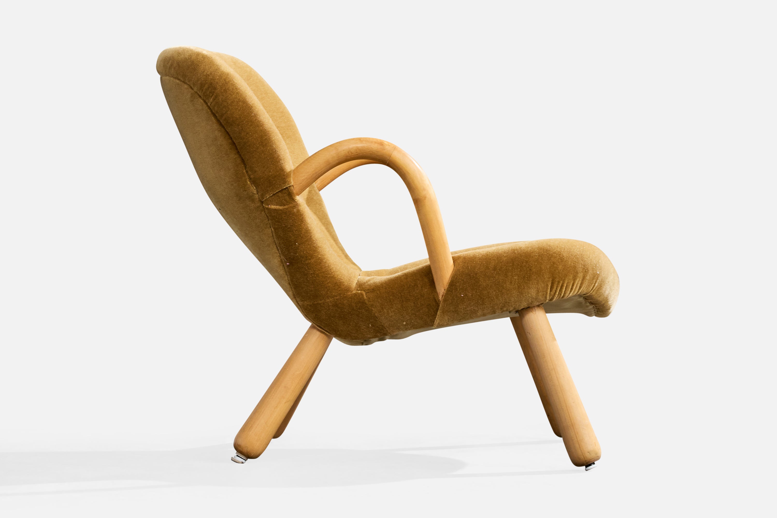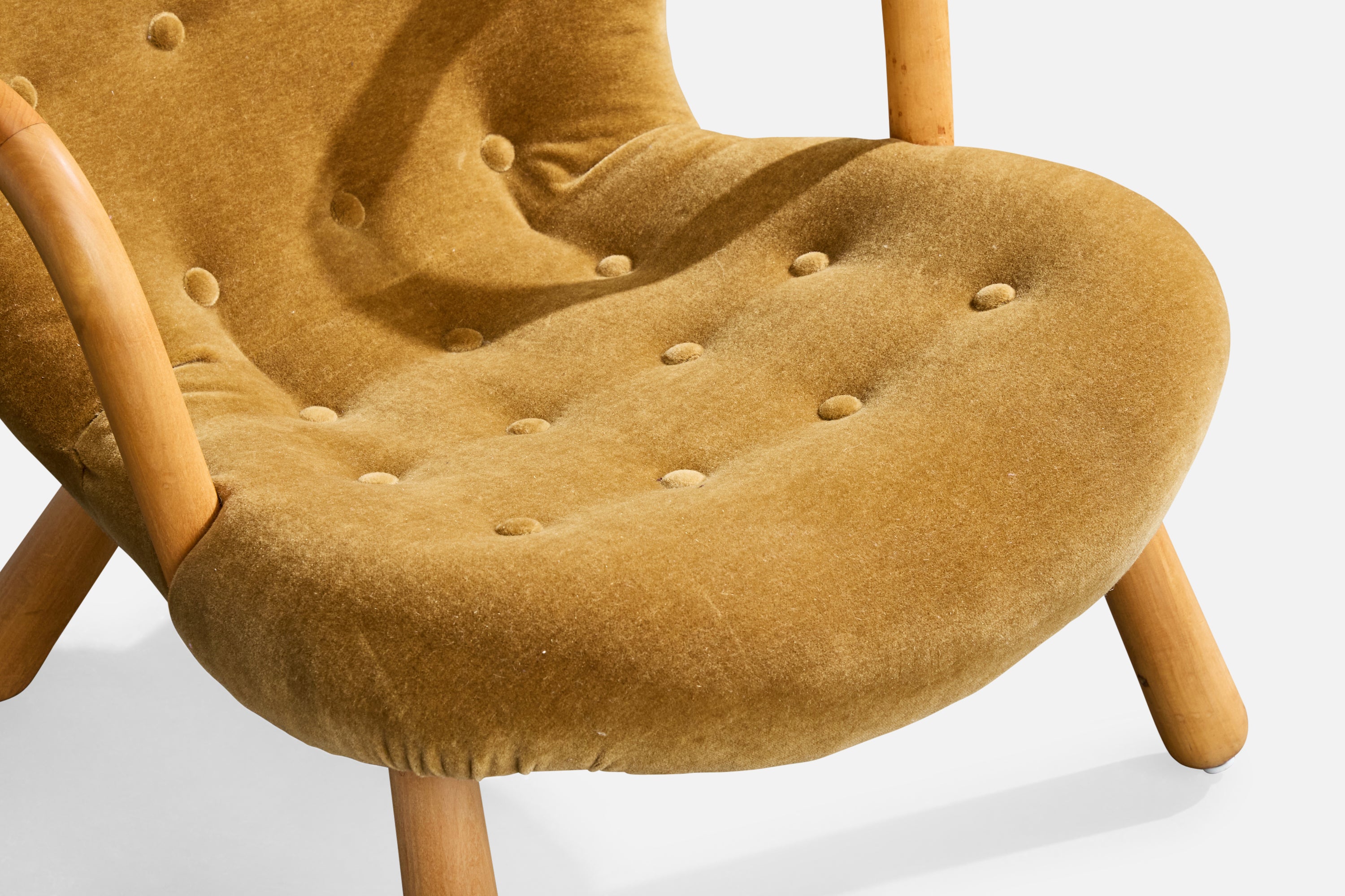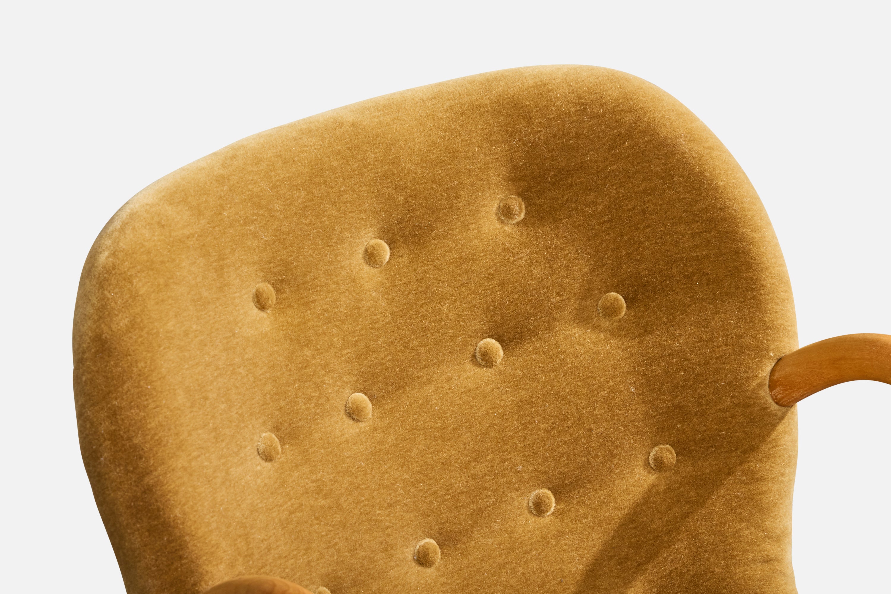 A wood and velvet lounge chair designed by Arnold Madsen and produced in Sweden, c. 1950s.