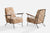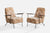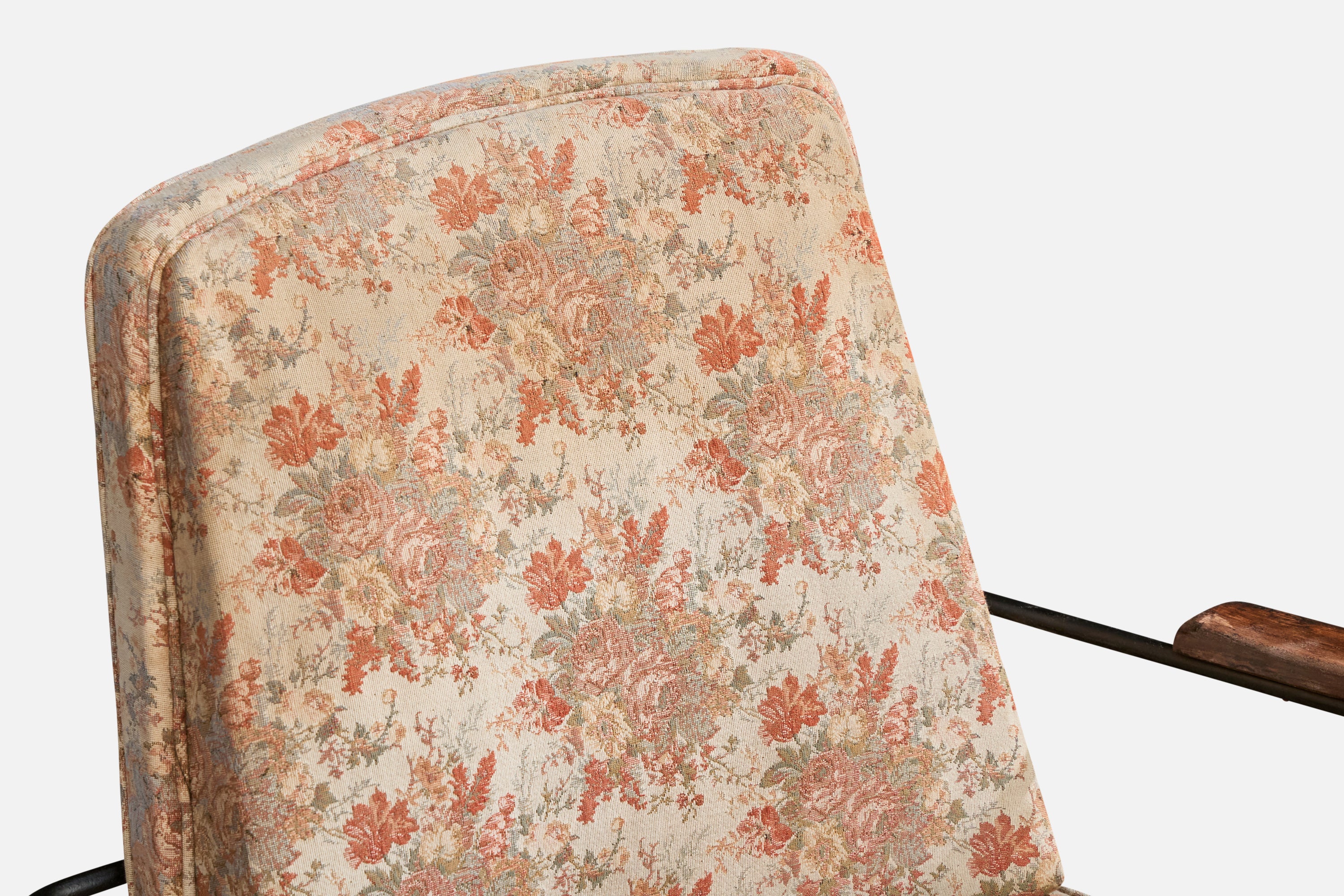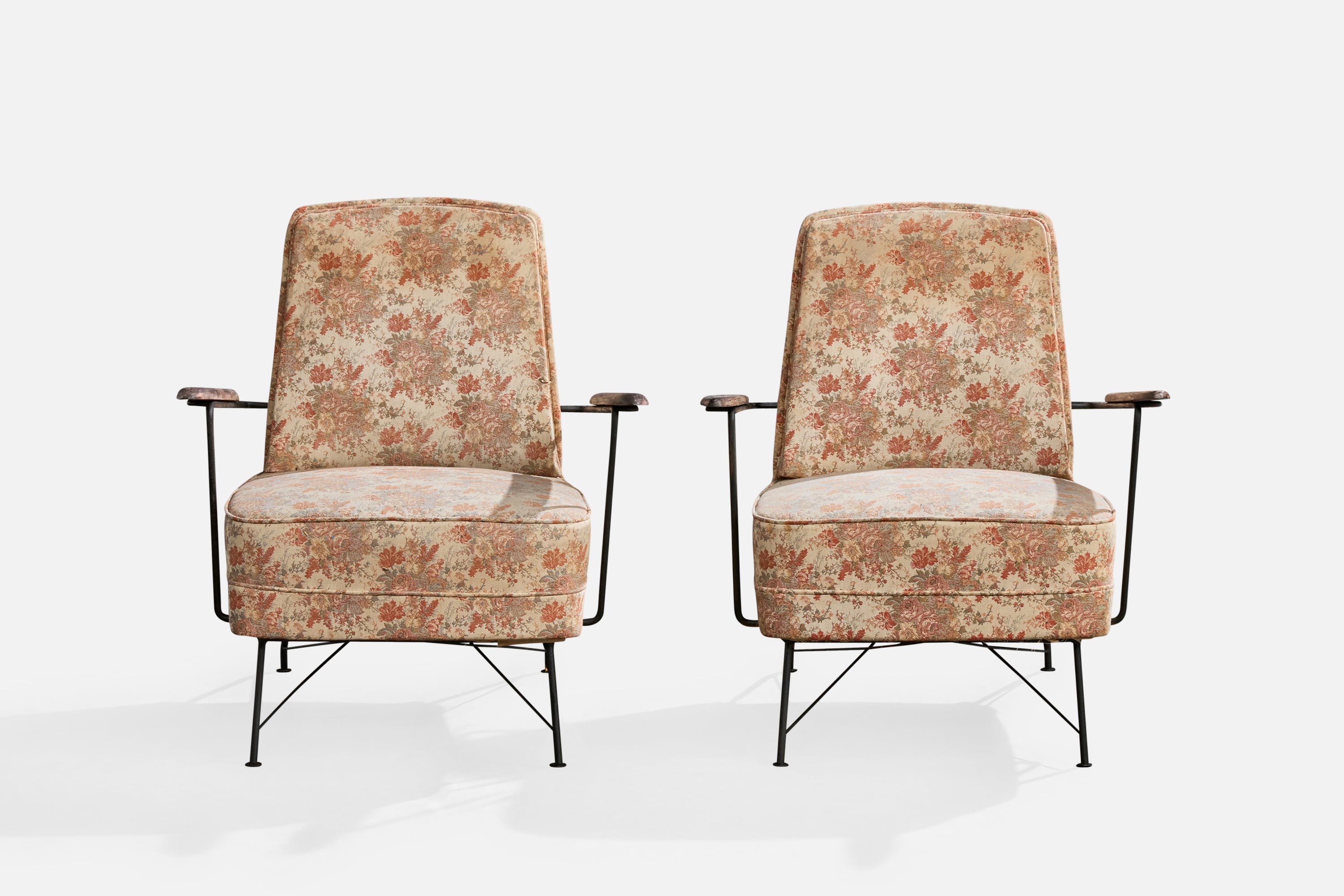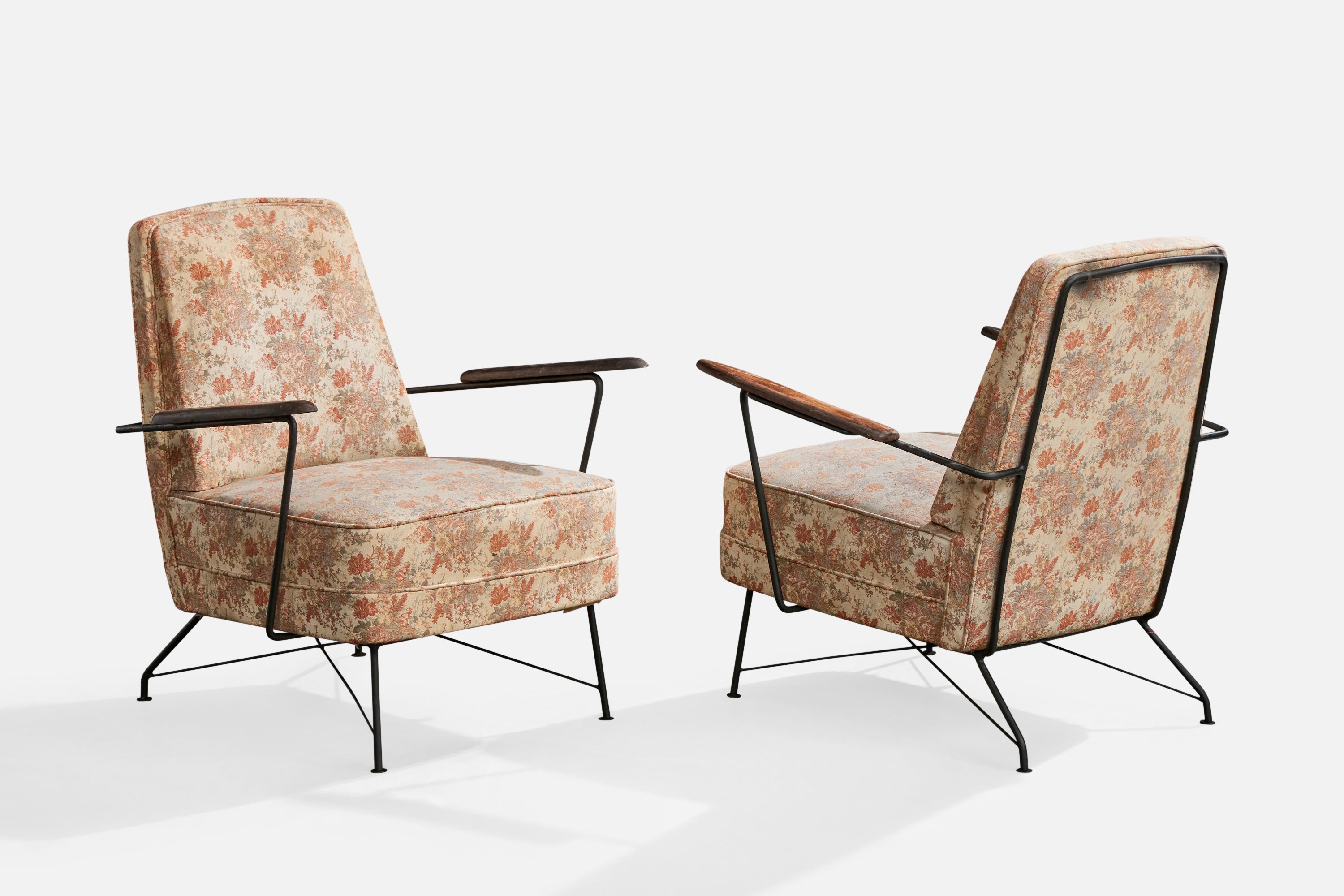 A pair of black-painted iron, wood and floral-printed fabric lounge chairs designed and produced in Brazil, c. 1960s.