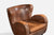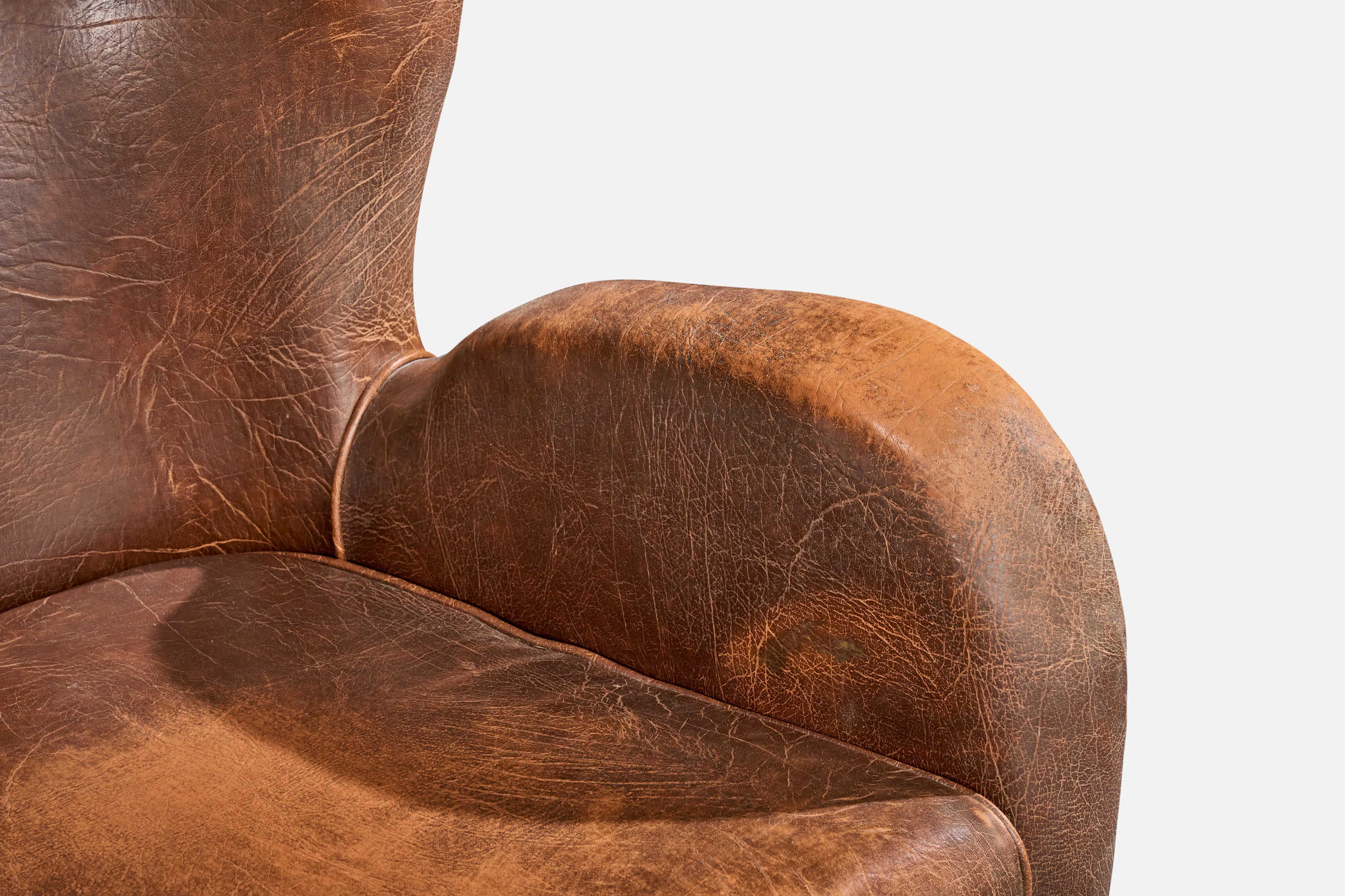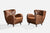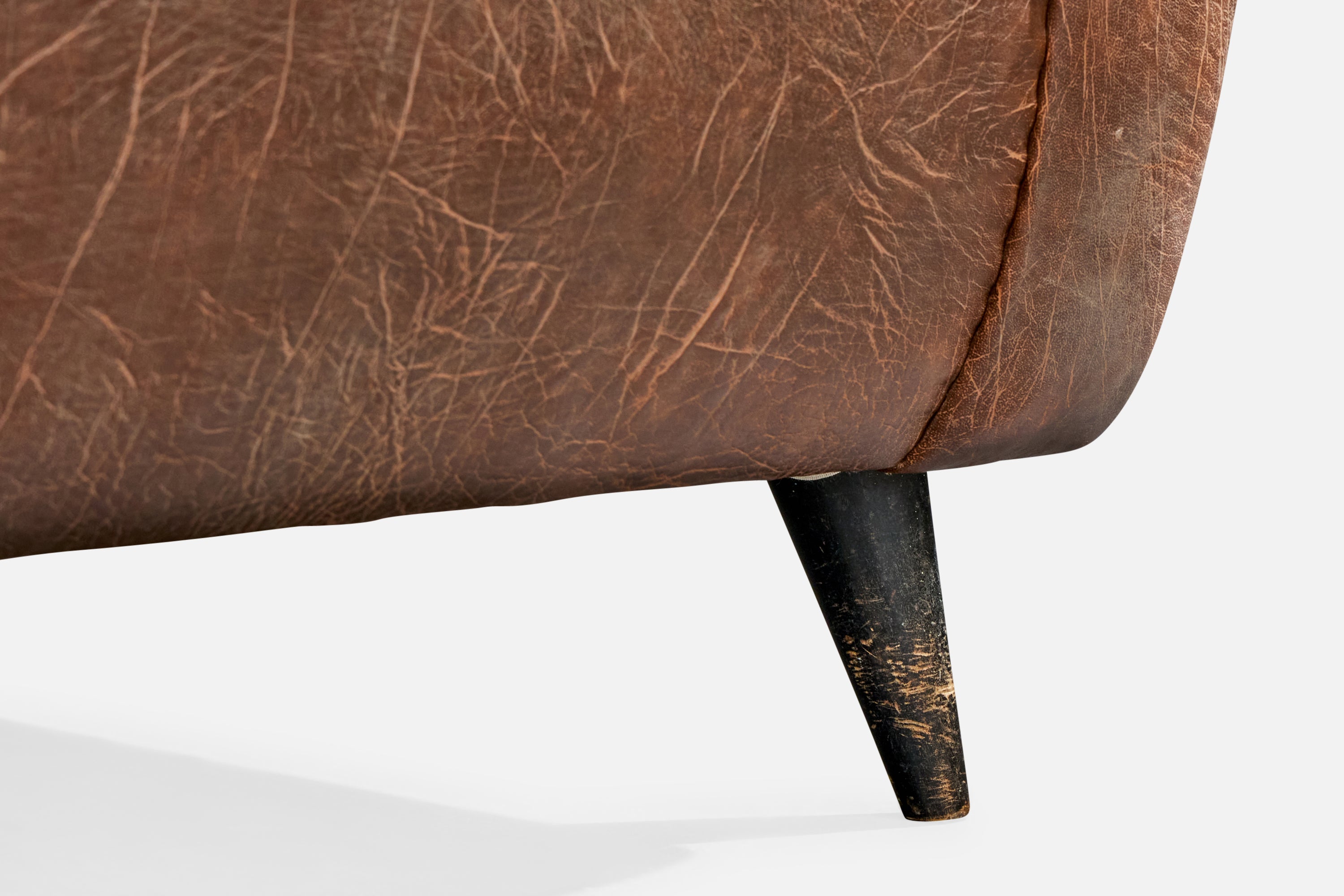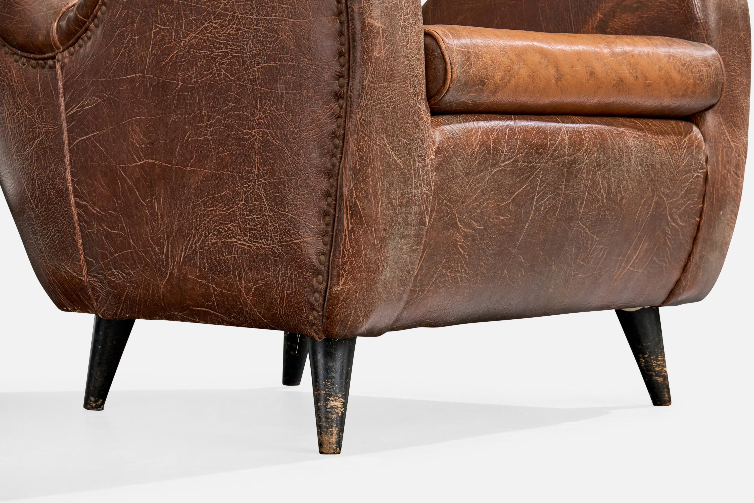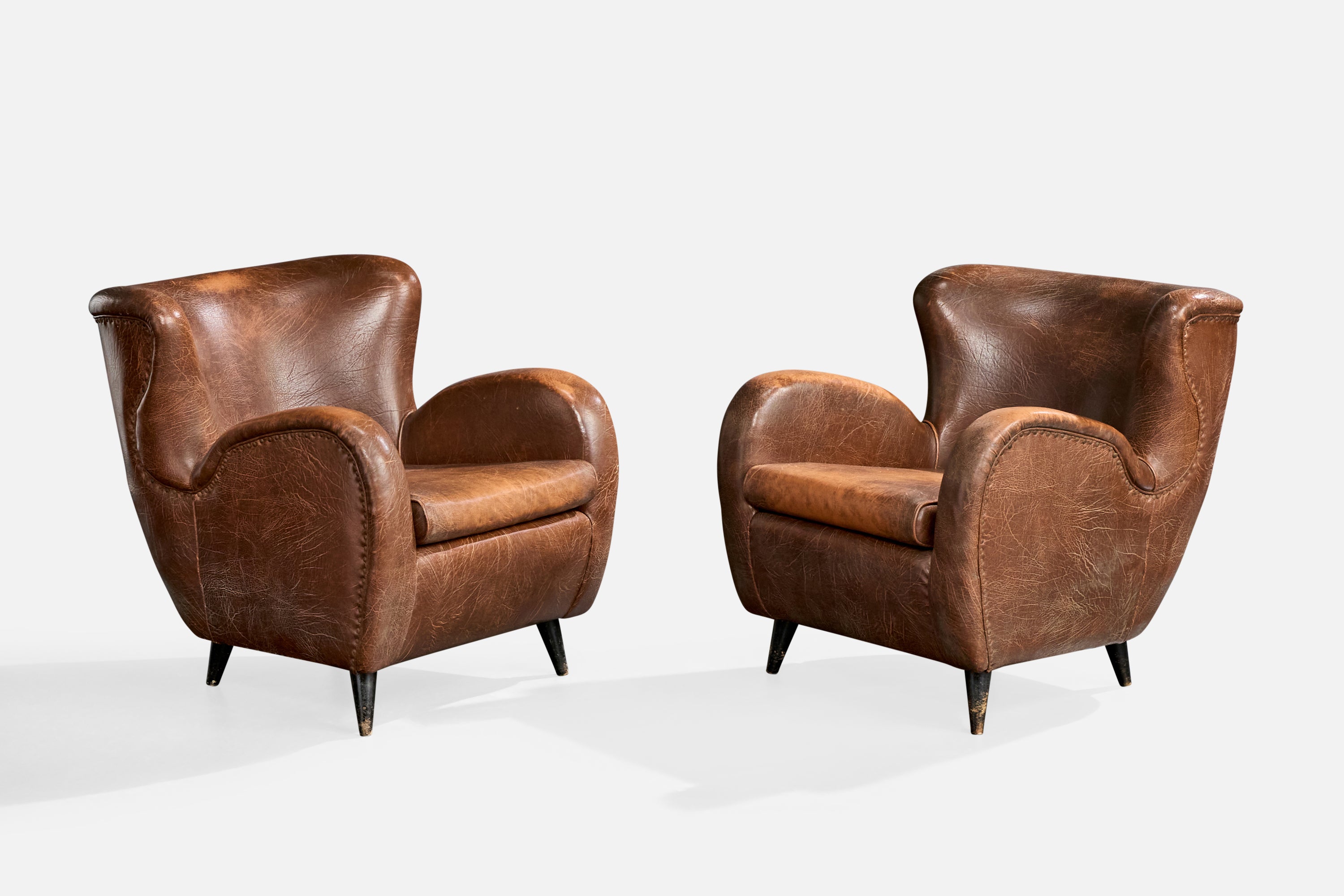 A pair of dark-stained wood and brown leather lounge chairs designed by Carlo Hauner and produced by Forma, Brazil, 1950s.