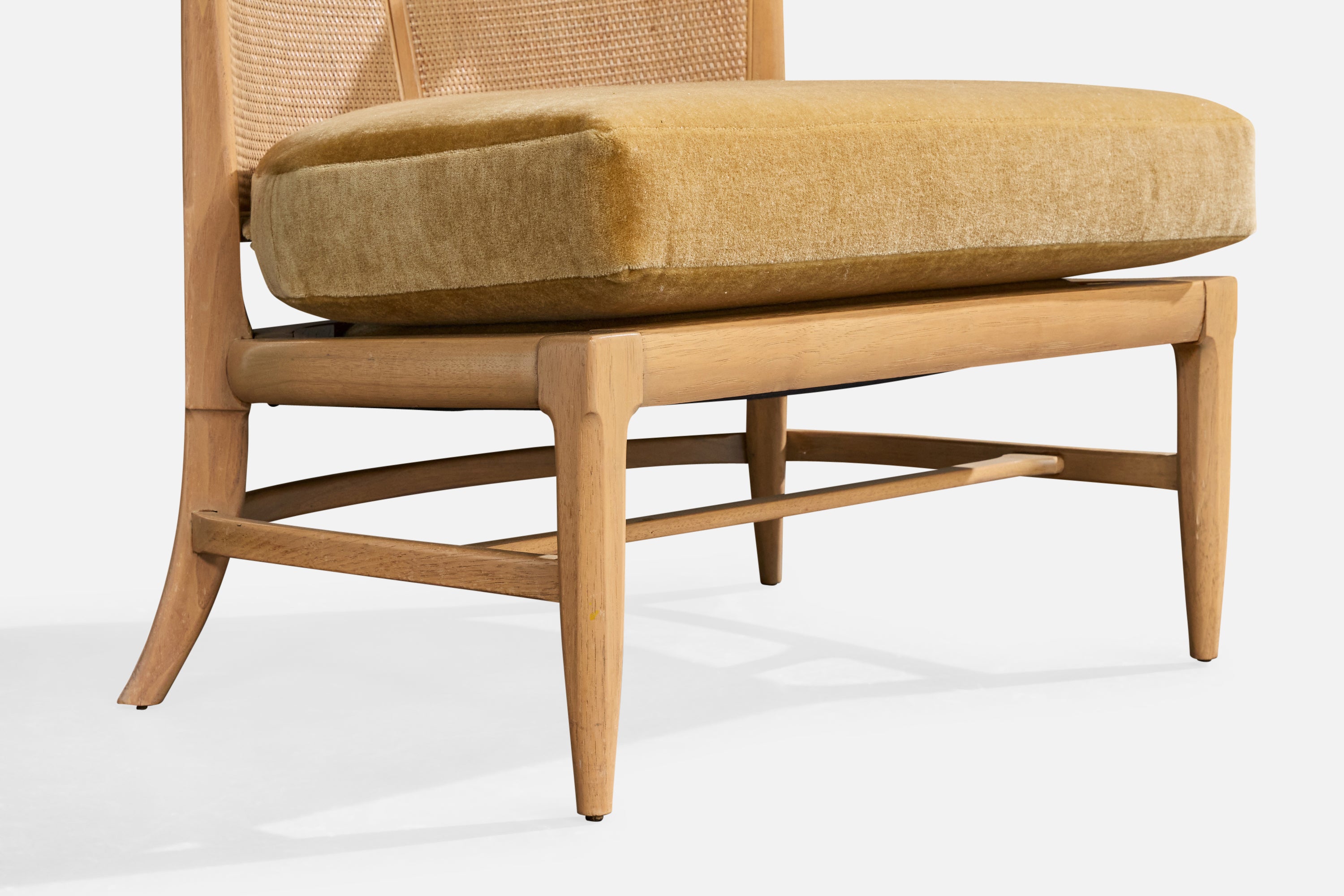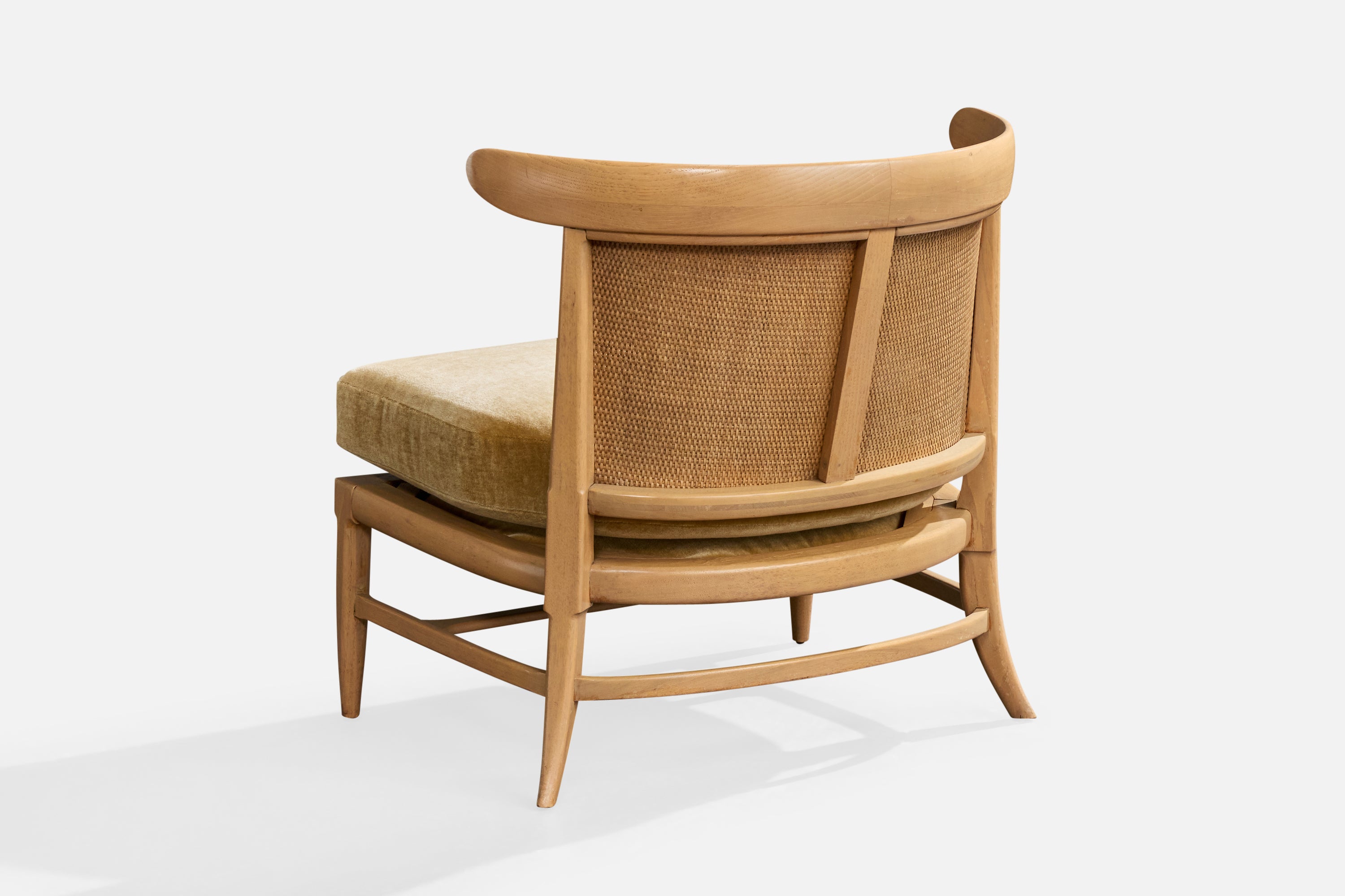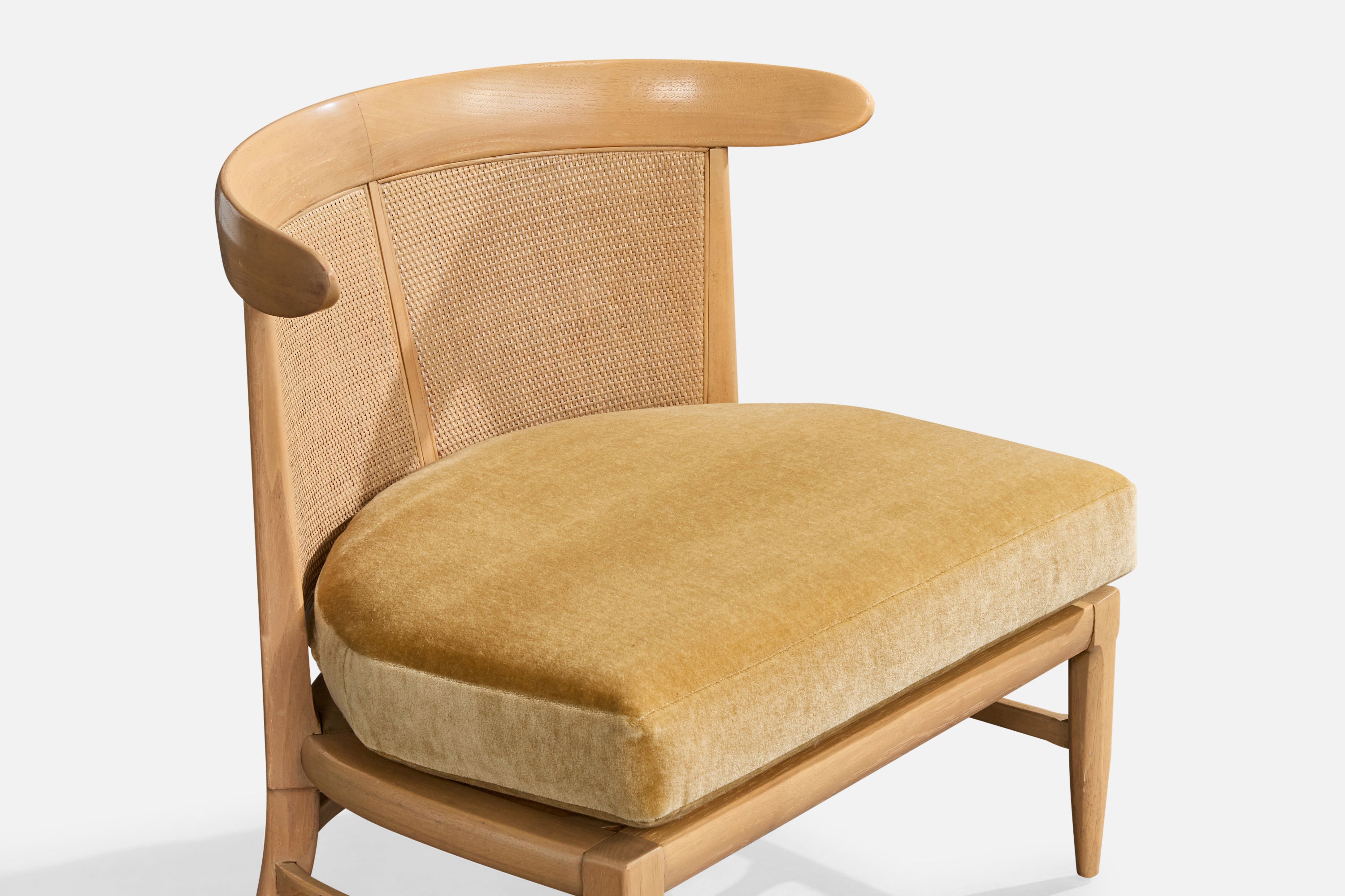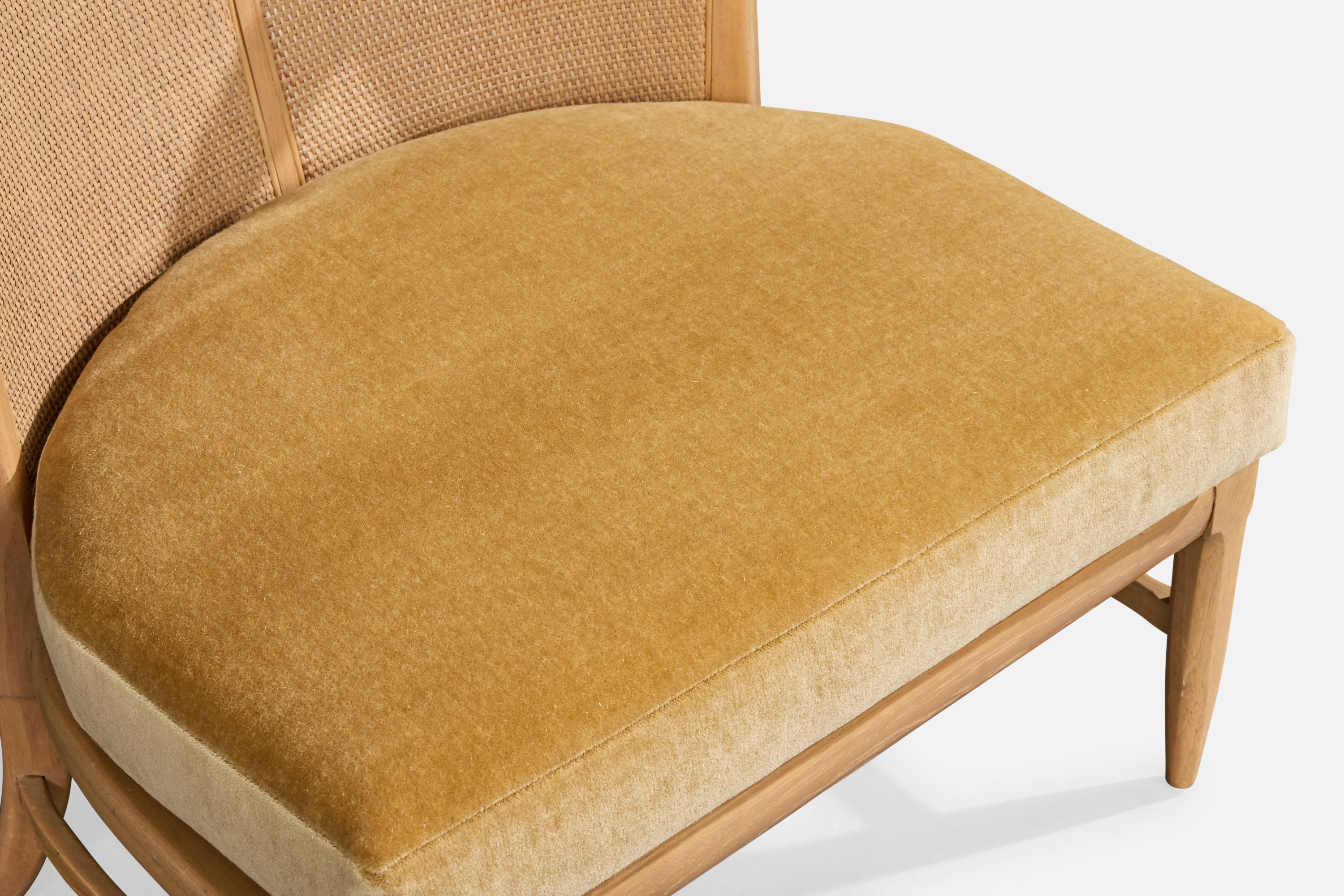 A bleached wood, cane and beige velvet slipper chair designed by John Lubberts & Lambert Mulder and produced by Tomlinson, USA, 1950s.