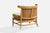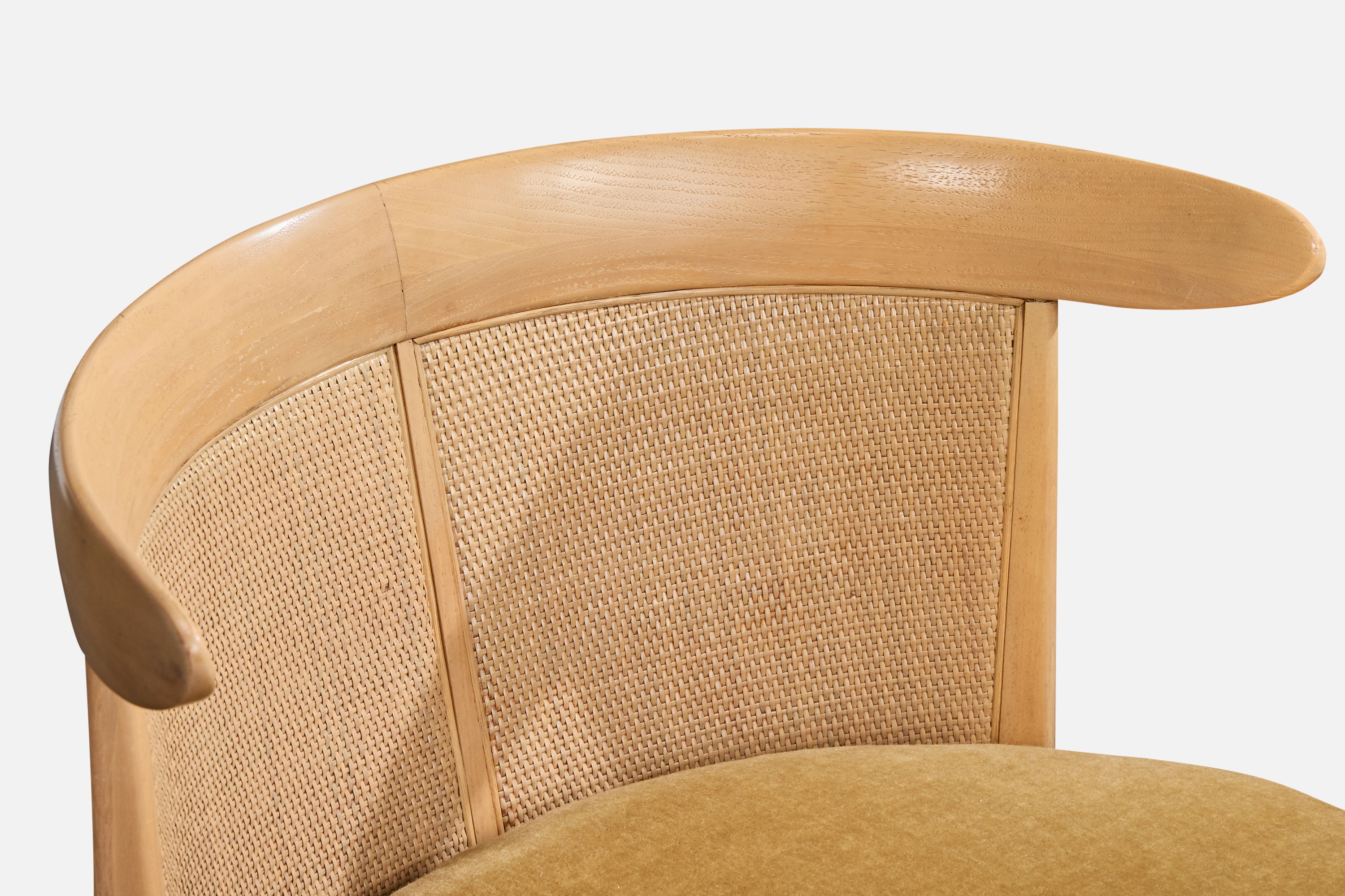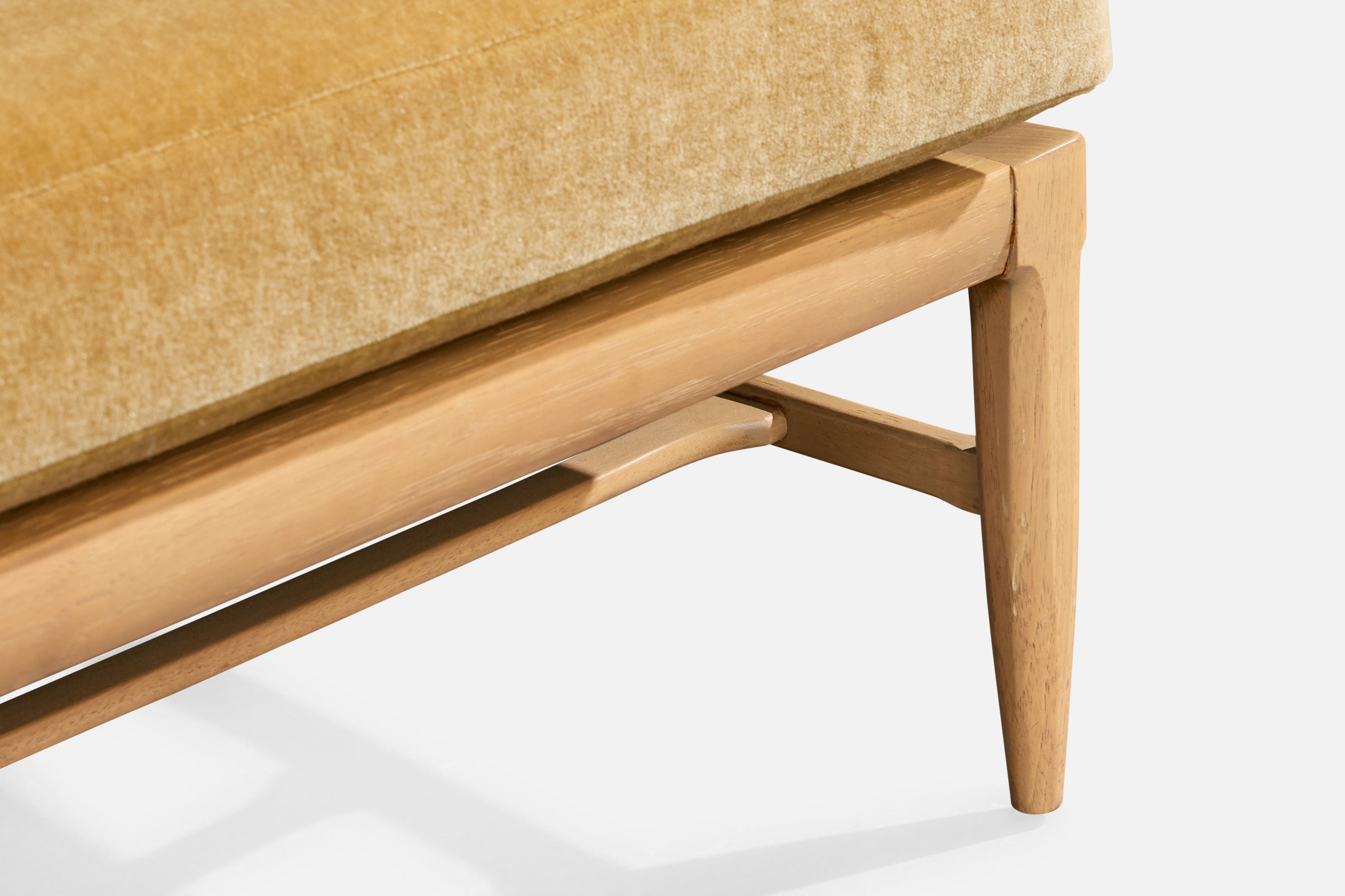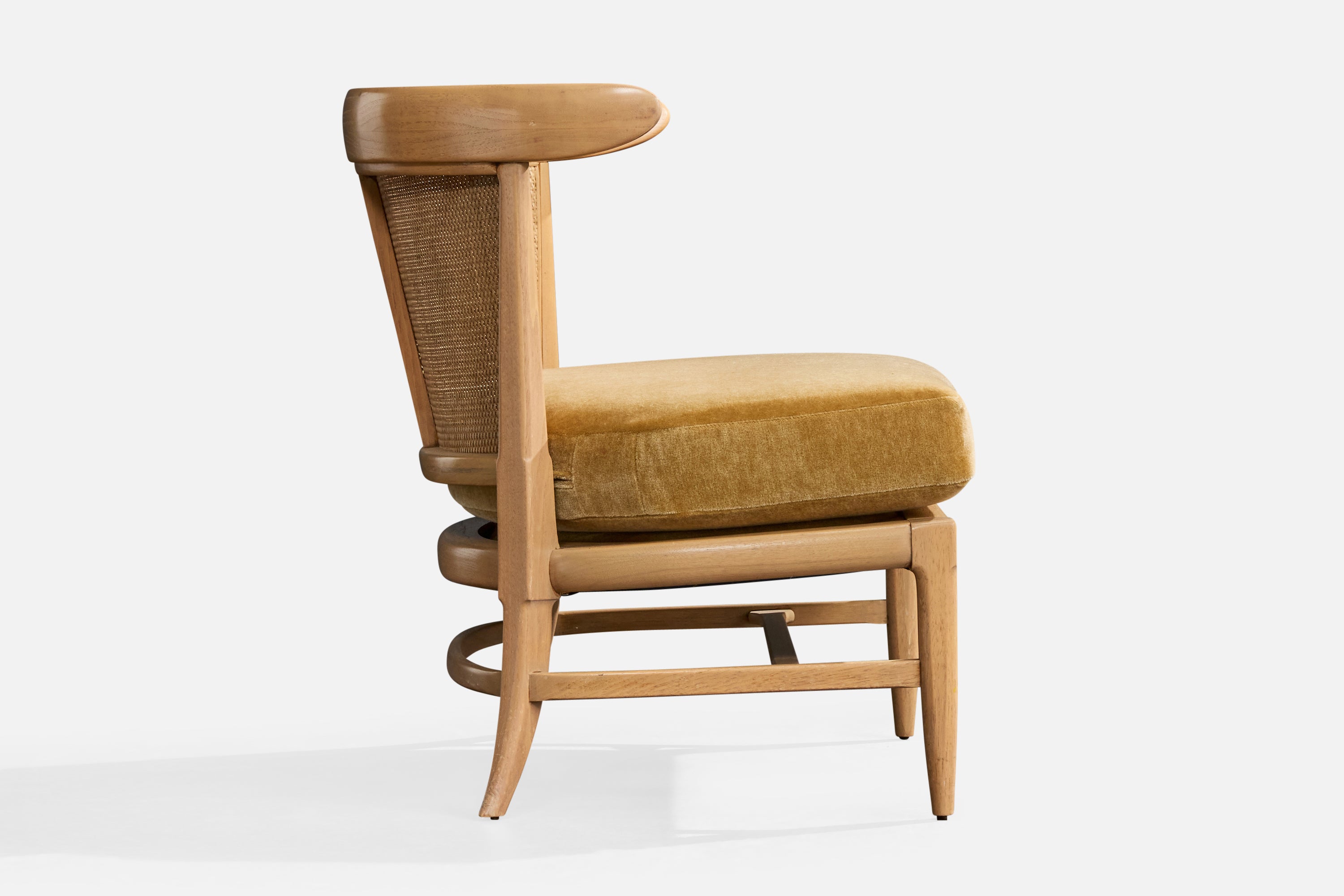 A bleached wood, cane and beige velvet slipper chair designed by John Lubberts & Lambert Mulder and produced by Tomlinson, USA, 1950s.