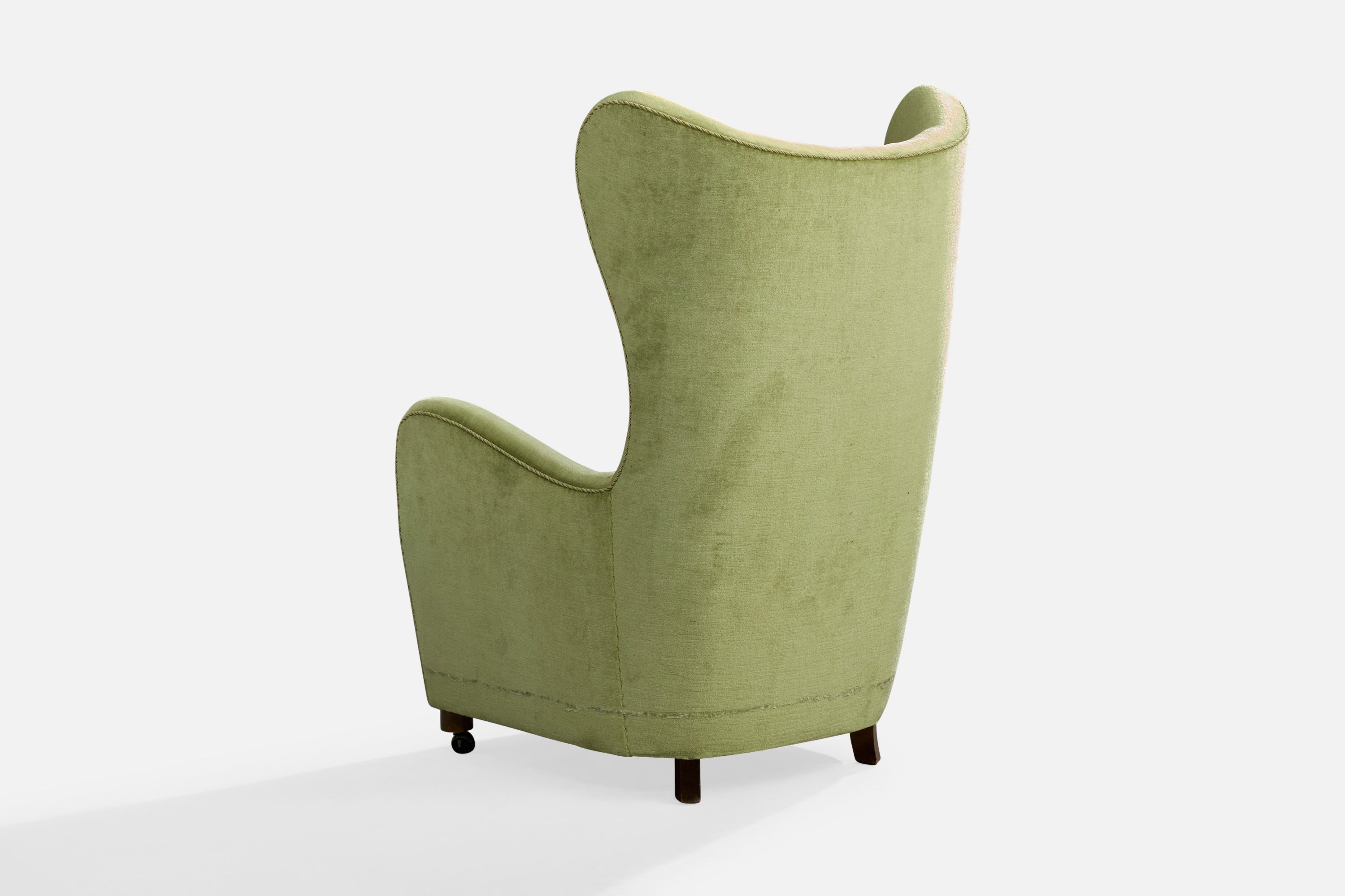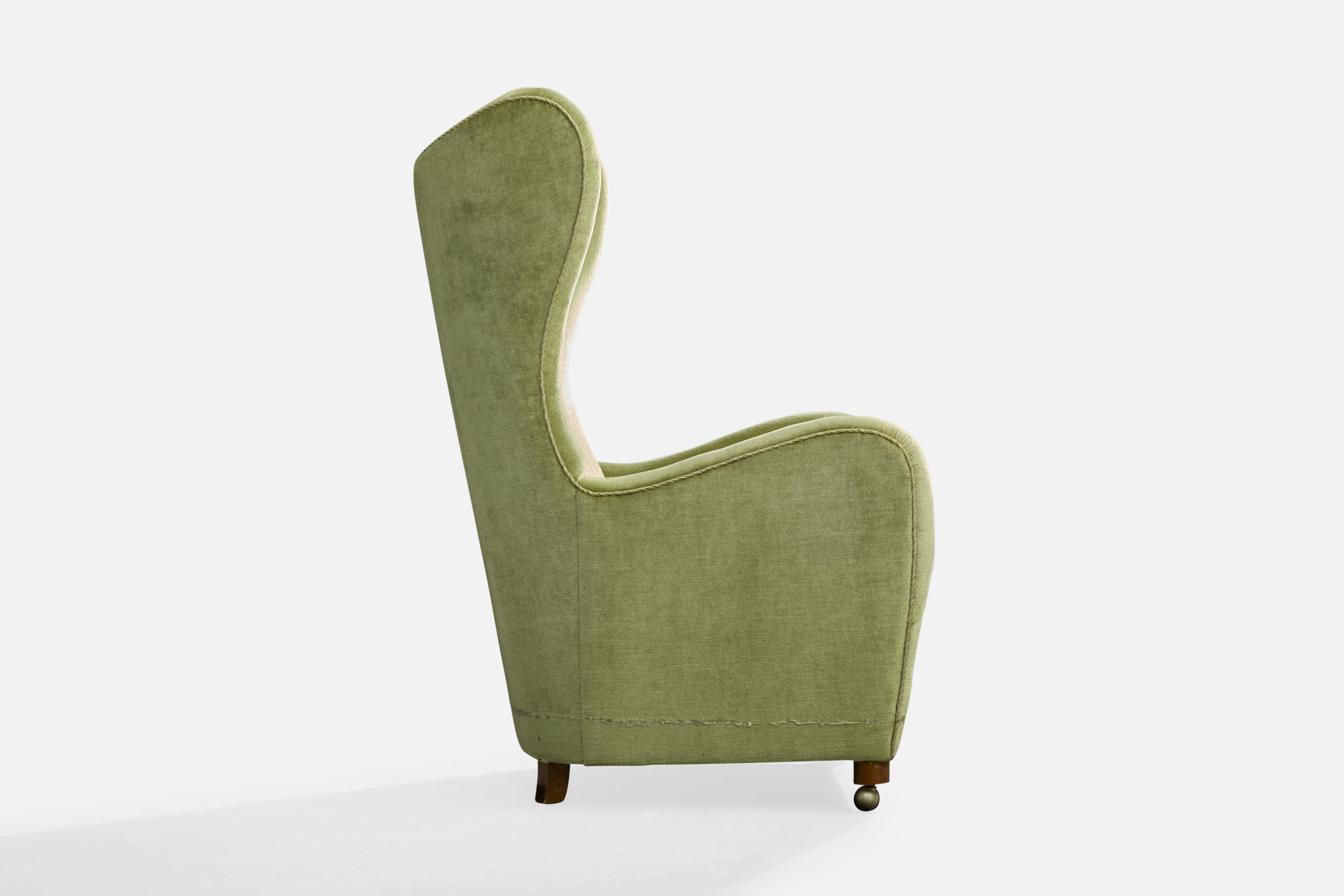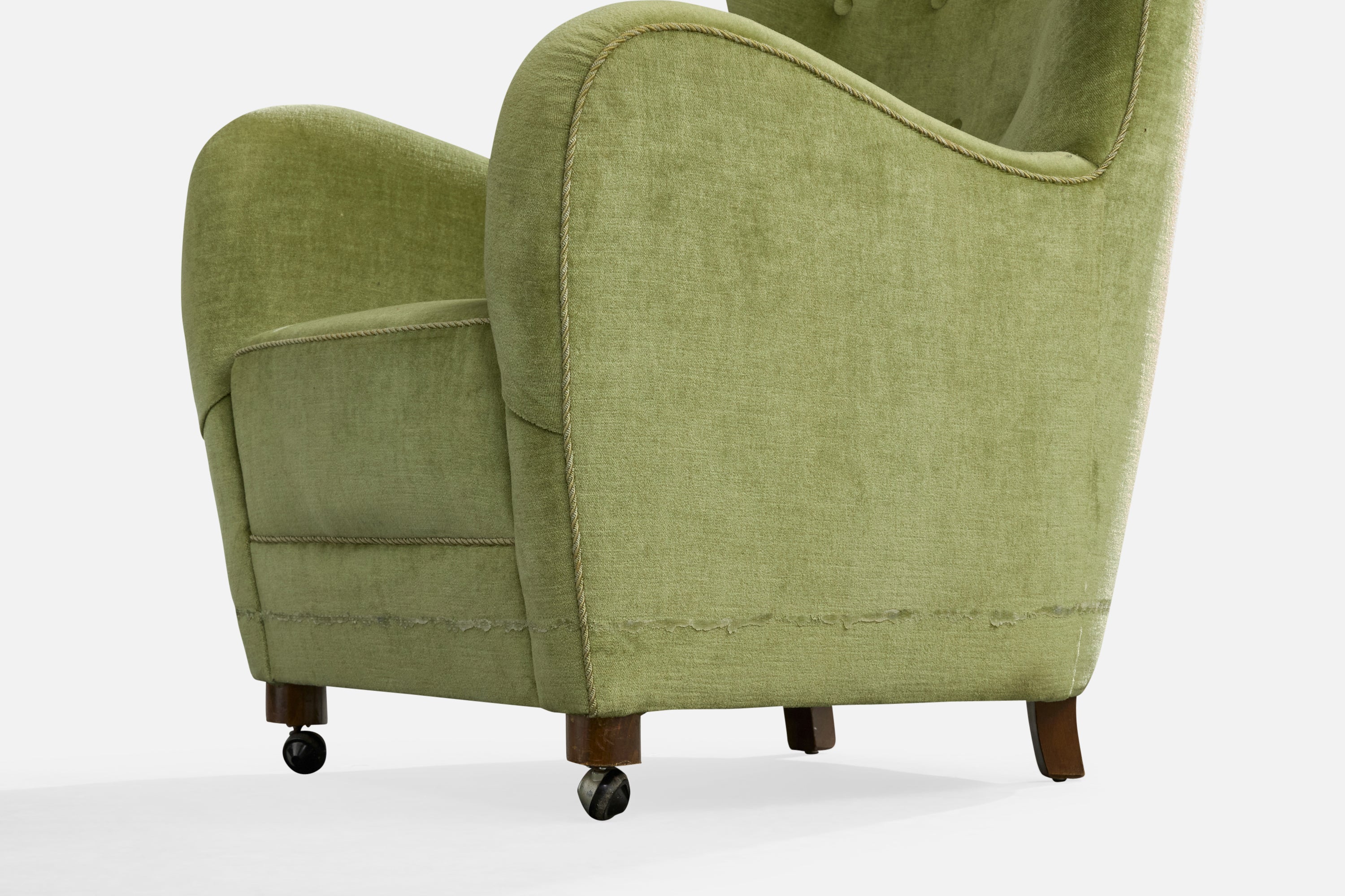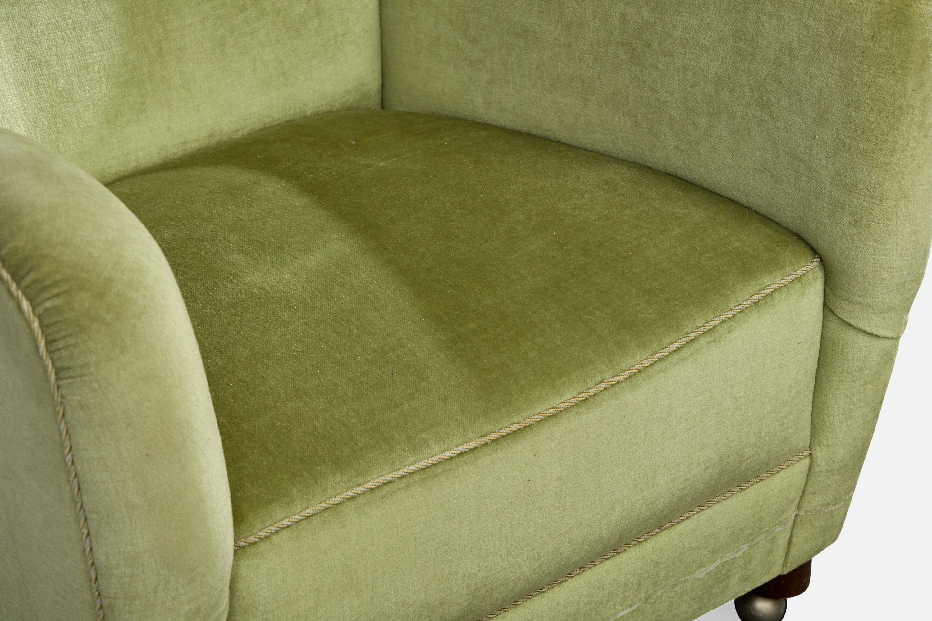 A green velvet, wood and metal lounge chair designed and produced in Denmark, c. 1940s.