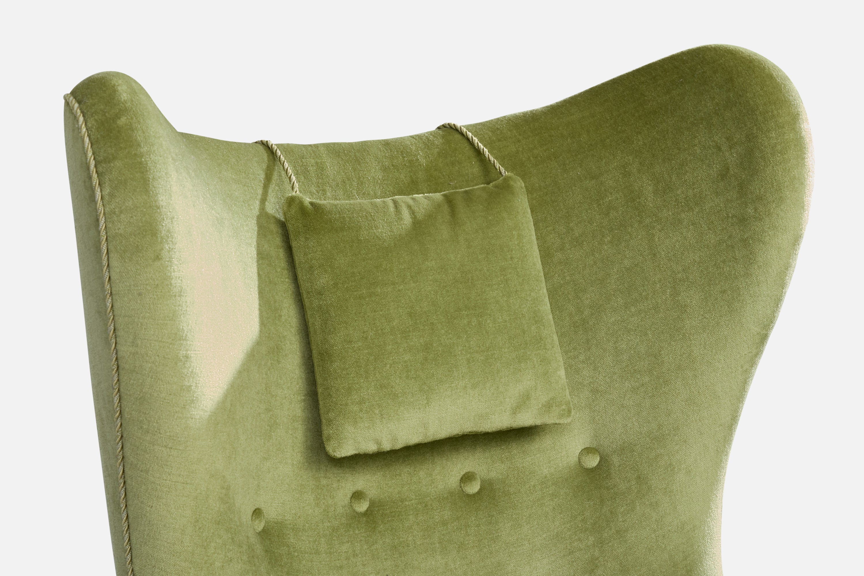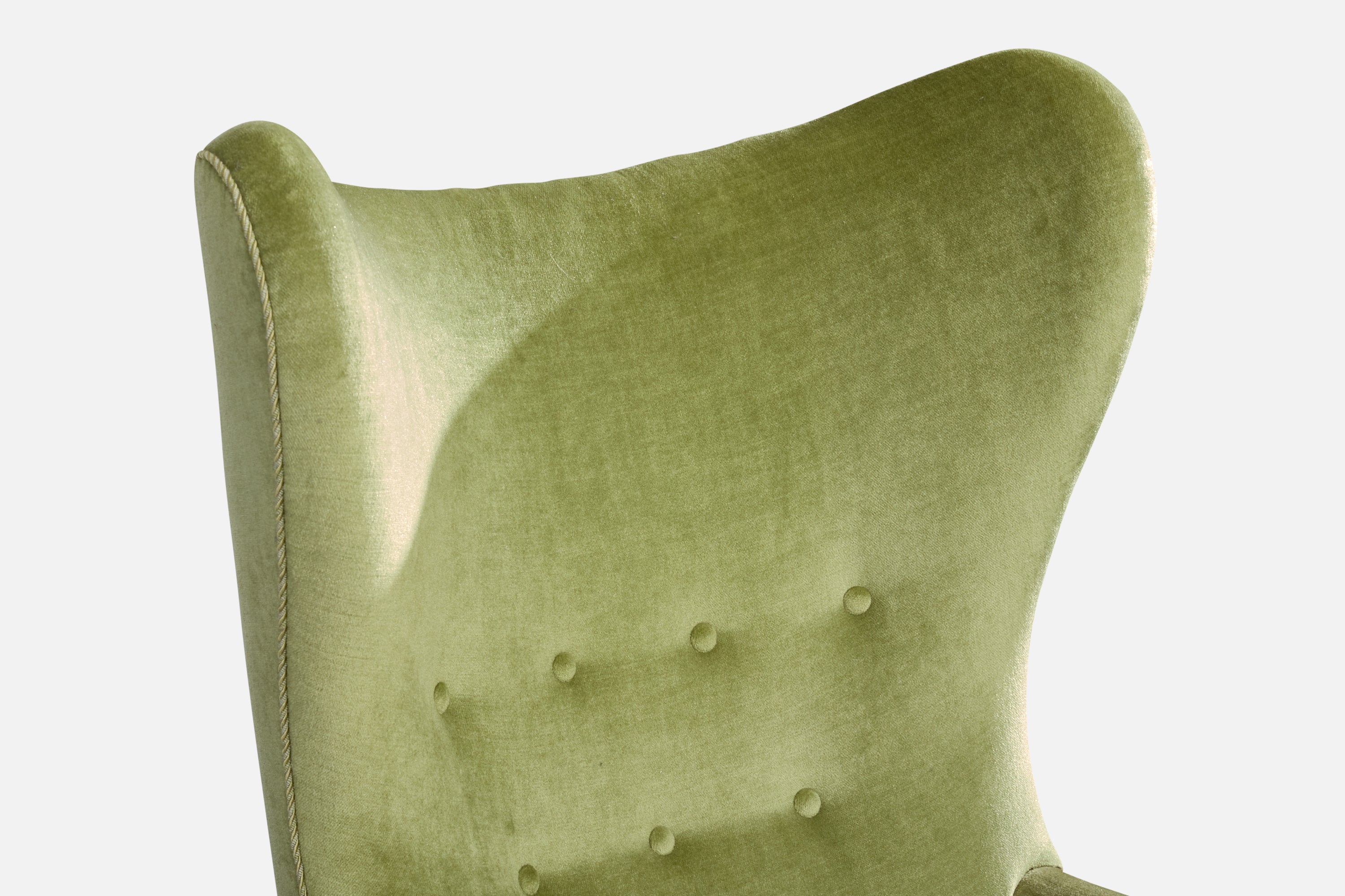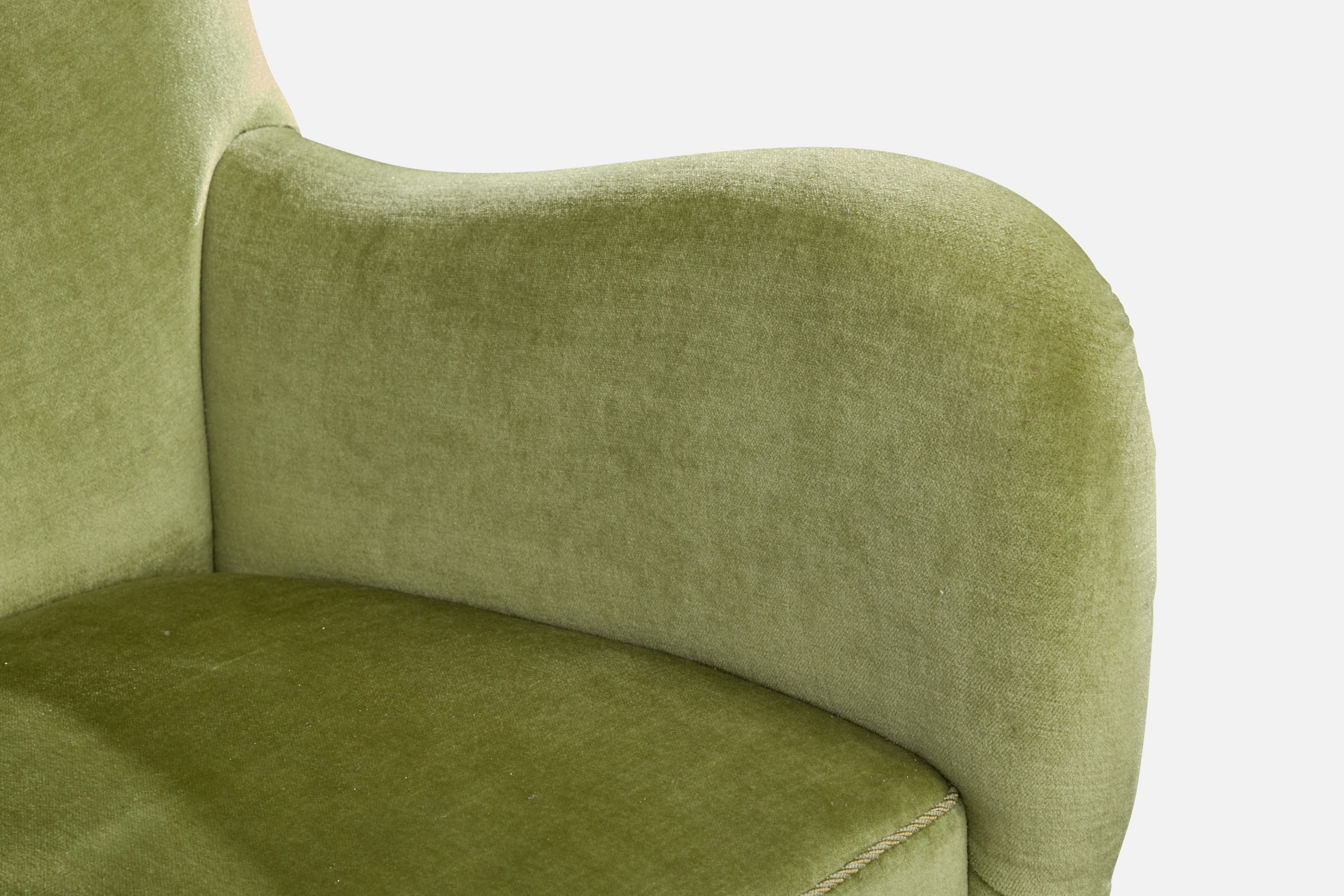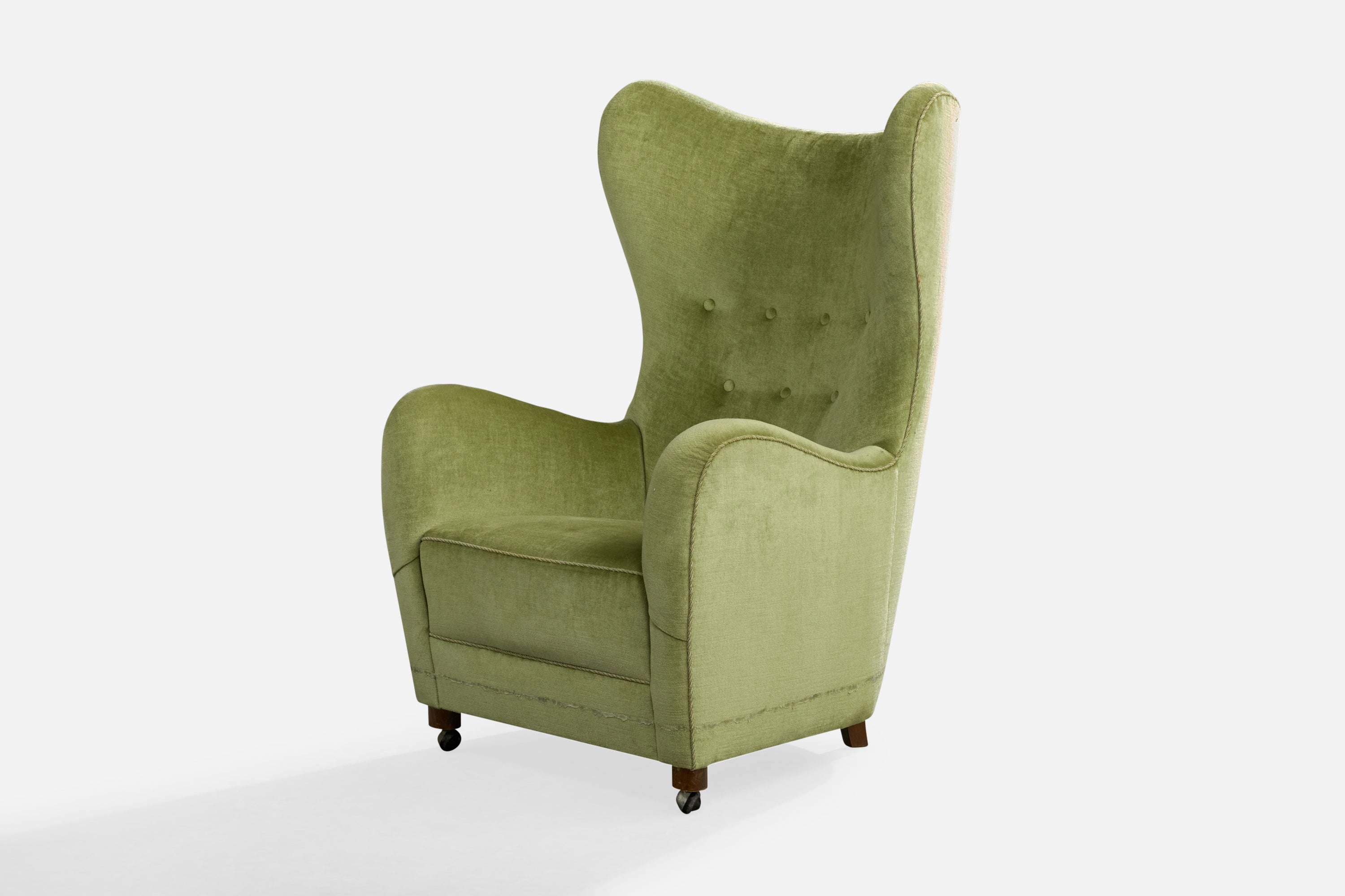 A green velvet, wood and metal lounge chair designed and produced in Denmark, c. 1940s.