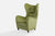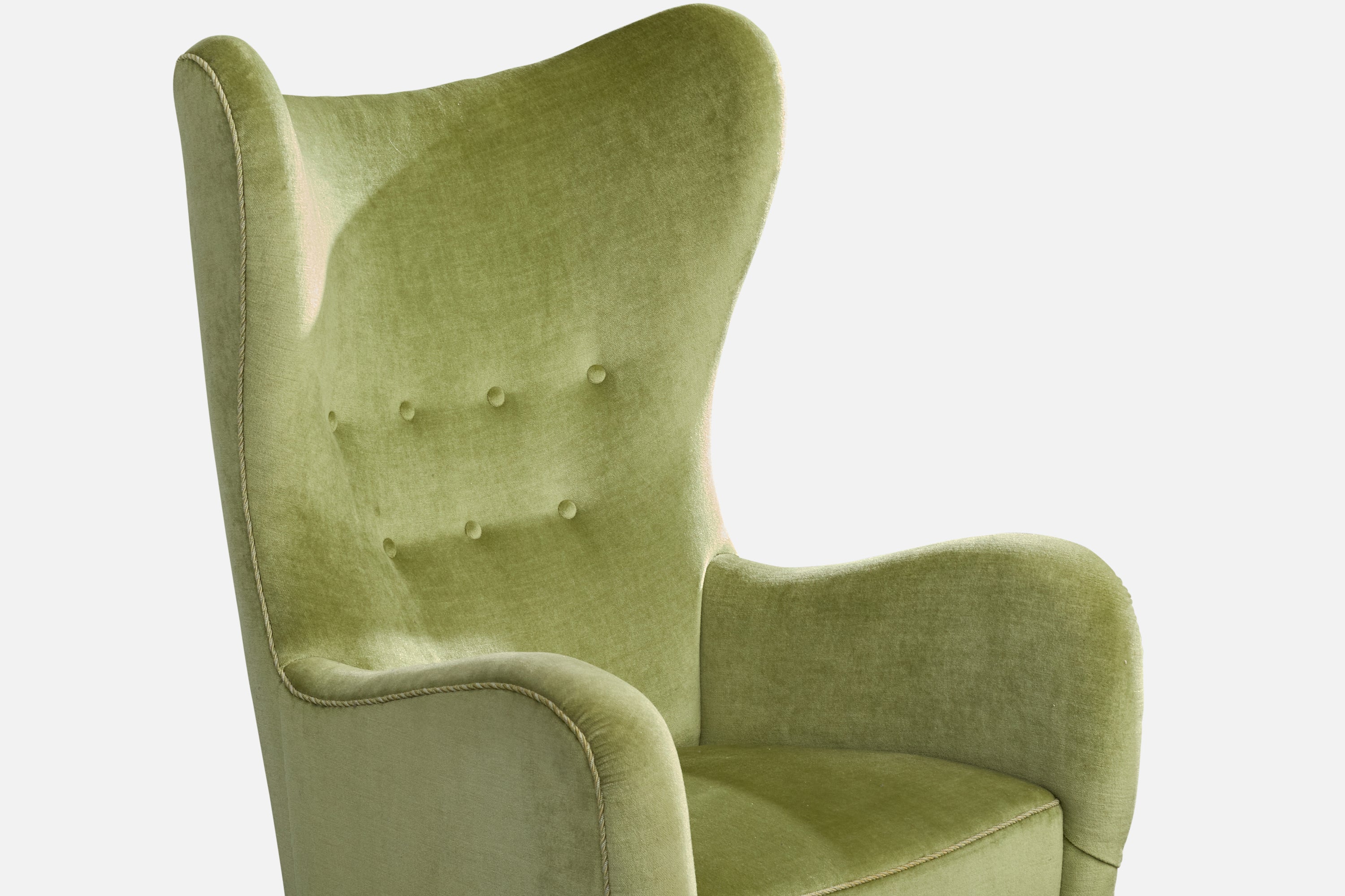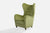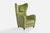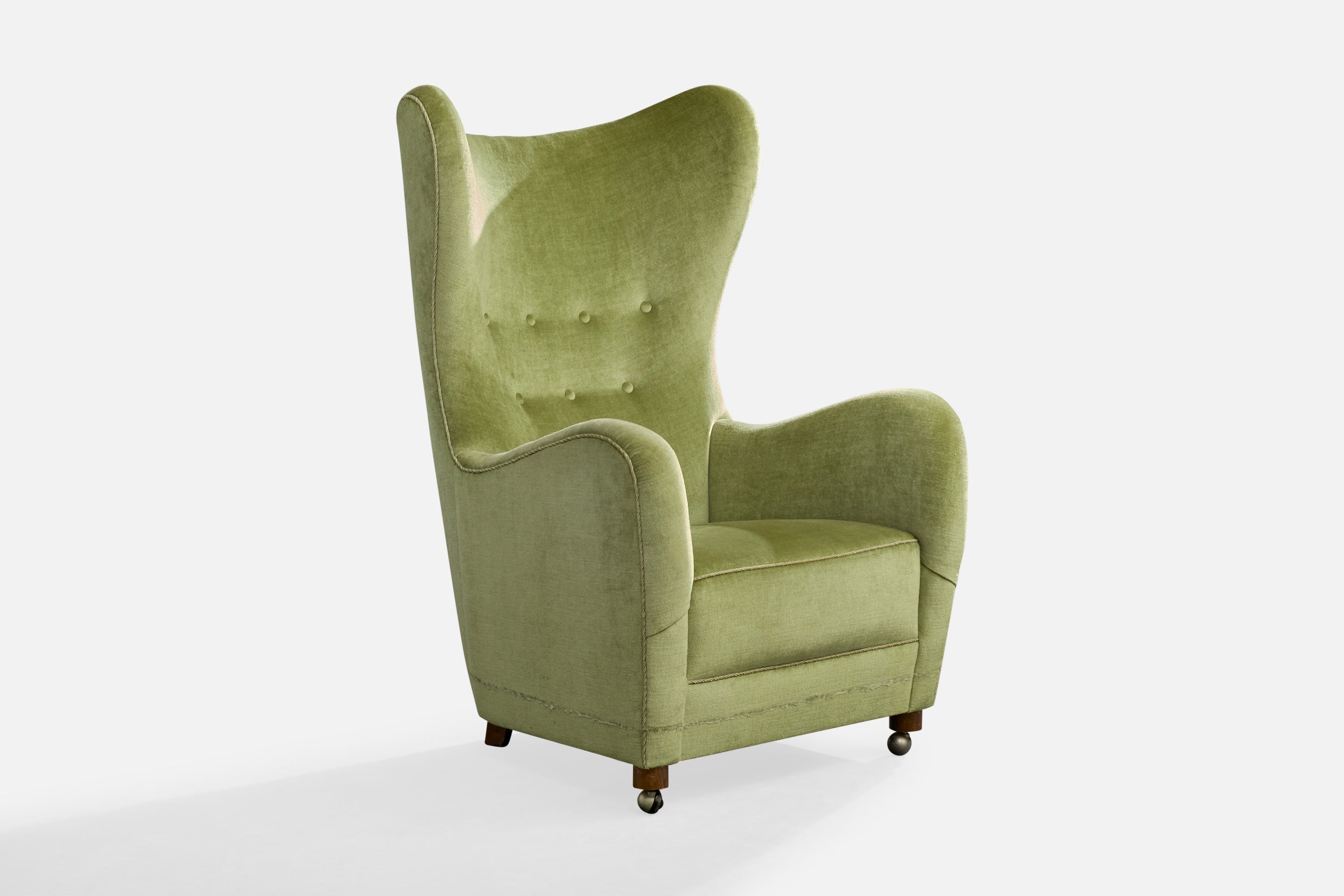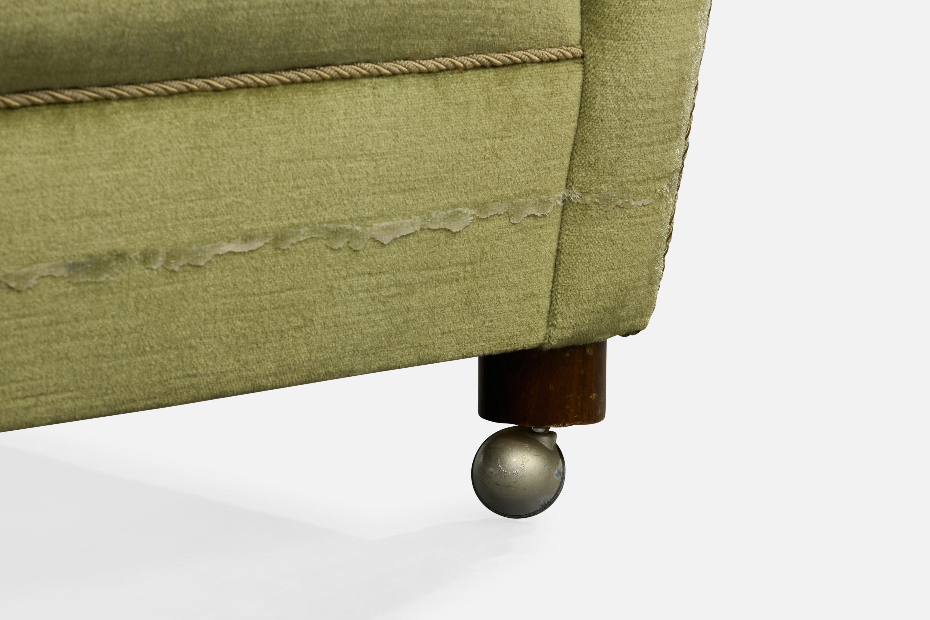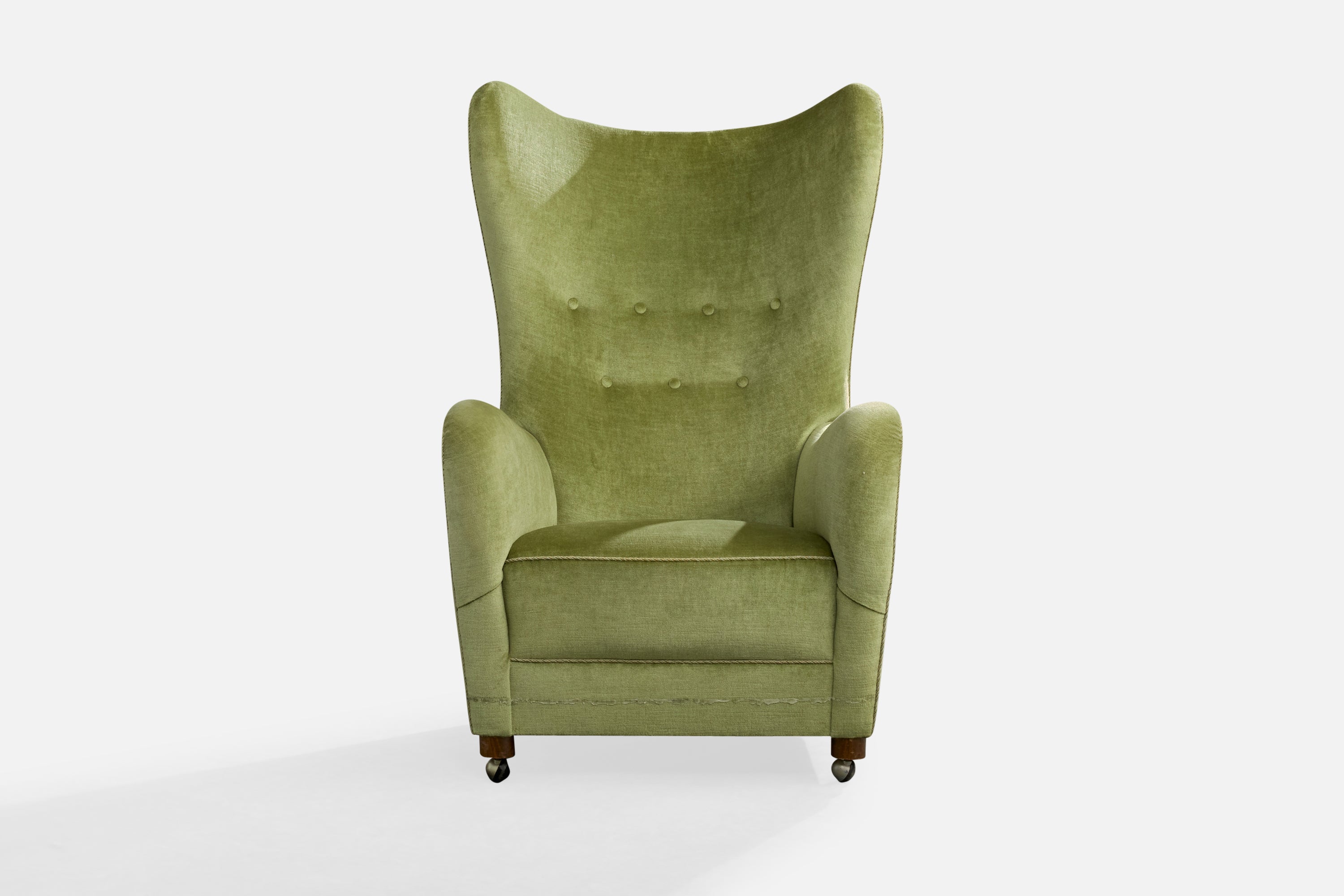 A green velvet, wood and metal lounge chair designed and produced in Denmark, c. 1940s.