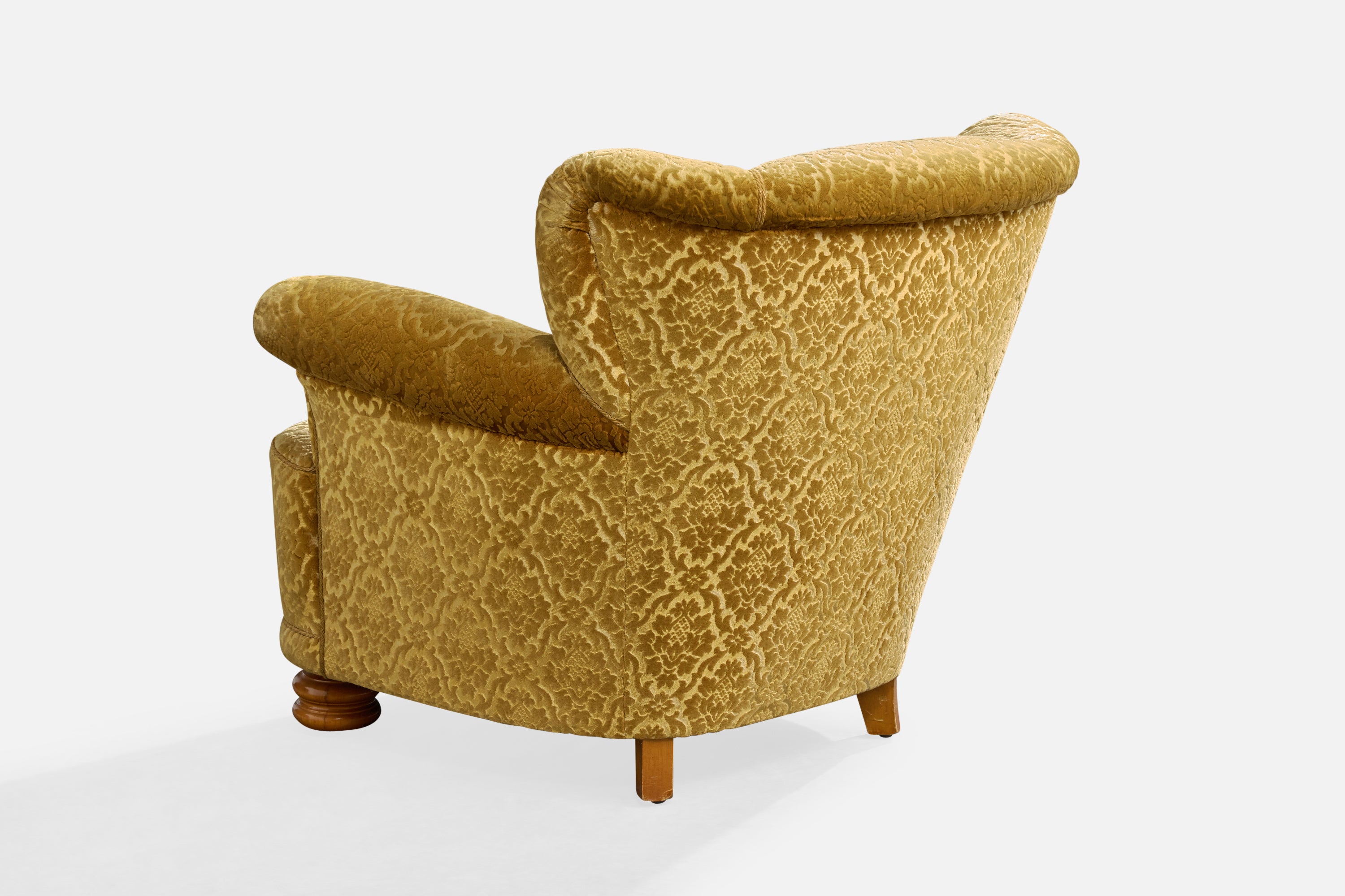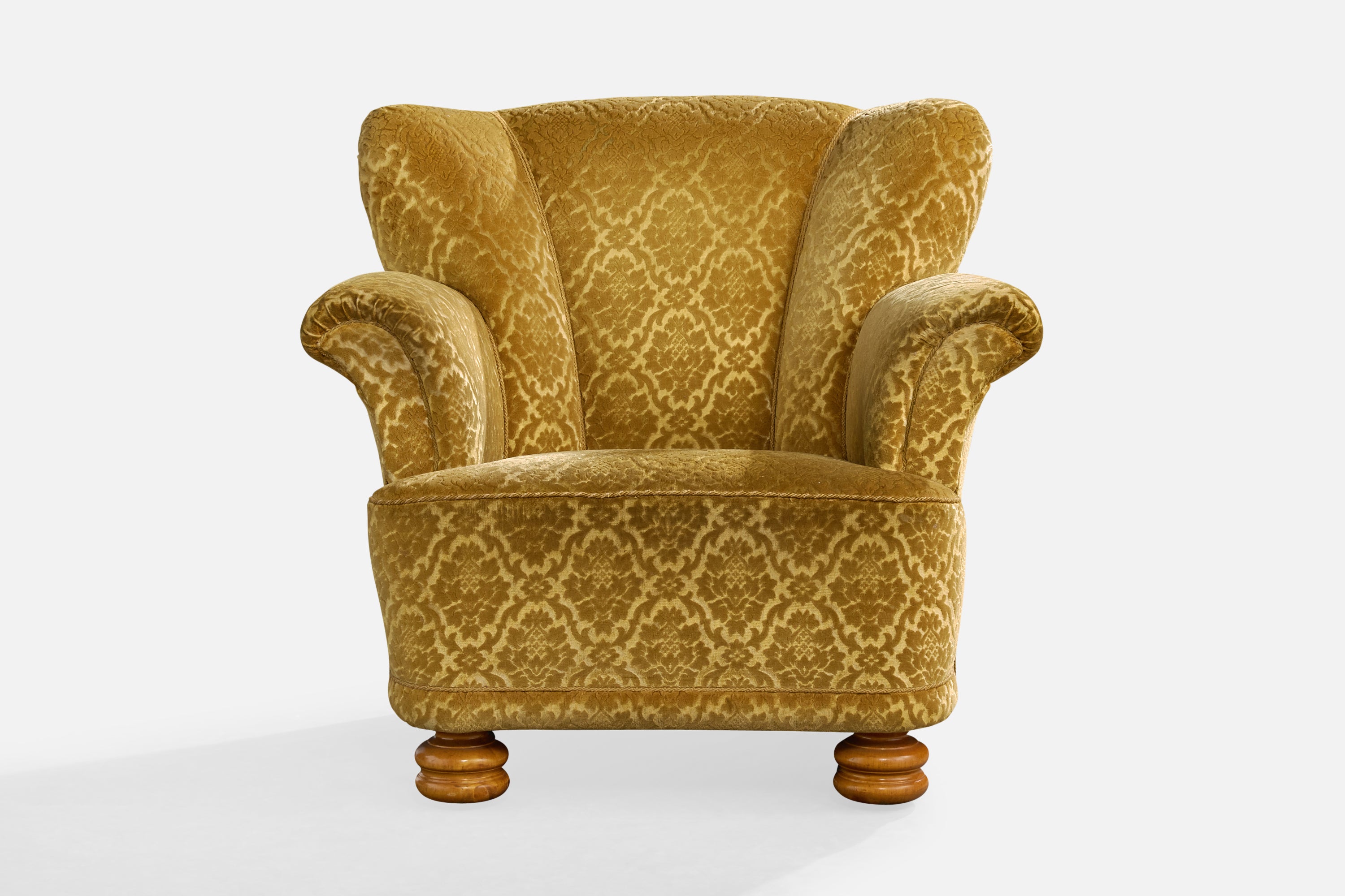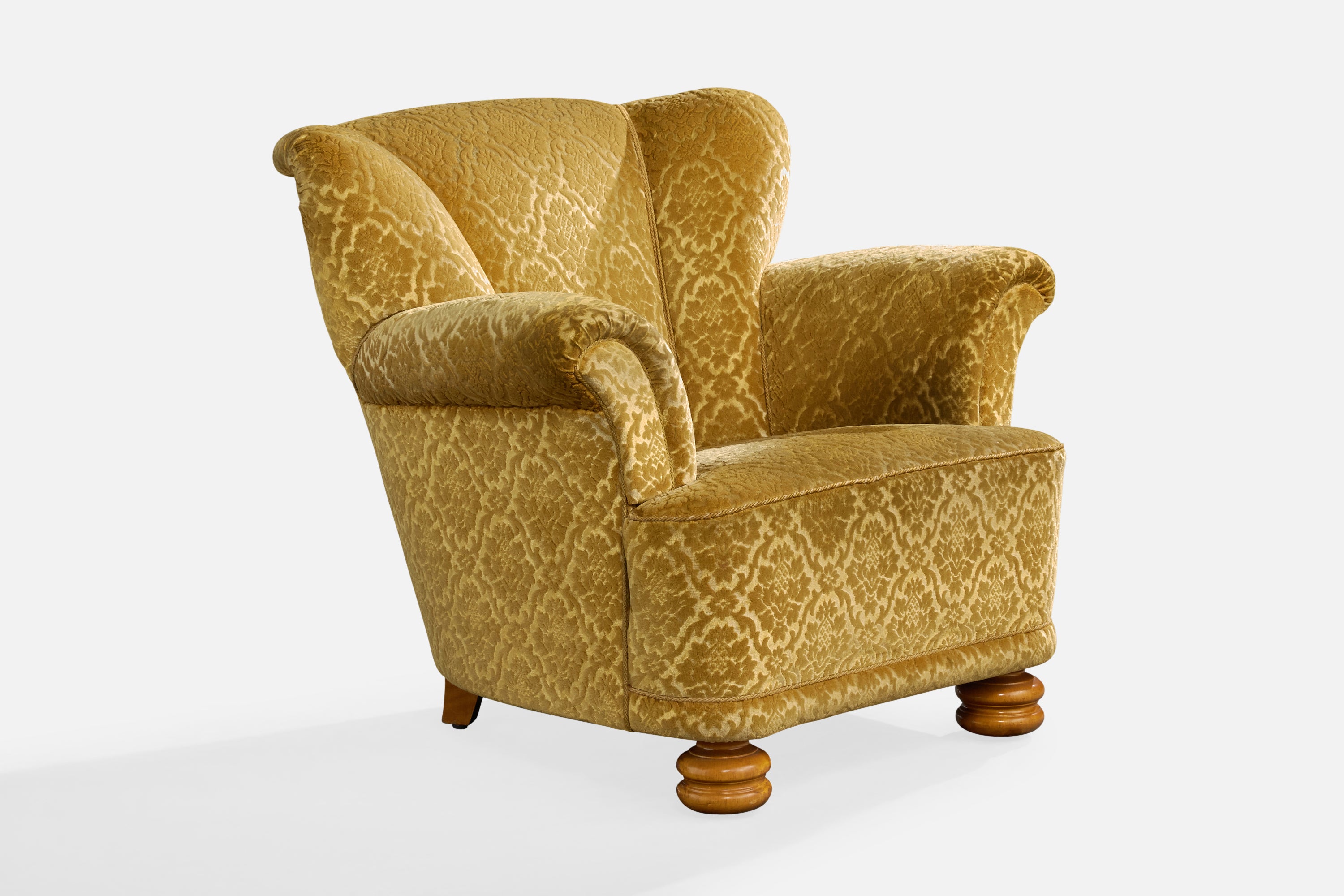 A wood and yellow velvet lounge chair designed and produced in Sweden, c. 1940s.