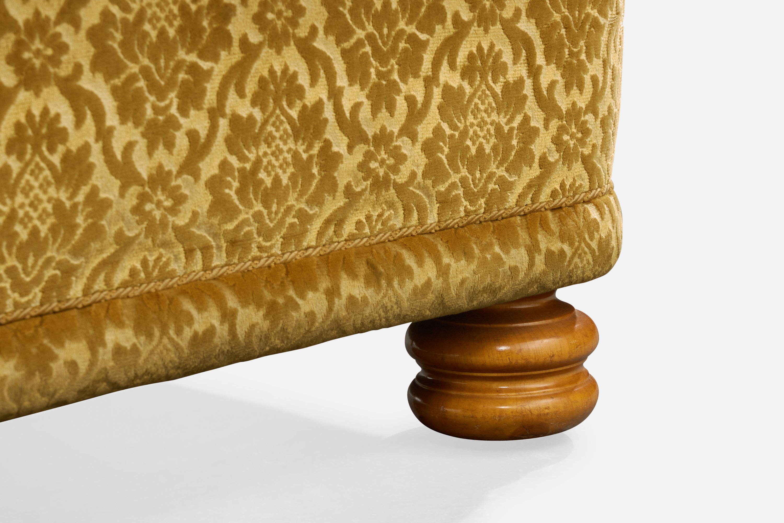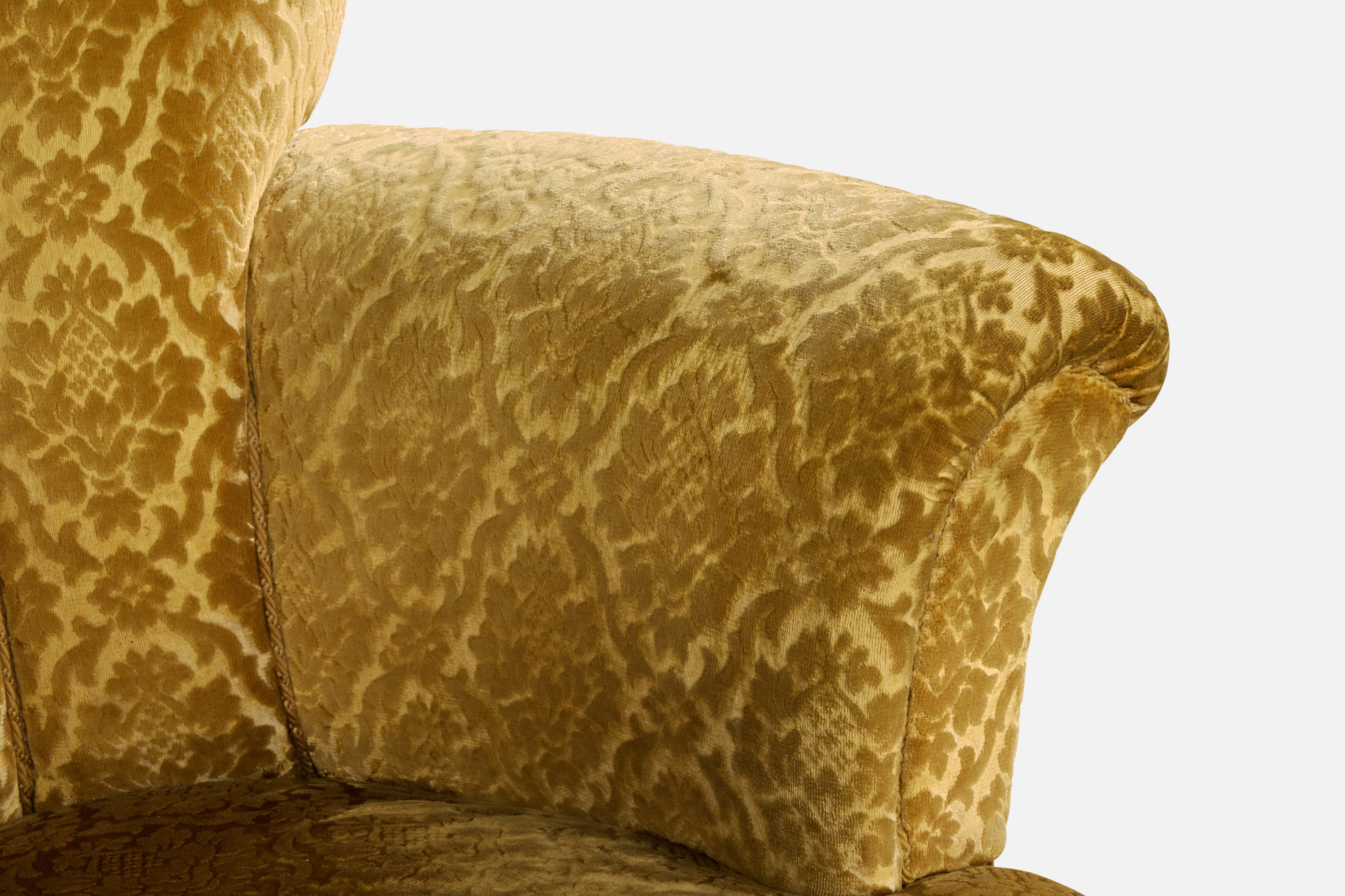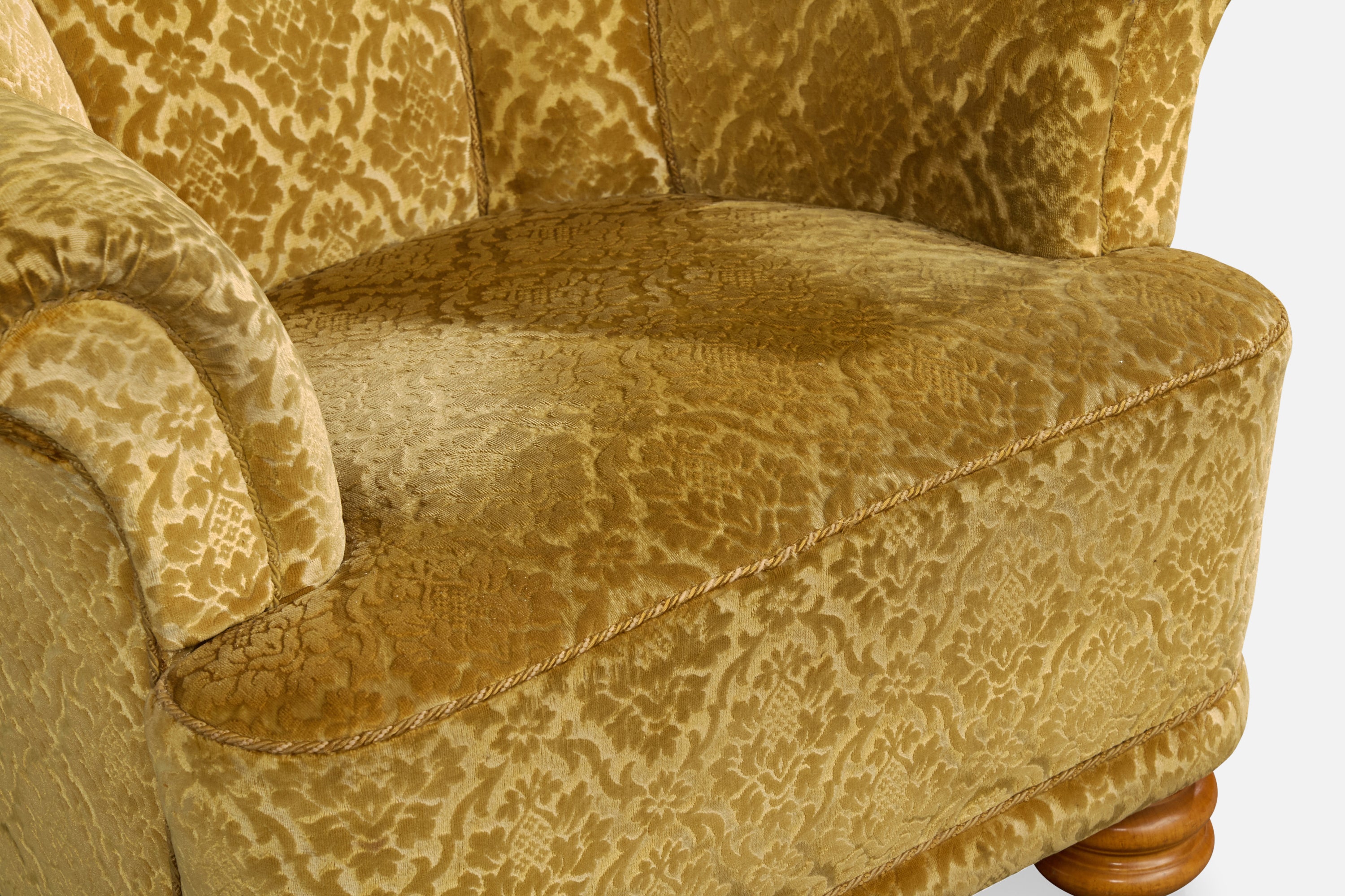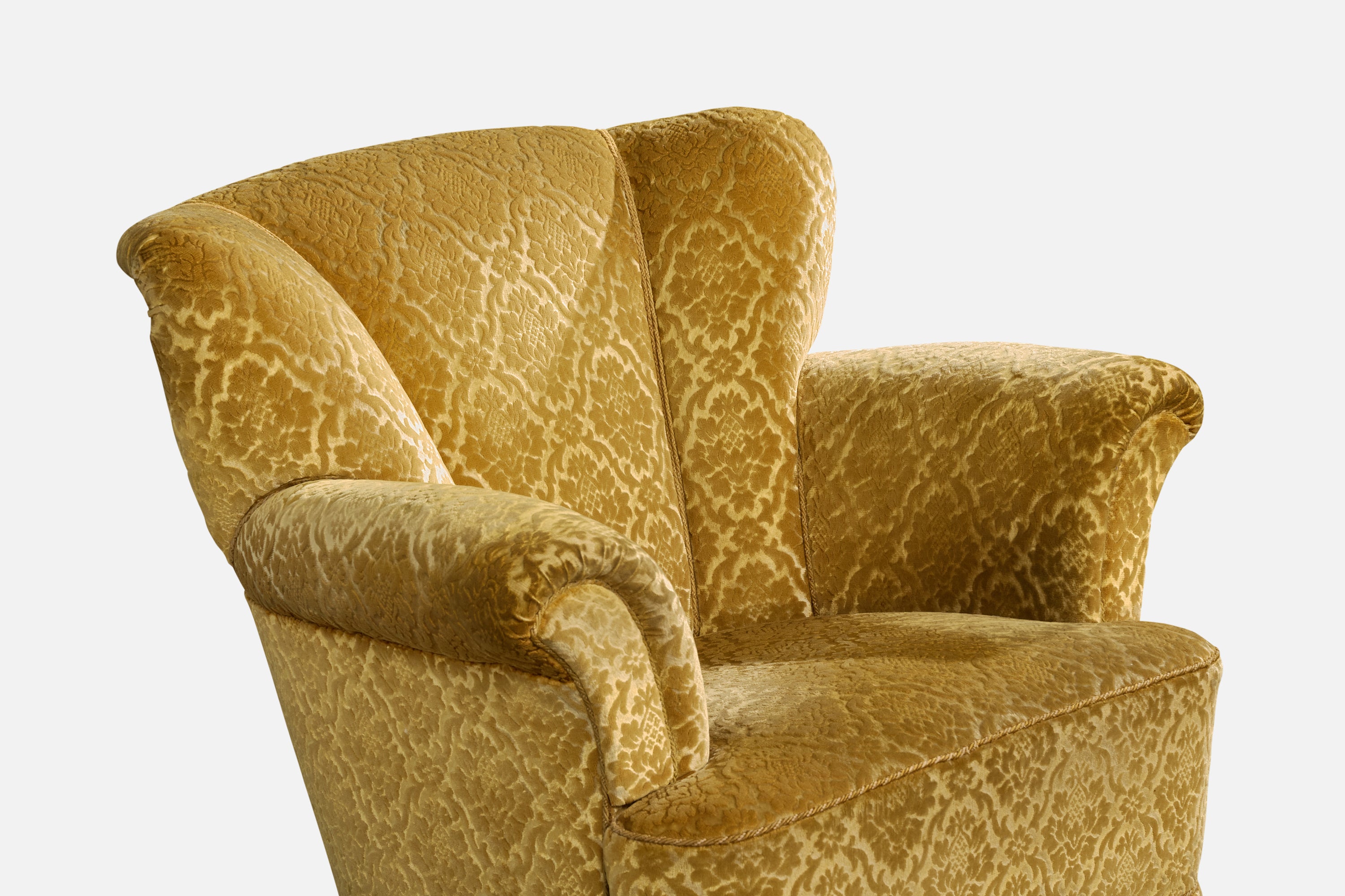 A wood and yellow velvet lounge chair designed and produced in Sweden, c. 1940s.