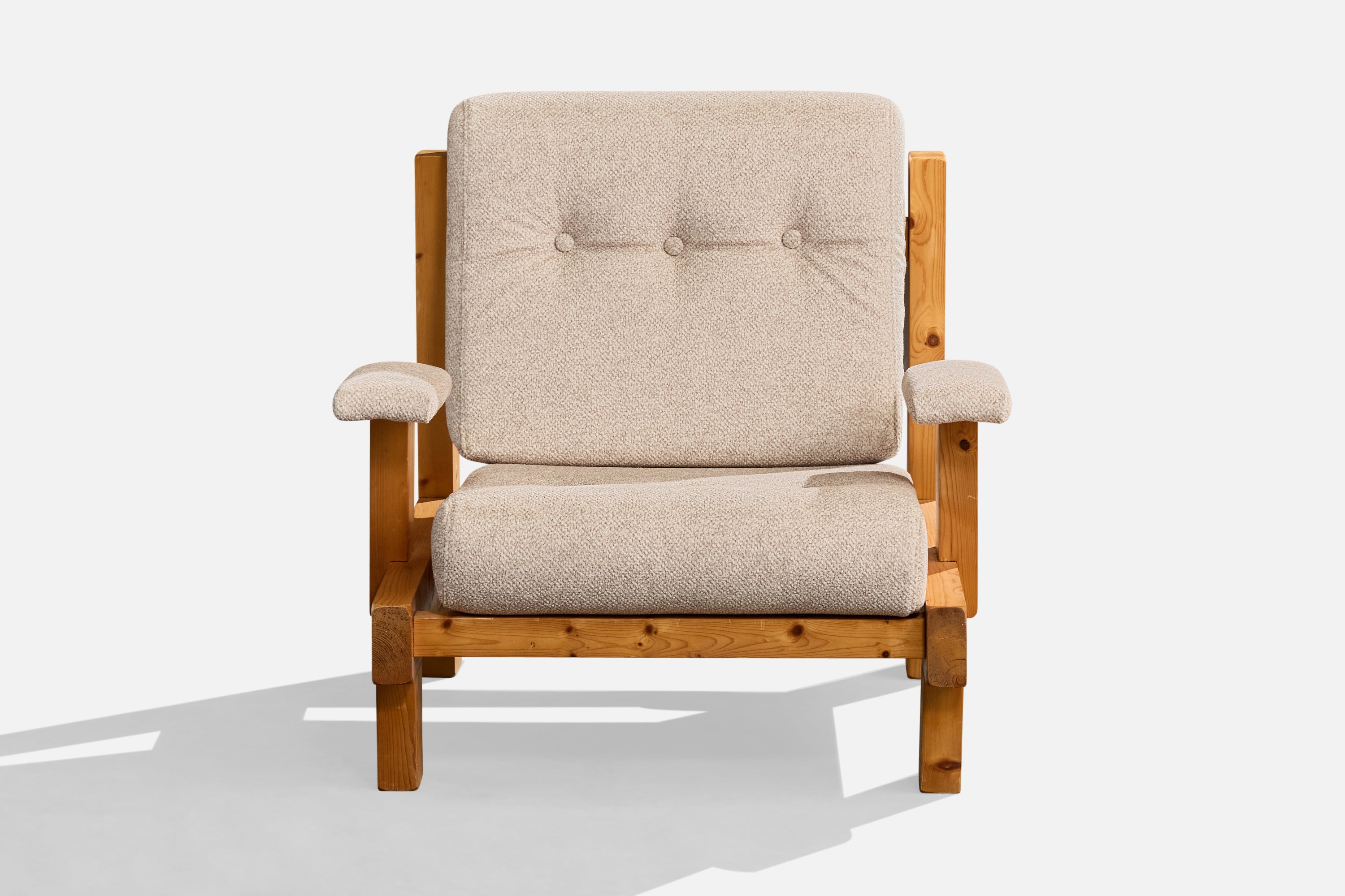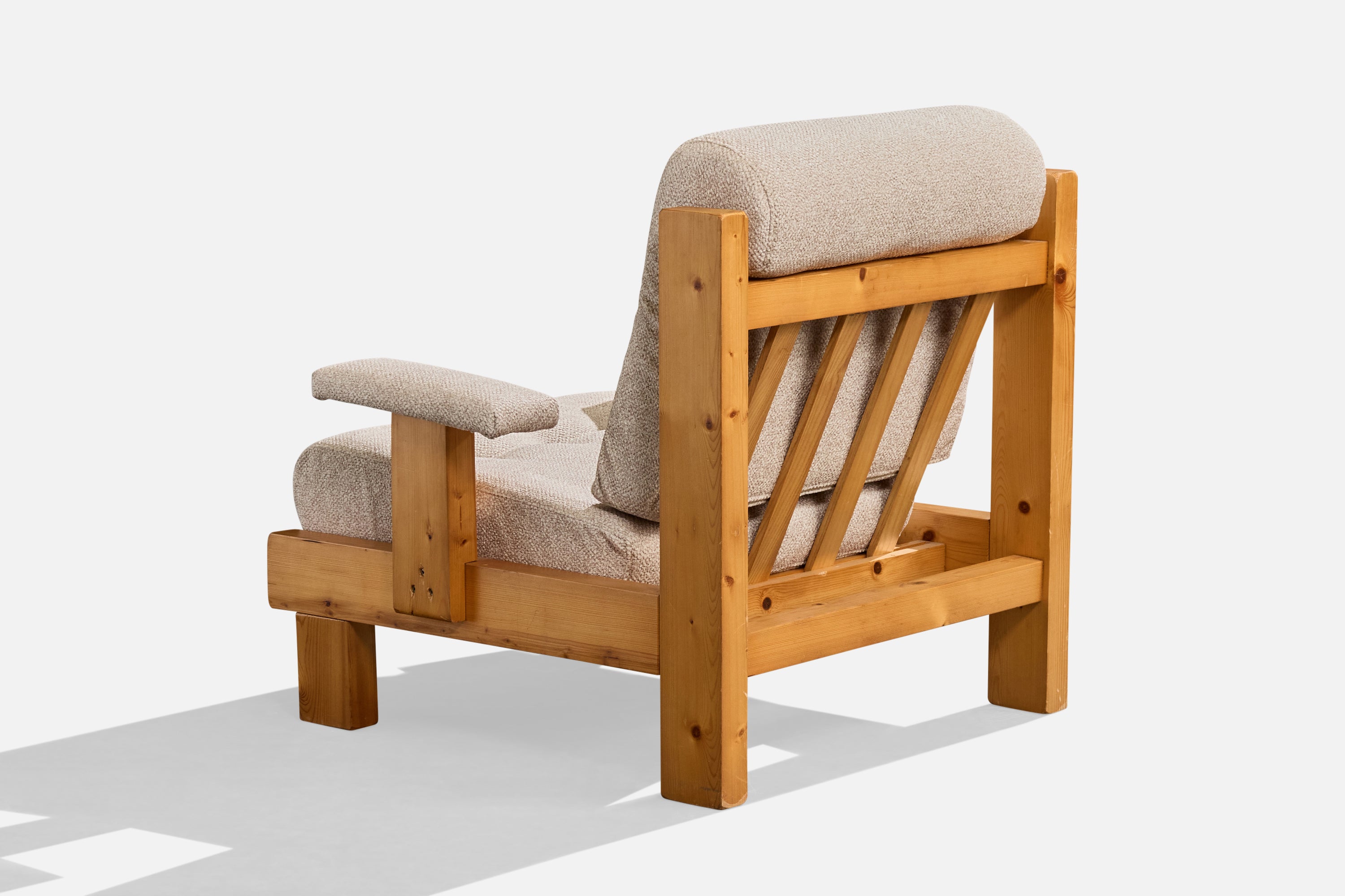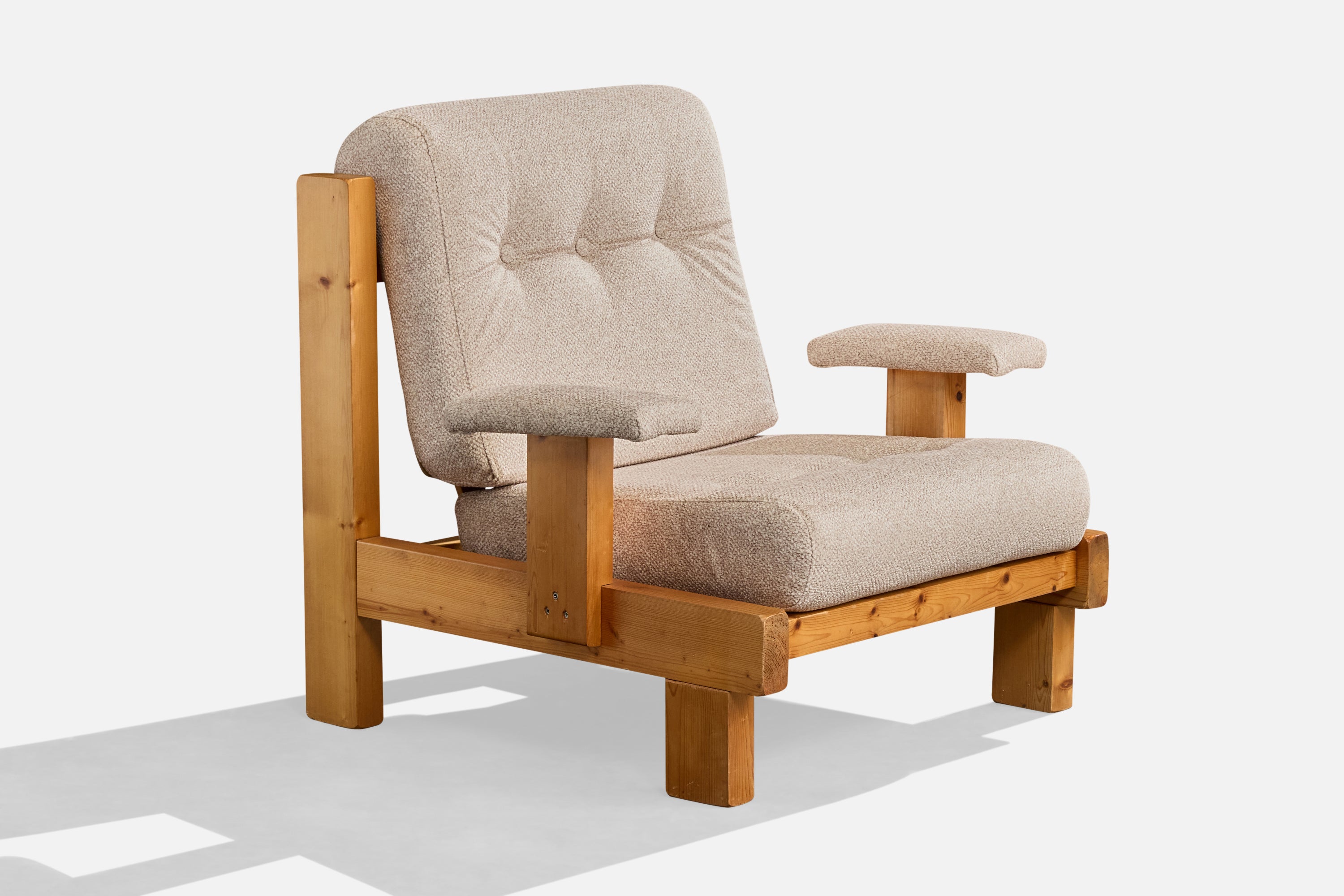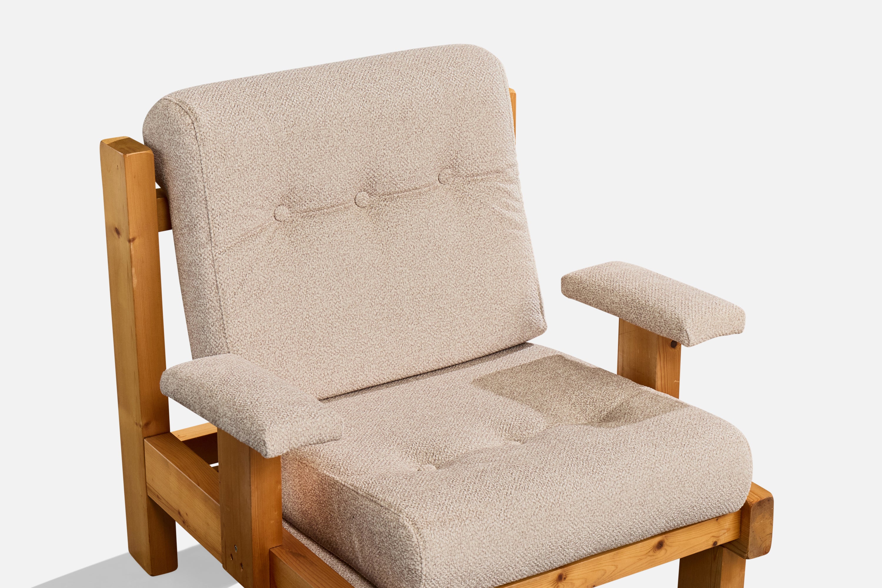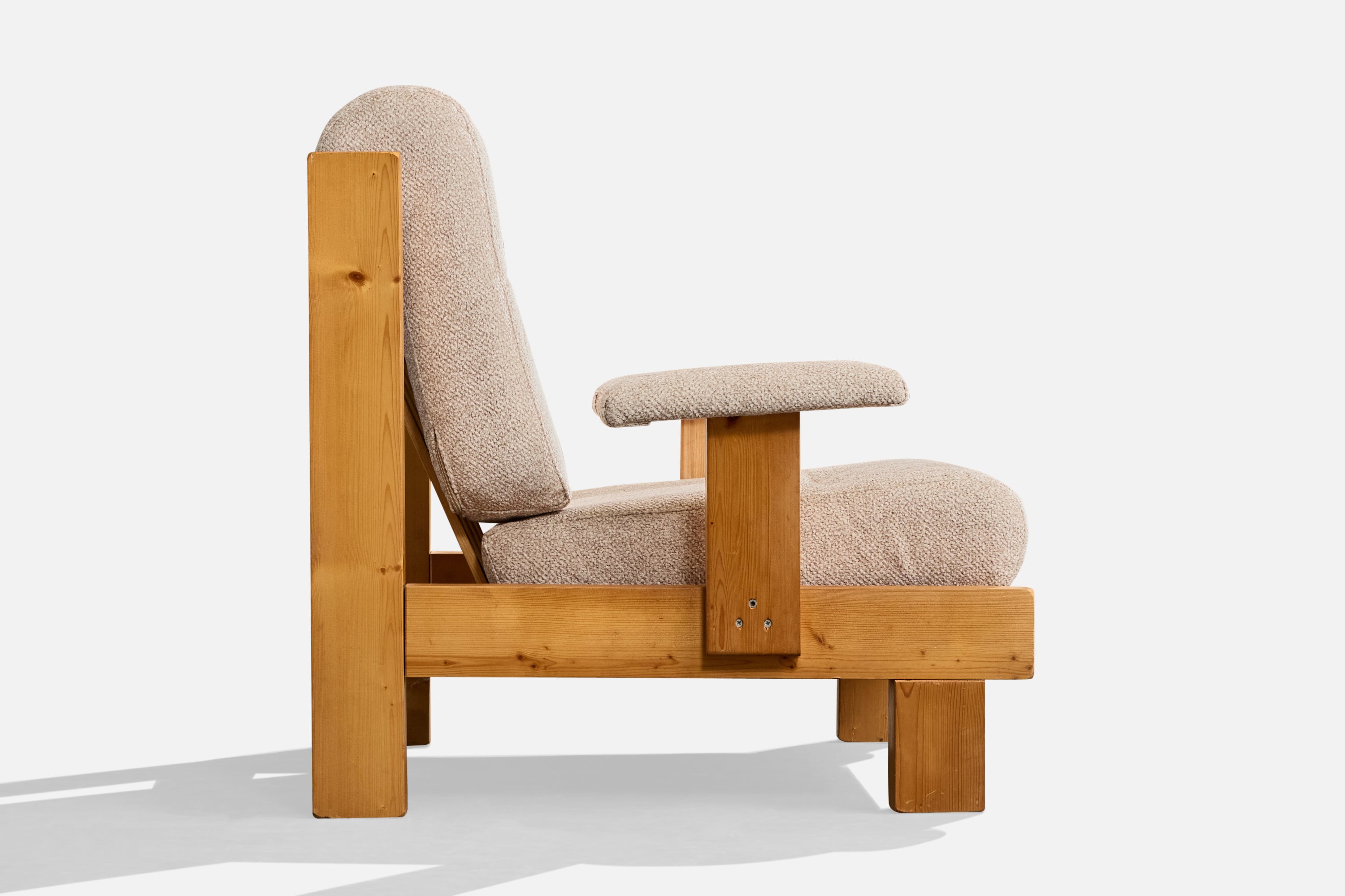 A pine and off-white fabric lounge chair likely designed and produced in France, c. 1980s.