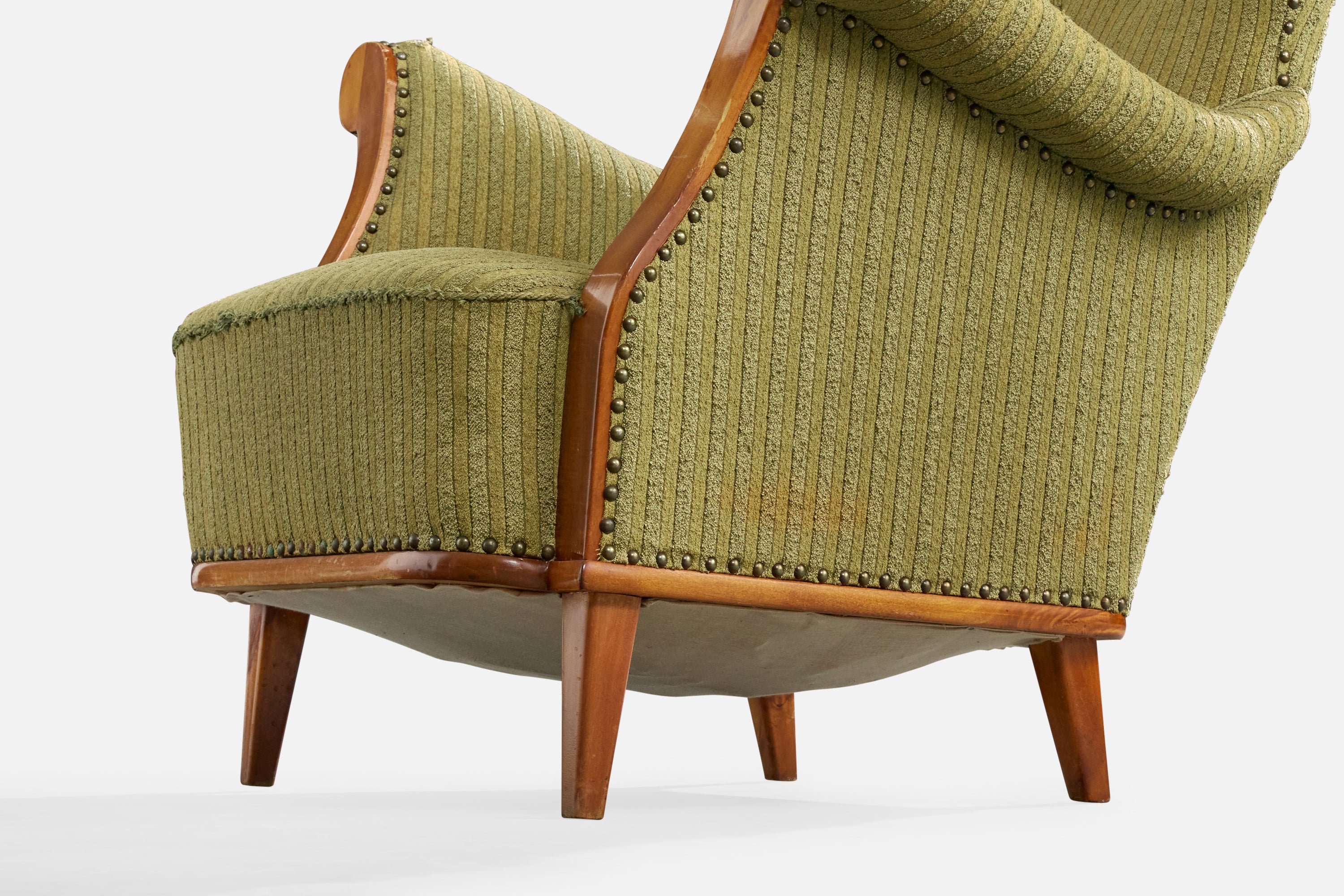 A green fabric and beech lounge chair designed and produced in Denmark, c. 1940s.