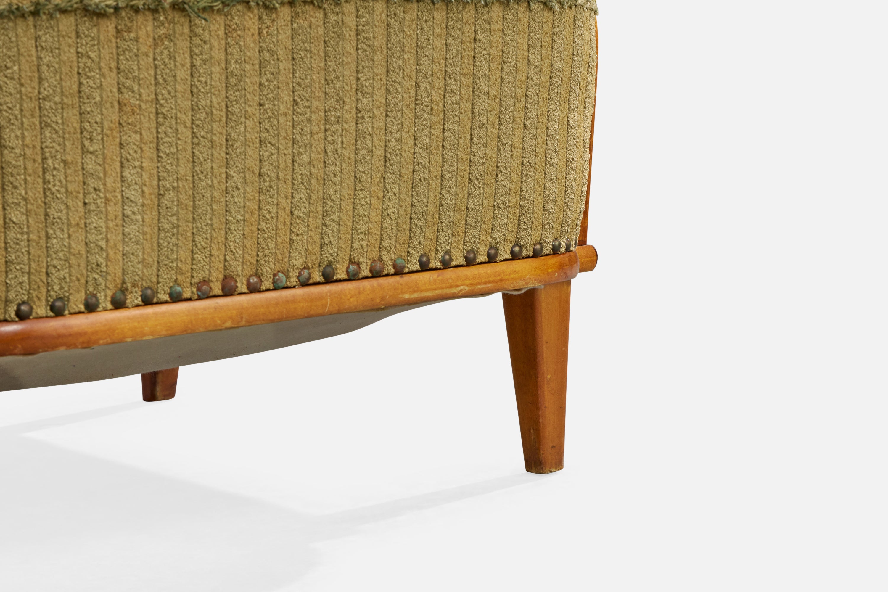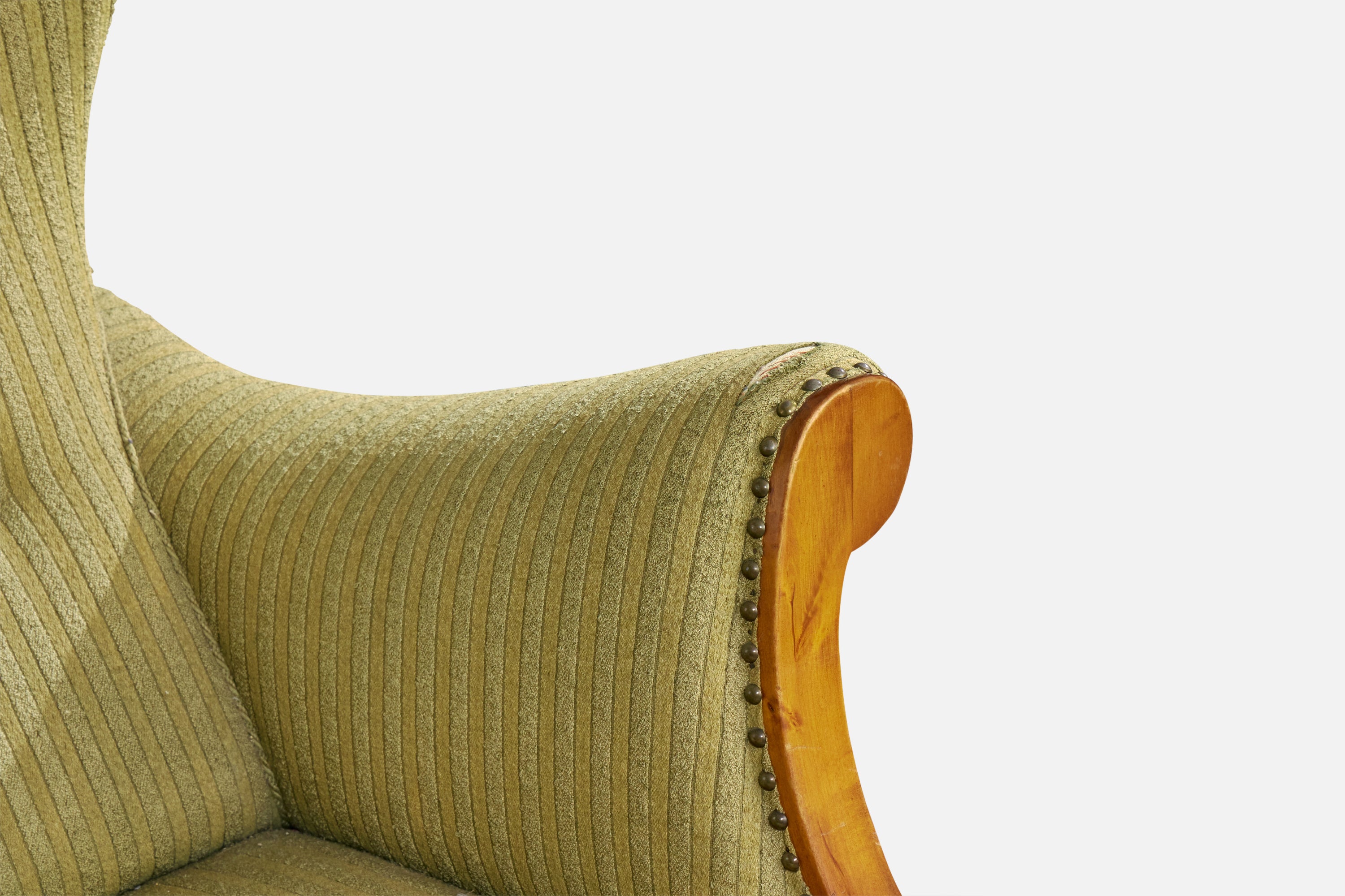 Fabric on both arms distressed. Patina on brass tufting, including some tarnished. Wear consistent with age and use.