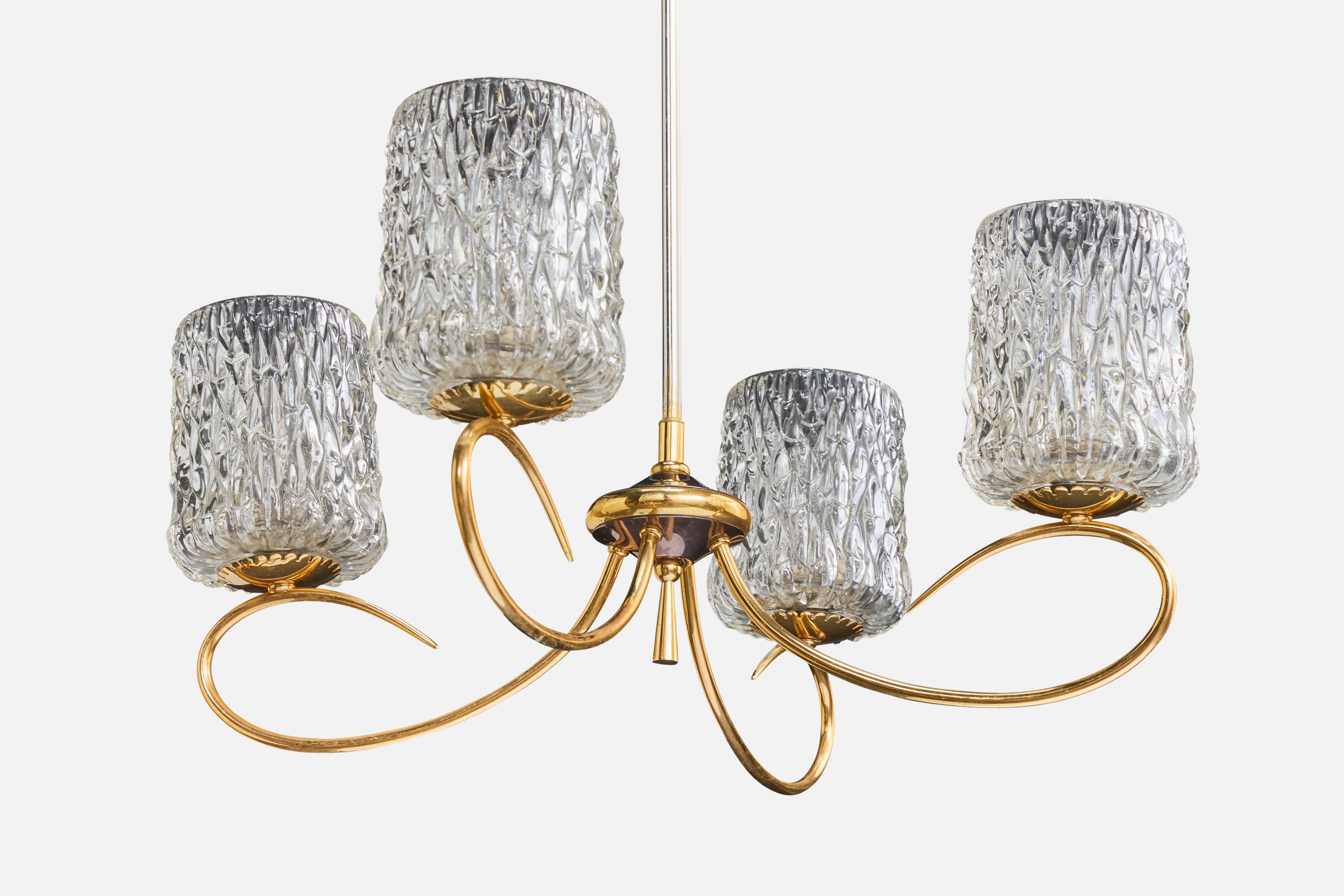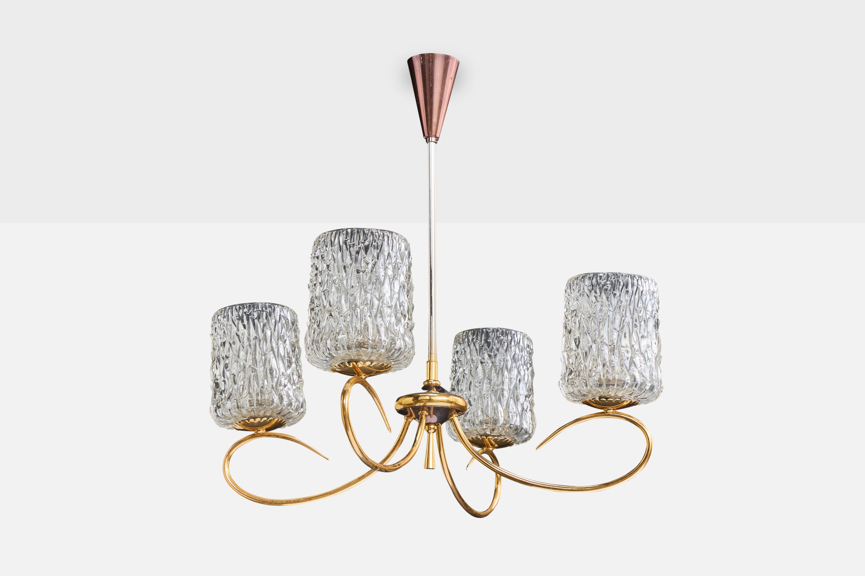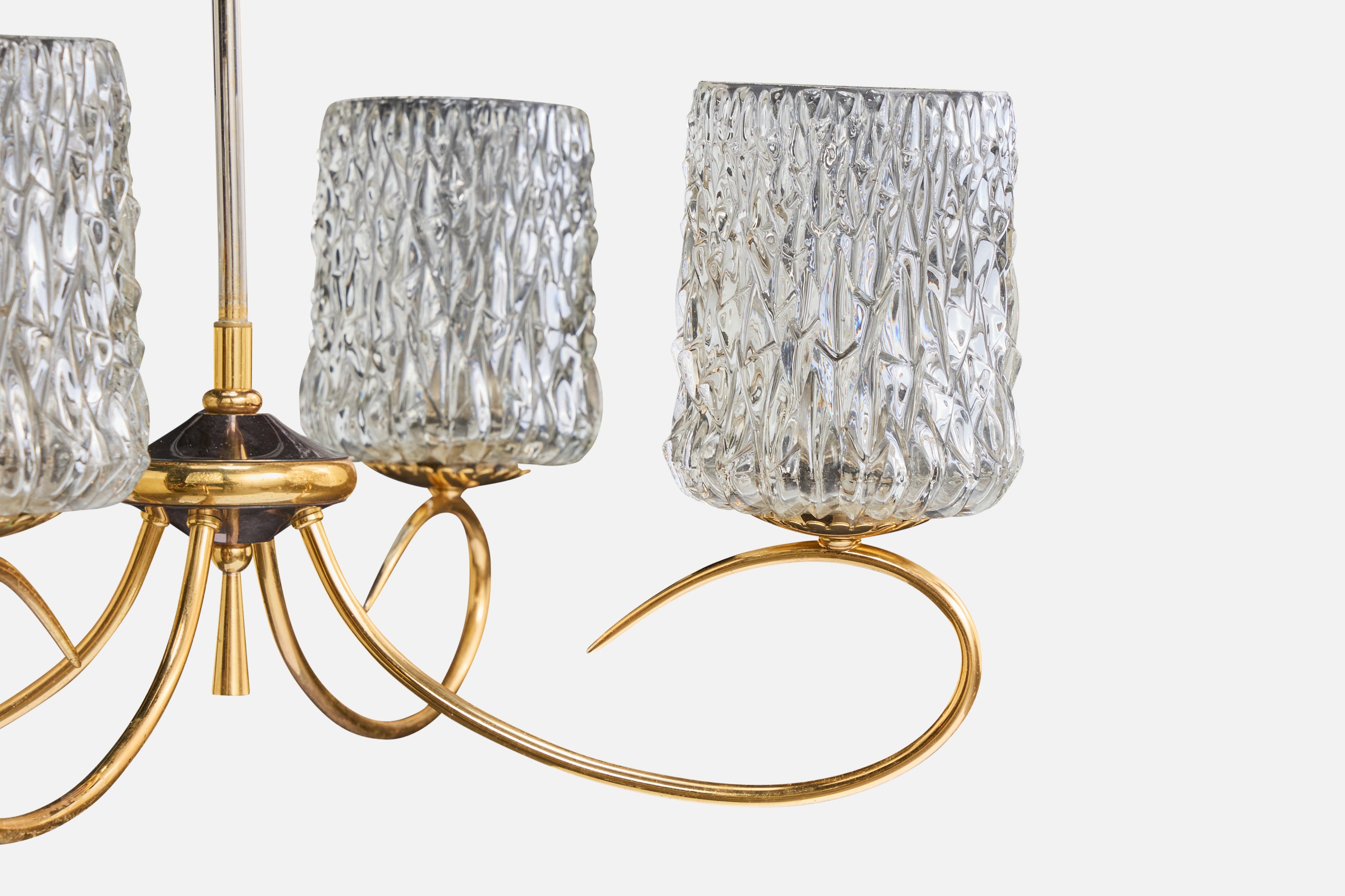 French Designer, Chandelier, Brass, Metal, Glass, France, 1950s