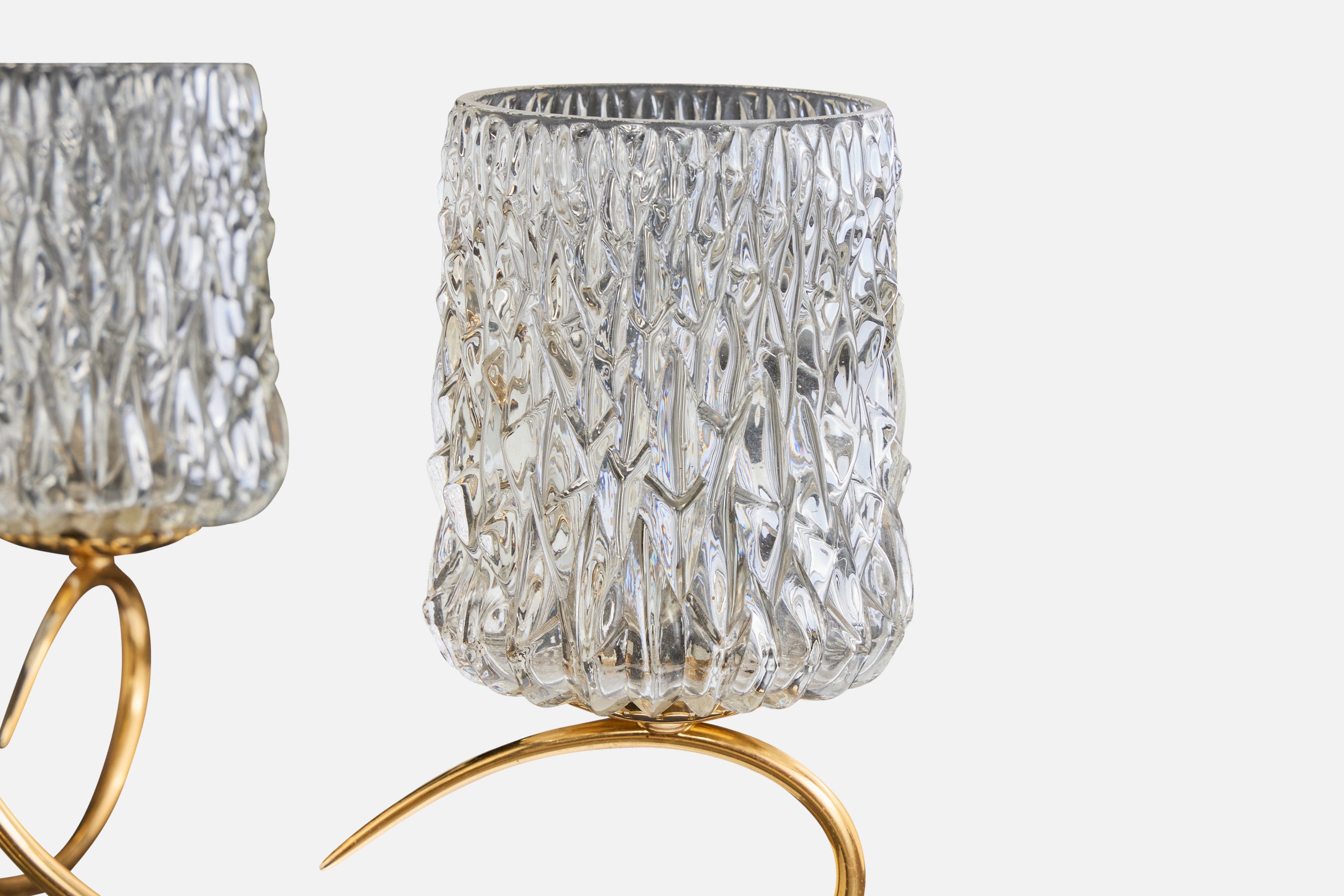 A brass, metal and glass chandelier designed and produced in France, c. 1950s.