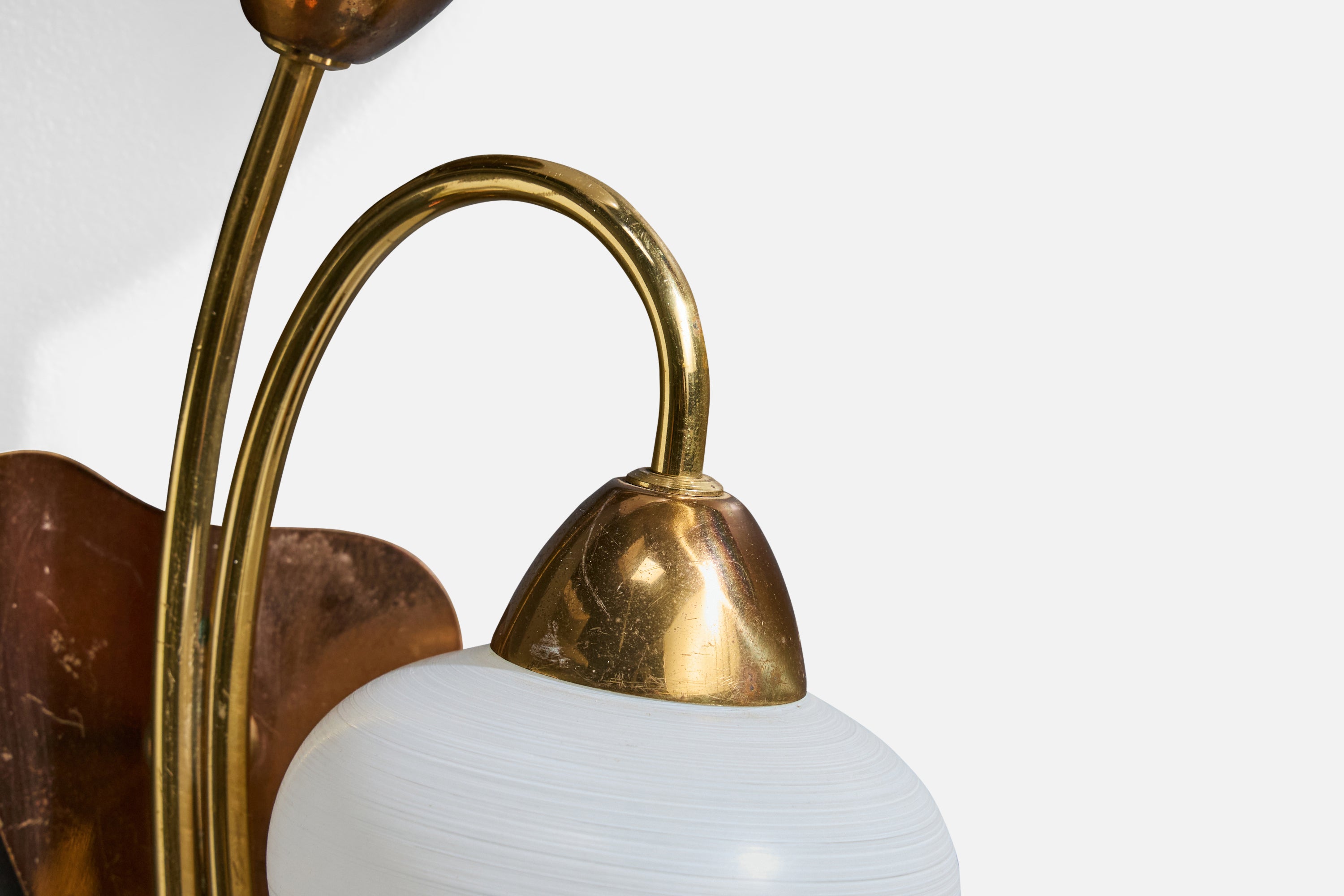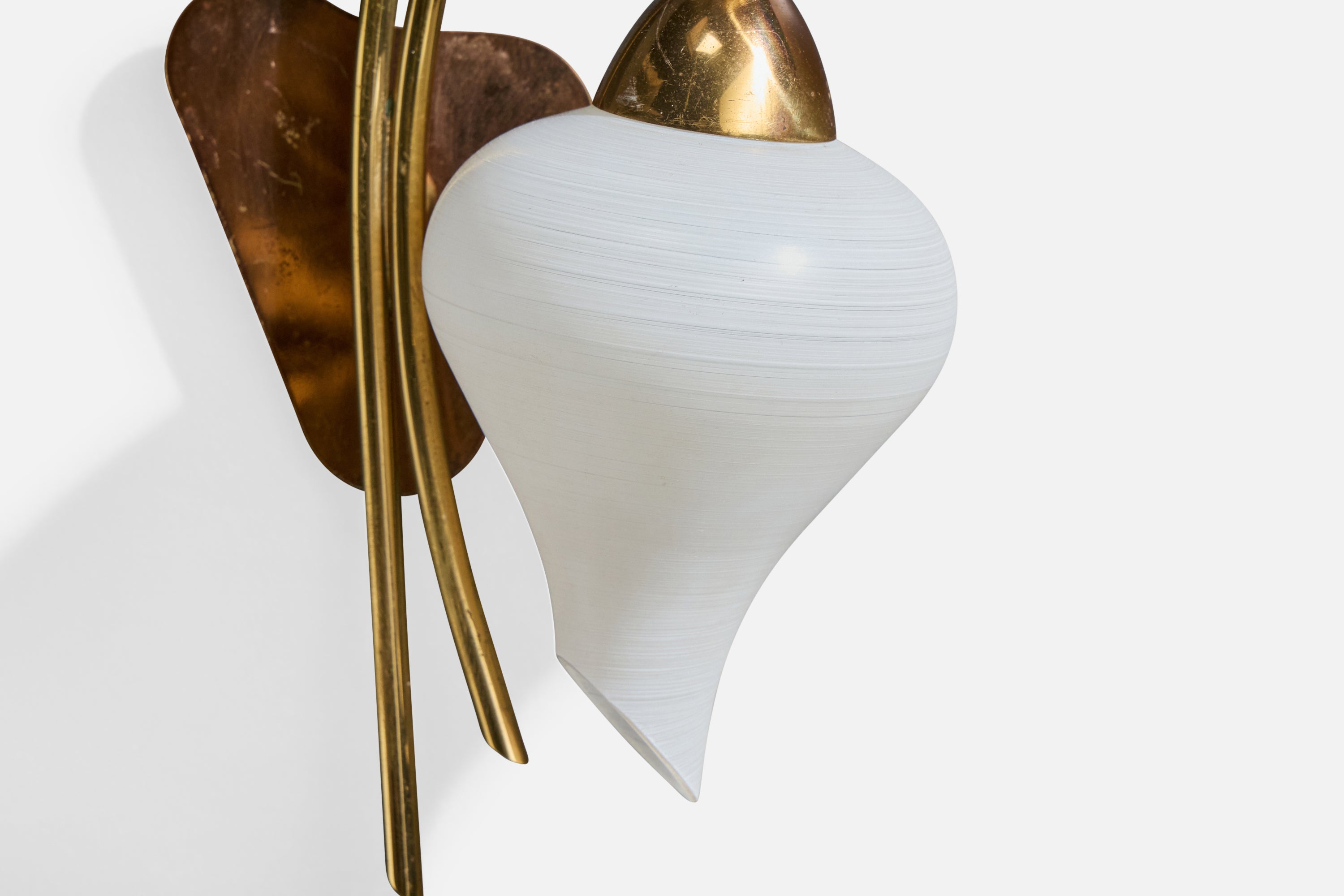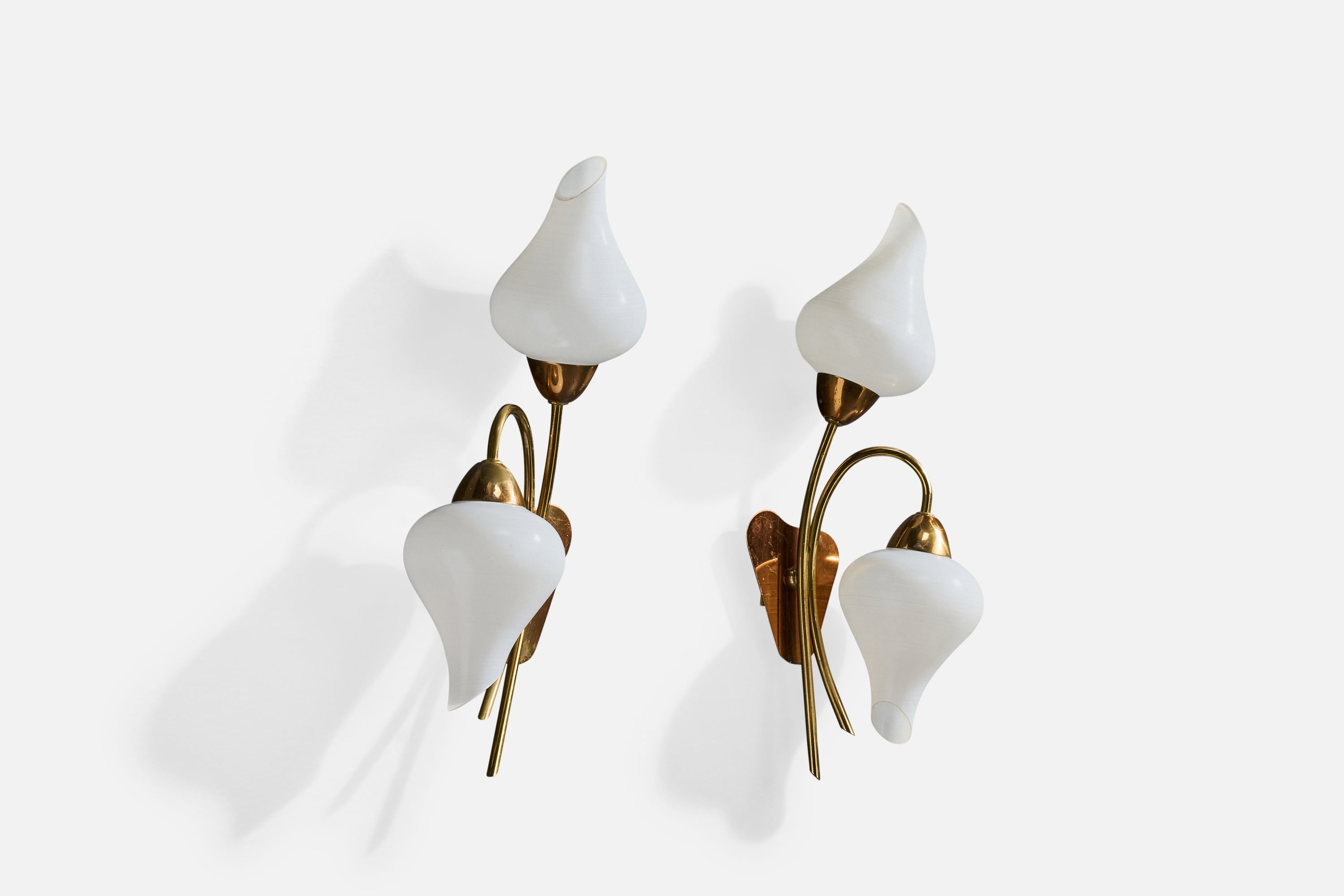 A pair of brass and white opaline glass wall lights designed and produced in France, c. 1950s.
