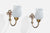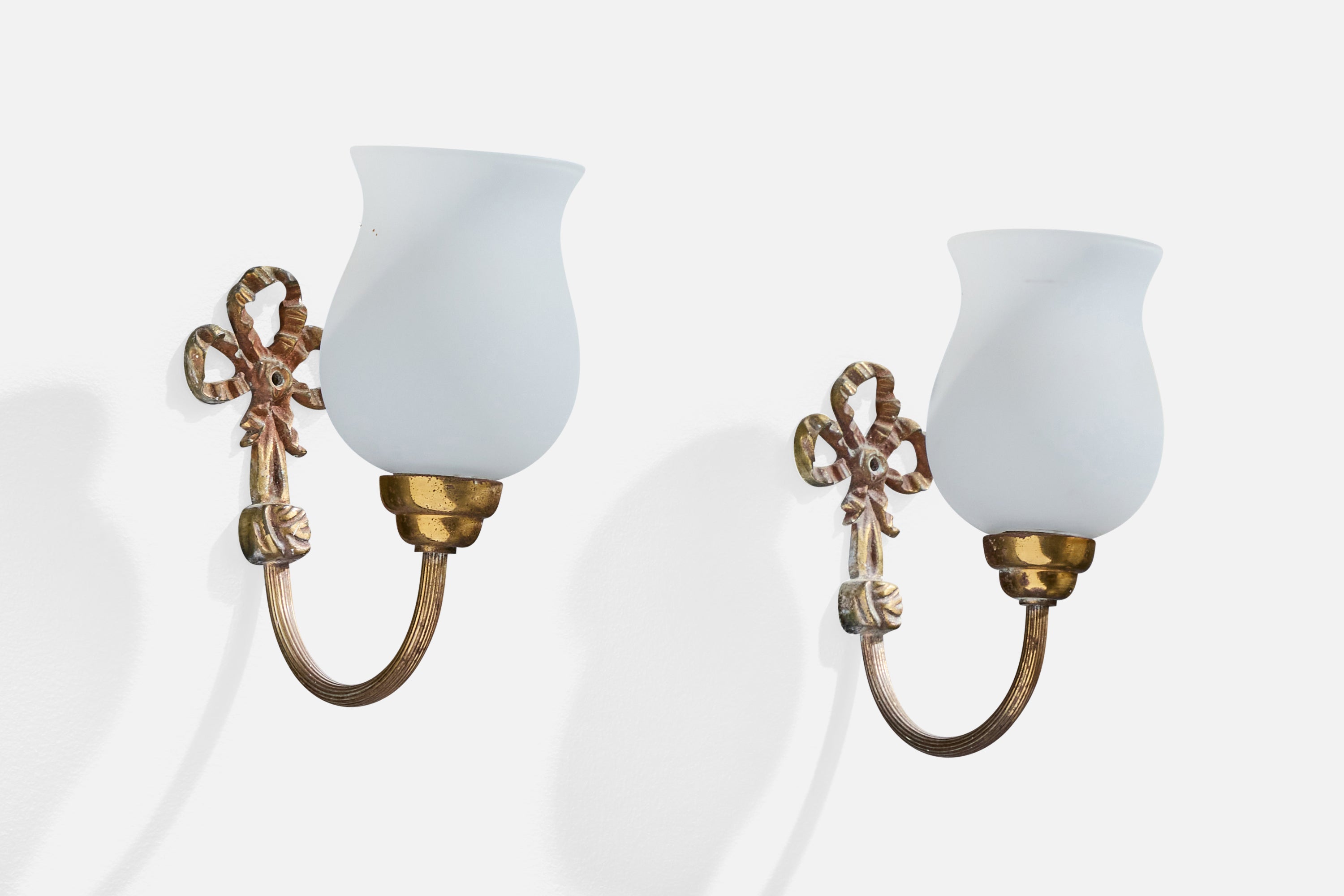 A pair of brass and white opaline glass wall lights designed and produced in France, c. 1950s.
