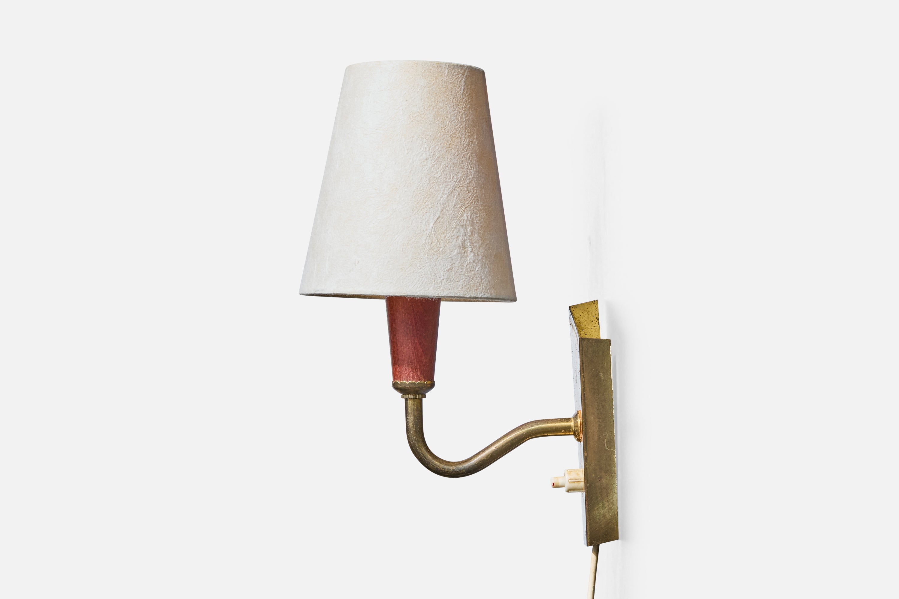 A pair of brass, teak and off-white parchment paper wall lights designed and produced in Denmark, c. 1950s.
