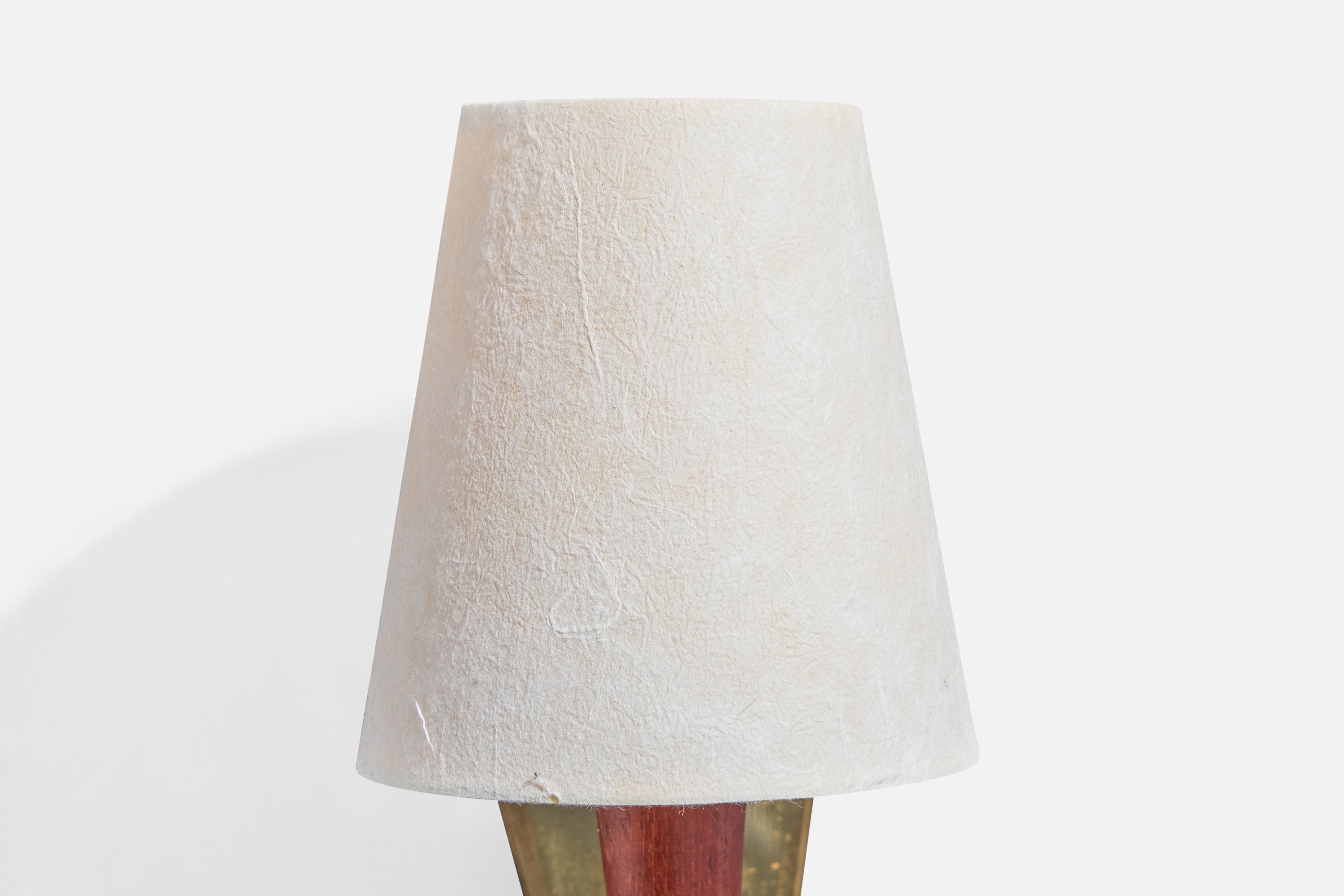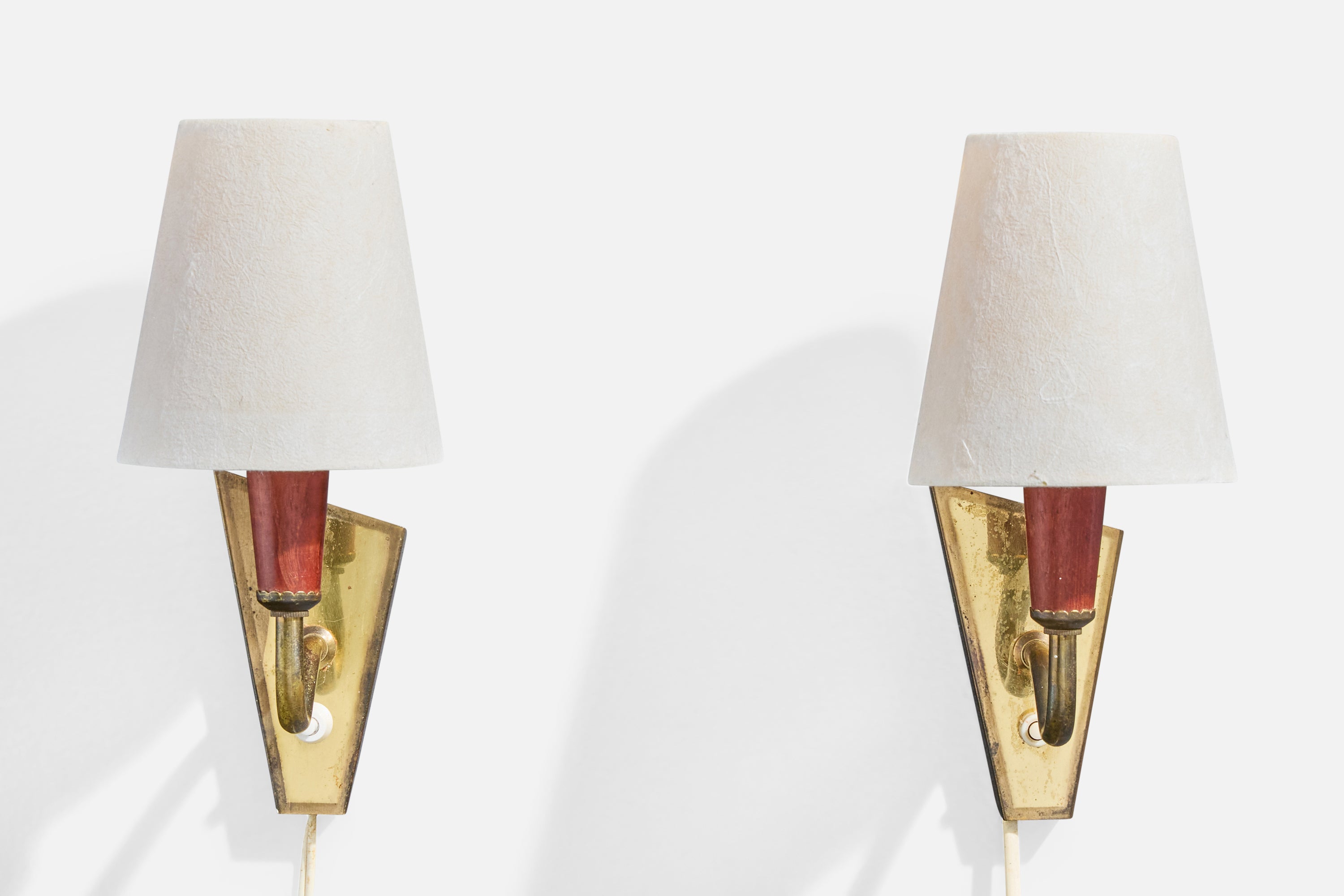 Danish Designer, Wall Lights, Brass, Teak, Parchment, Denmark, 1950s