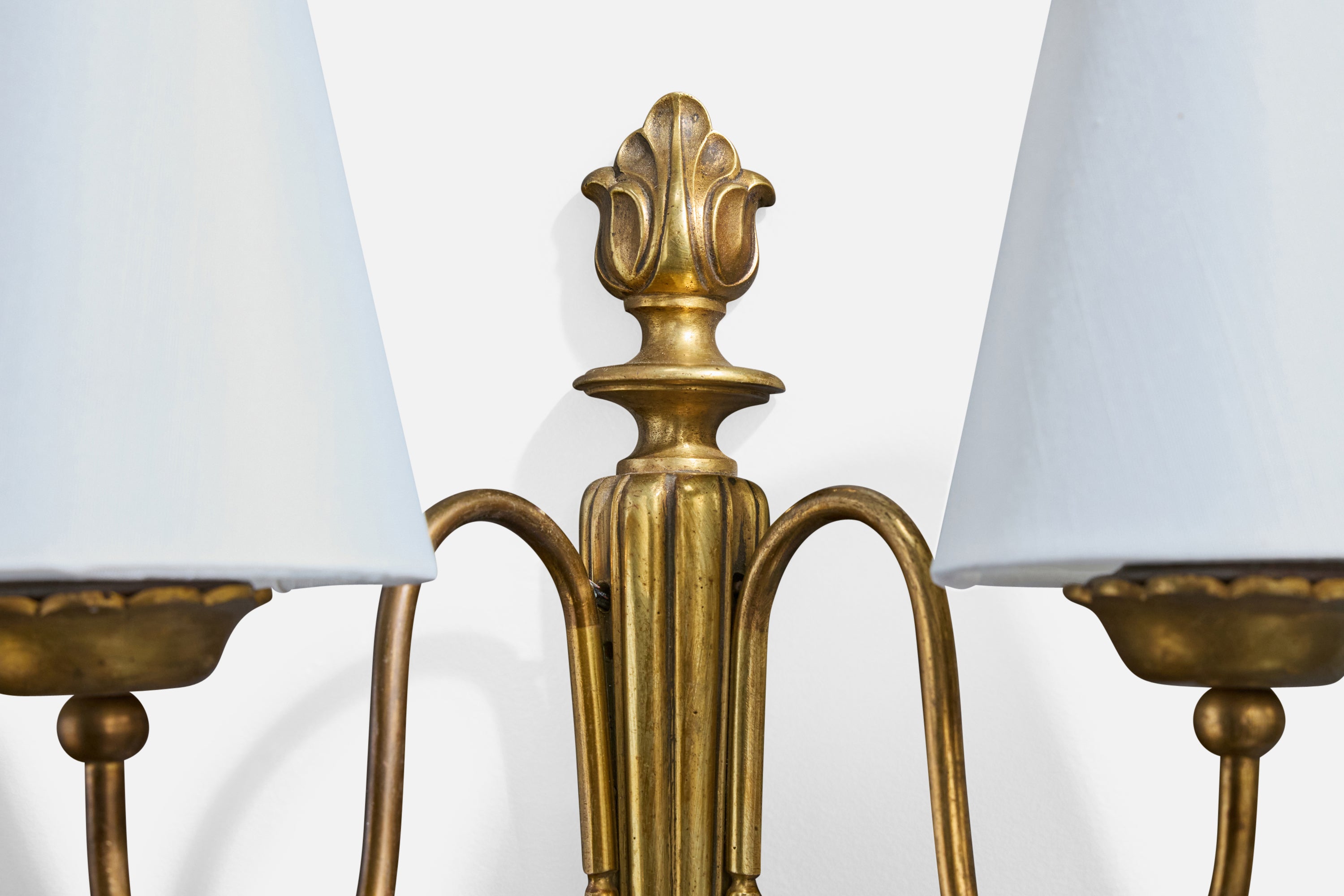 A pair of brass and white fabric wall lights likely designed and produced in France, c. 1940s.