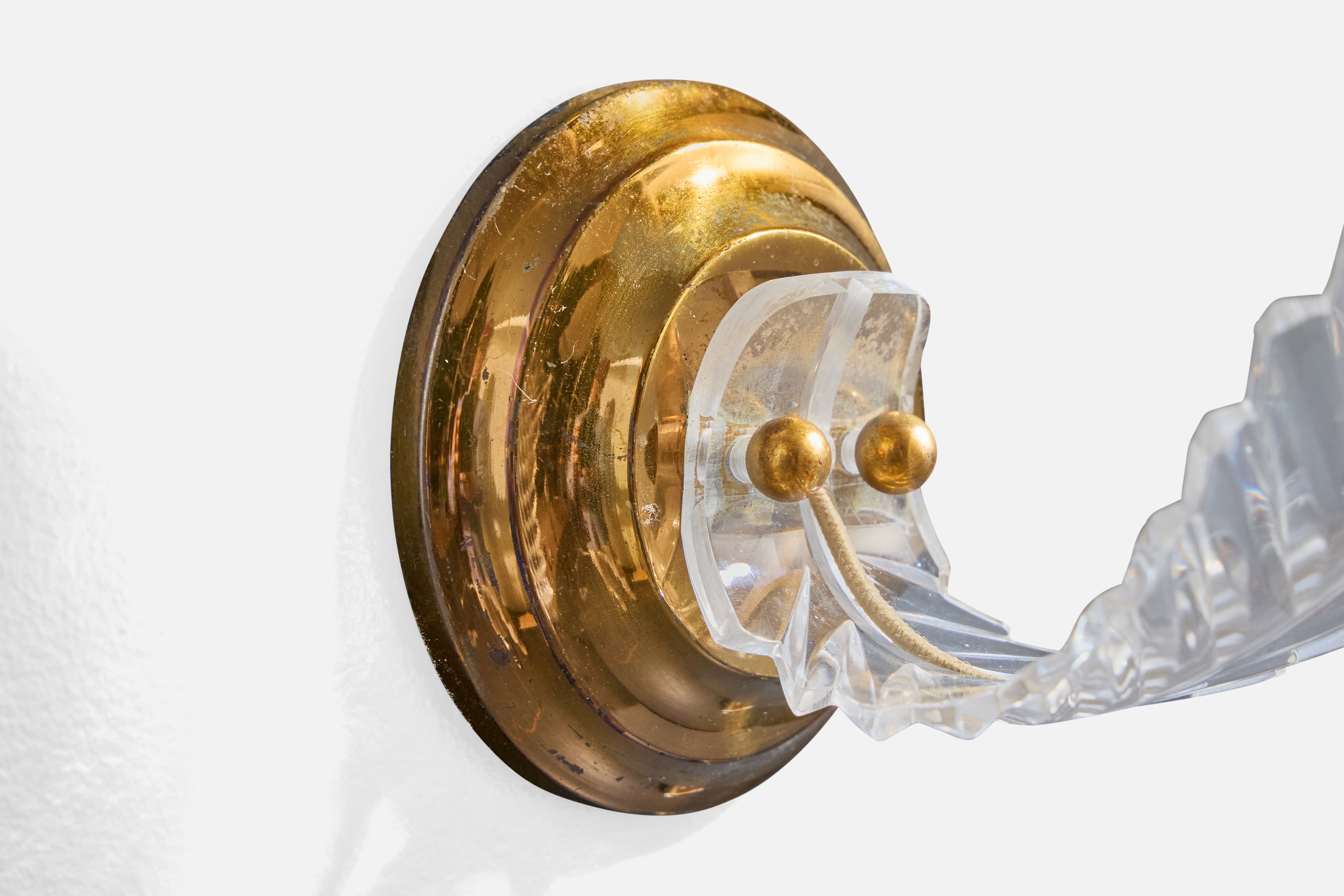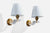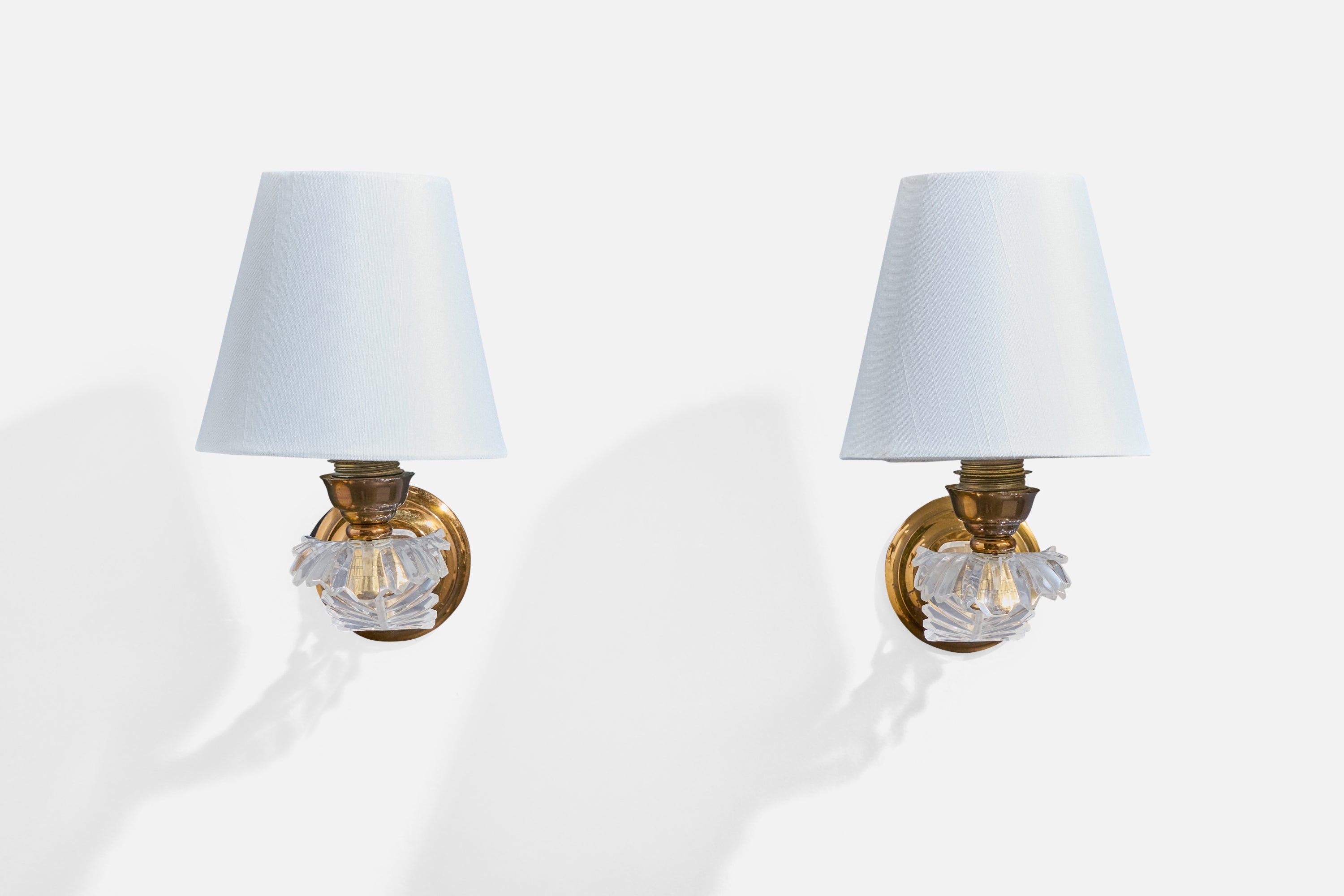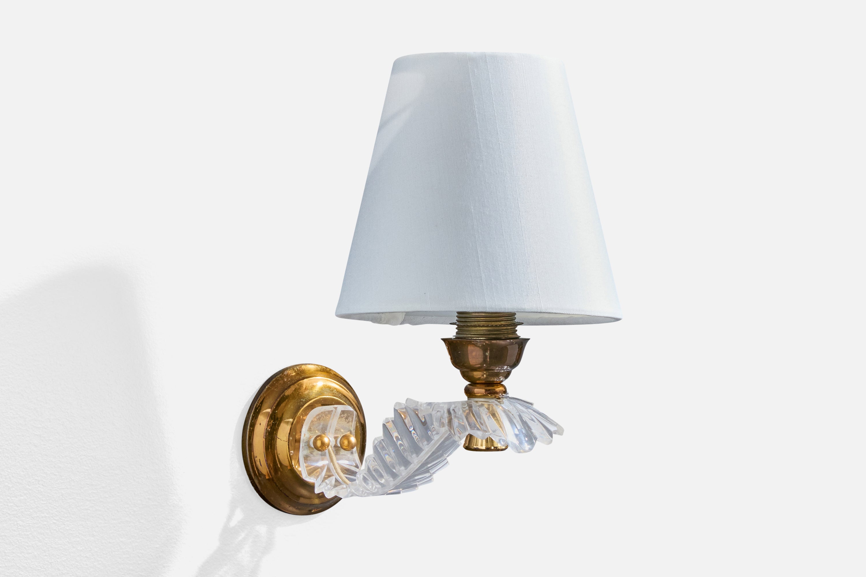 A pair of brass, plexiglass and white fabric wall lights designed and produced in France, c. 1950s.