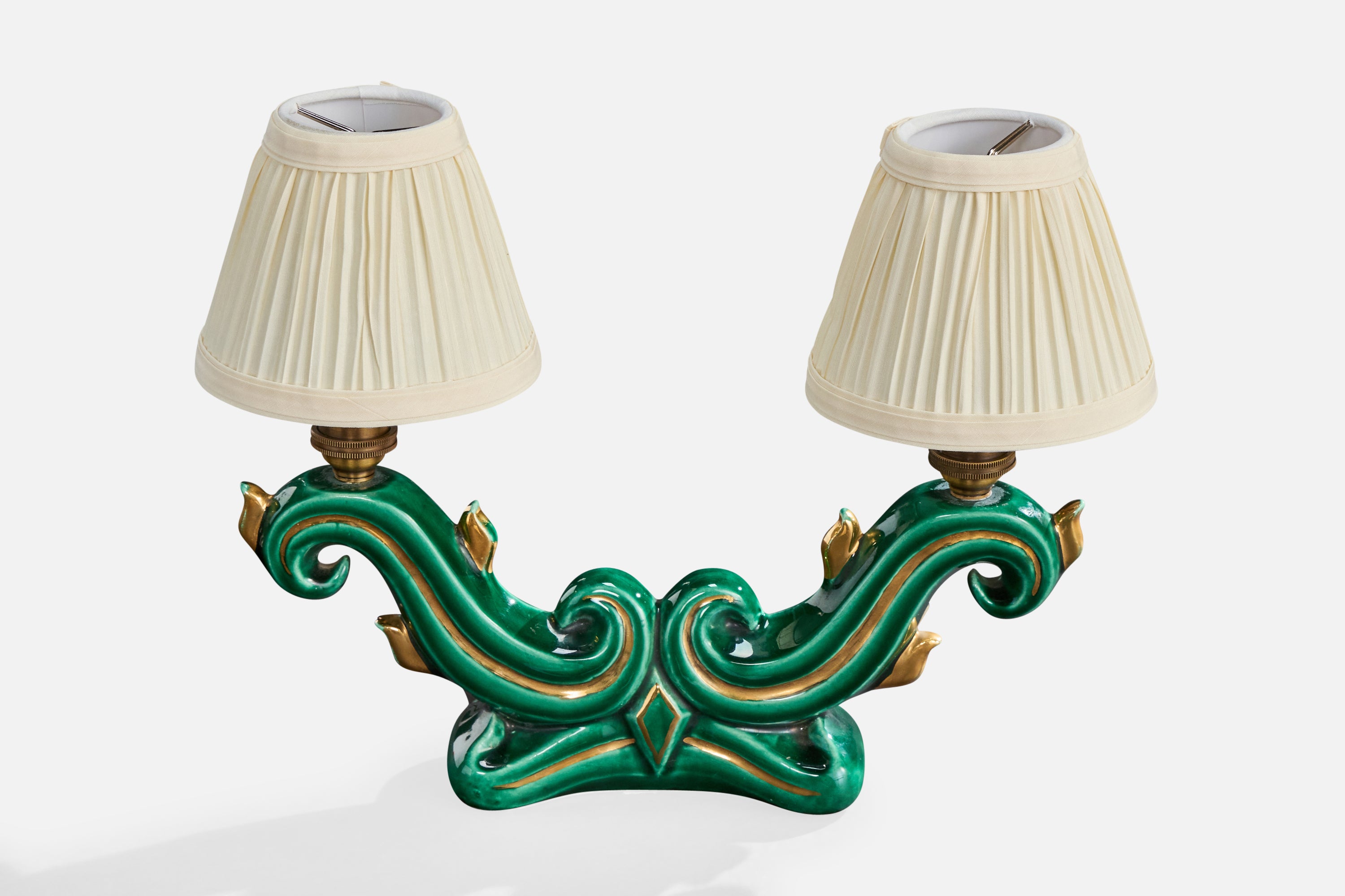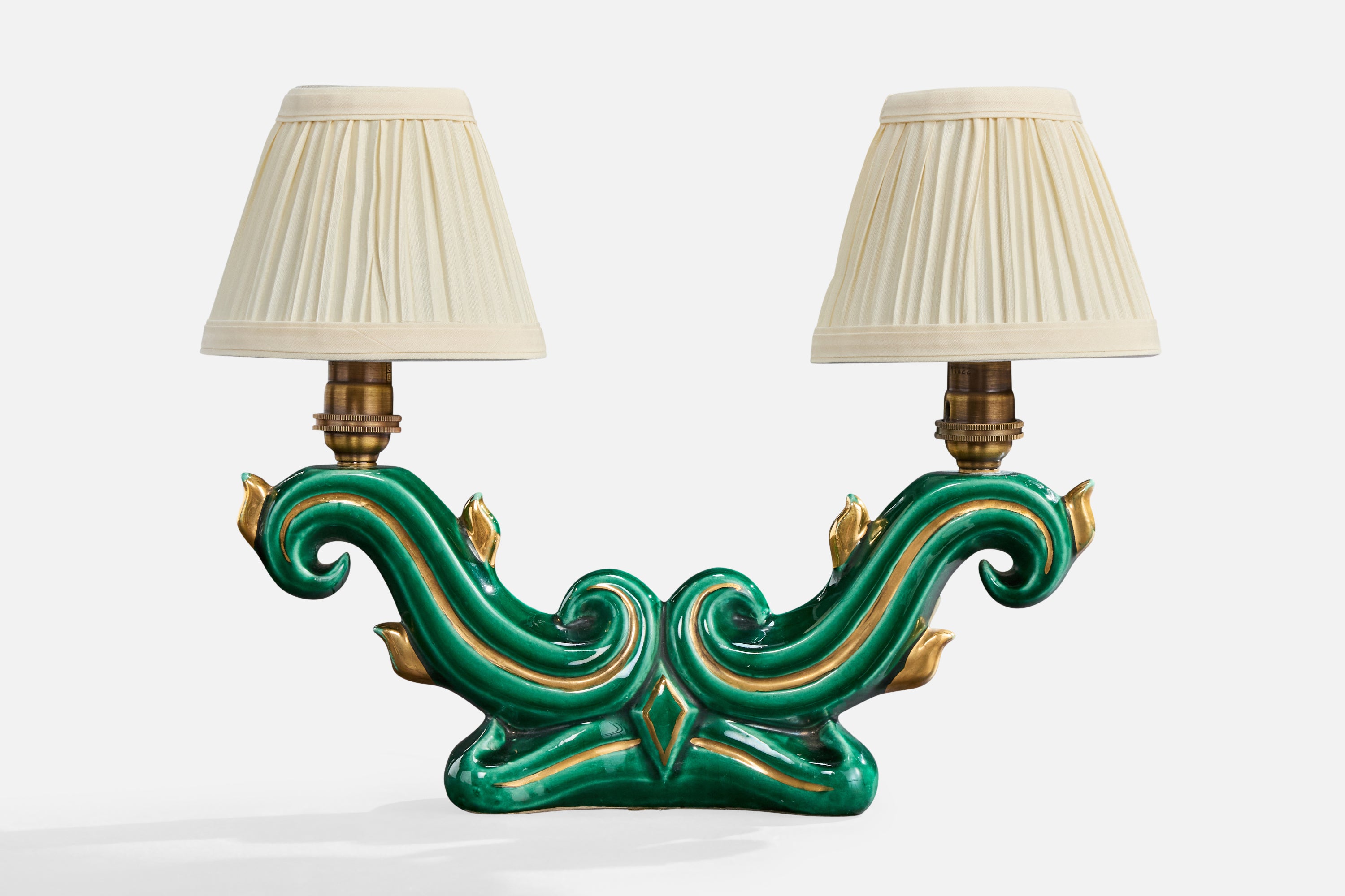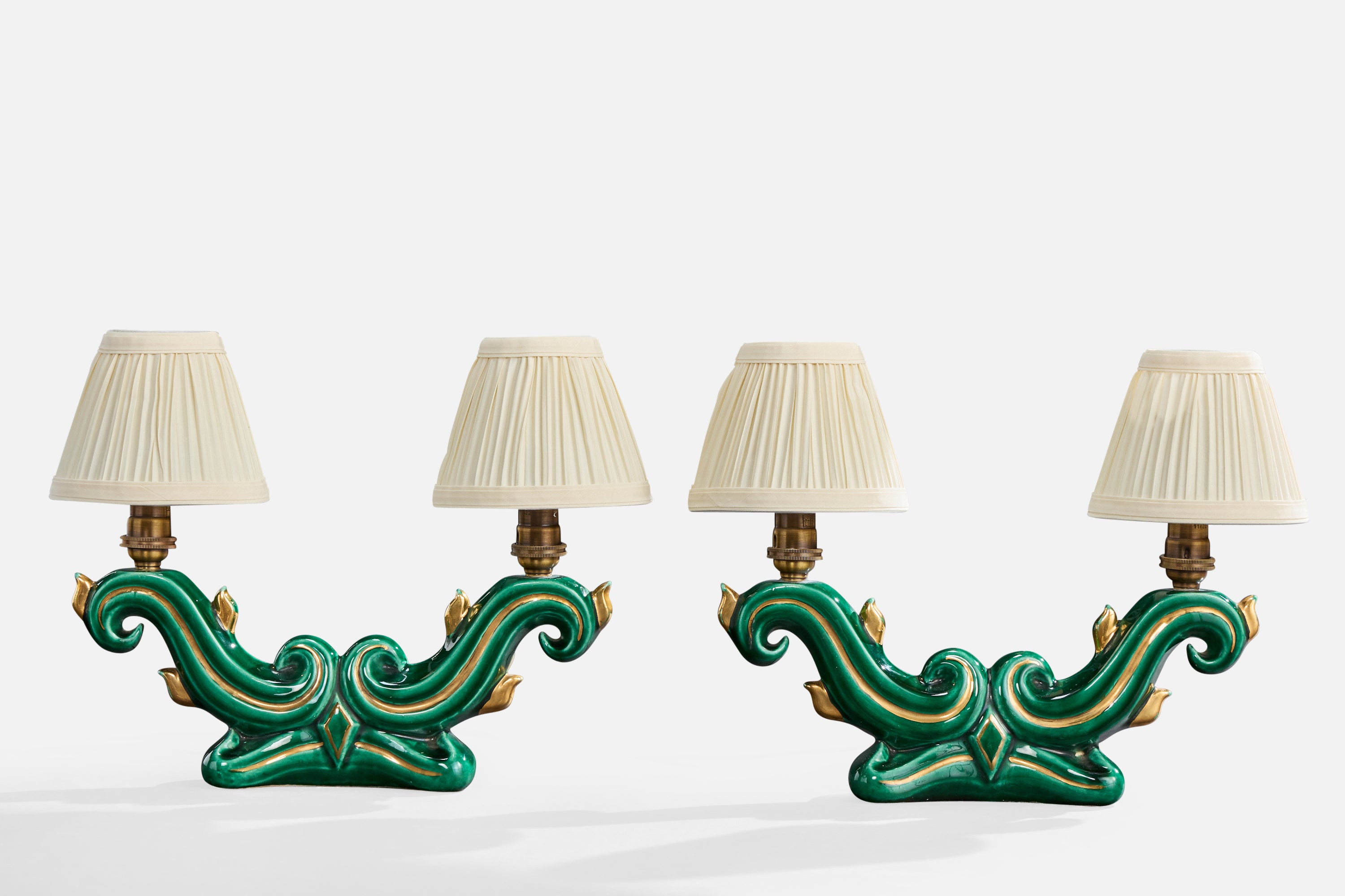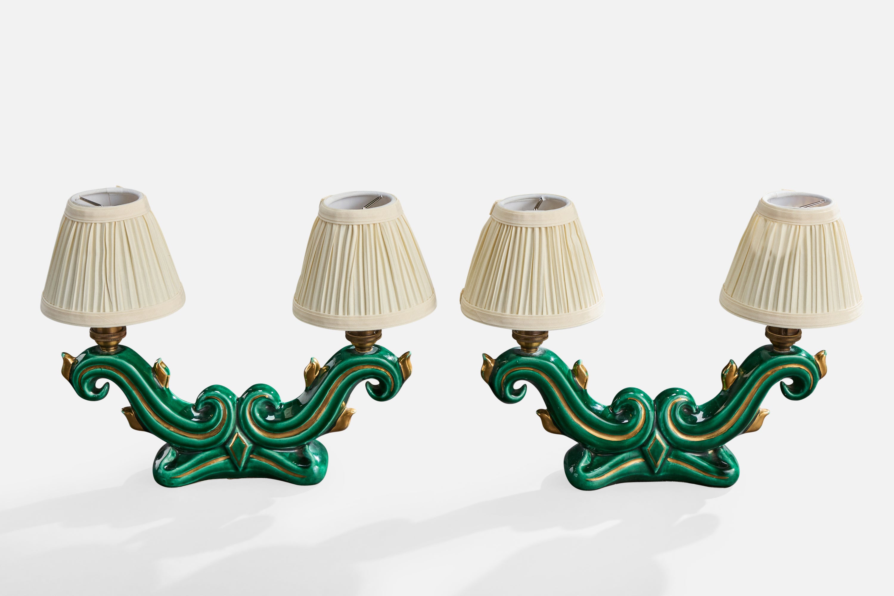 A pair of gold, green-glazed ceramic, brass and off-white fabric table lamps designed and produced in France, c. 1960s.